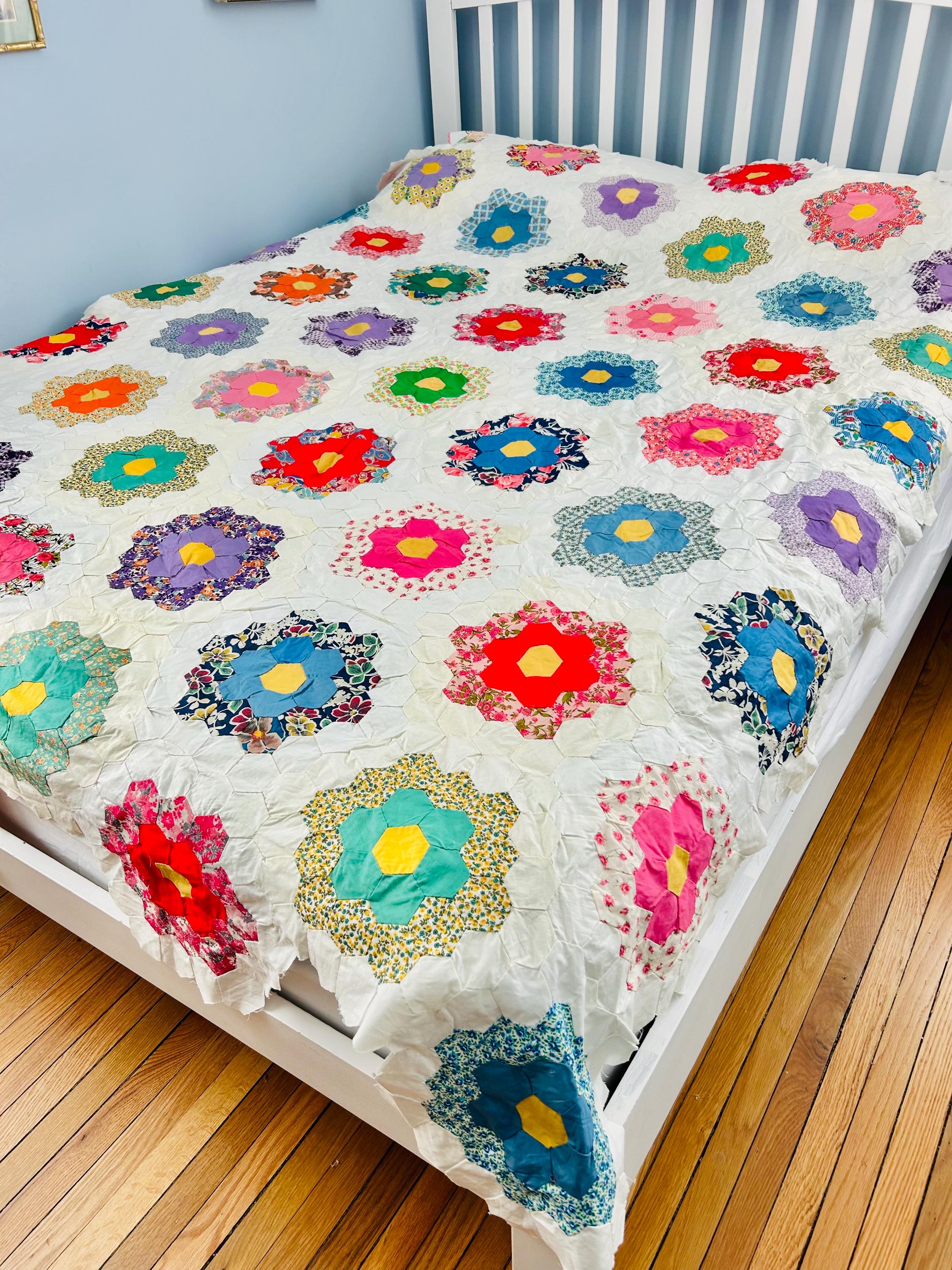 Details: • Size: 68” x 86” • Pattern: Grandmother's Flower Garden • Era: 1940s • Fabrics: 1930s and 1940s feedsack fabrics, including small-scale florals, lavender ginghams, and "shirting" prints.