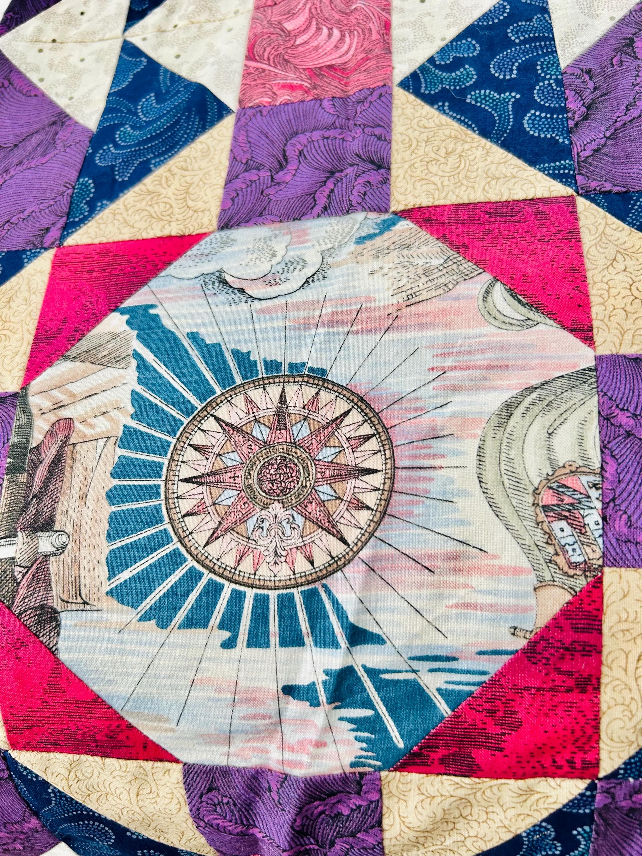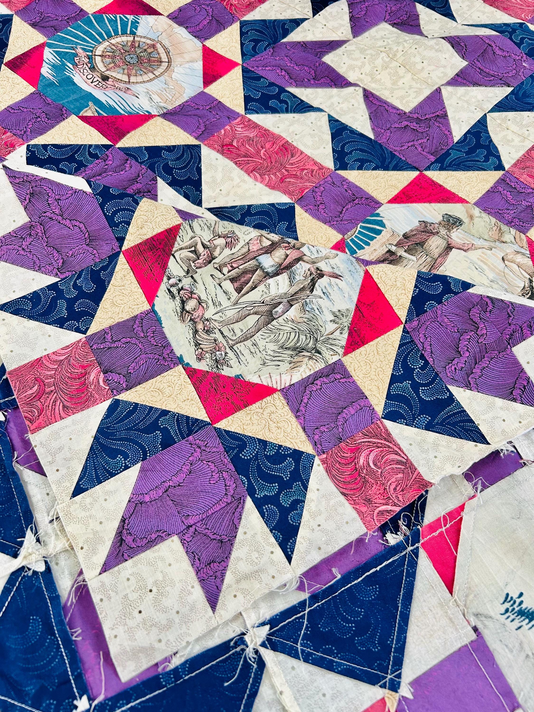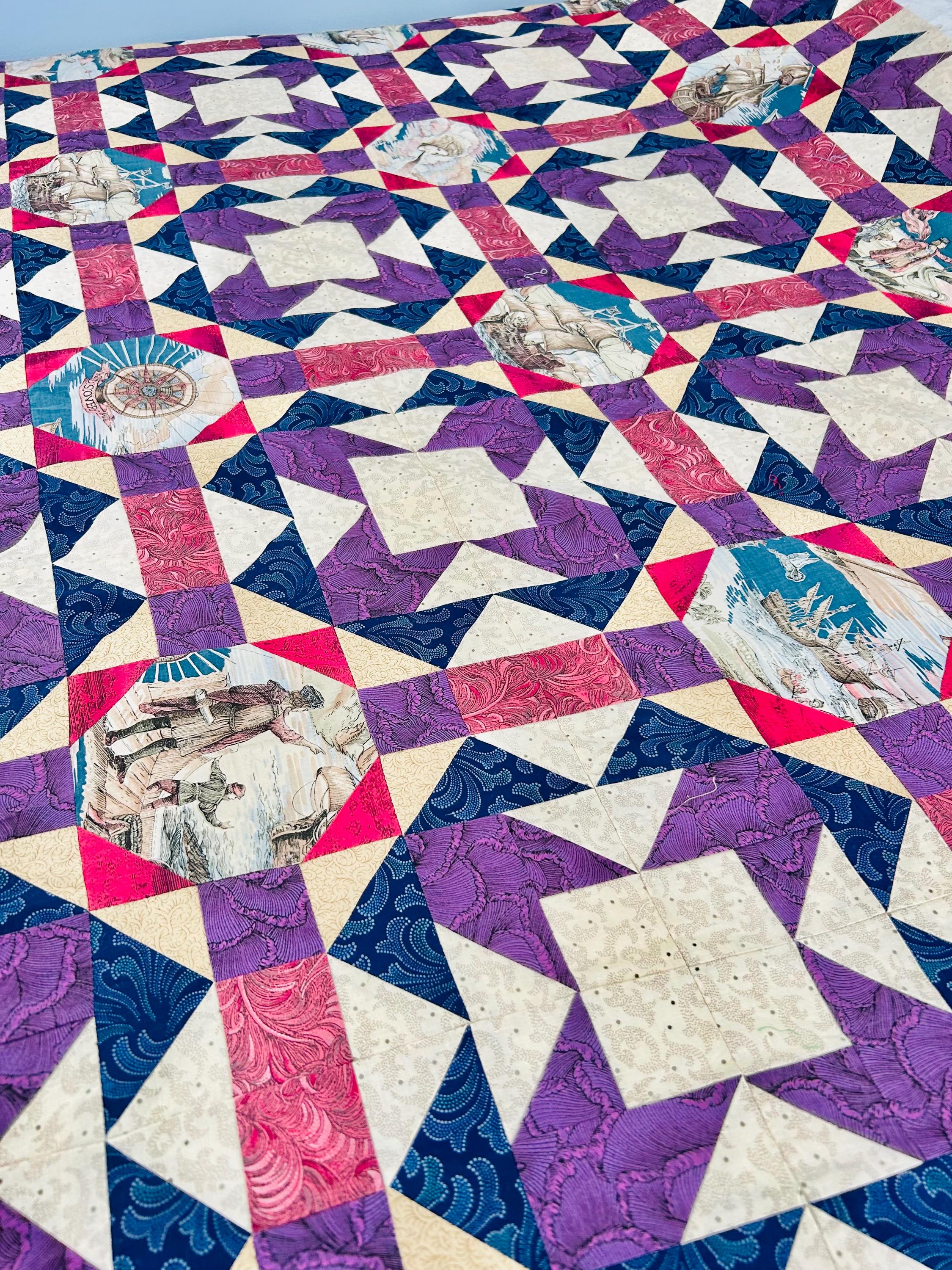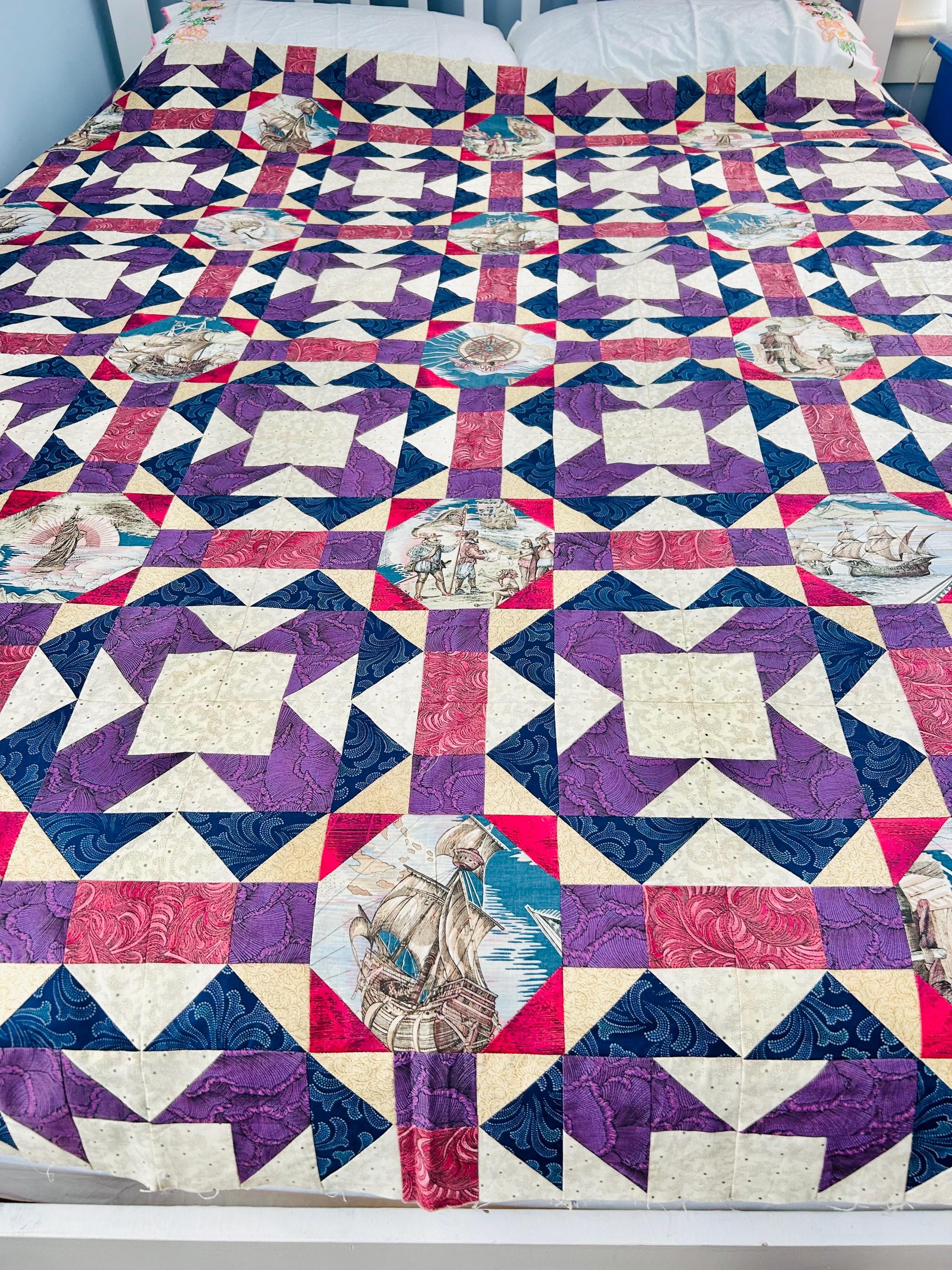 Details • Era: 1990s • Pattern: Autumn Leaf variation with octagonal novelty centers • Size: approximately 70” x 70” • Construction: machine pieced cotton fabrics • Colors: navy blue, purple, magenta, cream, and nautical-themed prints• Center fabrics feature sailing ships, compass motifs, explorers, and Statue of Liberty imagery • Condition: unfinished quilt top only; seams and edges visible on the back as expected for an unquilted top