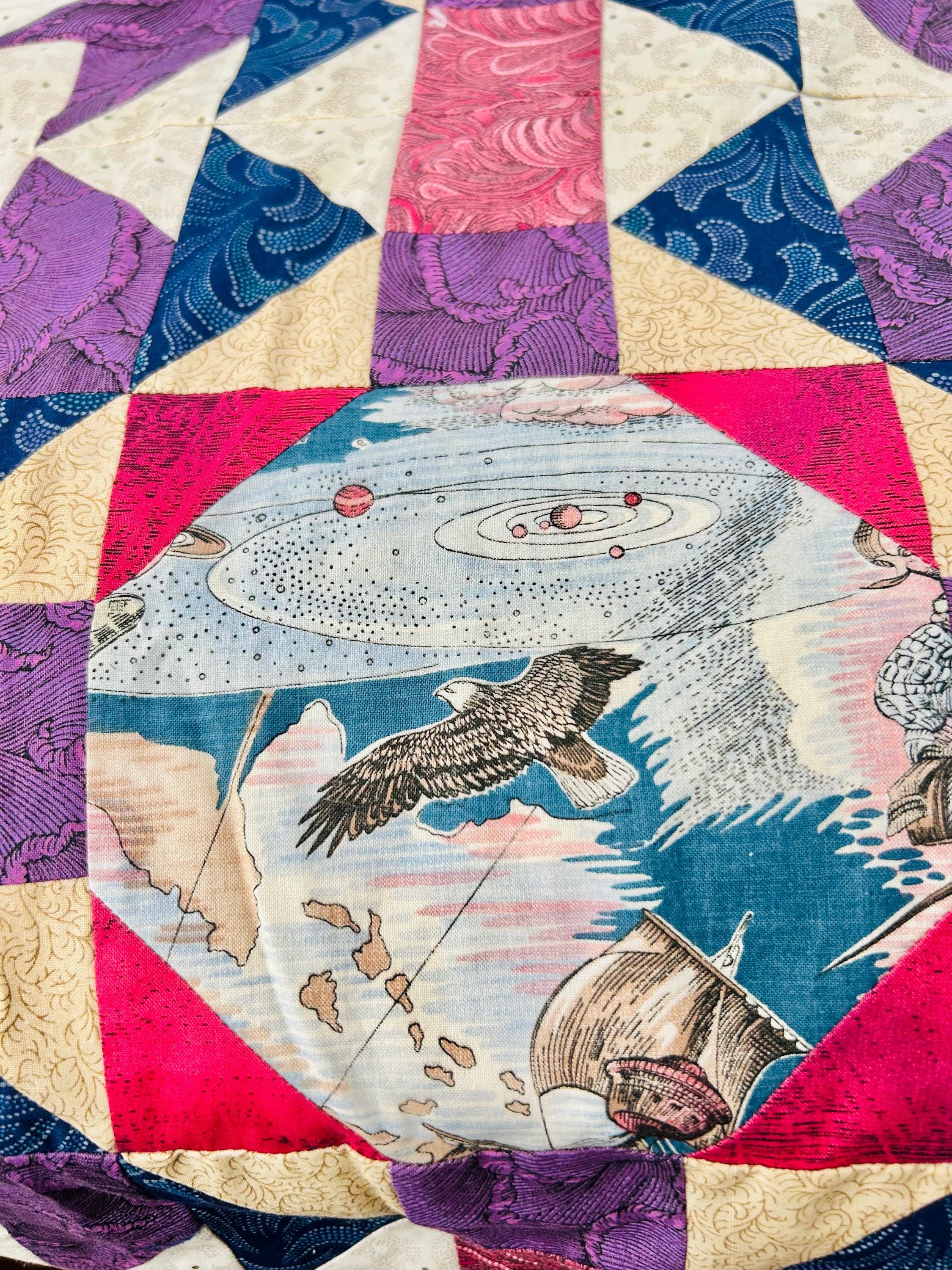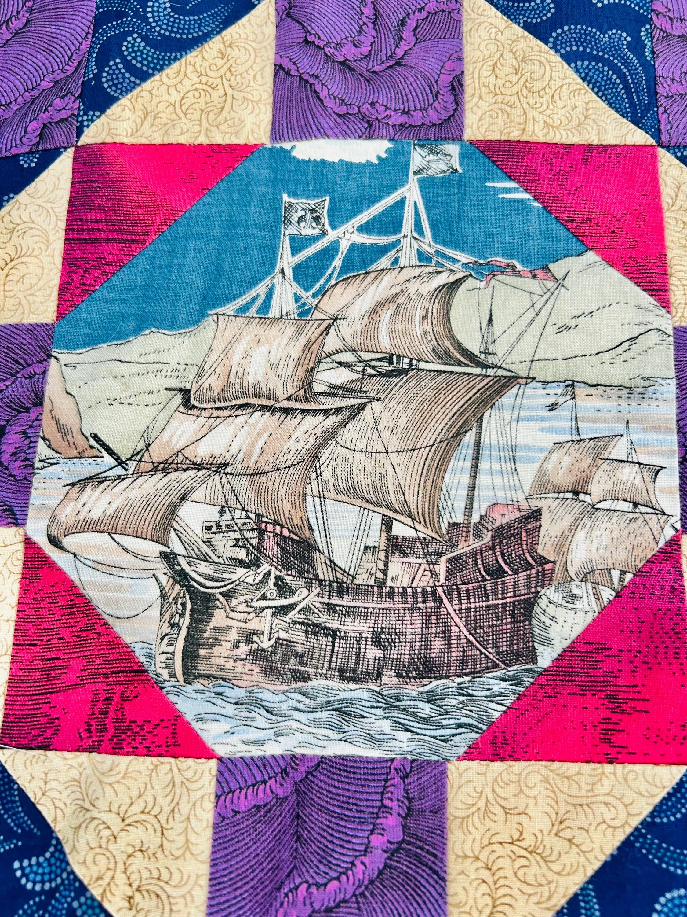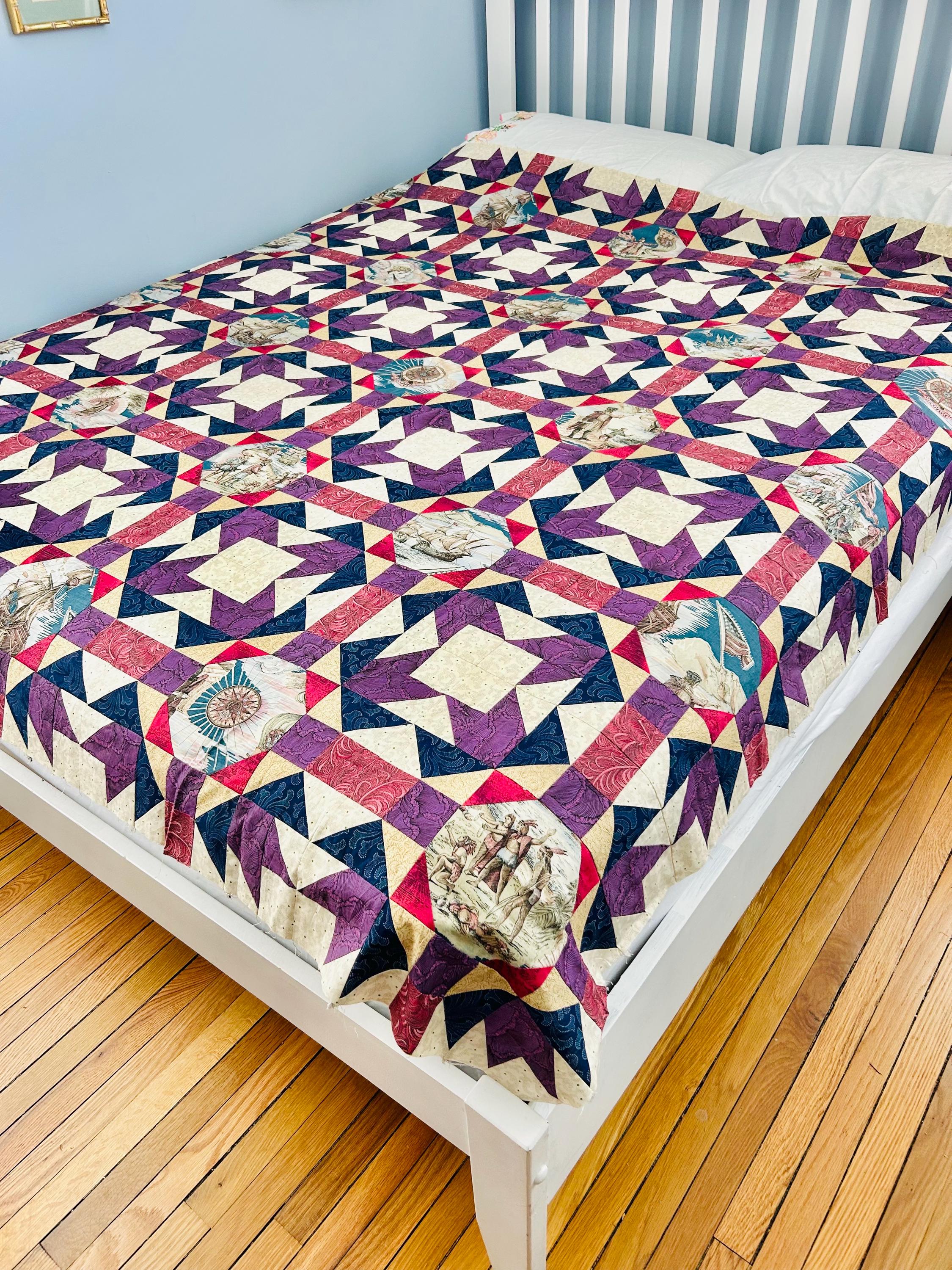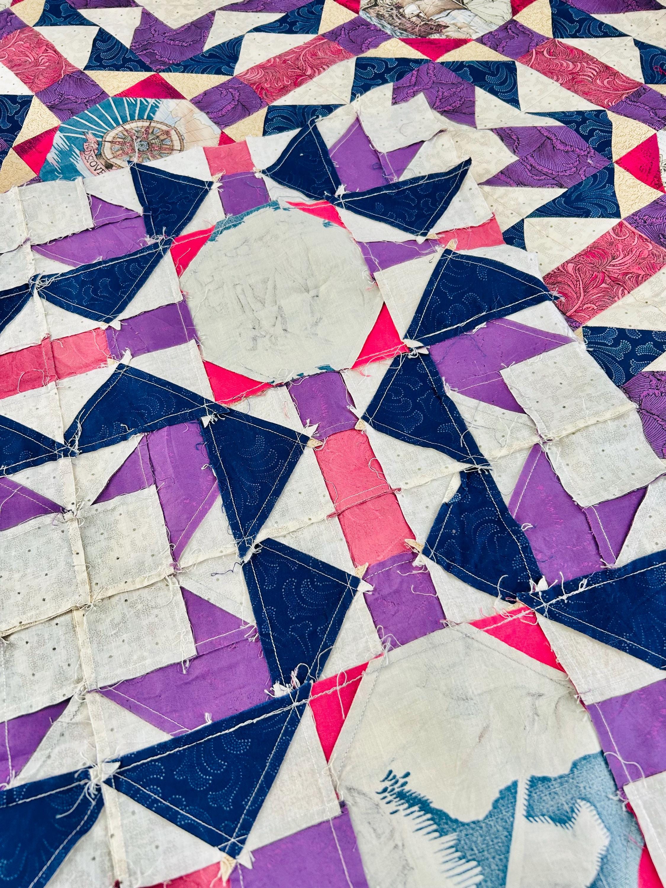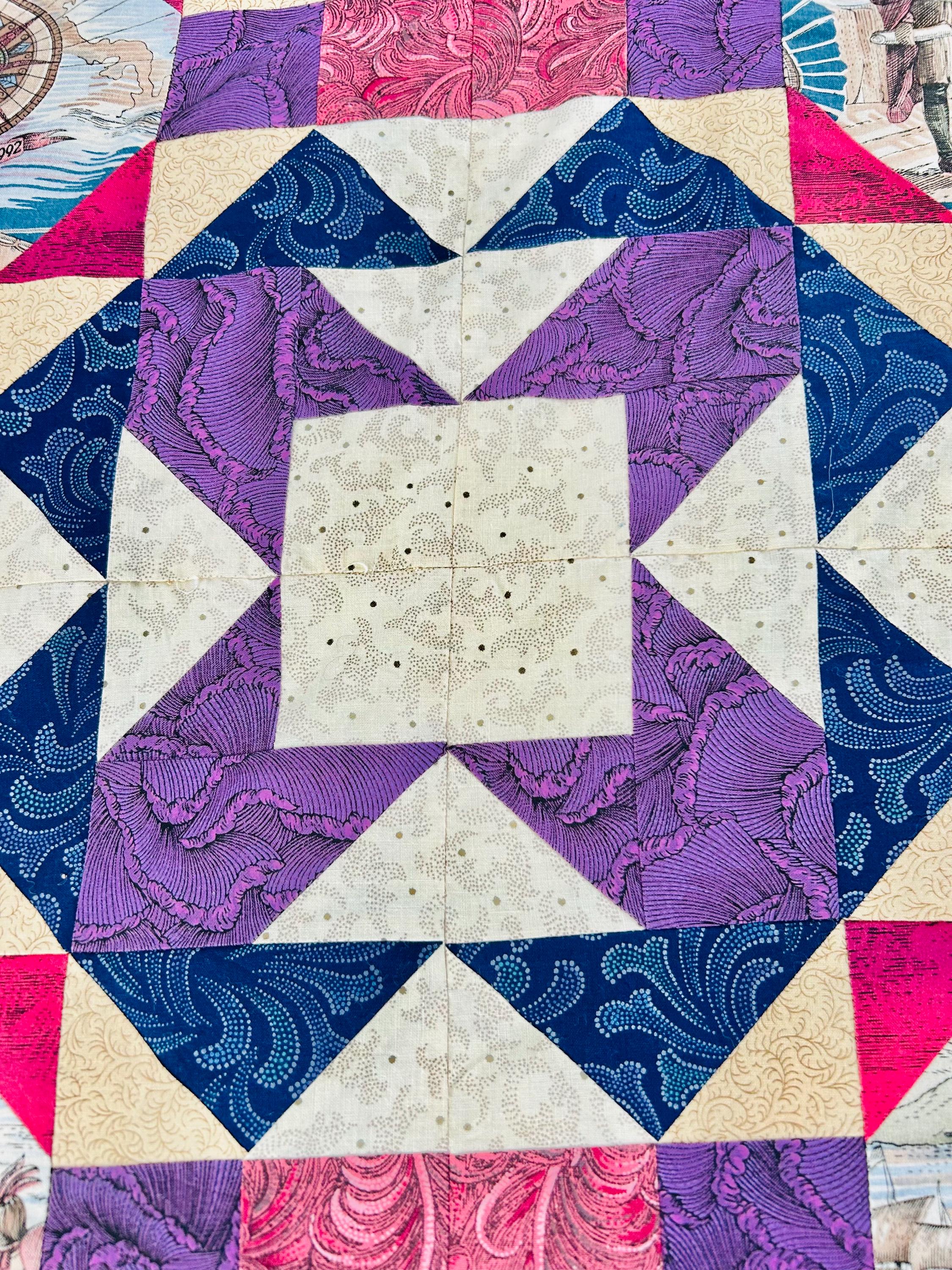 Details • Era: 1990s • Pattern: Autumn Leaf variation with octagonal novelty centers • Size: approximately 70” x 70” • Construction: machine pieced cotton fabrics • Colors: navy blue, purple, magenta, cream, and nautical-themed prints• Center fabrics feature sailing ships, compass motifs, explorers, and Statue of Liberty imagery • Condition: unfinished quilt top only; seams and edges visible on the back as expected for an unquilted top