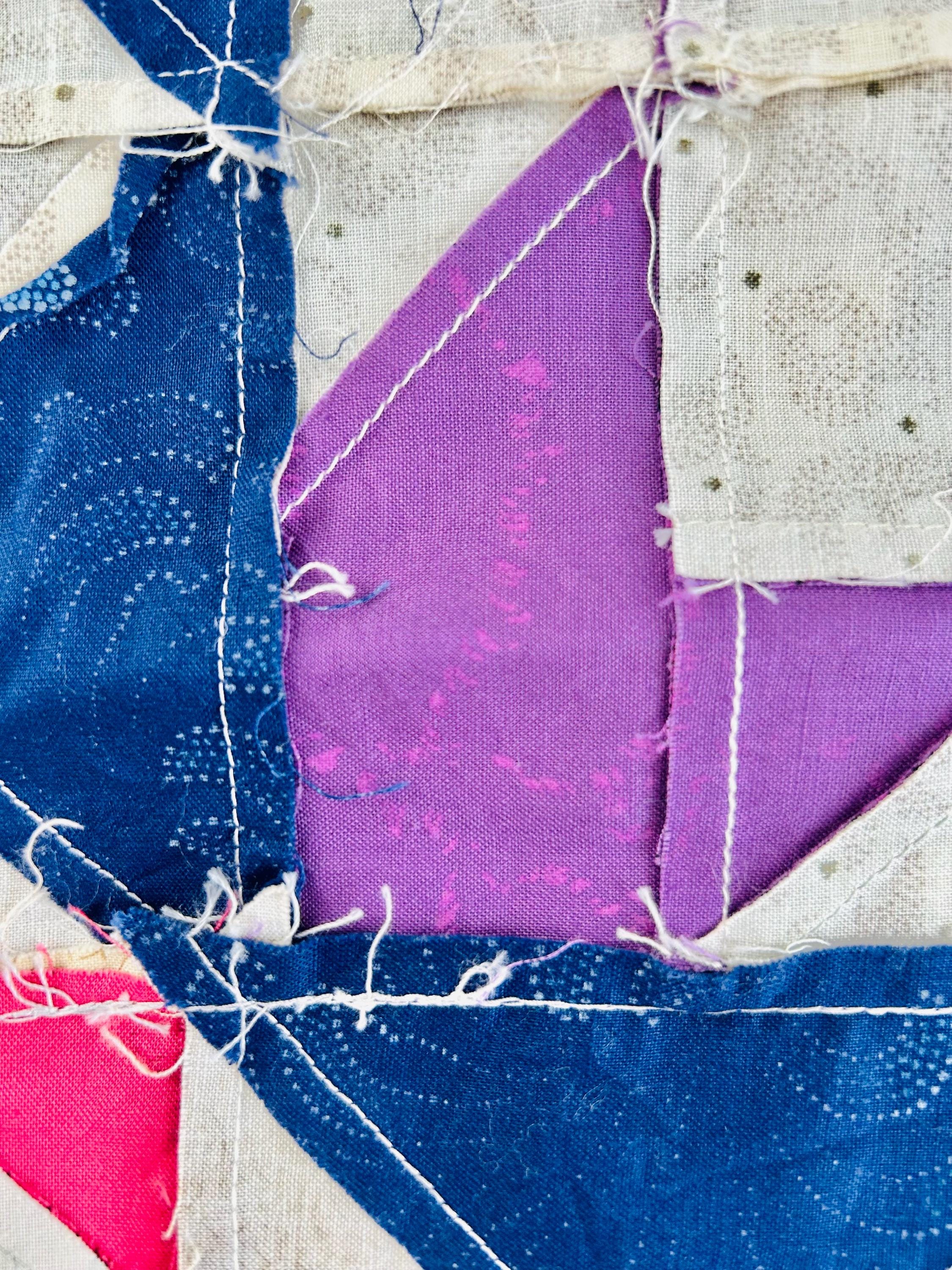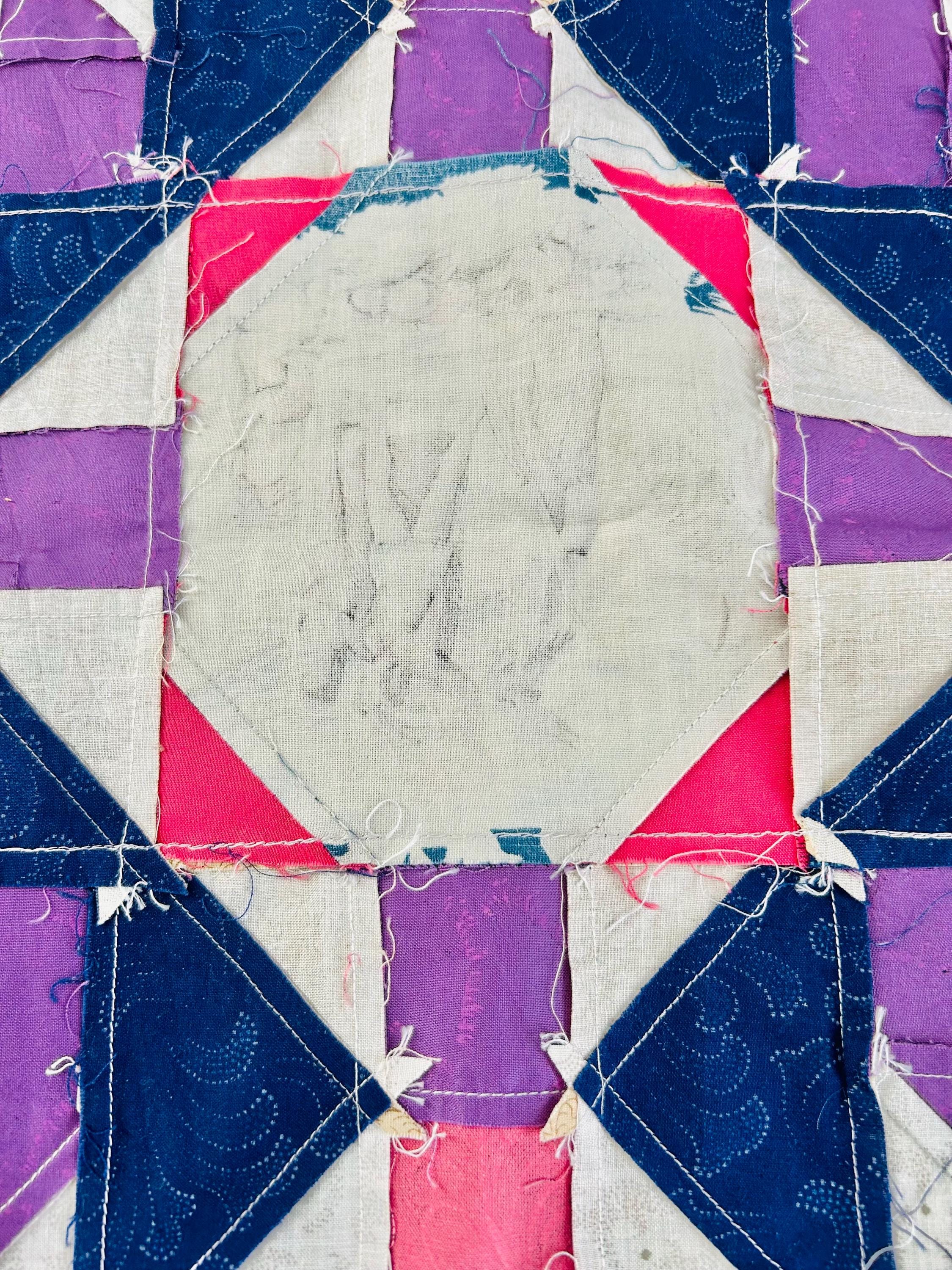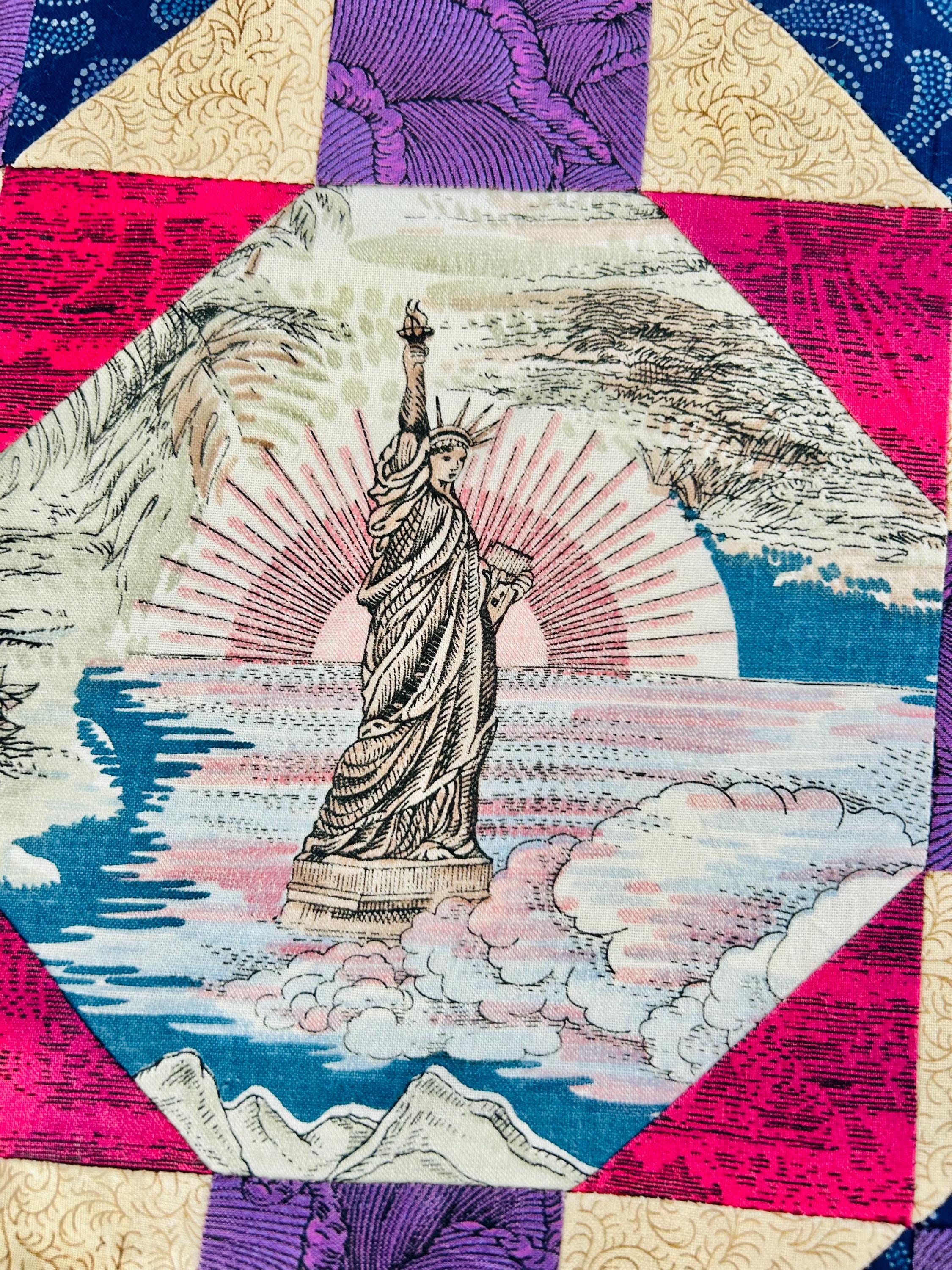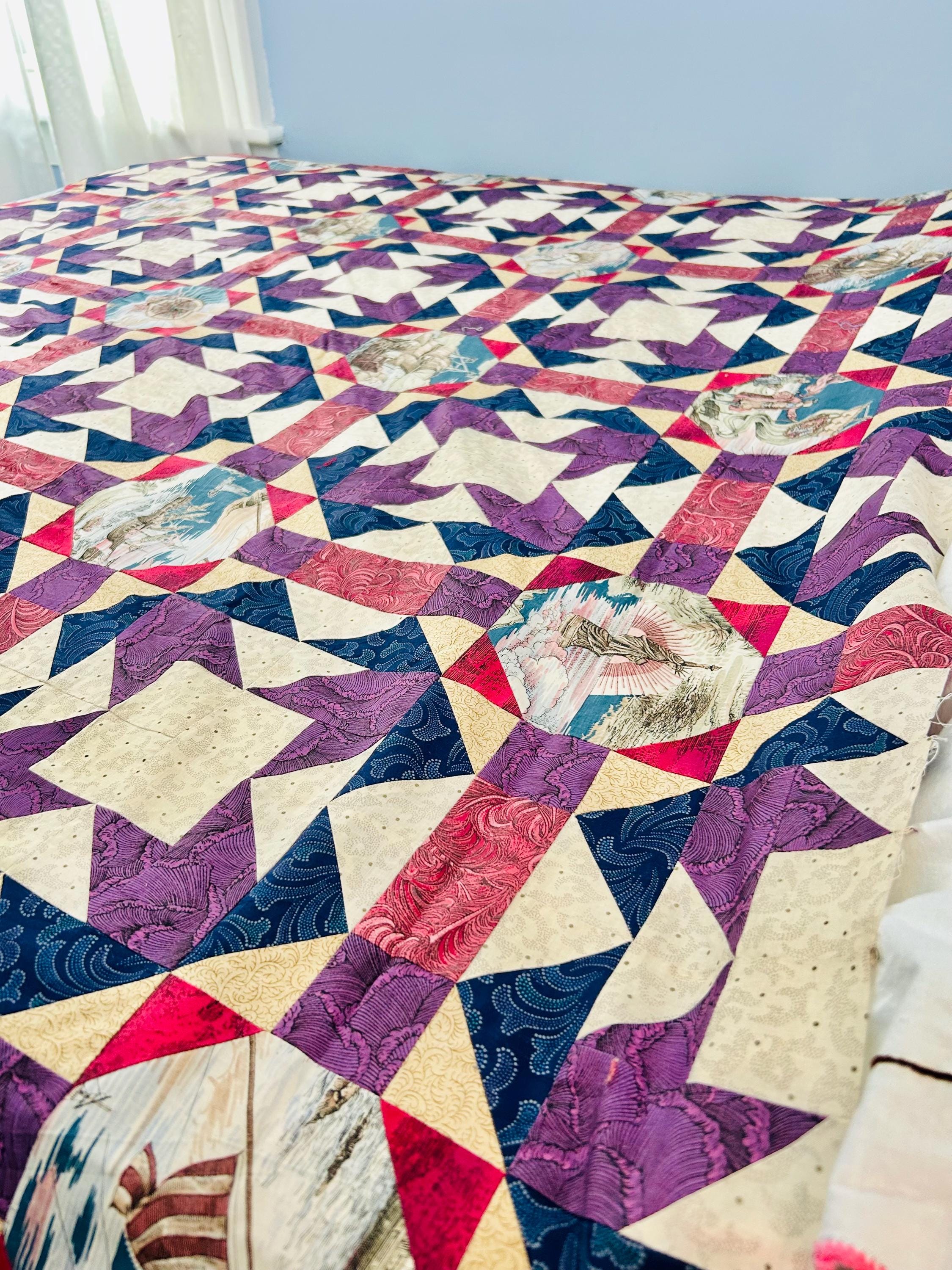 Details • Era: 1990s • Pattern: Autumn Leaf variation with octagonal novelty centers • Size: approximately 70” x 70” • Construction: machine pieced cotton fabrics • Colors: navy blue, purple, magenta, cream, and nautical-themed prints• Center fabrics feature sailing ships, compass motifs, explorers, and Statue of Liberty imagery • Condition: unfinished quilt top only; seams and edges visible on the back as expected for an unquilted top