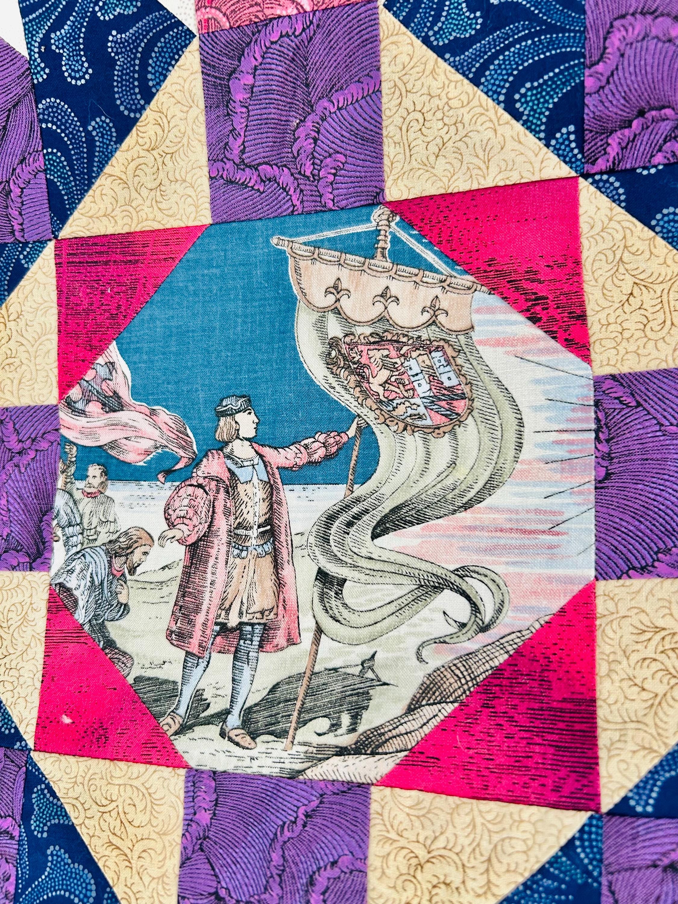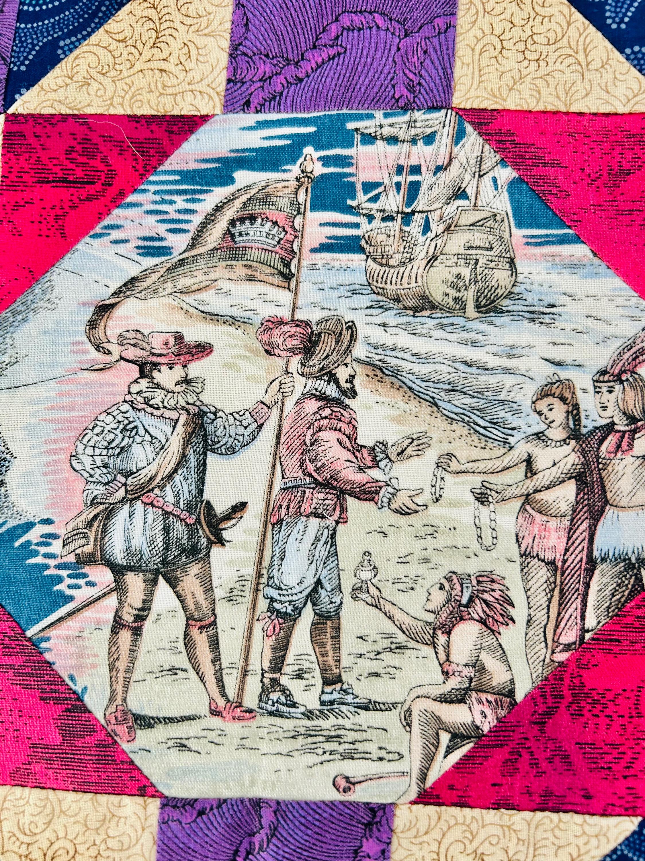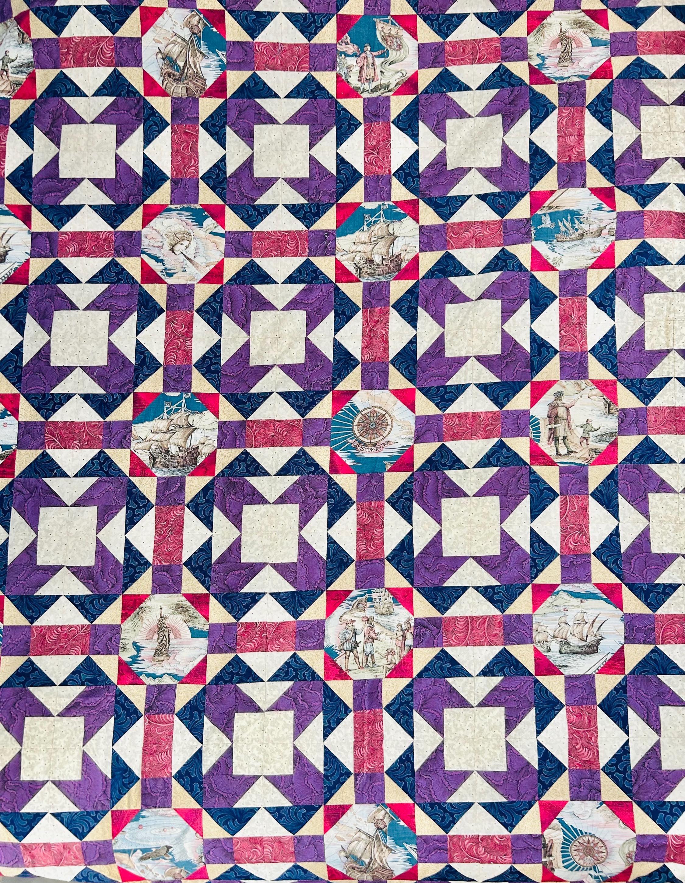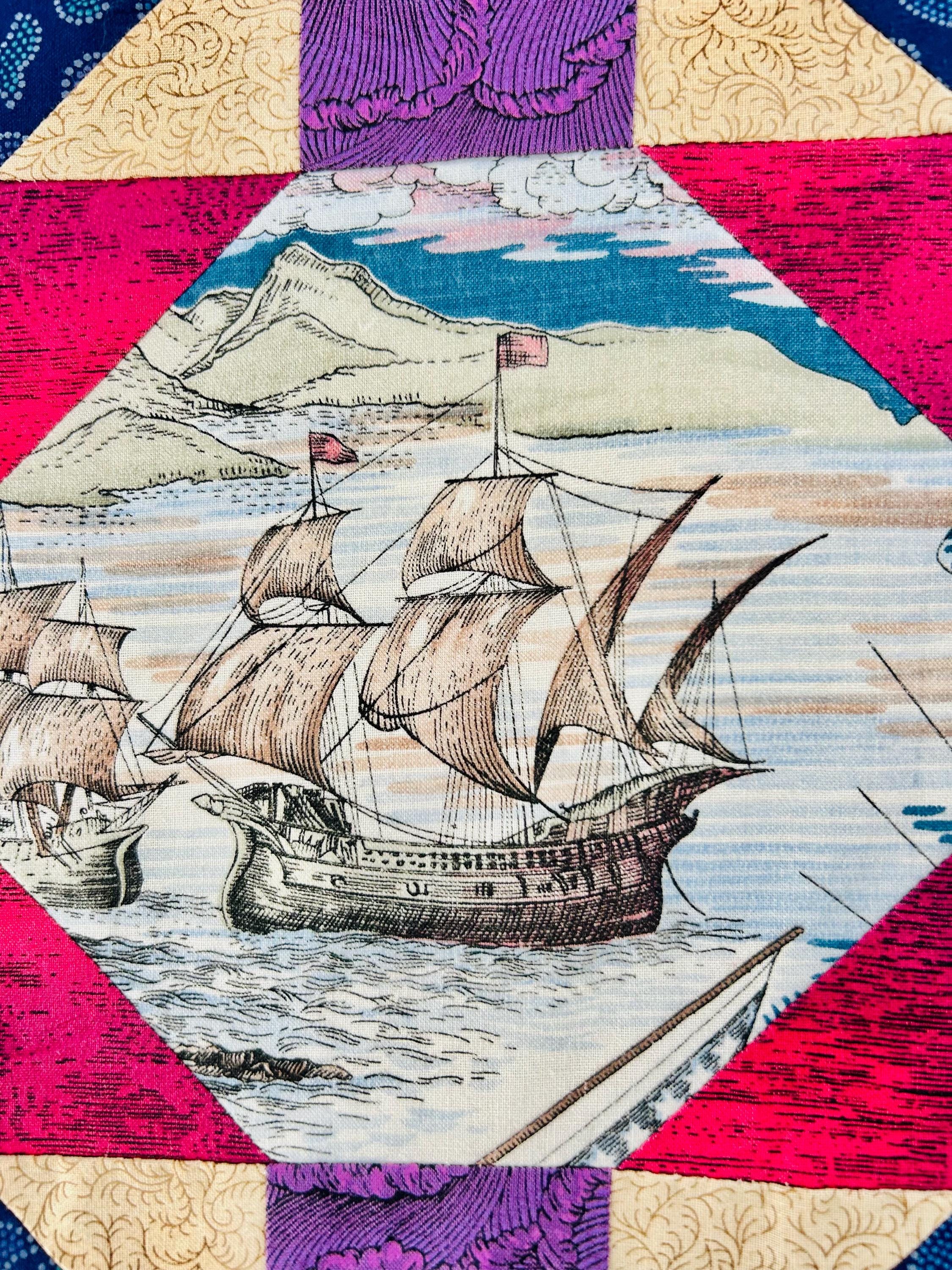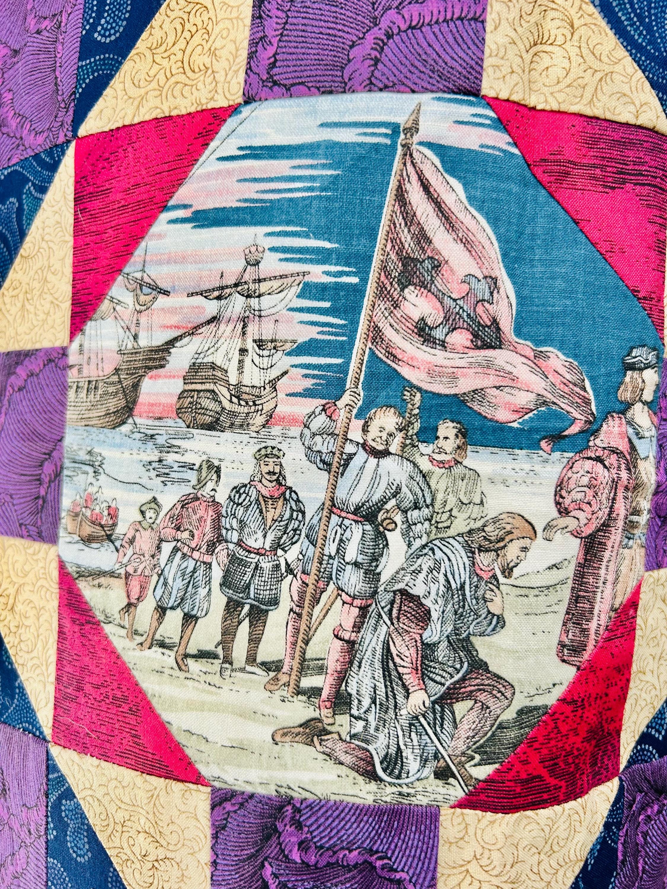 This vibrant 1990s pieced quilt top features a striking interpretation of the classic Autumn Leaf pattern and is highlighted by unique novelty fabric panels depicting historic ships, navigation compasses, explorers, and maritime scenes and appears to commemorate the 500-year anniversary of the discovery of the Americas.