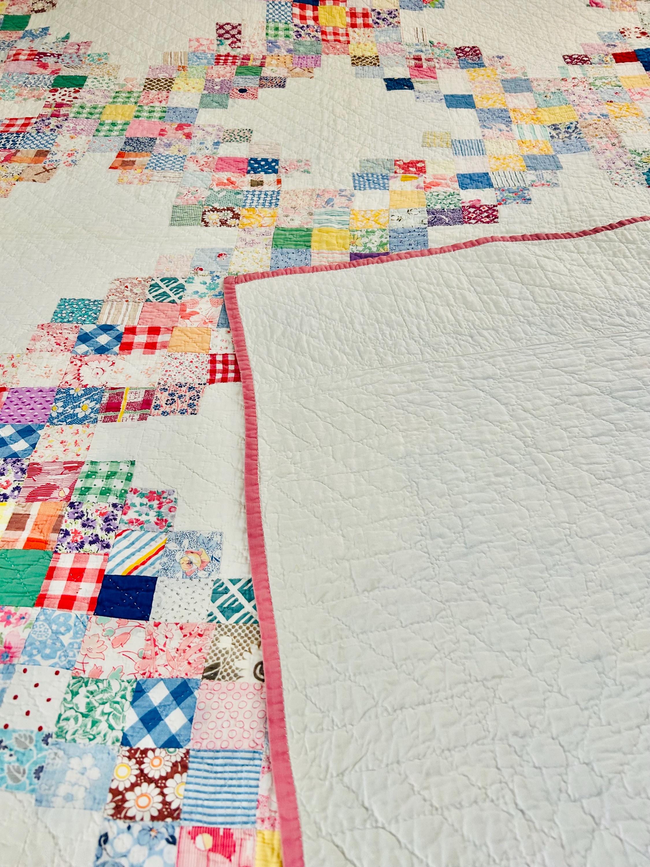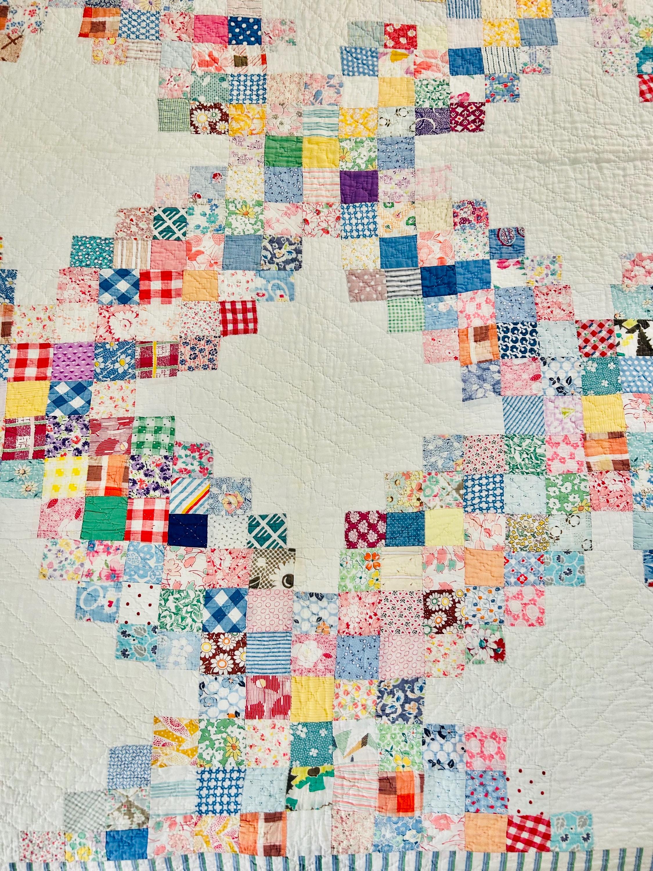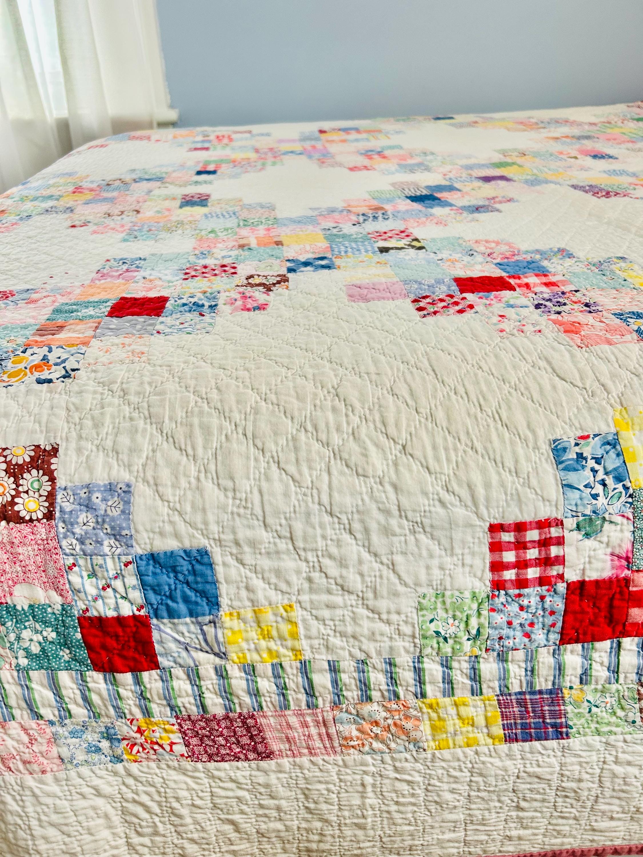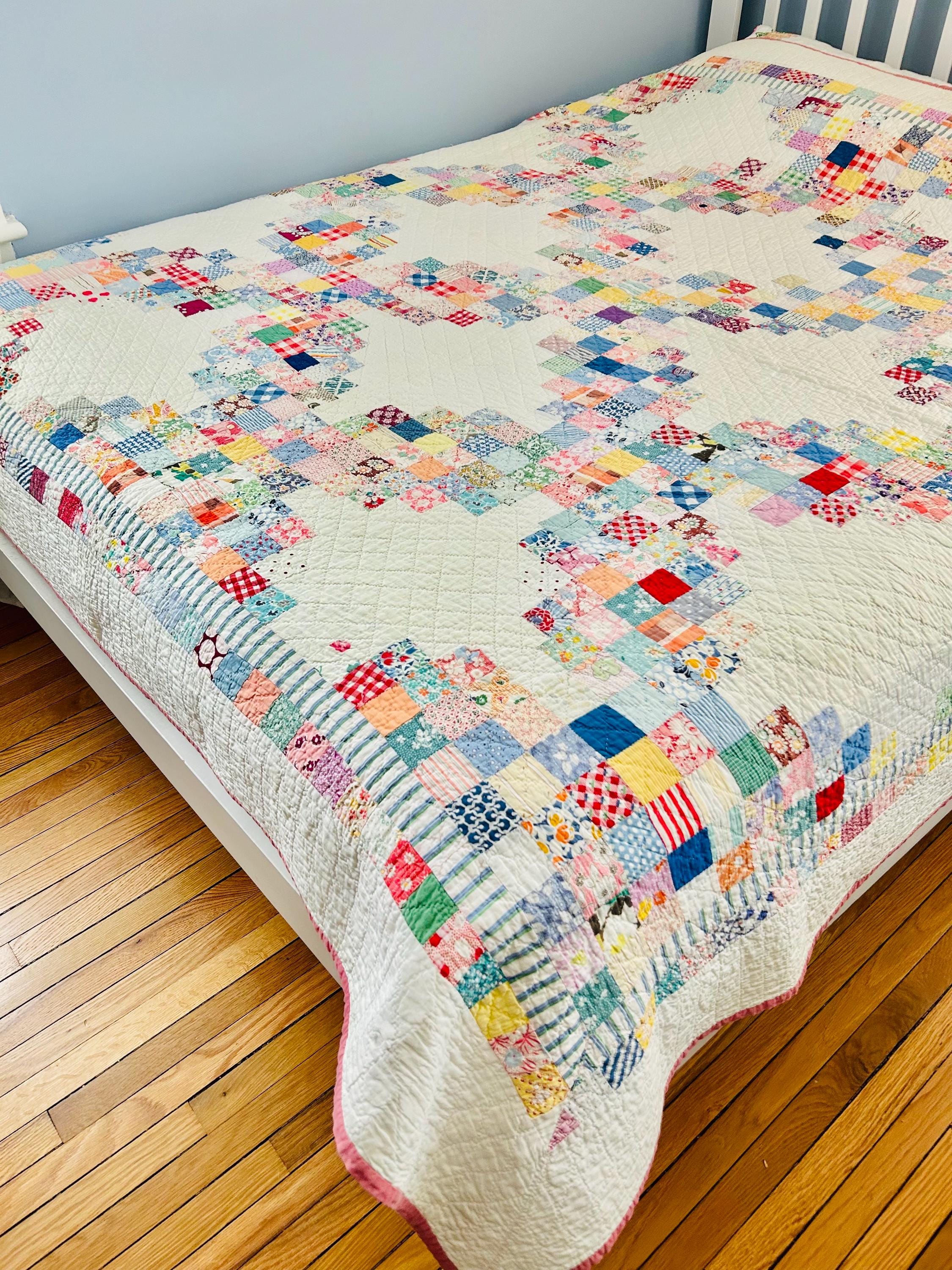Details • Pattern: Triple Irish Chain • Date: circa 1930s–1940s • Size: 82 x 83 inches (large full / queen size) • Fabrics: vintage cotton prints including feedsack florals, ginghams, stripes, and small geometrics • Construction: hand pieced and hand quilted • Quilting pattern: Double diagonals and a diamond grid pattern • Batting: lightweight cotton batting • Binding: dusty rose cotton binding • Borders: striped inner border with patchwork accents