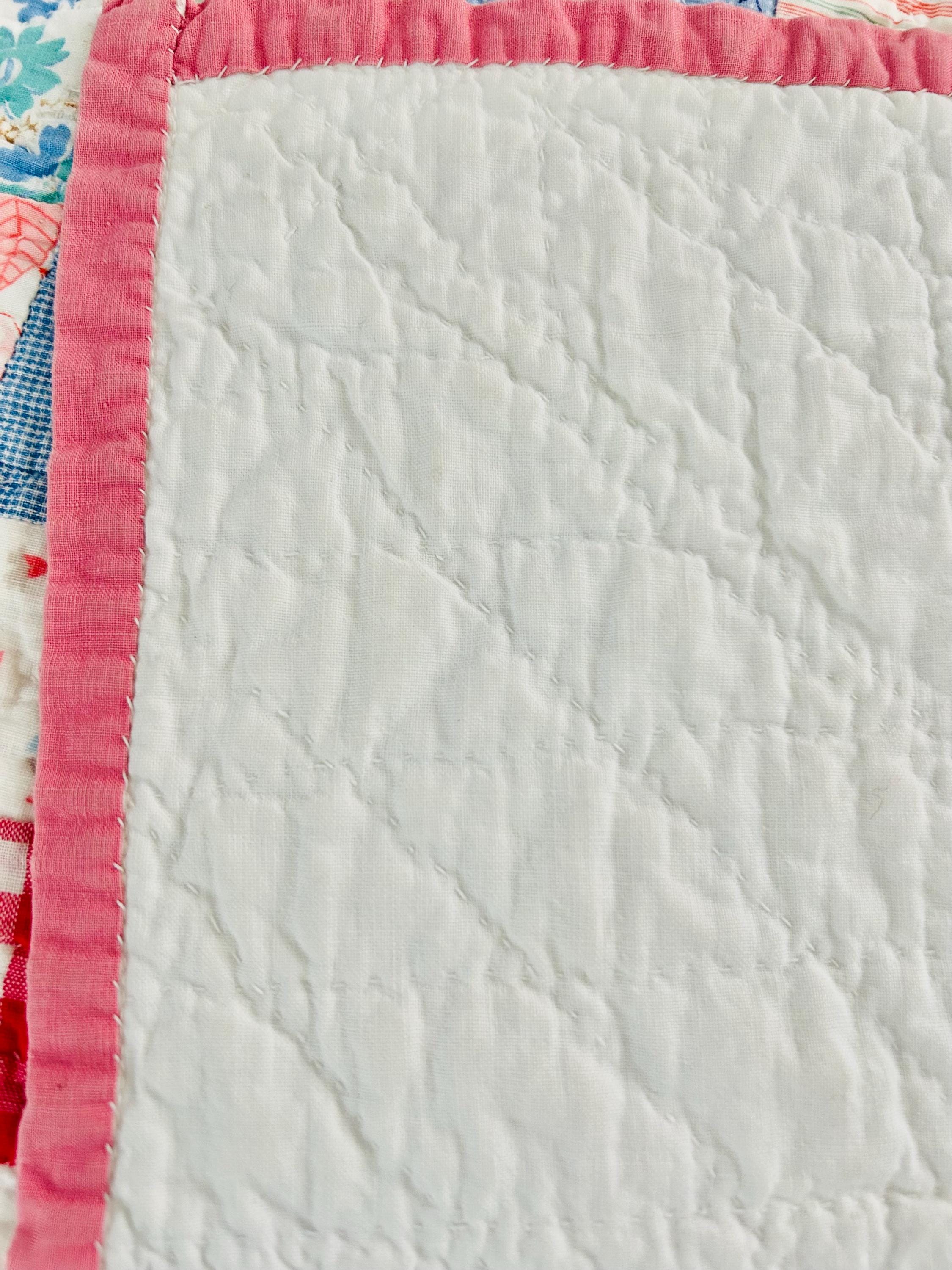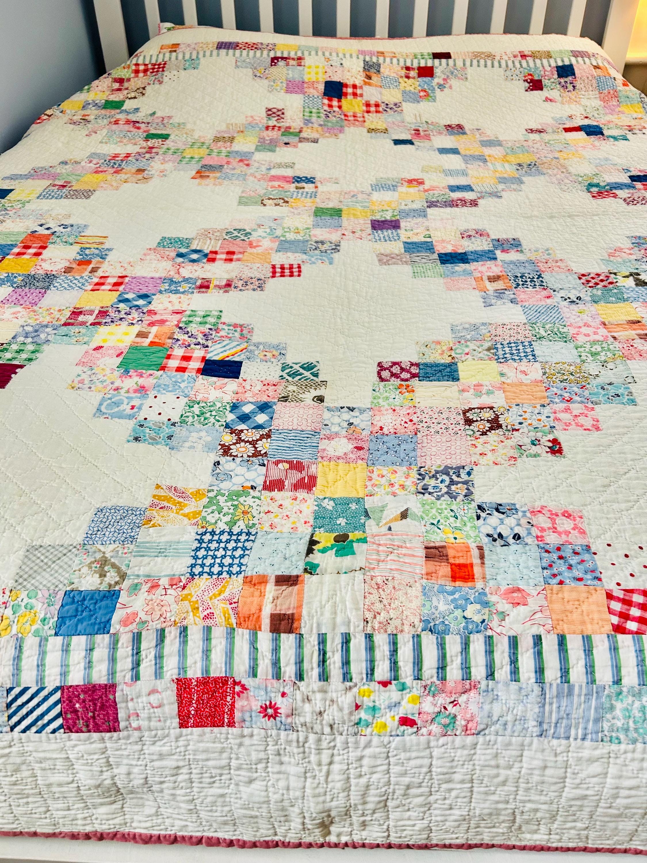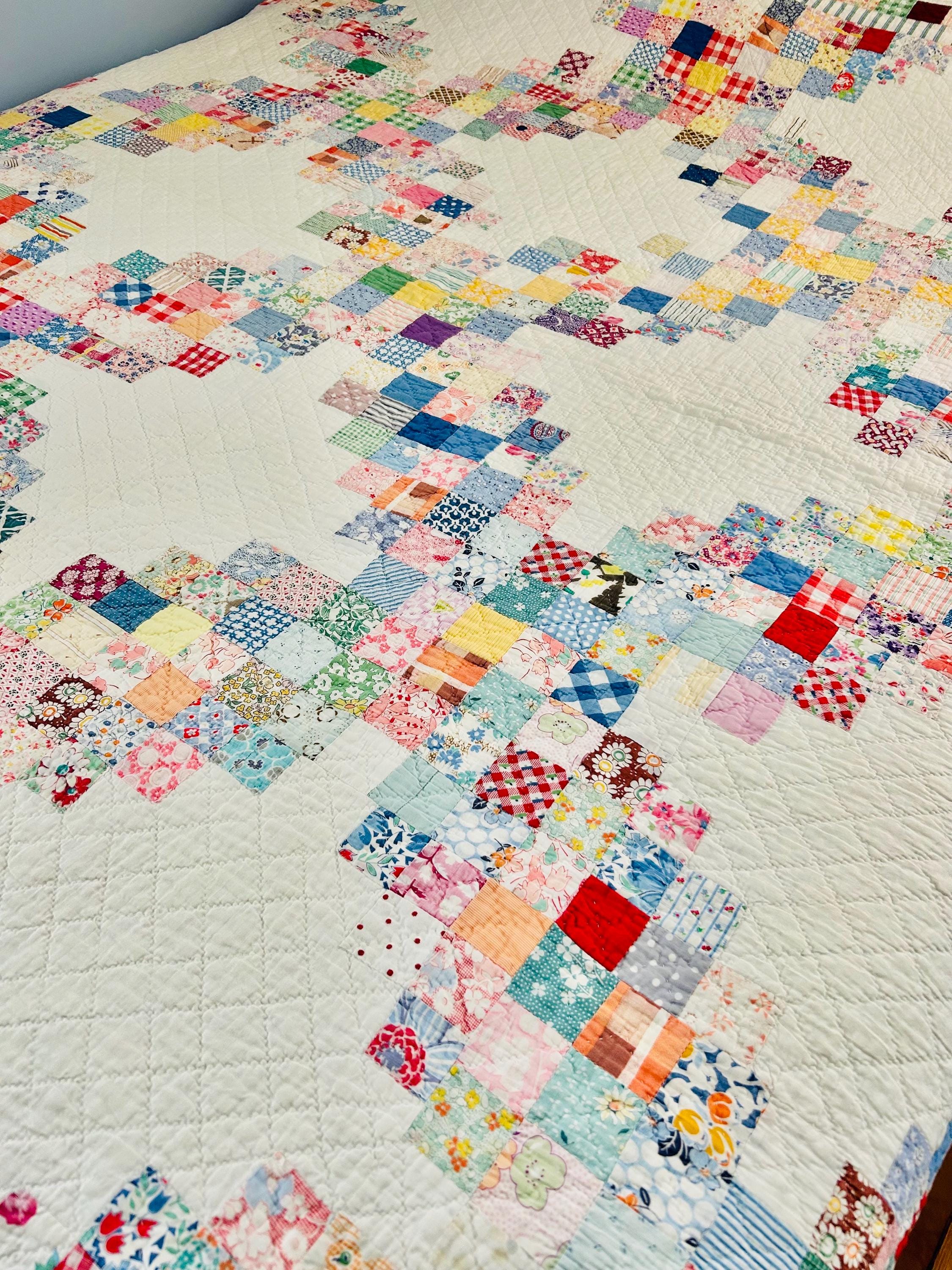Details • Pattern: Triple Irish Chain • Date: circa 1930s–1940s • Size: 82 x 83 inches (large full / queen size) • Fabrics: vintage cotton prints including feedsack florals, ginghams, stripes, and small geometrics • Construction: hand pieced and hand quilted • Quilting pattern: Double diagonals and a diamond grid pattern • Batting: lightweight cotton batting • Binding: dusty rose cotton binding • Borders: striped inner border with patchwork accents