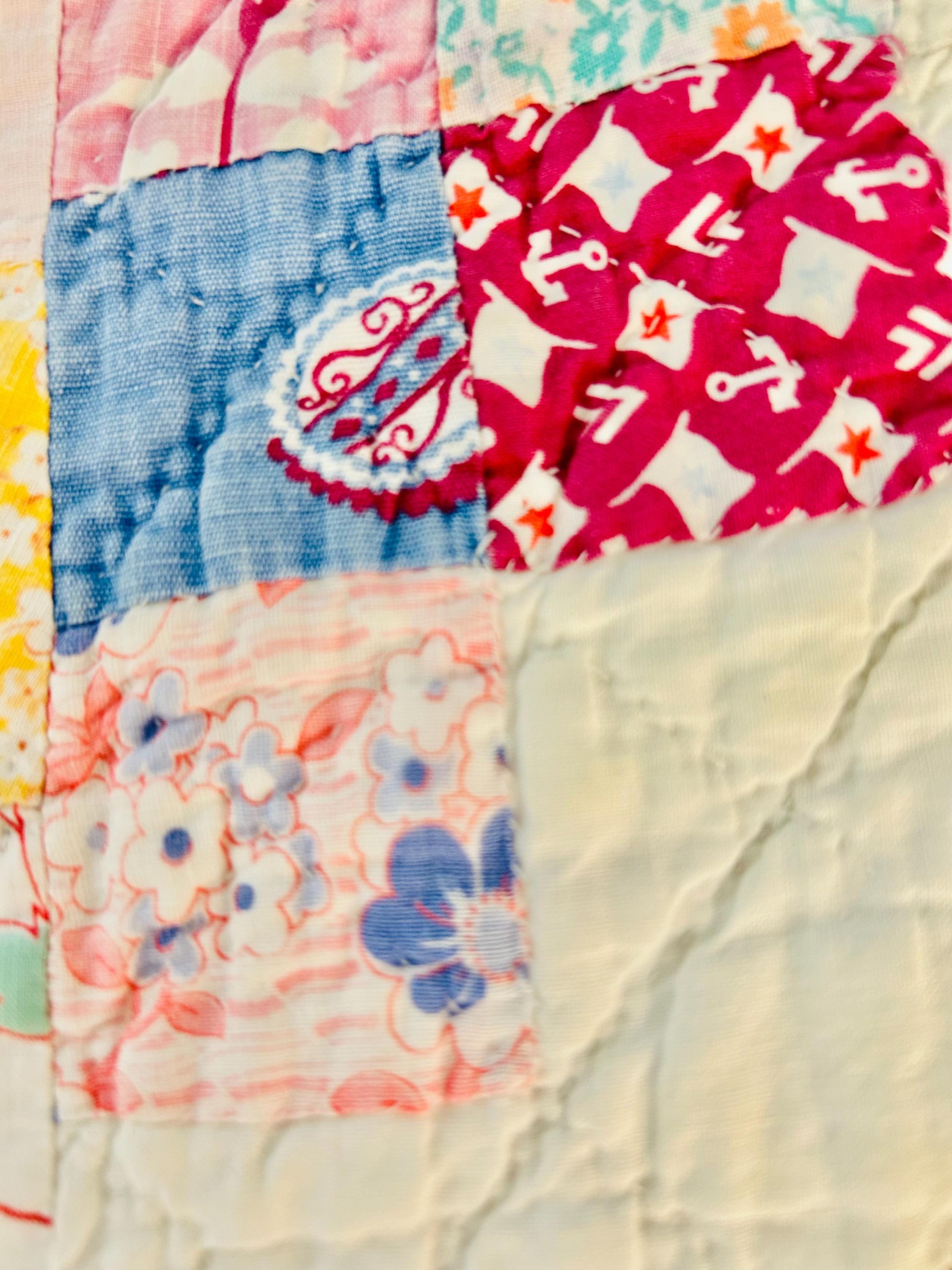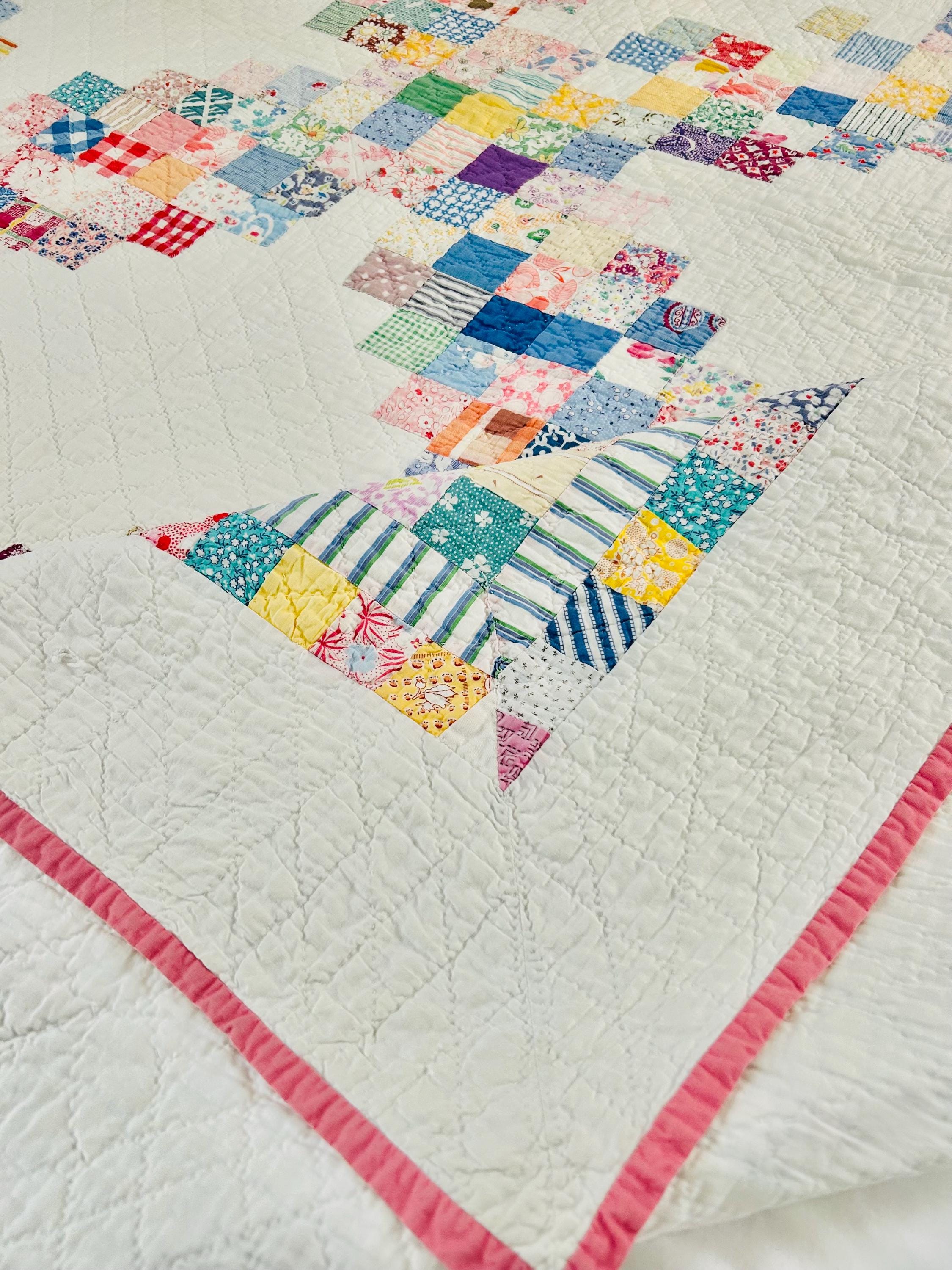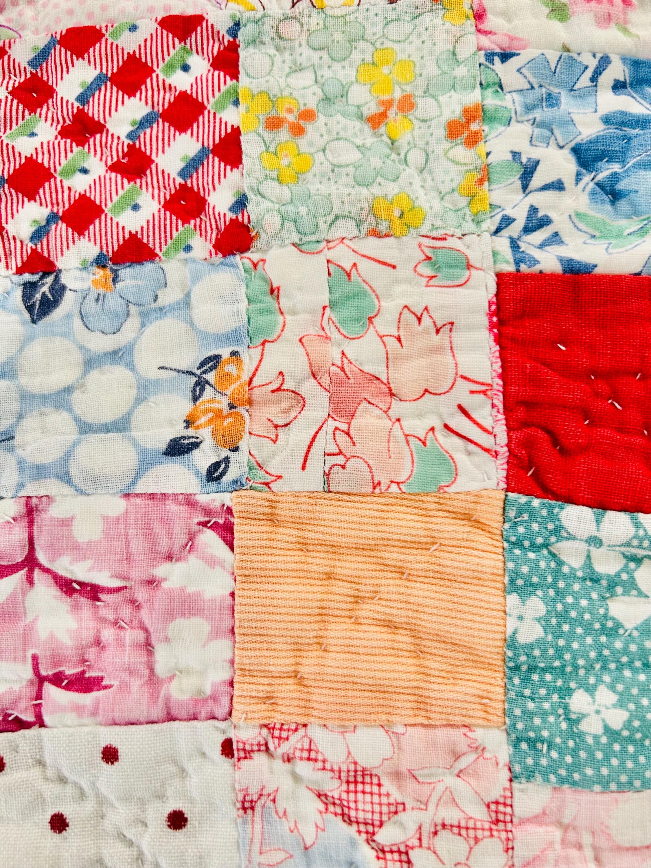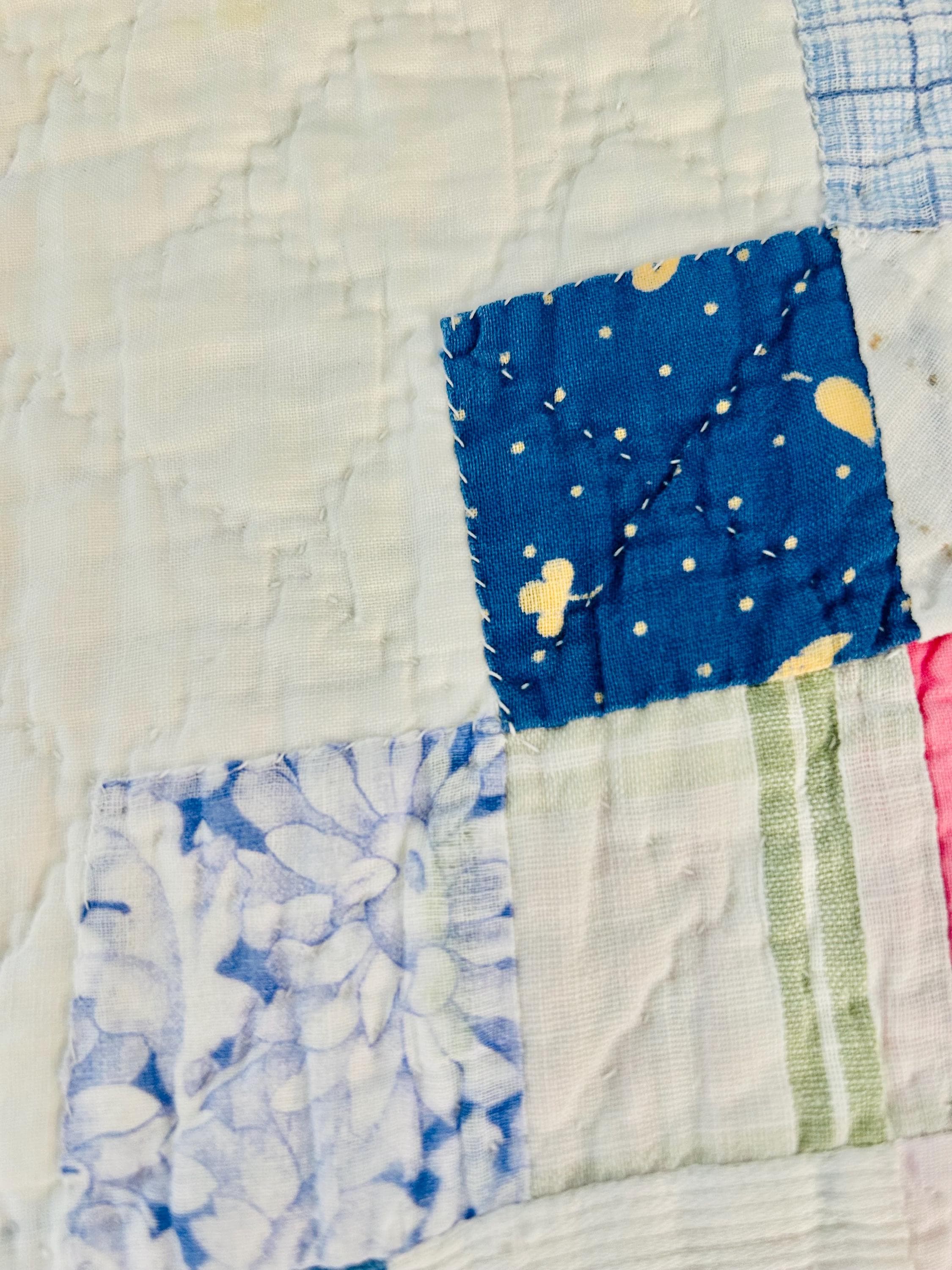 Details • Pattern: Triple Irish Chain • Date: circa 1930s–1940s • Size: 82 x 83 inches (large full / queen size) • Fabrics: vintage cotton prints including feedsack florals, ginghams, stripes, and small geometrics • Construction: hand pieced and hand quilted • Quilting pattern: Double diagonals and a diamond grid pattern • Batting: lightweight cotton batting • Binding: dusty rose cotton binding • Borders: striped inner border with patchwork accents