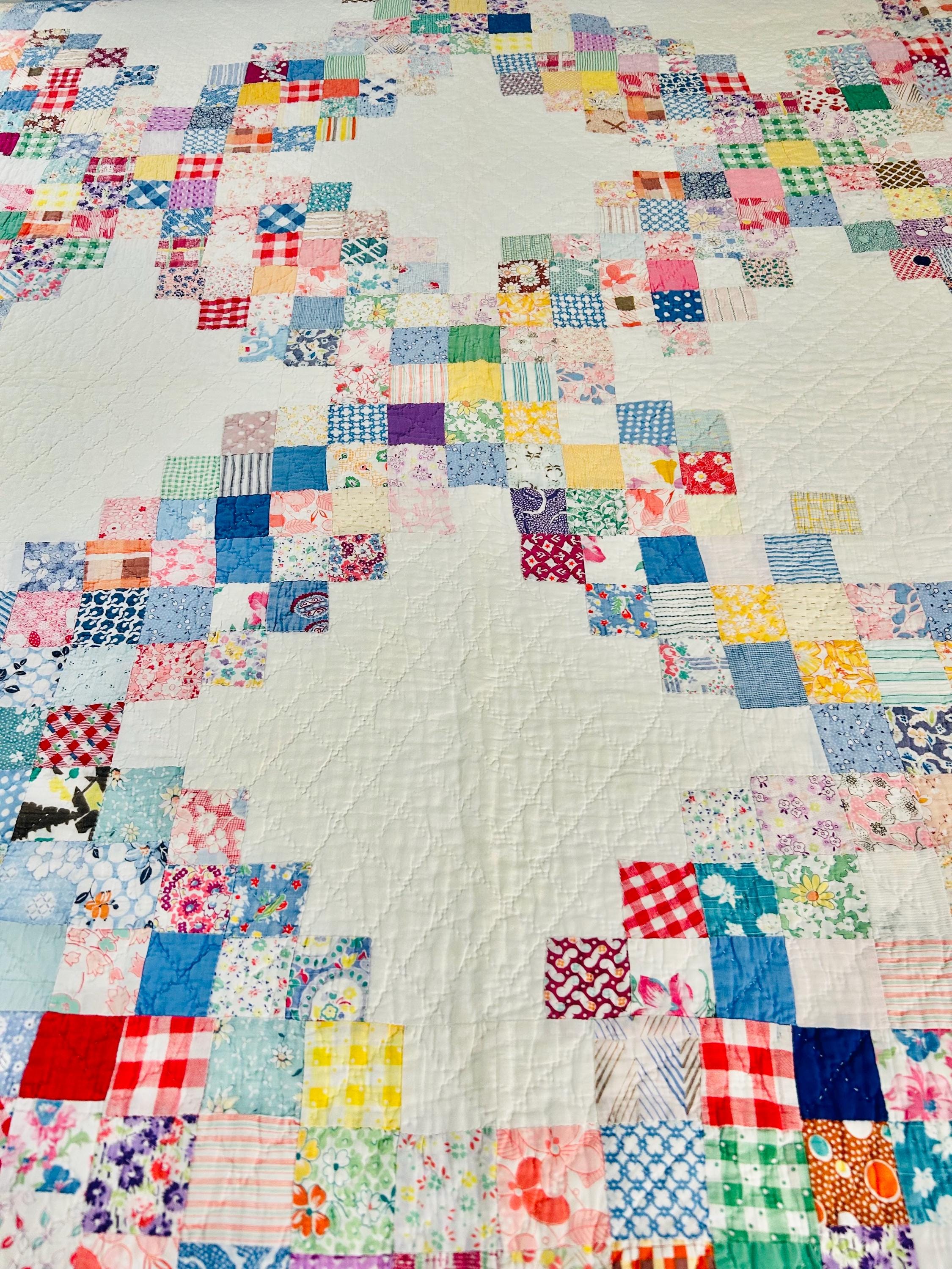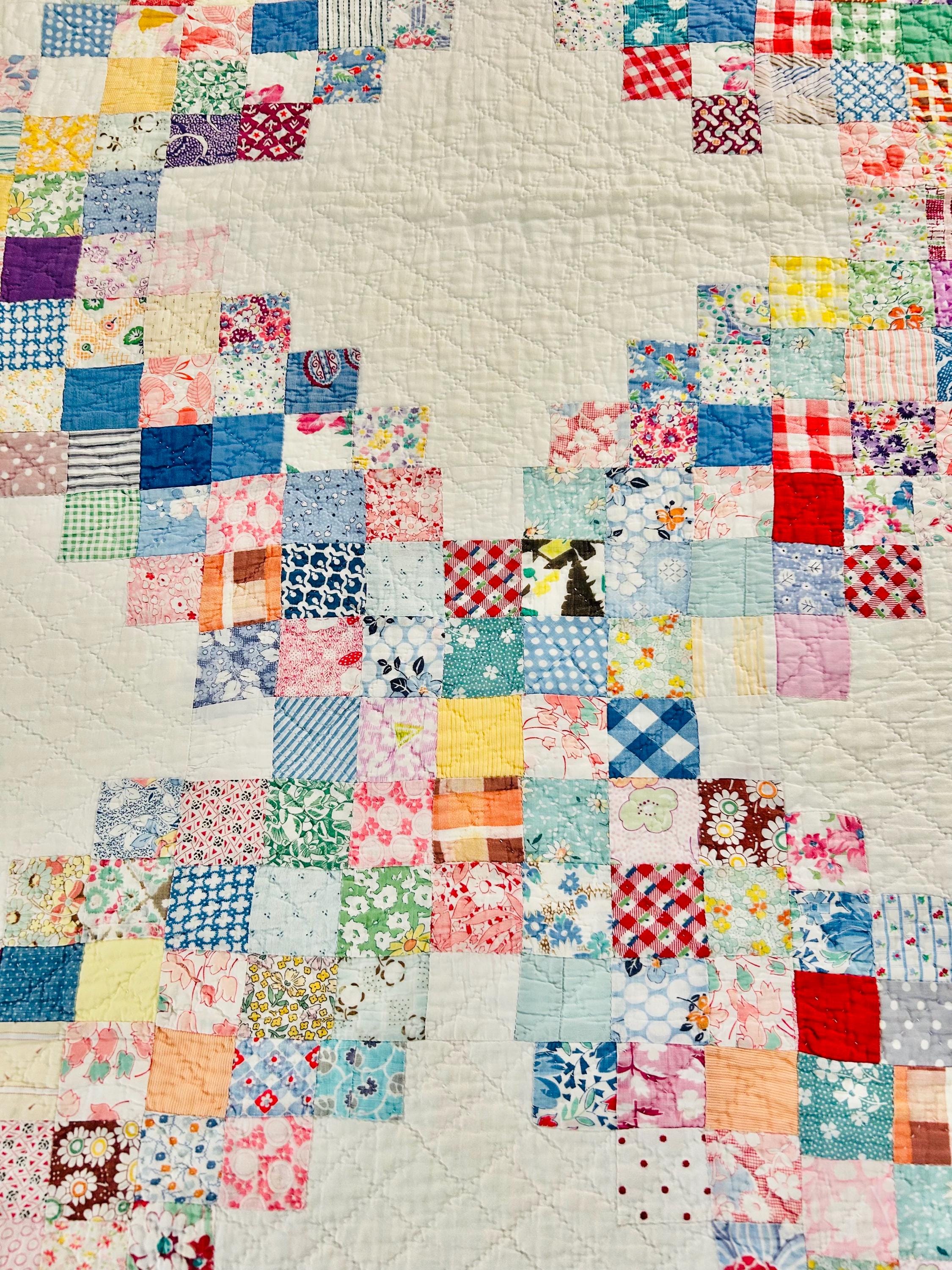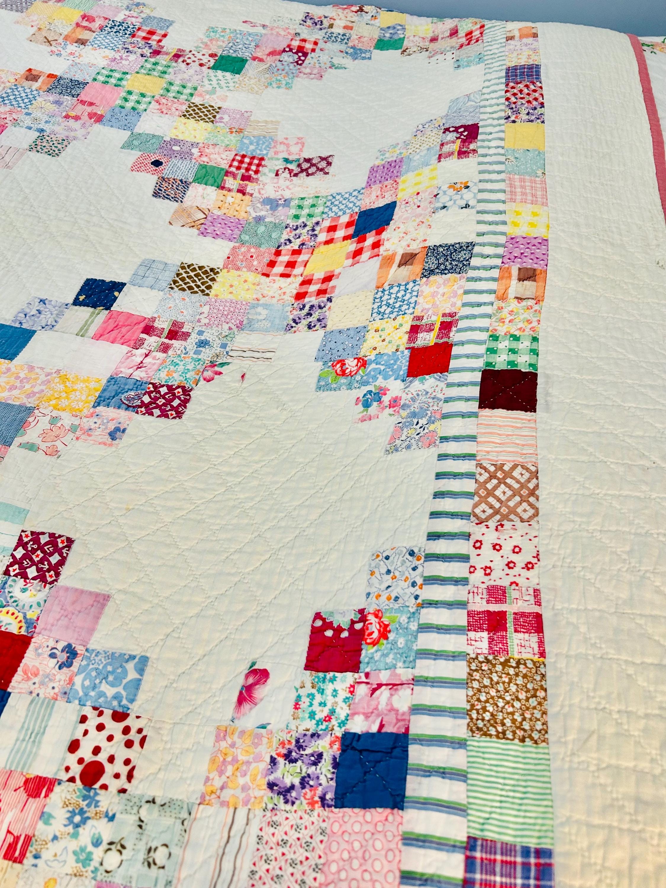 This is a wonderful Triple Irish Chain Quilt, circa 1930s, made from dozens of cheerful 2-inch patchwork squares and bordered on all four sides by a patchwork border. The fabrics are tiny florals, feedsack prints, ginghams, stripes, and geometric patterns. The quilt is entirely hand pieced and hand quilted, with the quilting in diagonals throughout the body of the quilt and in diamonds along the border.