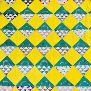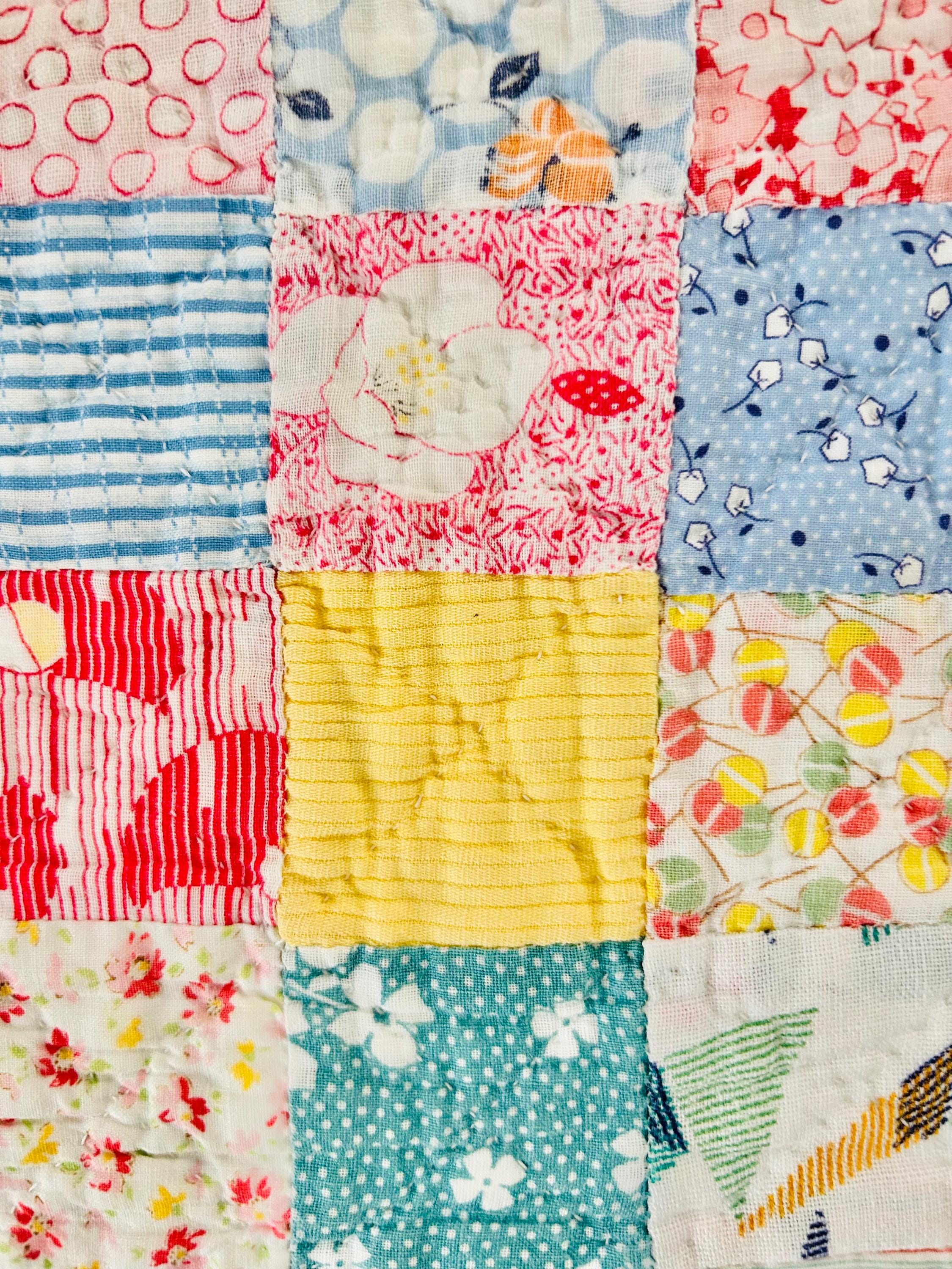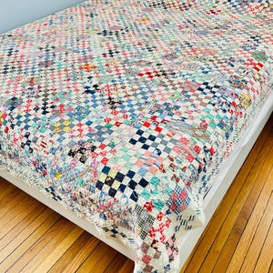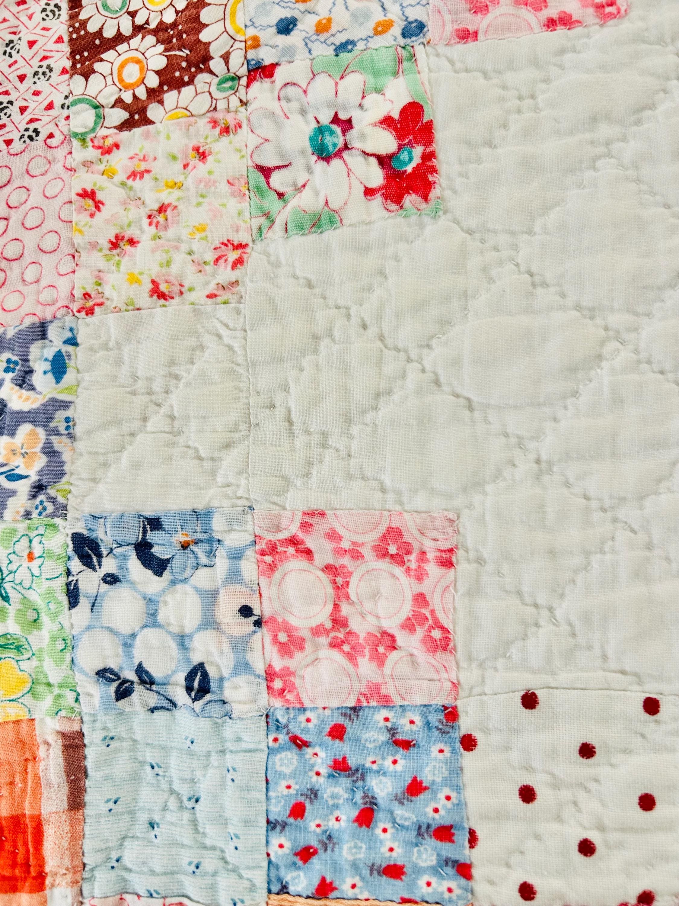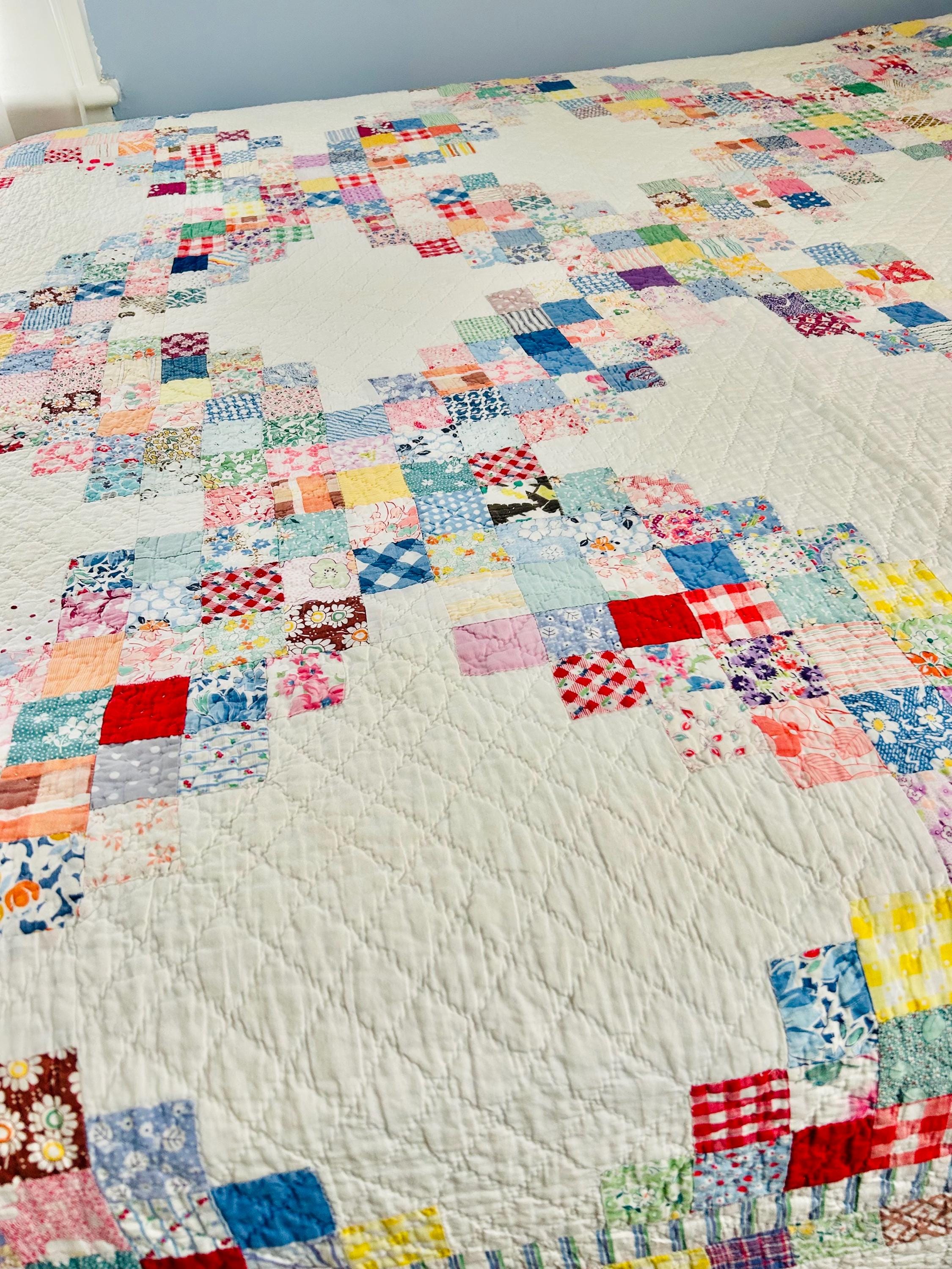 This is a wonderful Triple Irish Chain Quilt, circa 1930s, made from dozens of cheerful 2-inch patchwork squares and bordered on all four sides by a patchwork border. The fabrics are tiny florals, feedsack prints, ginghams, stripes, and geometric patterns. The quilt is entirely hand pieced and hand quilted, with the quilting in diagonals throughout the body of the quilt and in diamonds along the border.