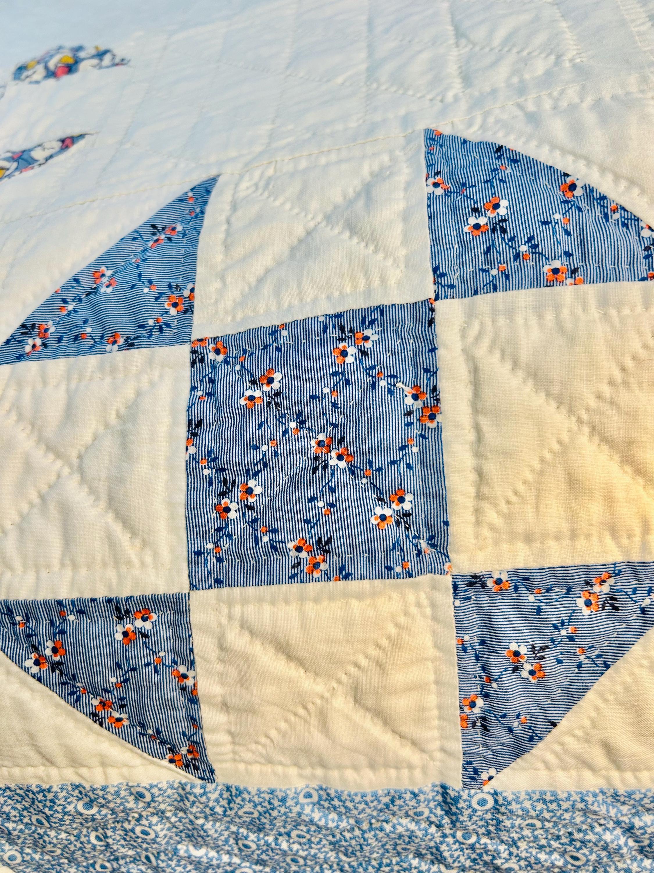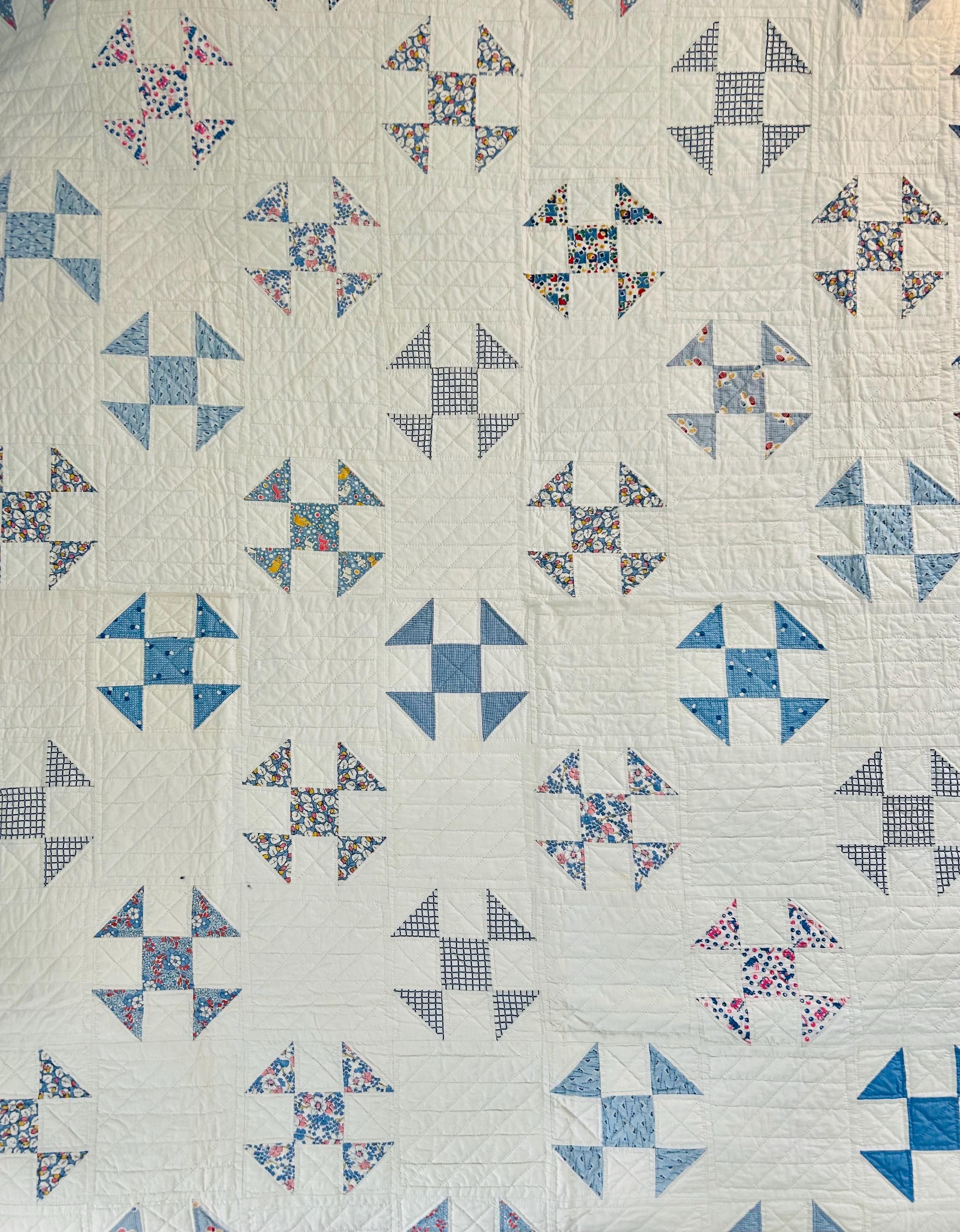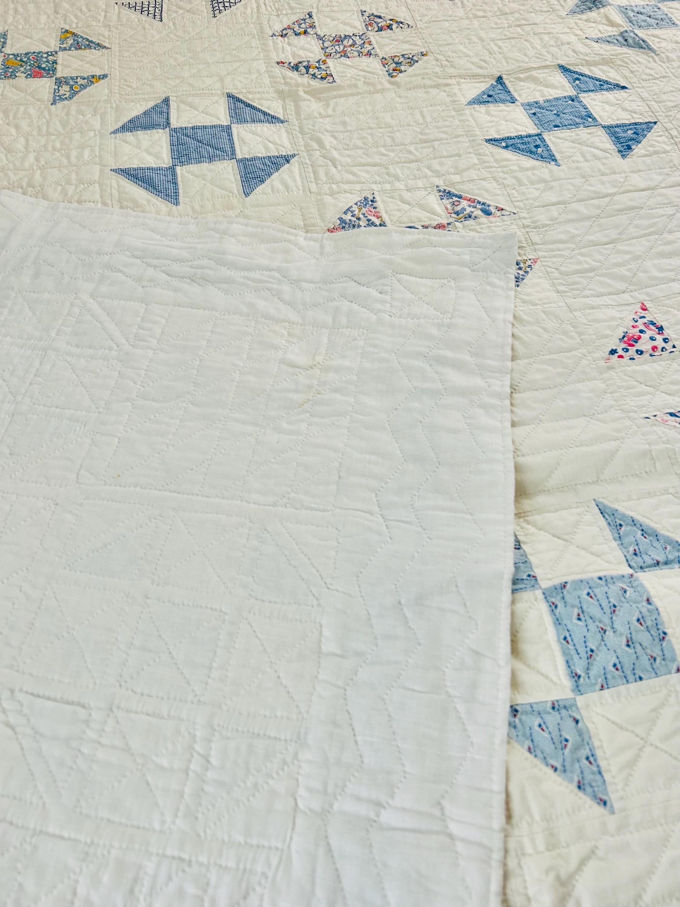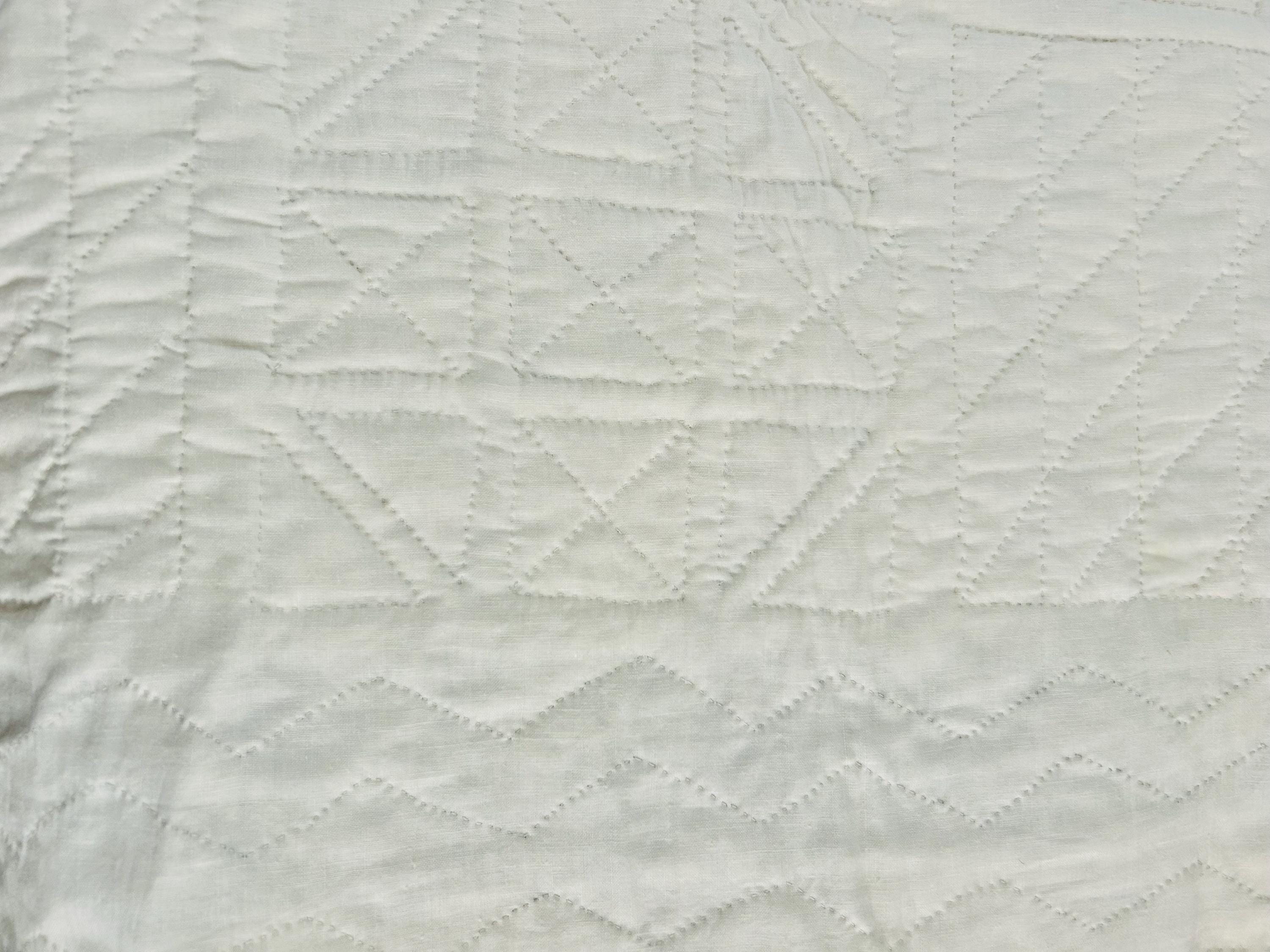 It has a four sided border made up of a white stripe and a sky blue and white tiny geometric print stripe. The border is hand-quilted in unique geometric designs while the interior is hand-quilted in diamond and cross-hatch grids. The hand quilting is very fine, consistent and precise.
