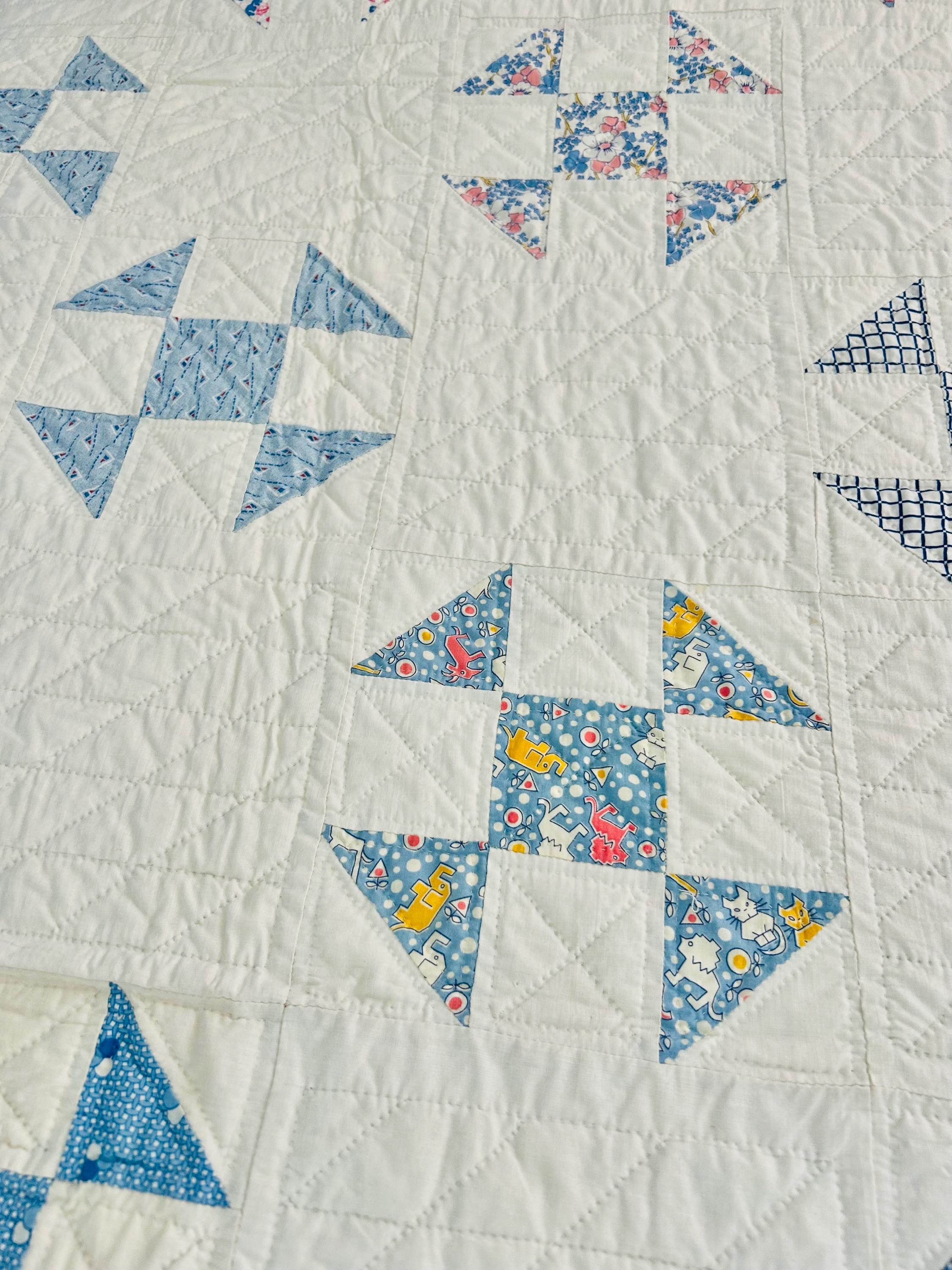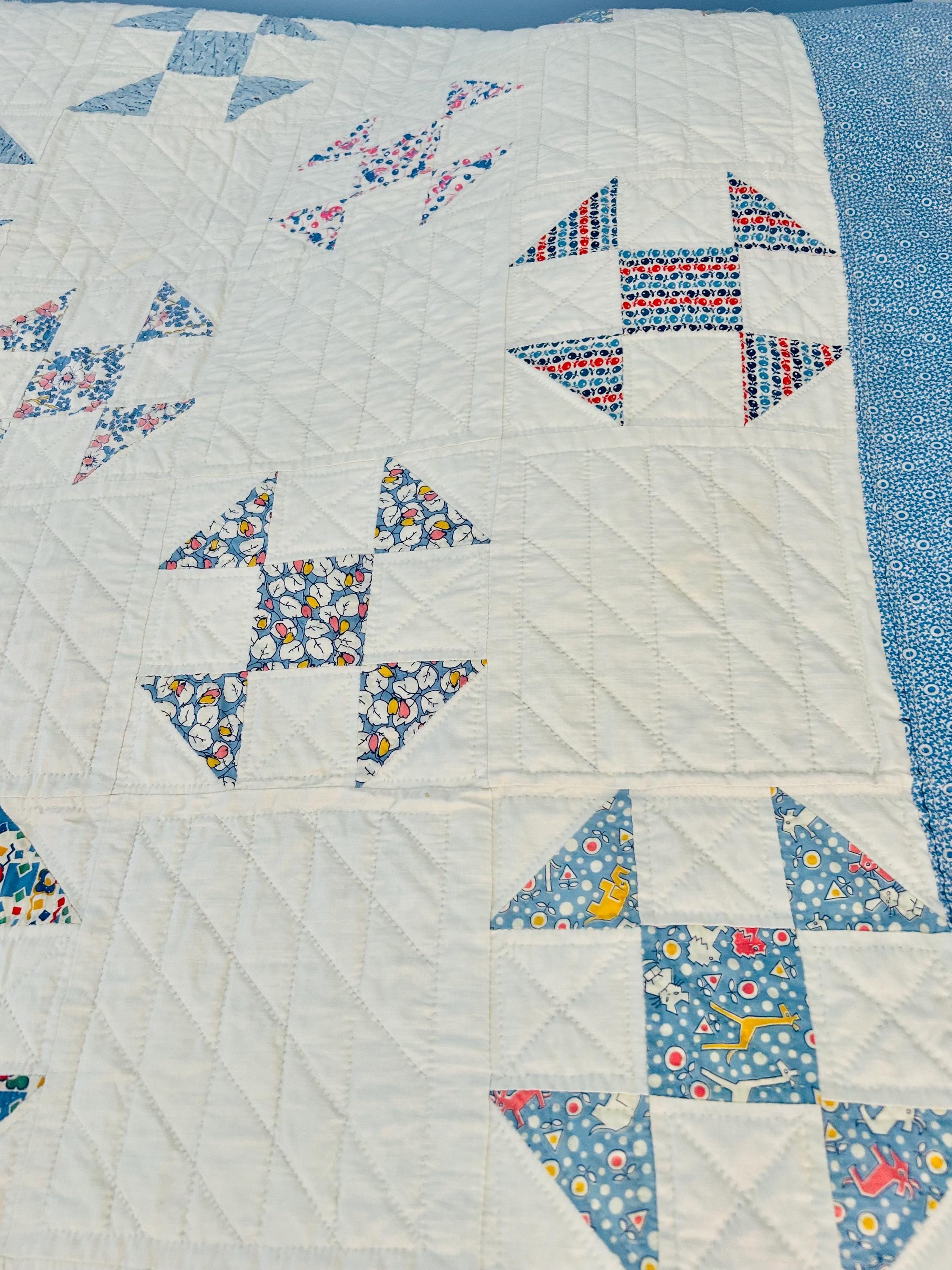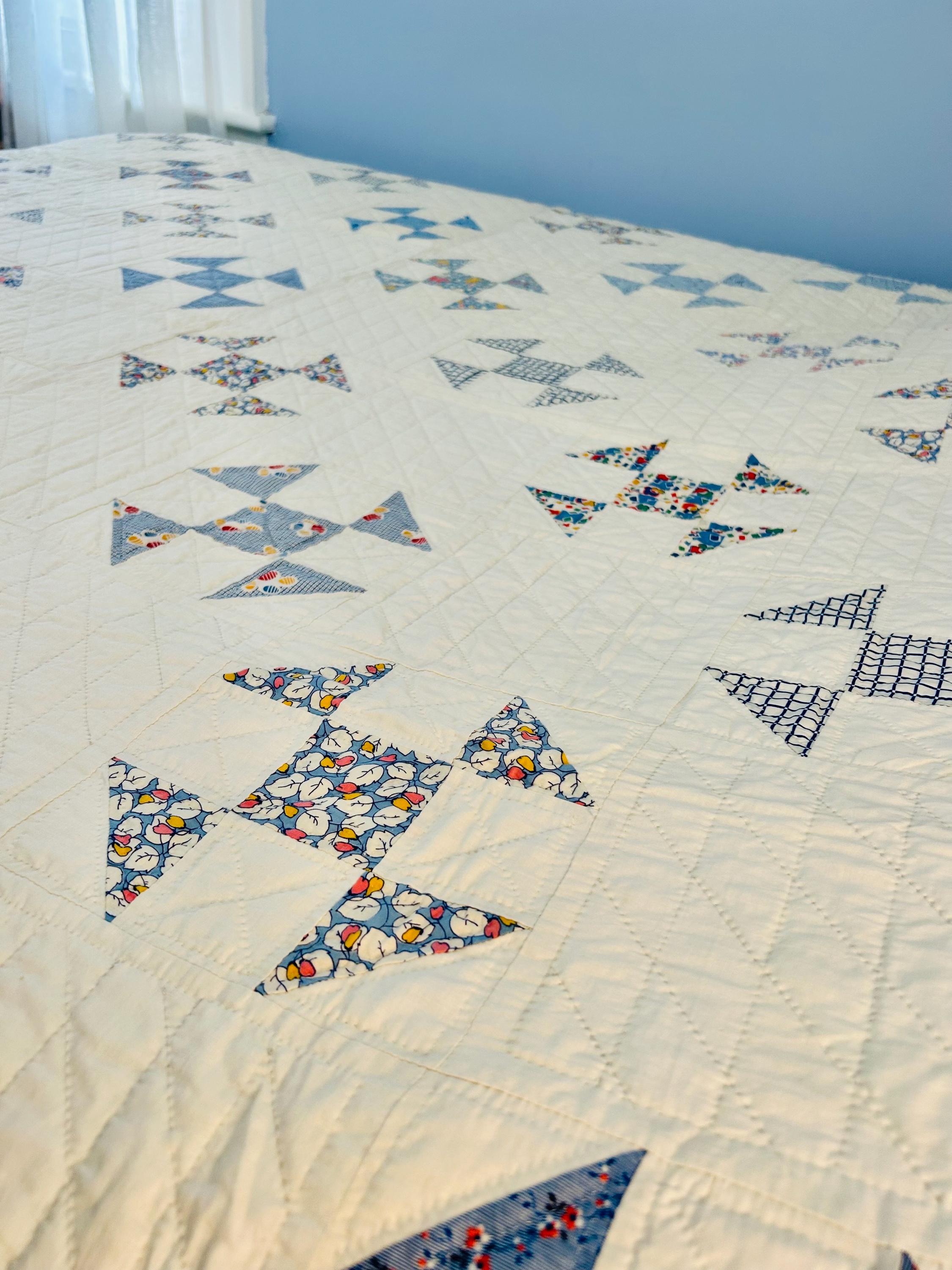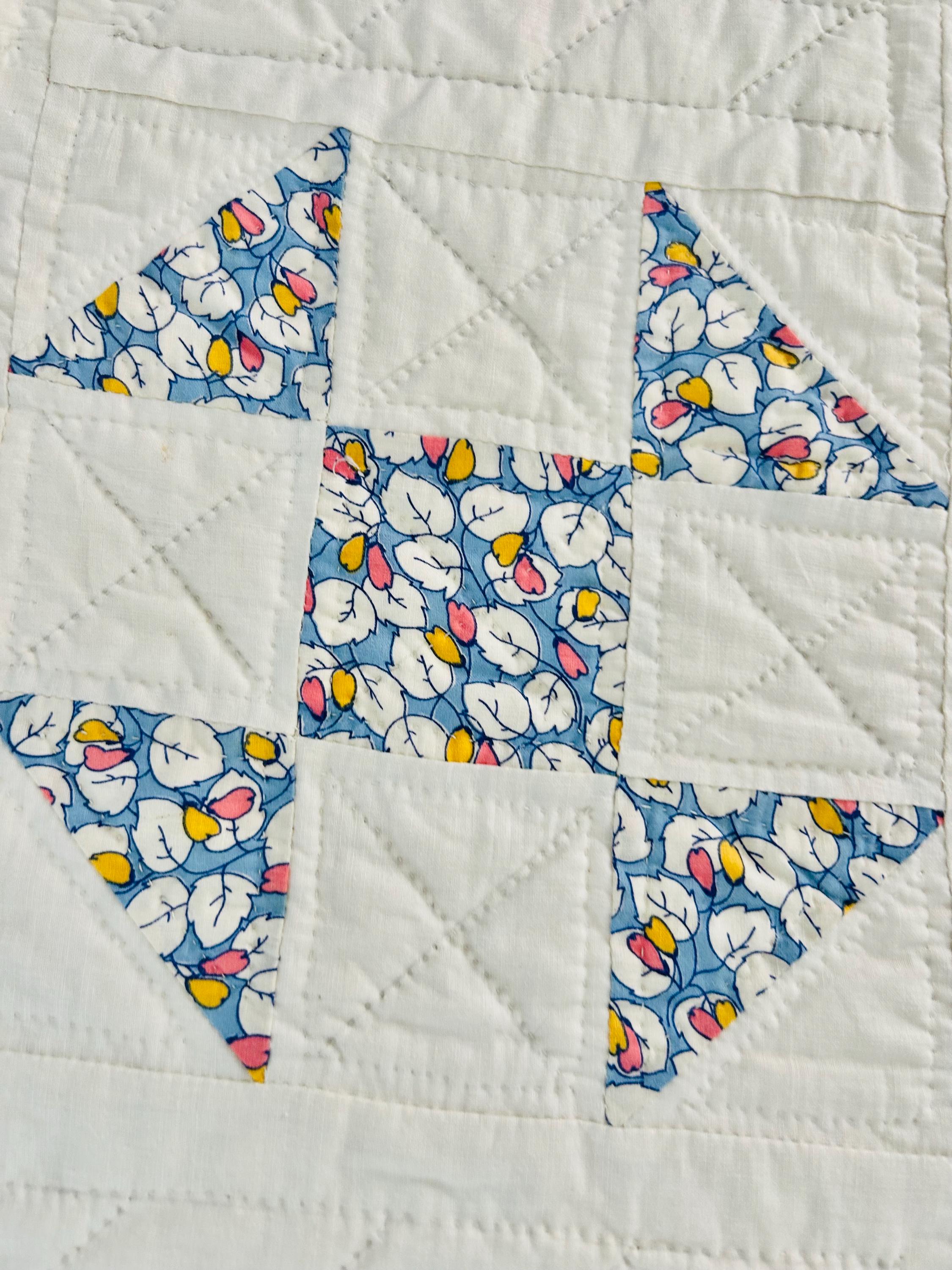 It has a four sided border made up of a white stripe and a sky blue and white tiny geometric print stripe. The border is hand-quilted in unique geometric designs while the interior is hand-quilted in diamond and cross-hatch grids. The hand quilting is very fine, consistent and precise.