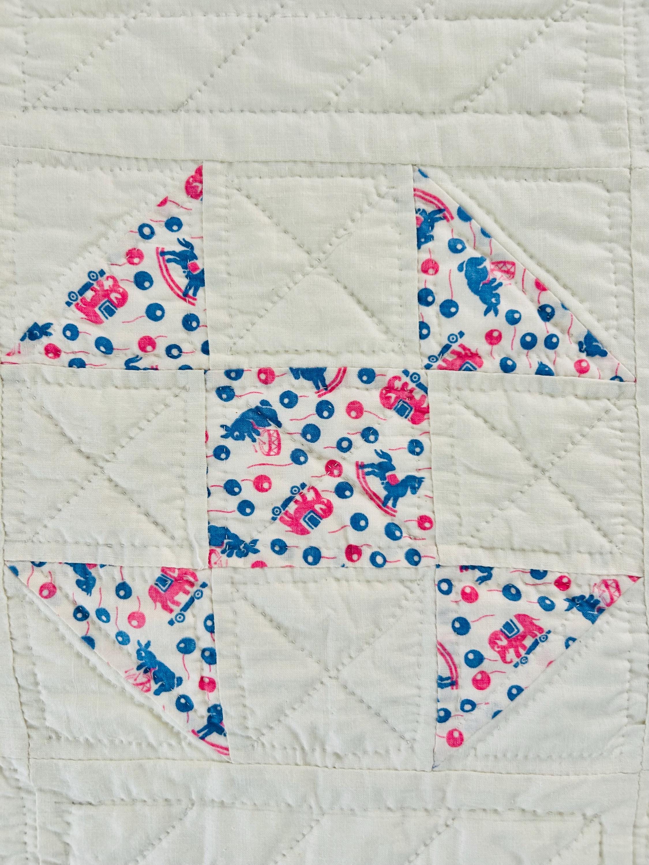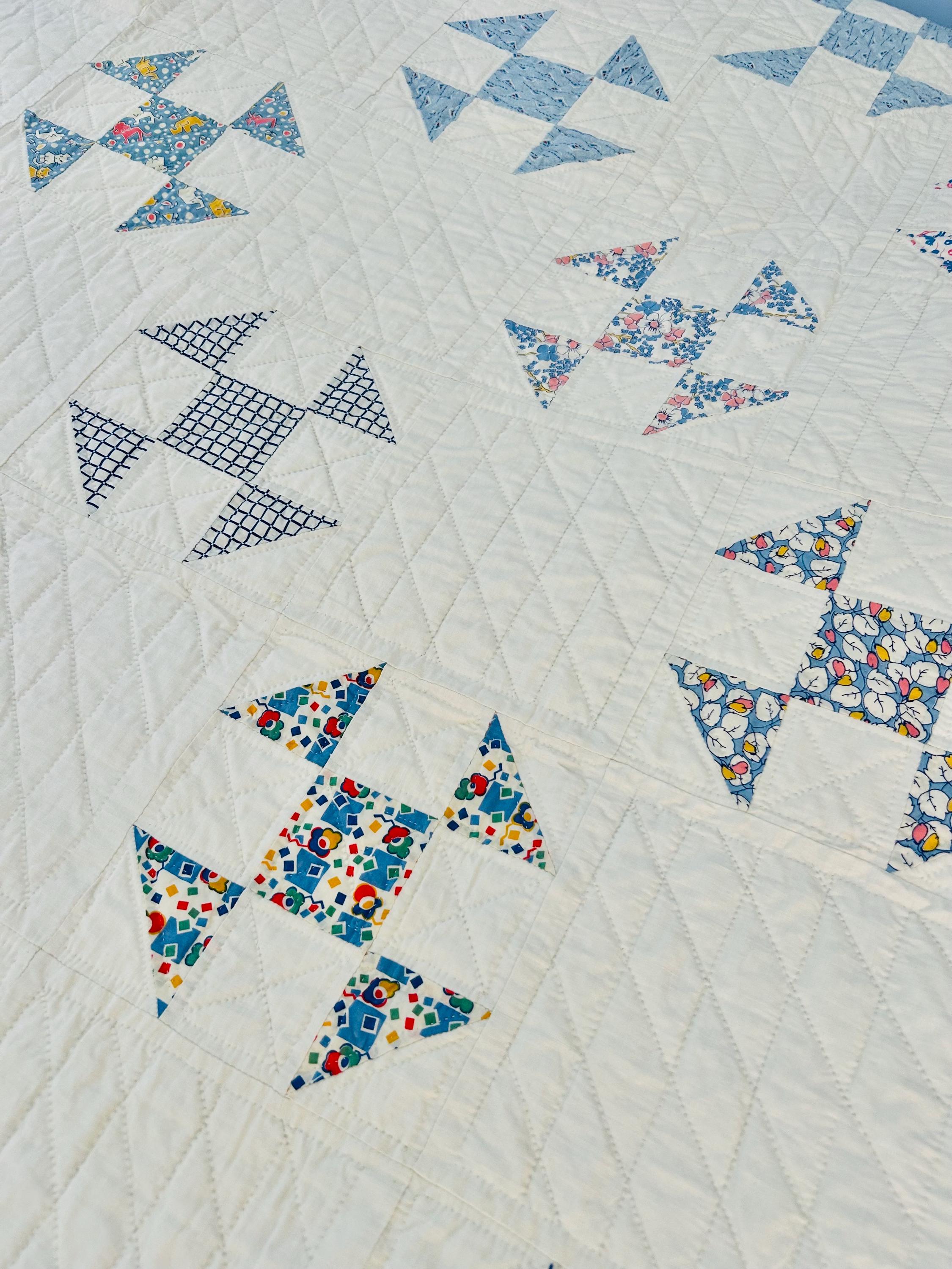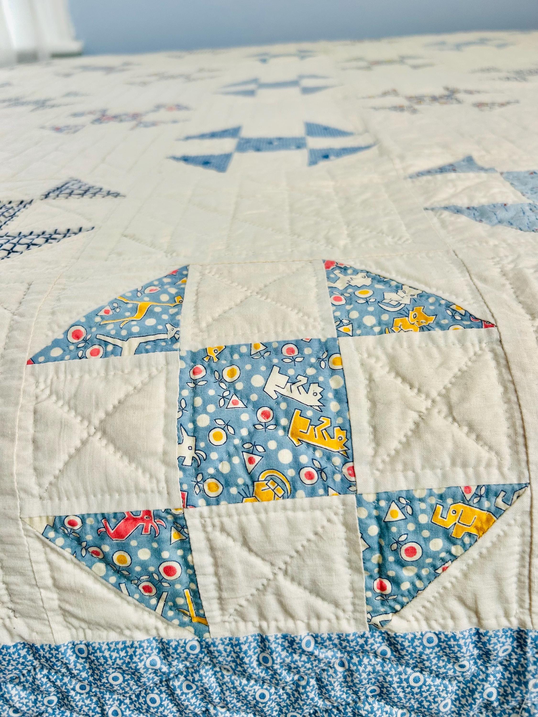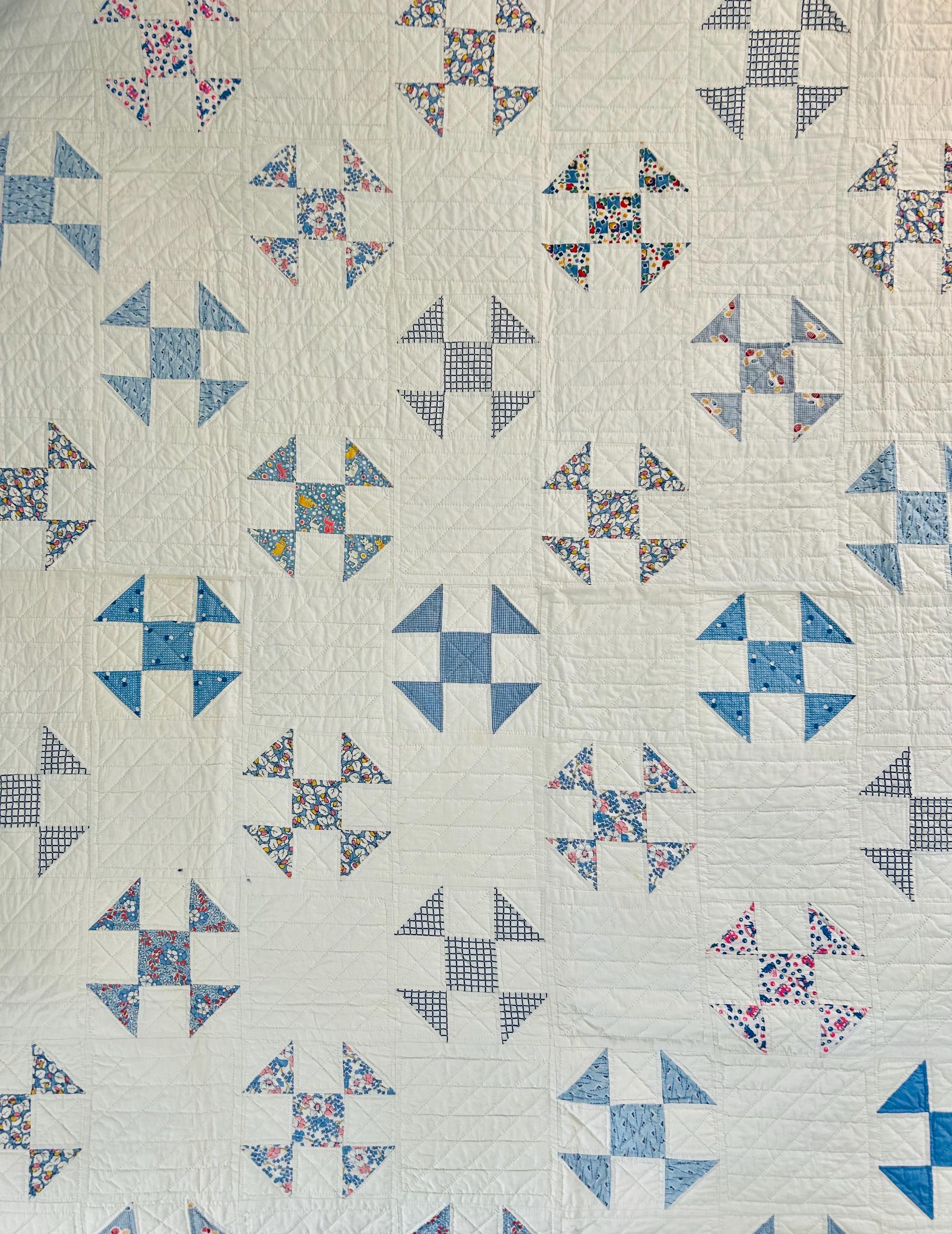 It has a four sided border made up of a white stripe and a sky blue and white tiny geometric print stripe. The border is hand-quilted in unique geometric designs while the interior is hand-quilted in diamond and cross-hatch grids. The hand quilting is very fine, consistent and precise.