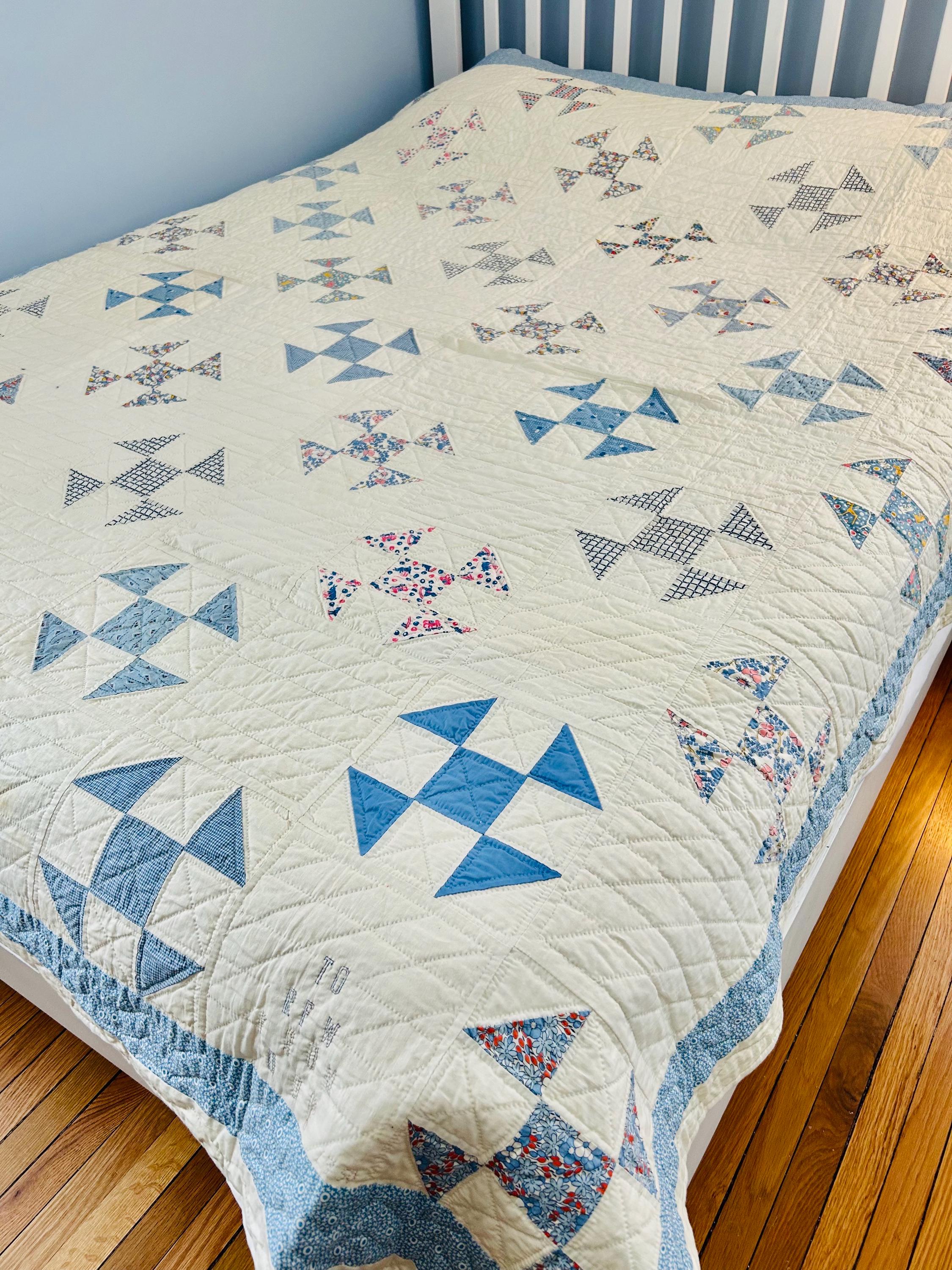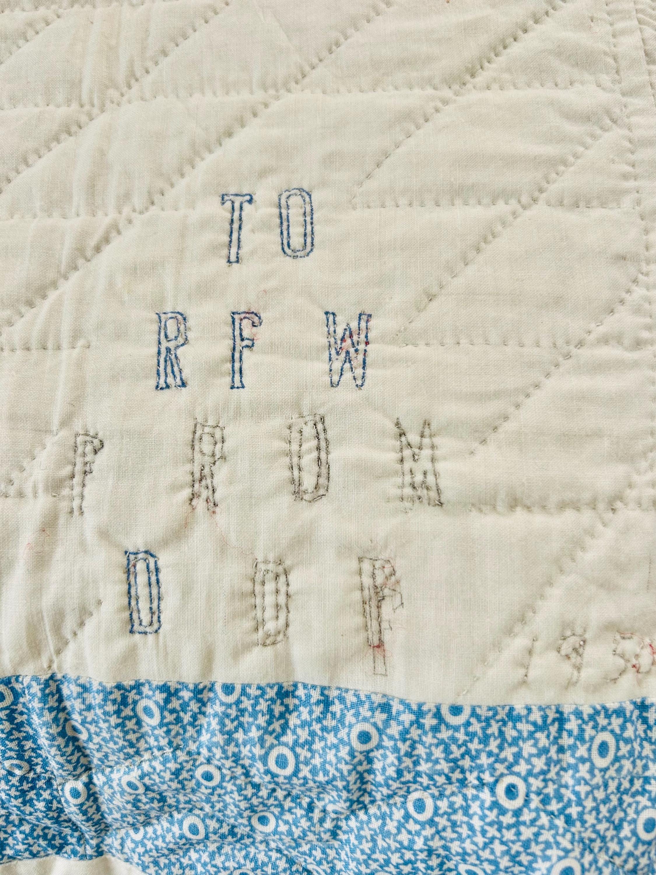 Details: • Pattern: Fence Row • Date: Signed and dated 1950 • Size: 70” x 86” • Fabrics: Assorted vintage cotton prints in blue and white • Construction: Hand pieced • Quilting: Hand quilted • Signature: “TO RFW FROM DDF – 1950” • Era: Mid-century (1950)