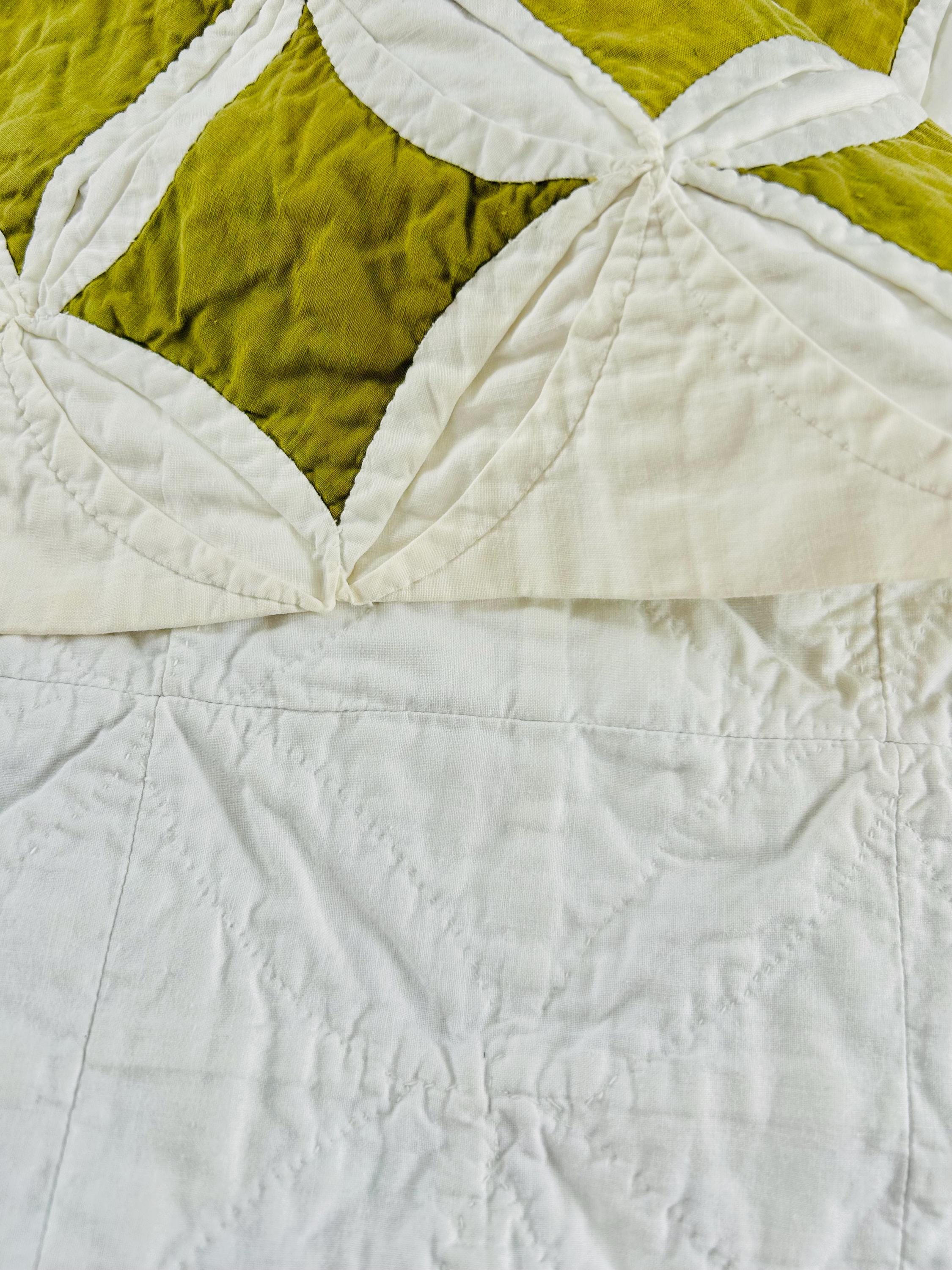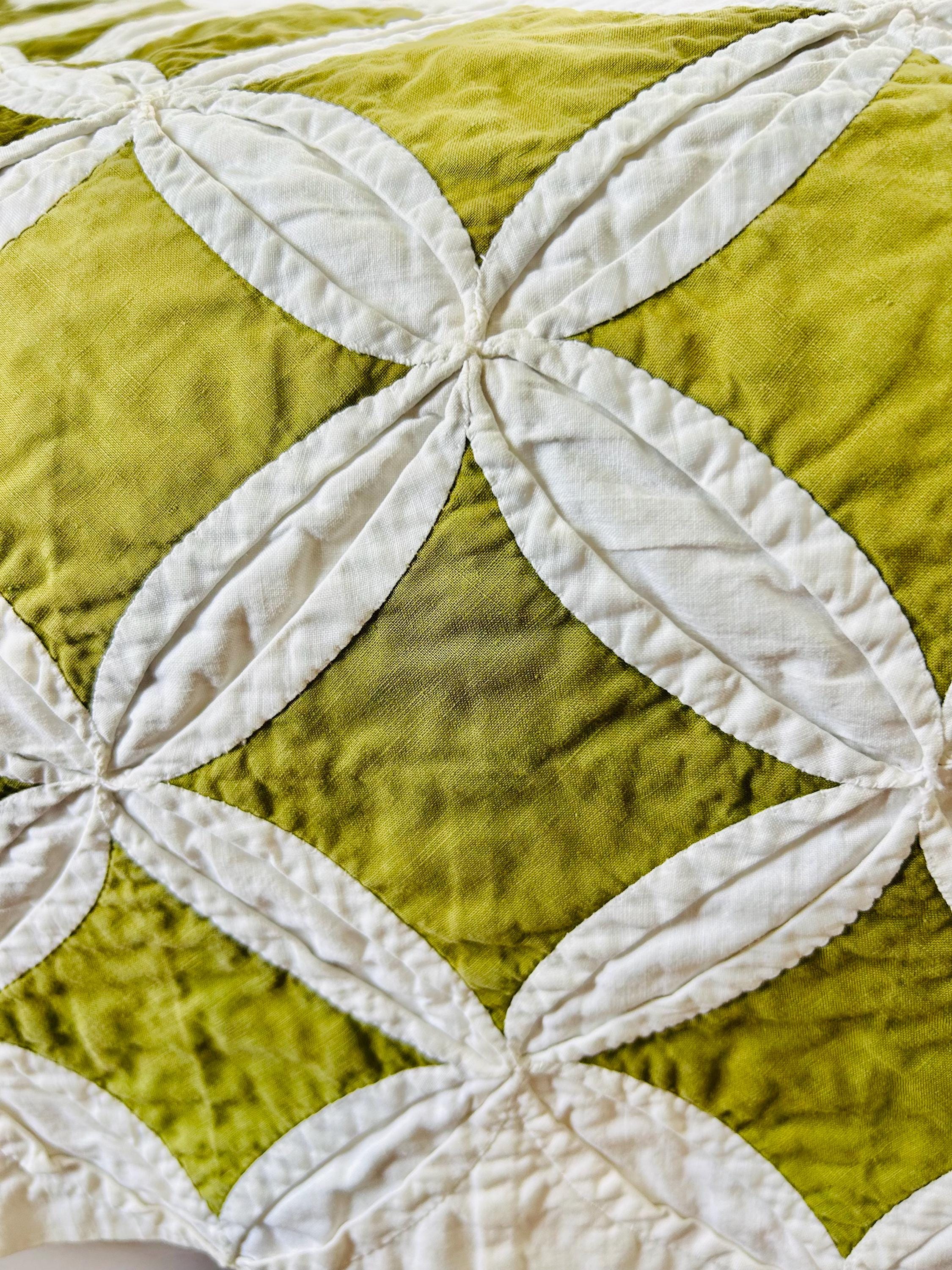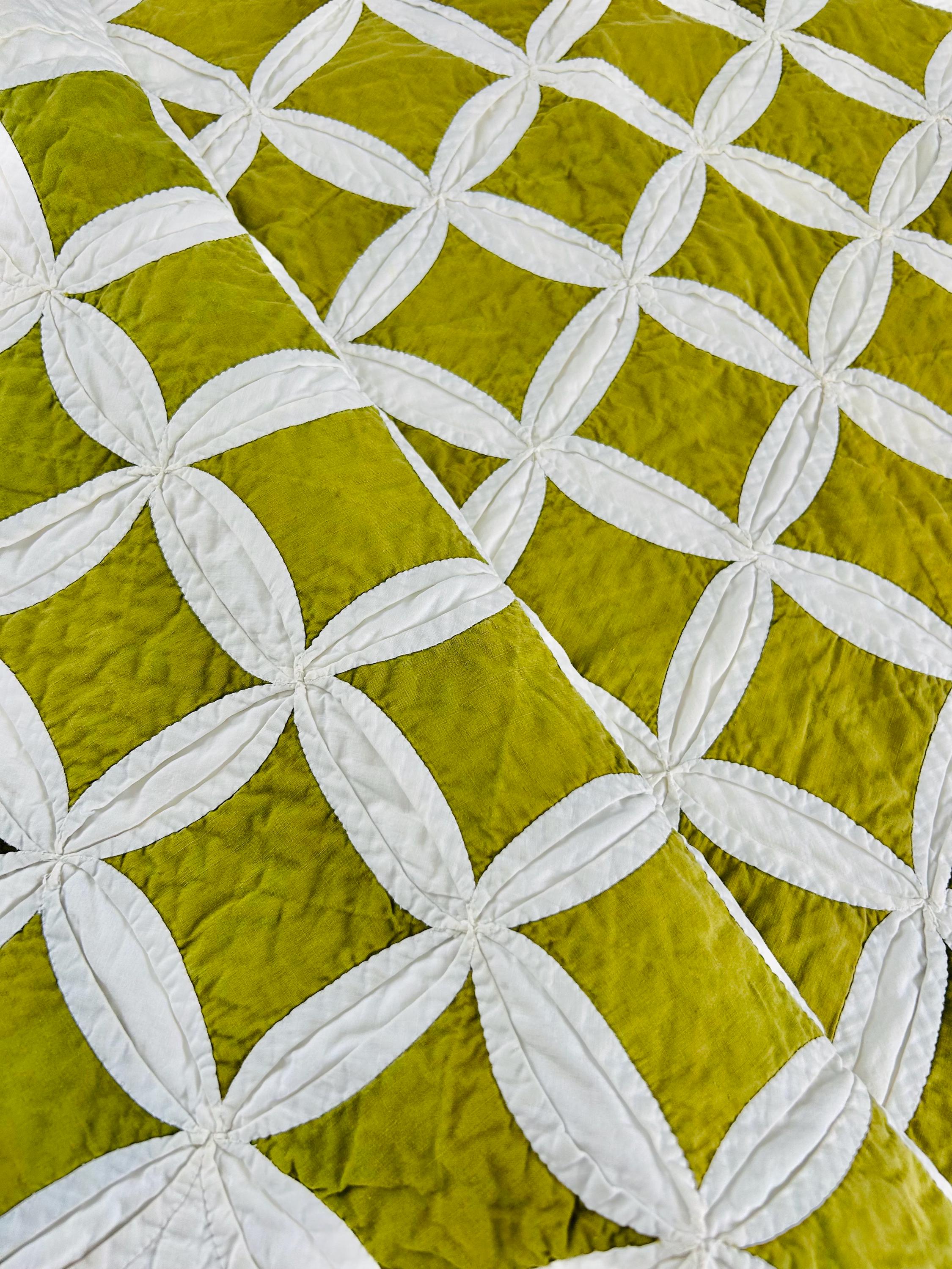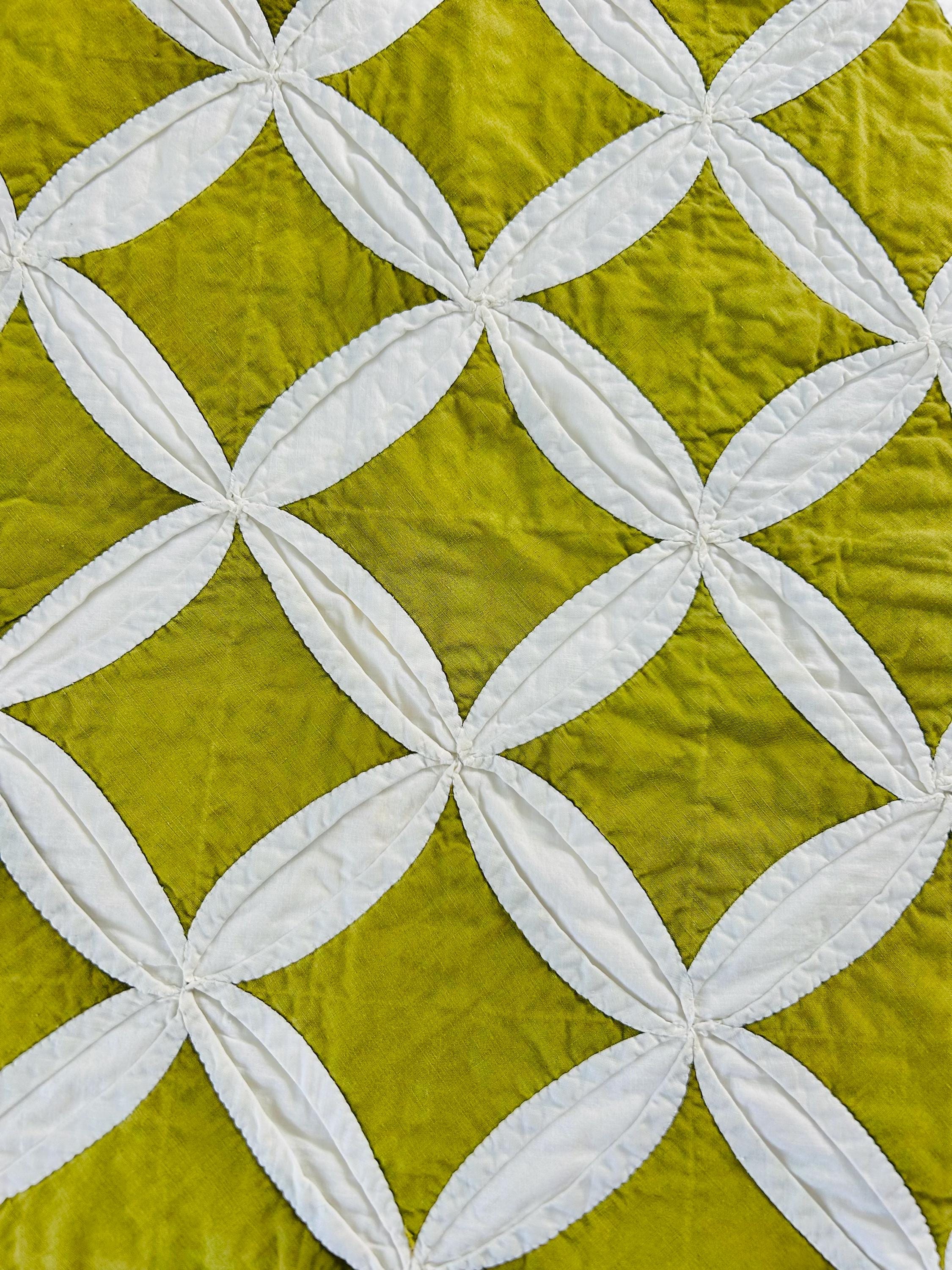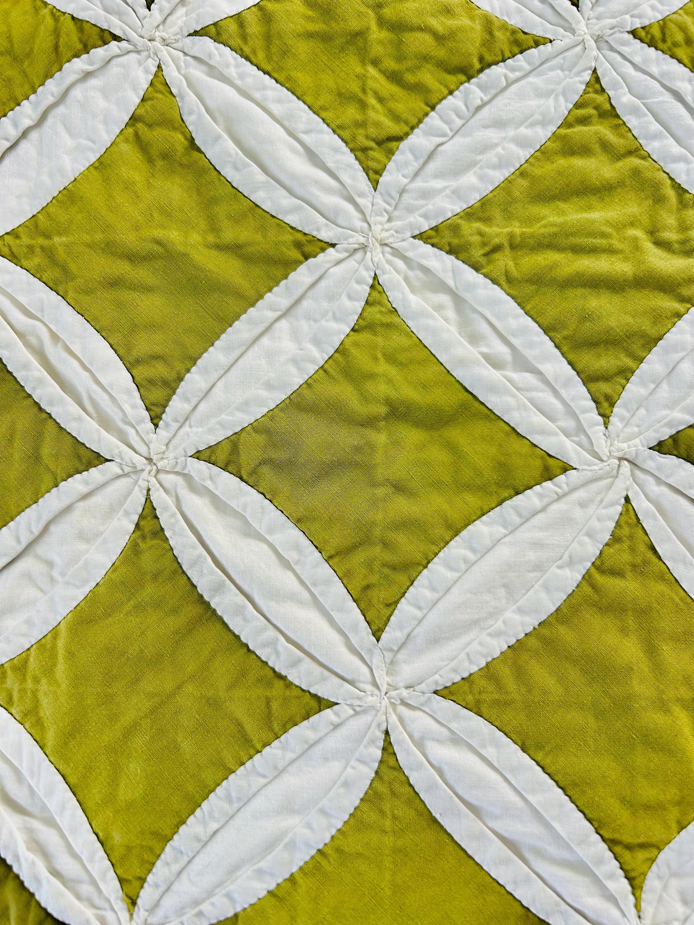 This striking vintage Cathedral Window Quilt, circa 1950-1960s, has been beautifully handmade in crisp white cotton folded “window frames” that create softly curved arches, revealing luminous chartreuse-green cotton window panes beneath.