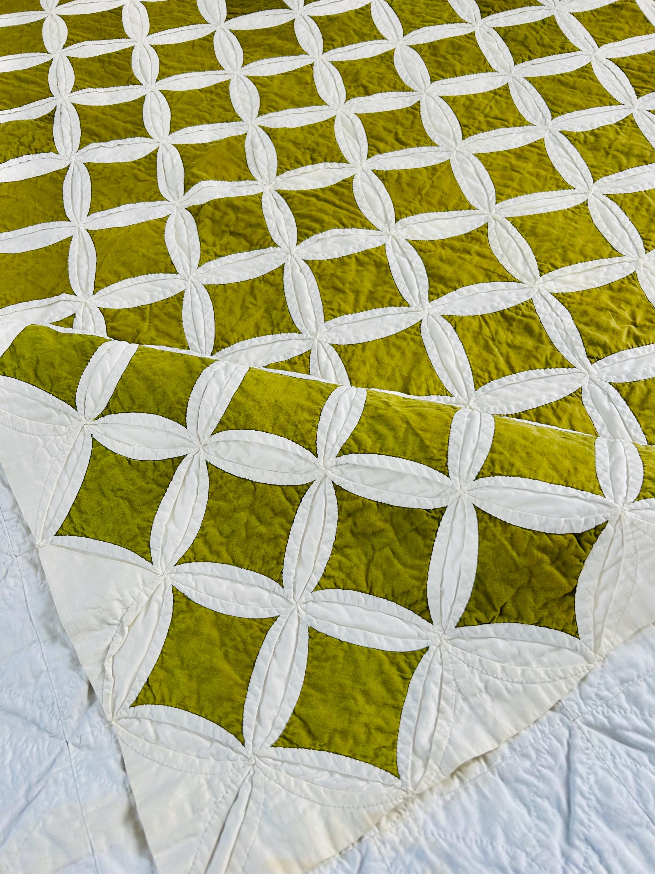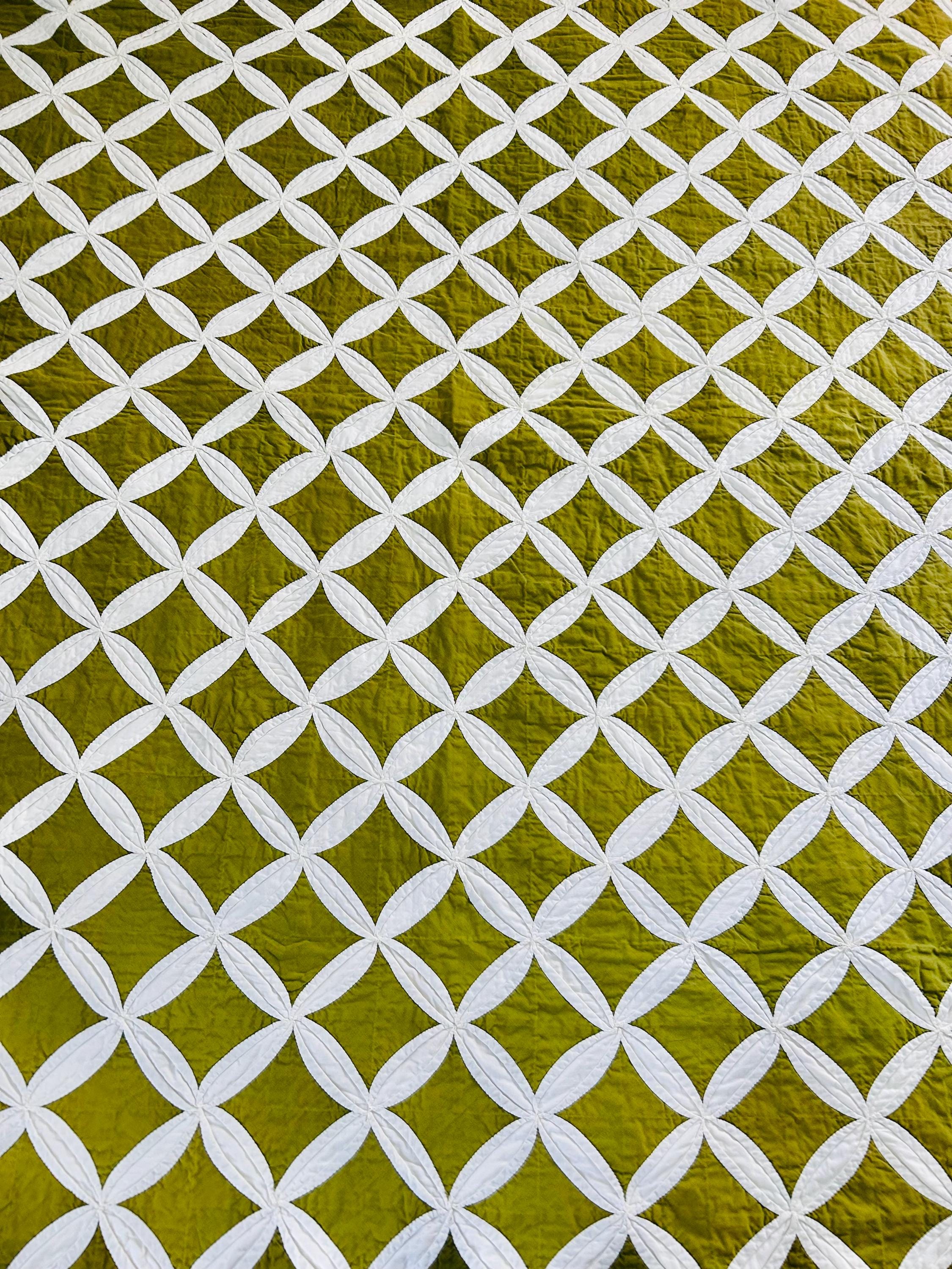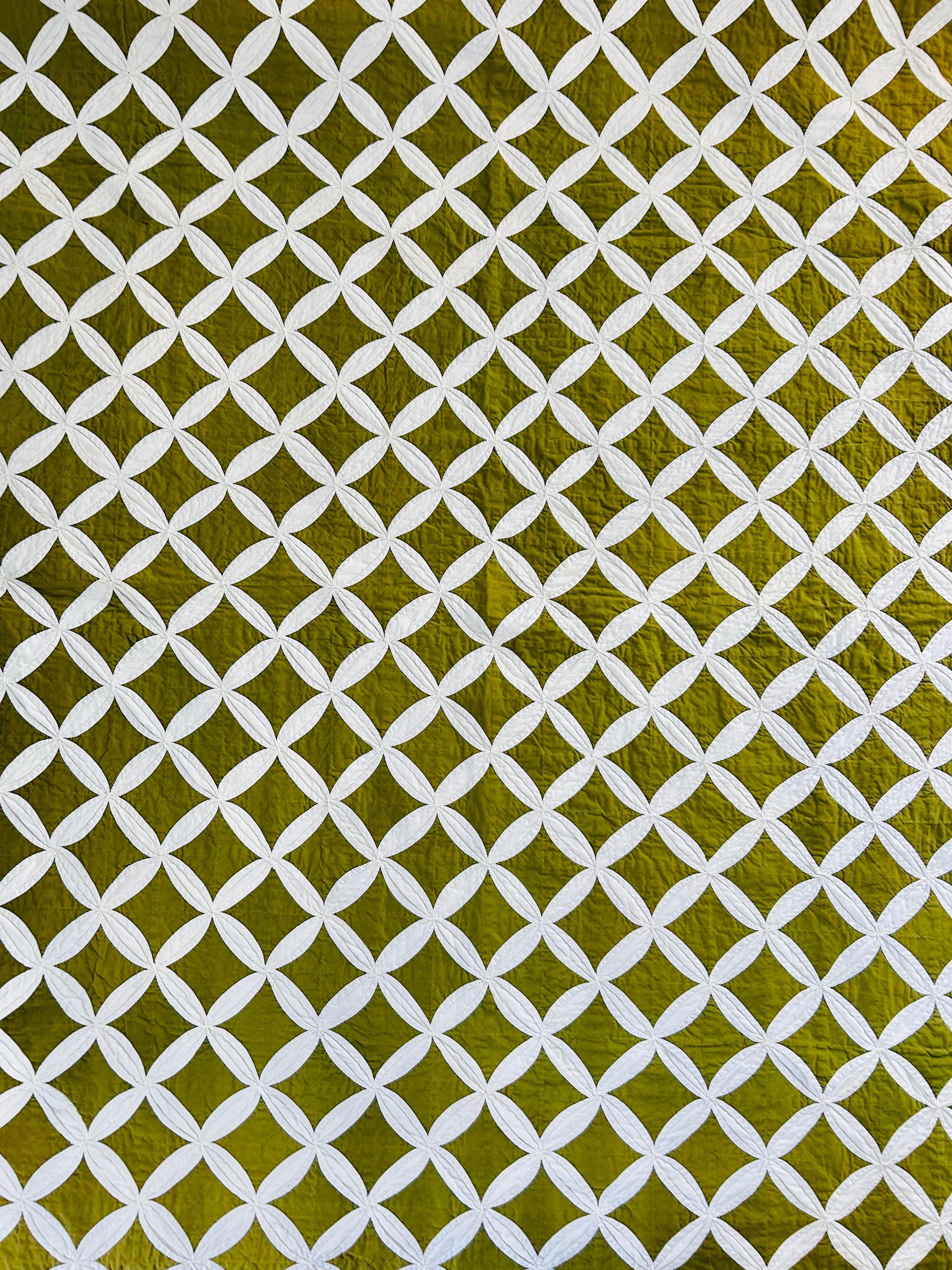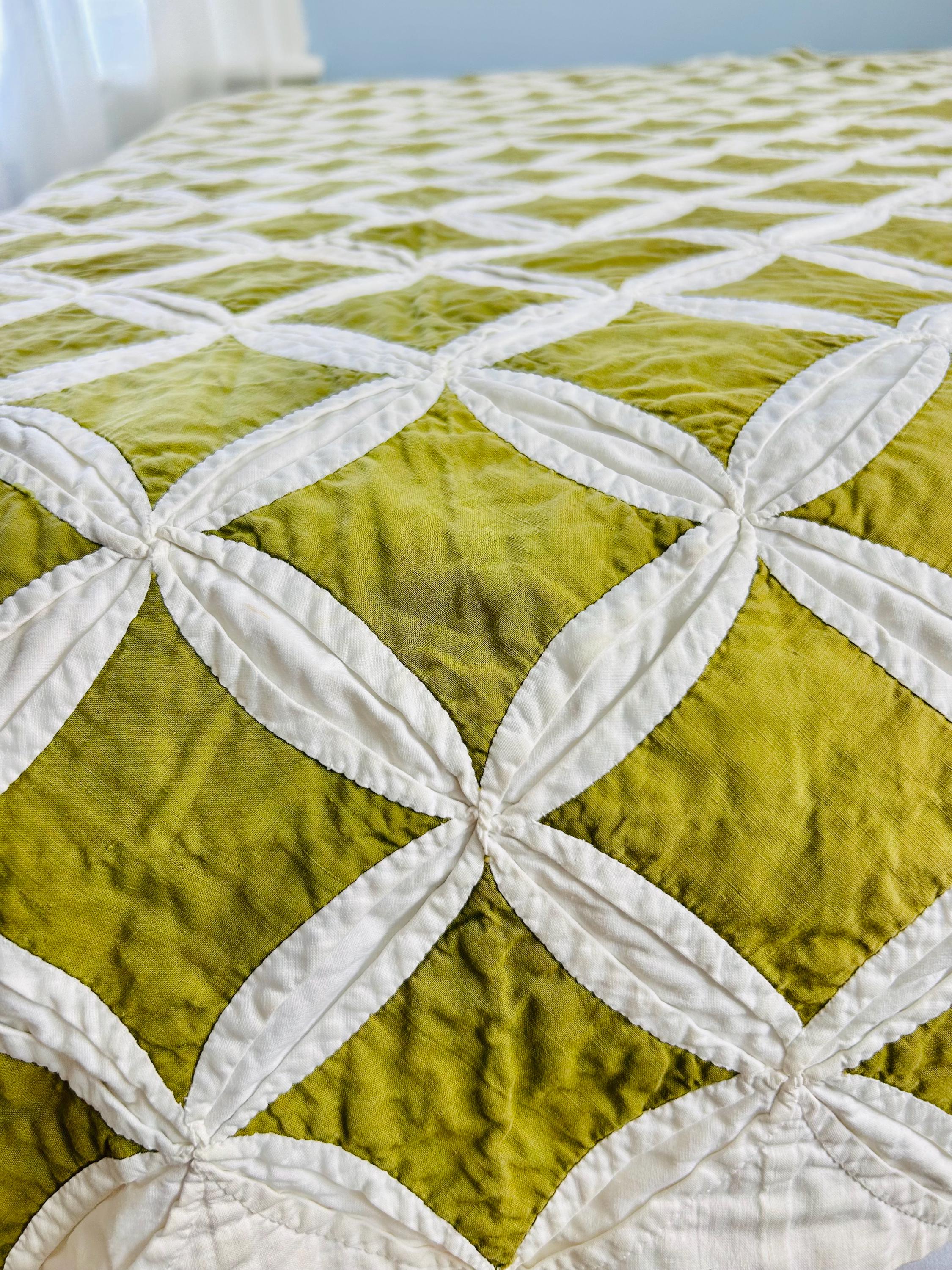 This striking vintage Cathedral Window Quilt, circa 1950-1960s, has been beautifully handmade in crisp white cotton folded “window frames” that create softly curved arches, revealing luminous chartreuse-green cotton window panes beneath.