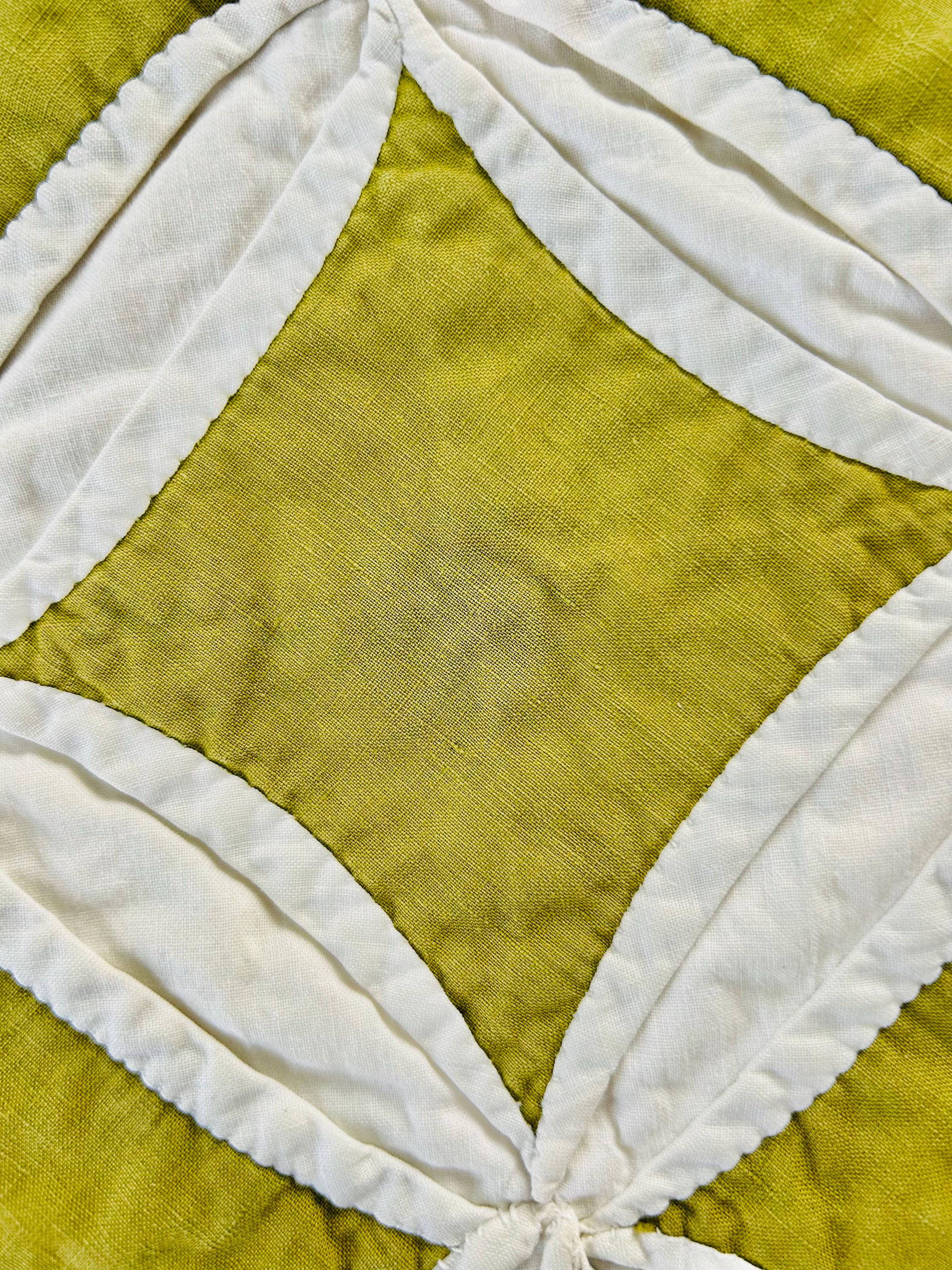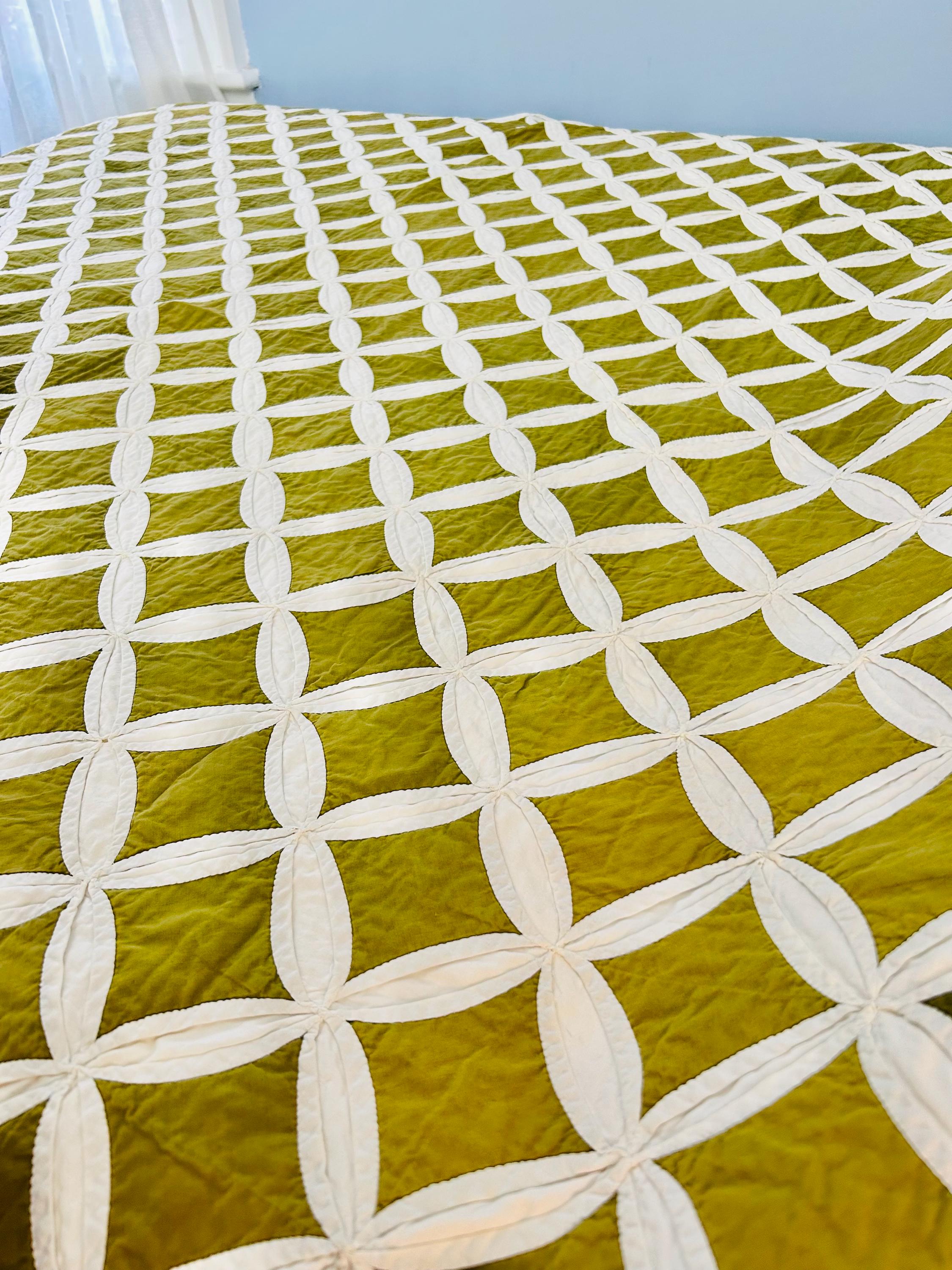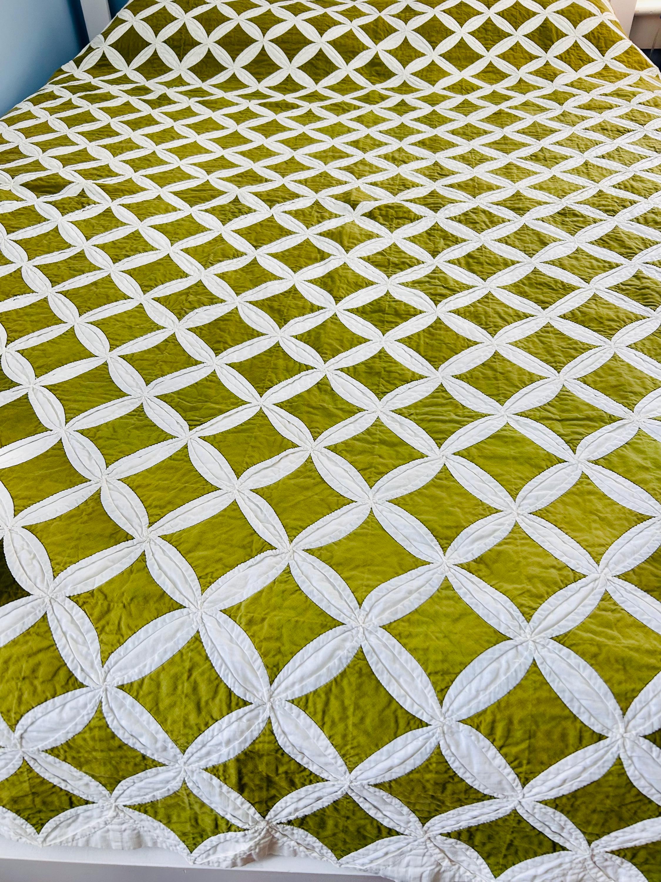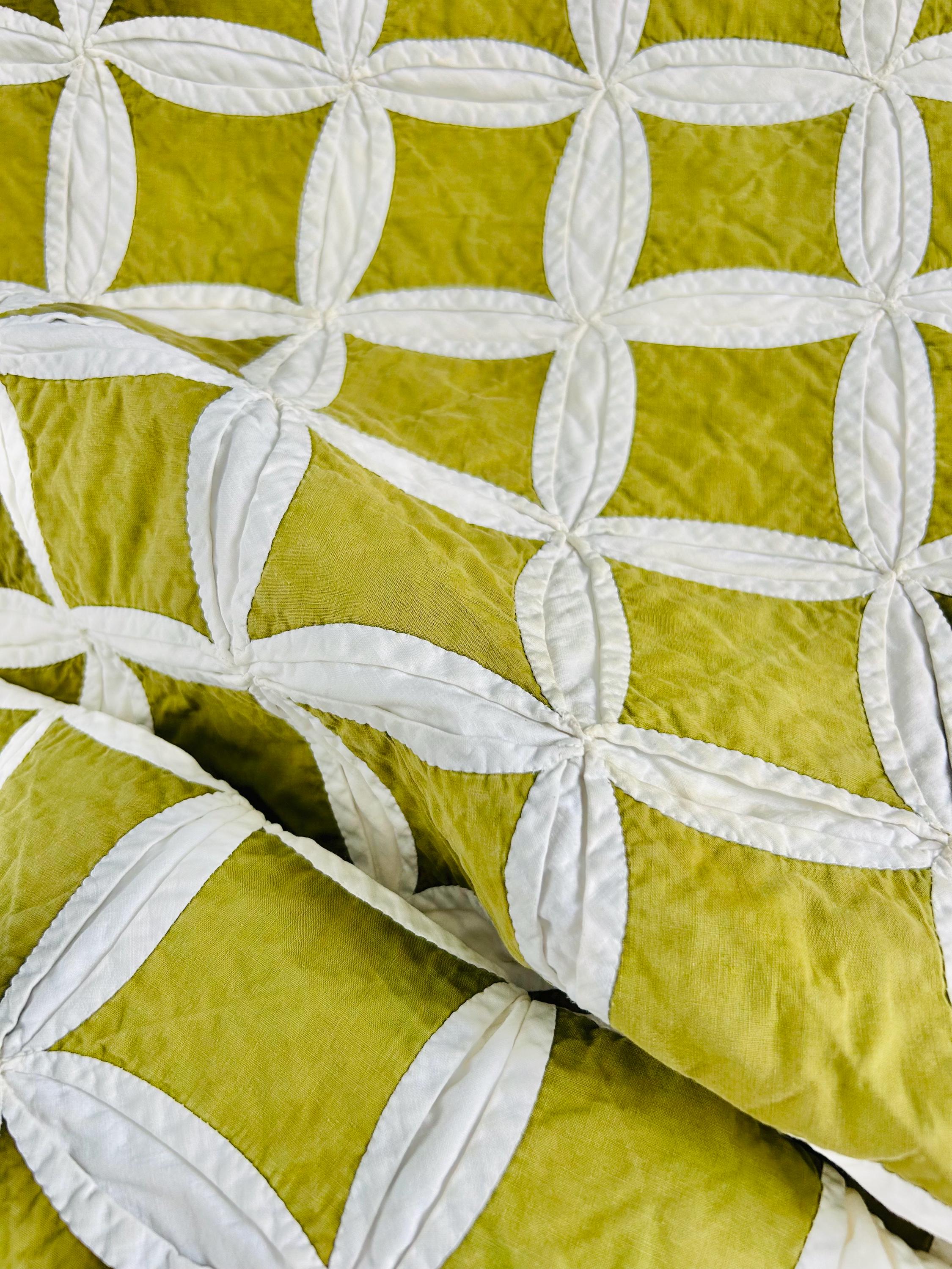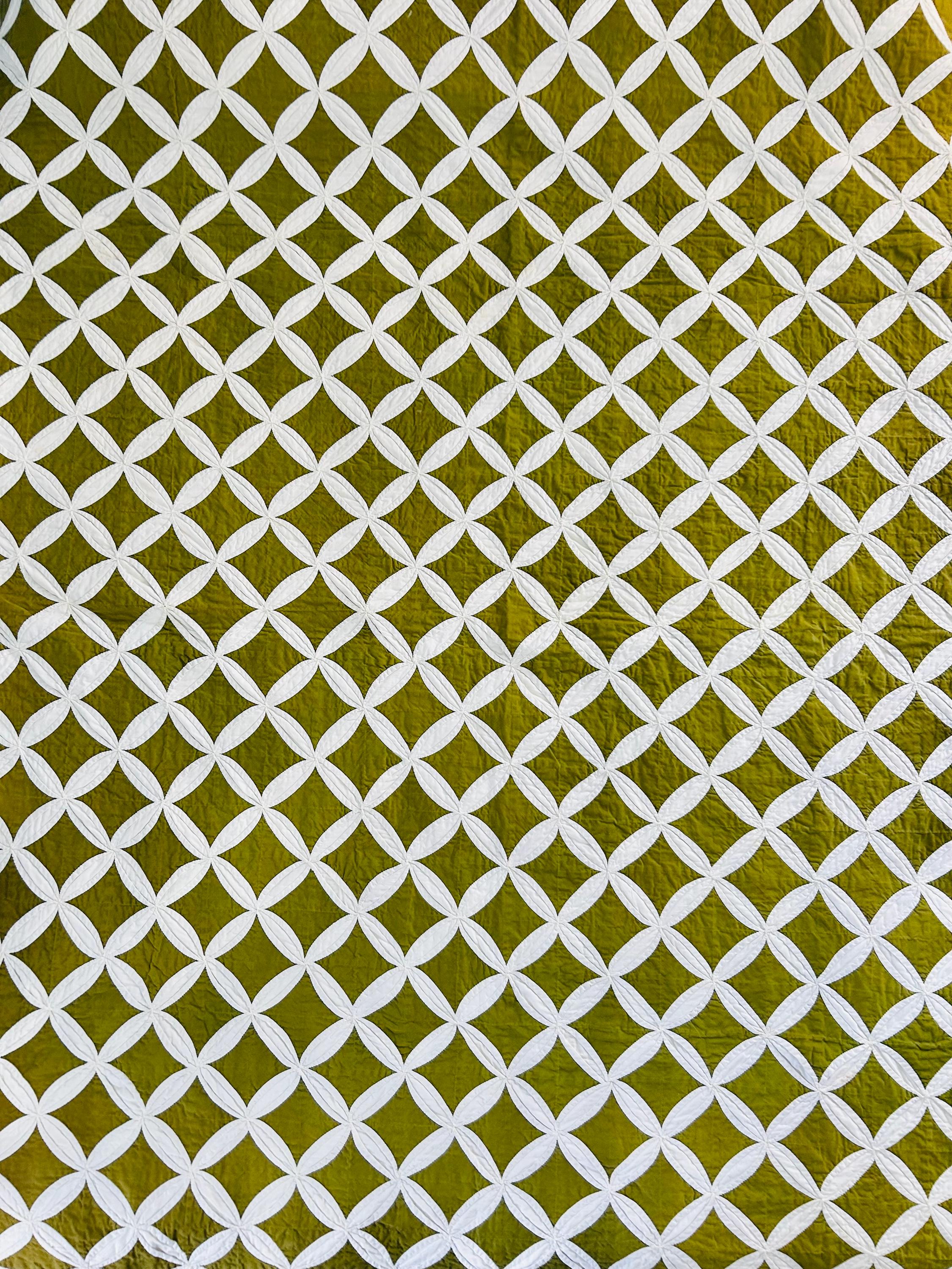This striking vintage Cathedral Window Quilt, circa 1950-1960s, has been beautifully handmade in crisp white cotton folded “window frames” that create softly curved arches, revealing luminous chartreuse-green cotton window panes beneath.