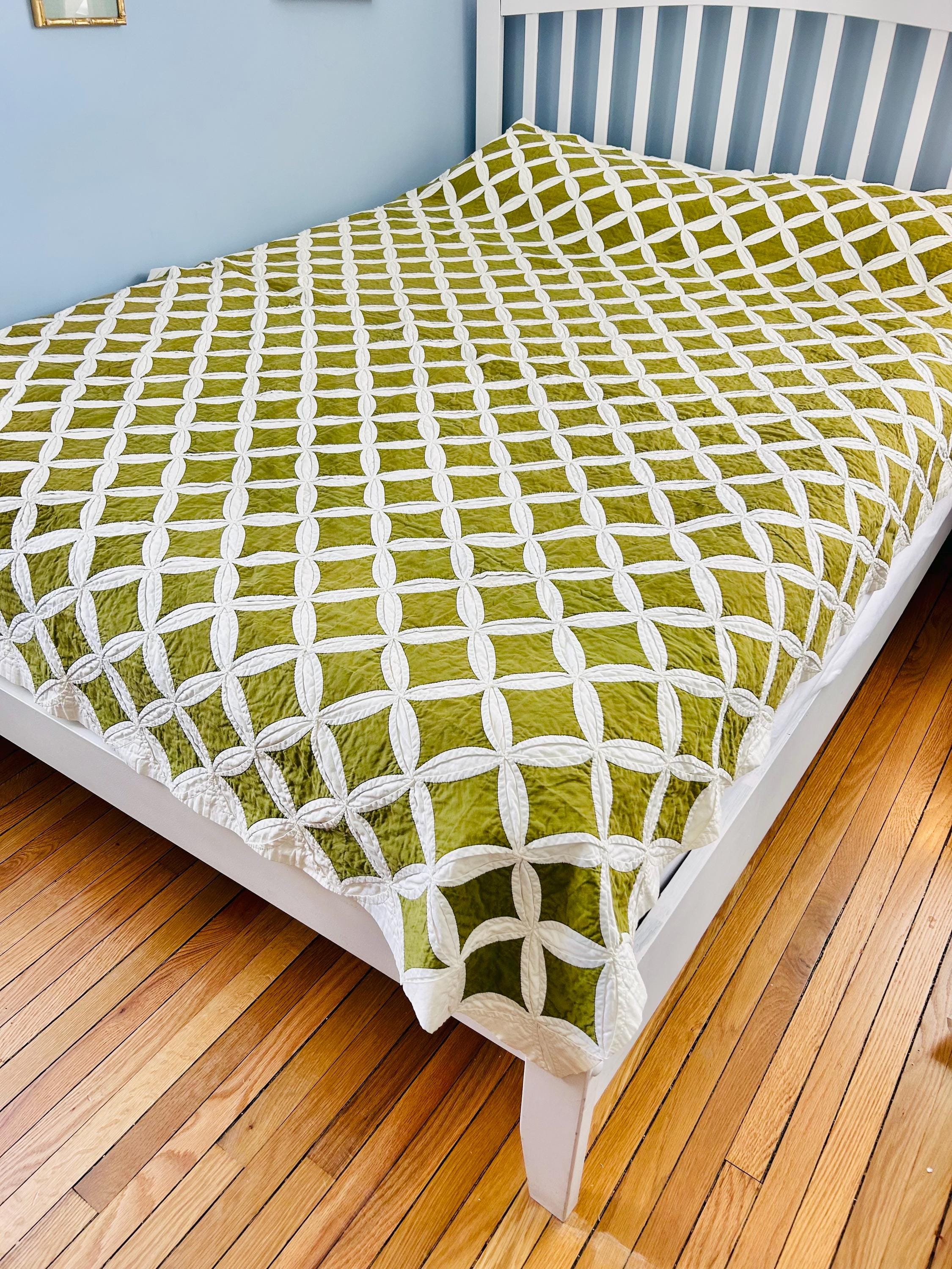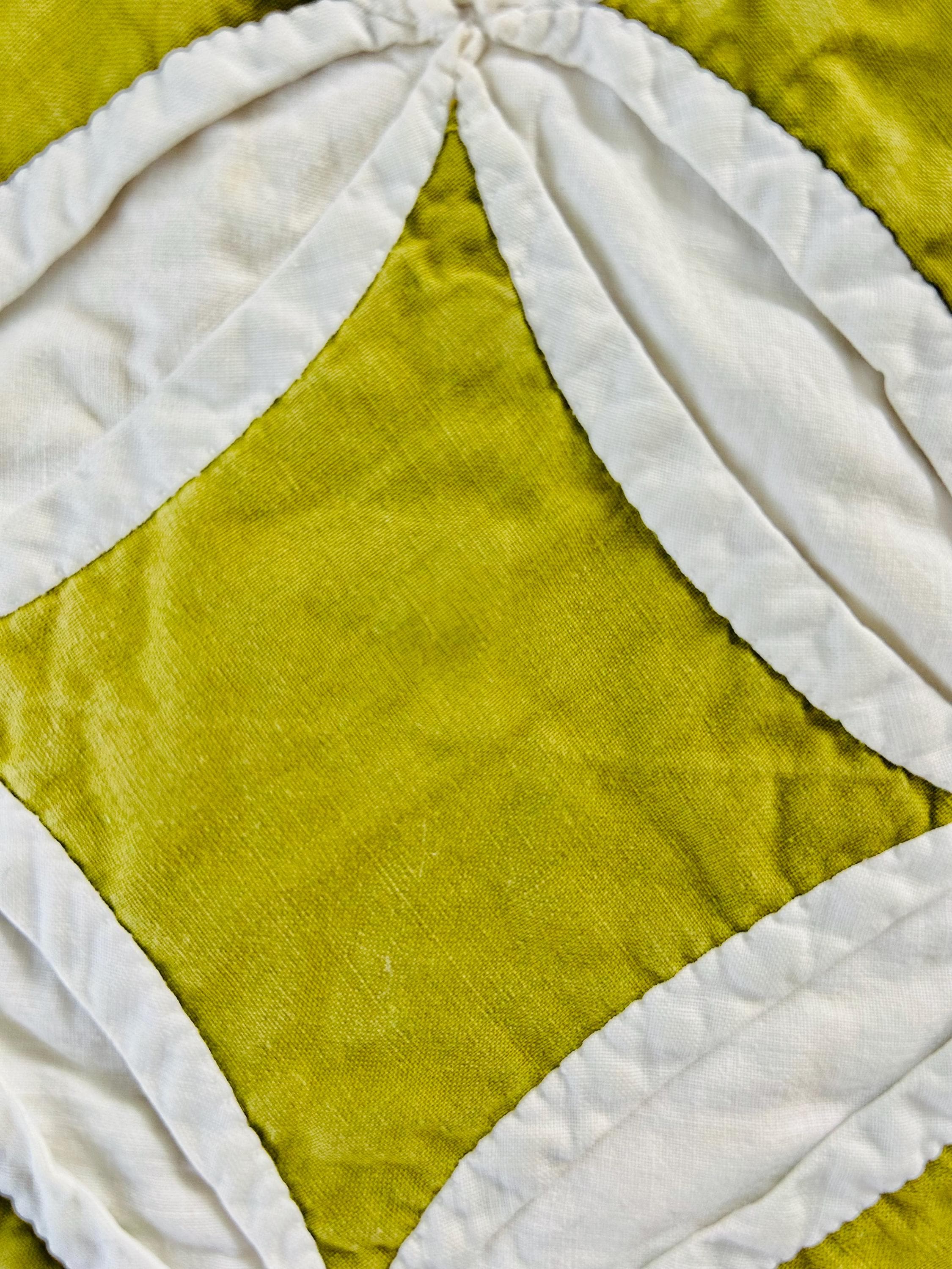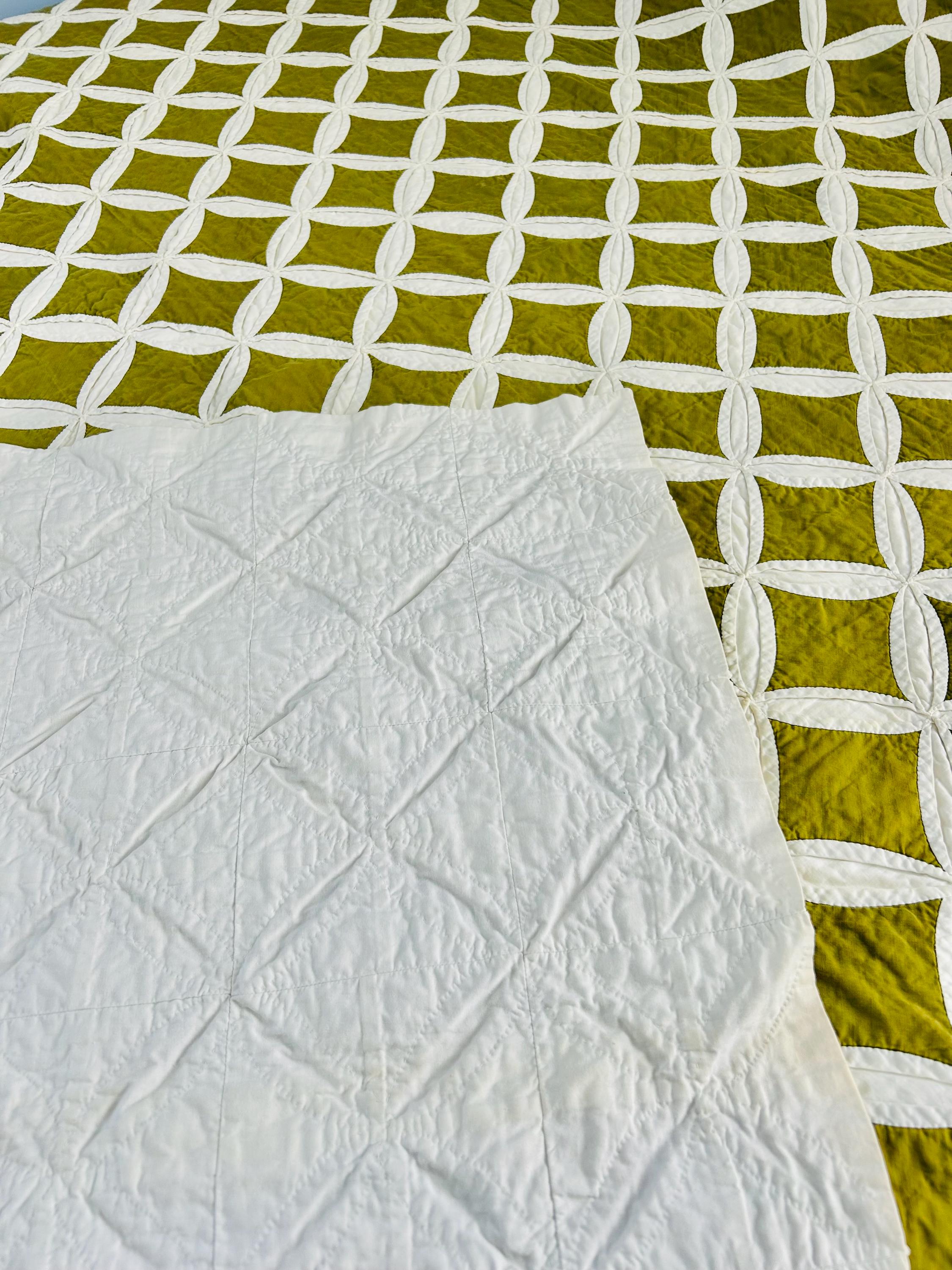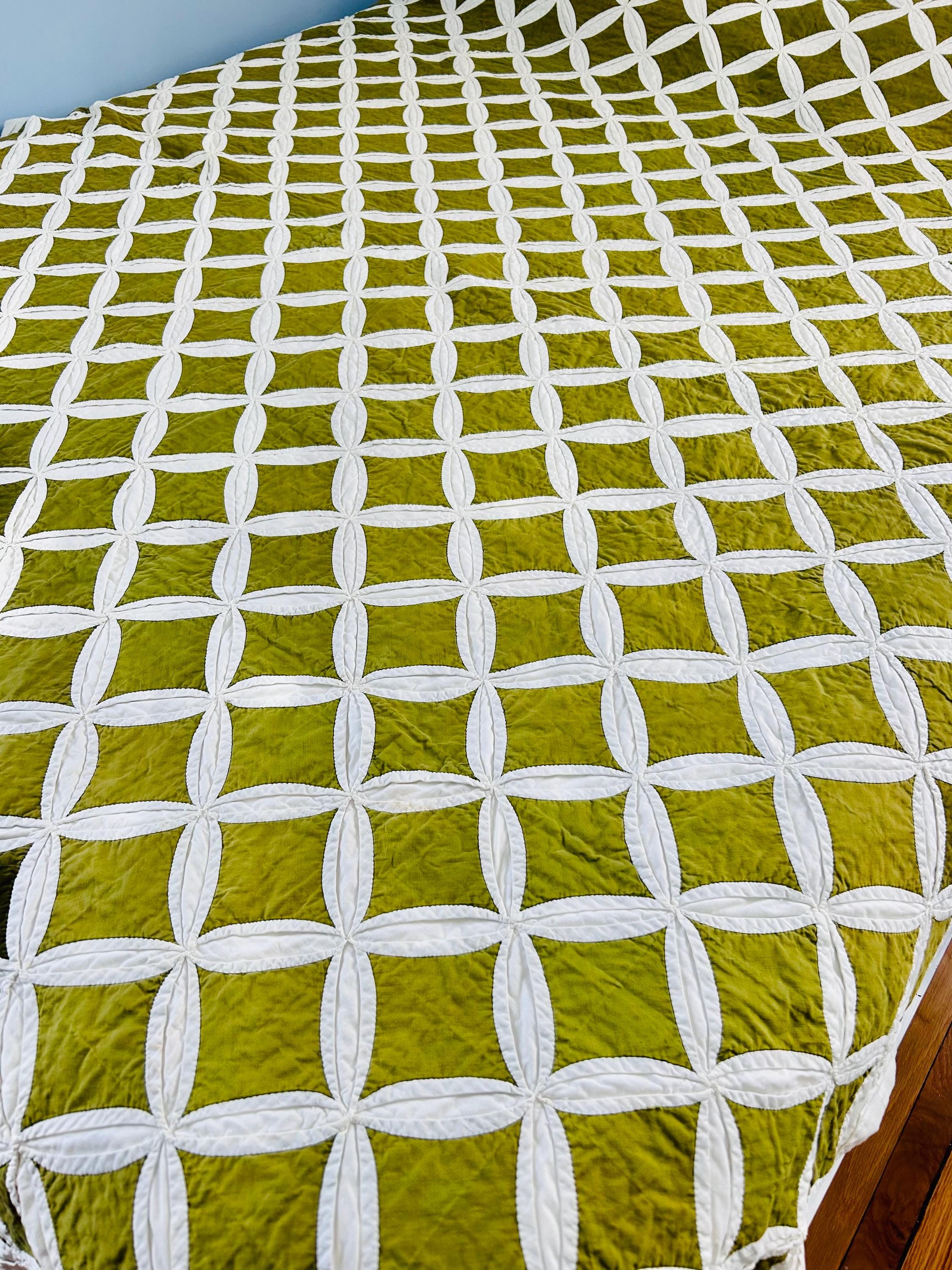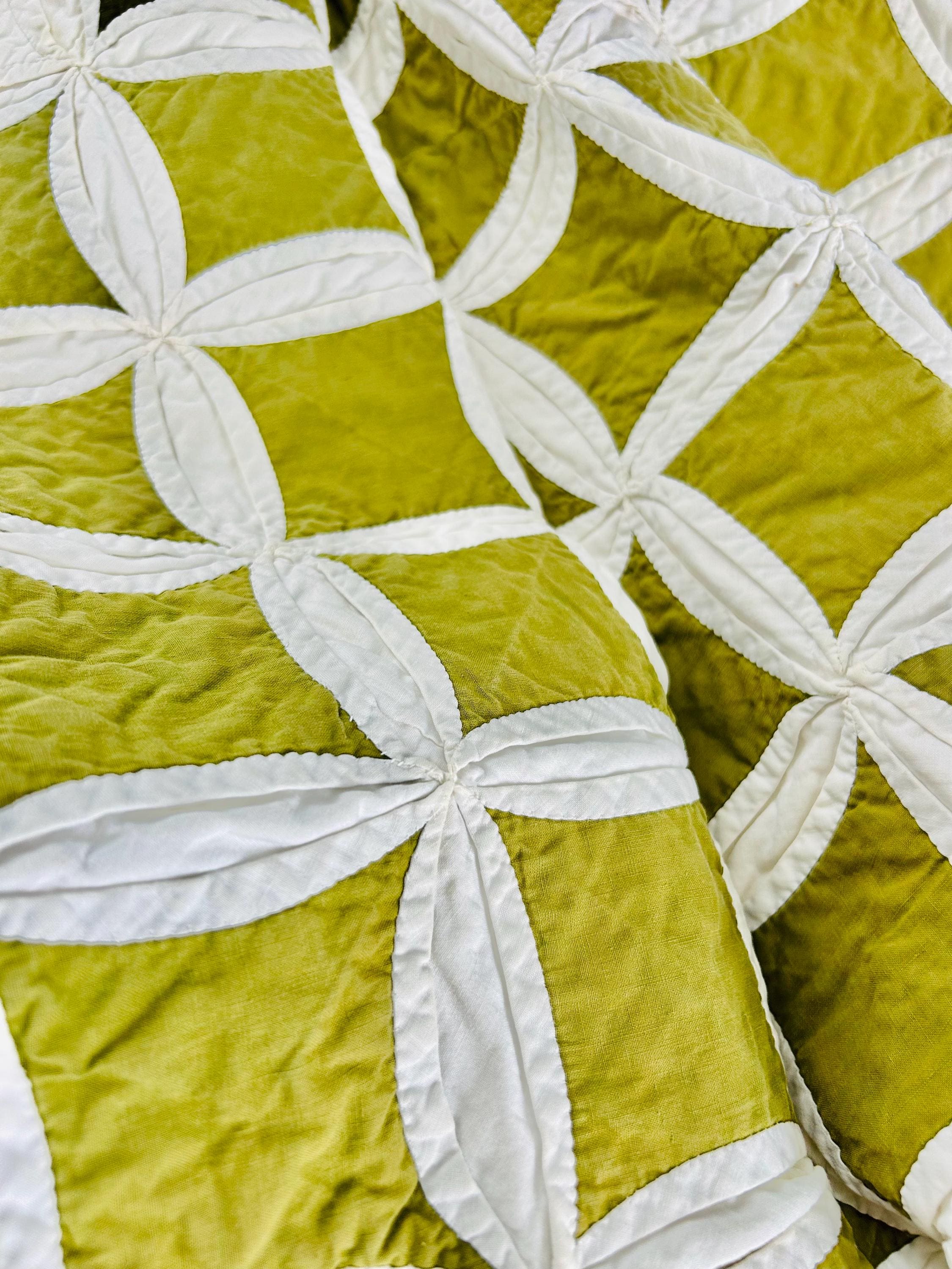 This striking vintage Cathedral Window Quilt, circa 1950-1960s, has been beautifully handmade in crisp white cotton folded “window frames” that create softly curved arches, revealing luminous chartreuse-green cotton window panes beneath.
