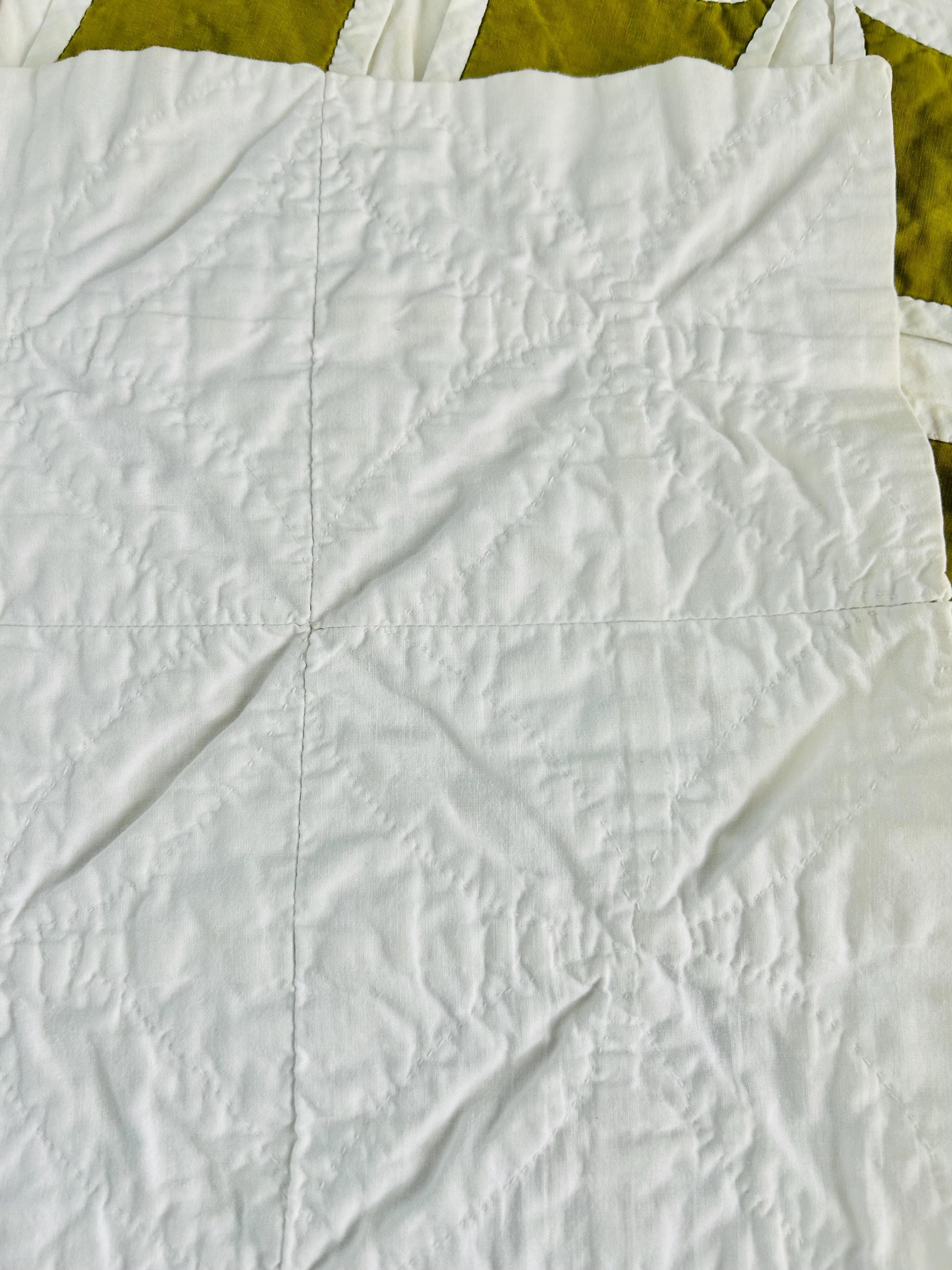 Details • Pattern: Cathedral Window • Date: Circa 1955–1965 • Size: 68” x 82” • Colors: Chartreuse green with white window frames • Construction: Hand-folded and hand-stitched Cathedral Window technique • Materials: Cotton fabrics • Batting: None (traditional Cathedral Window construction) • Era: Mid-century handmade quilt