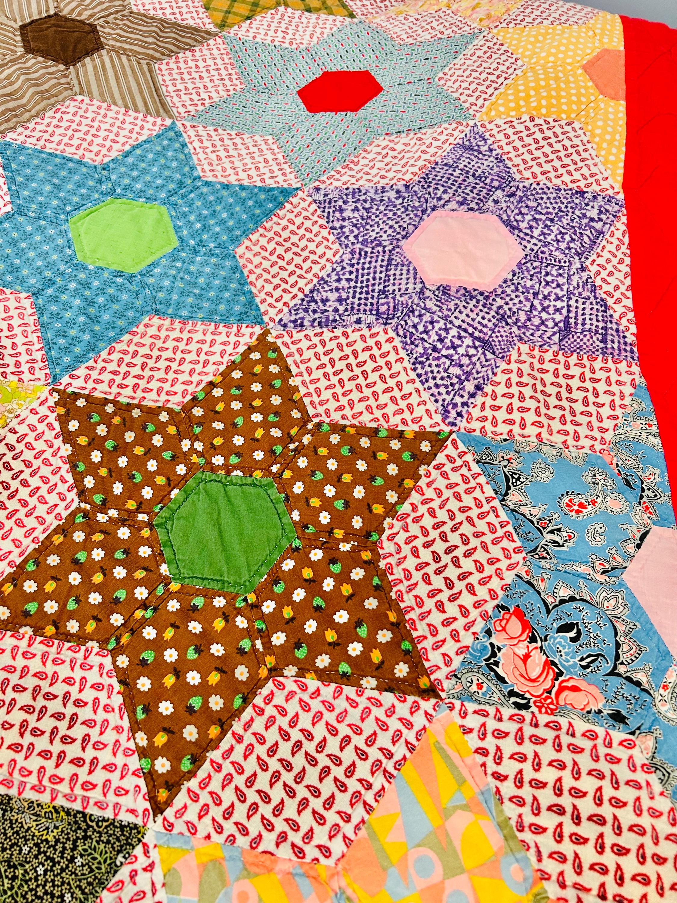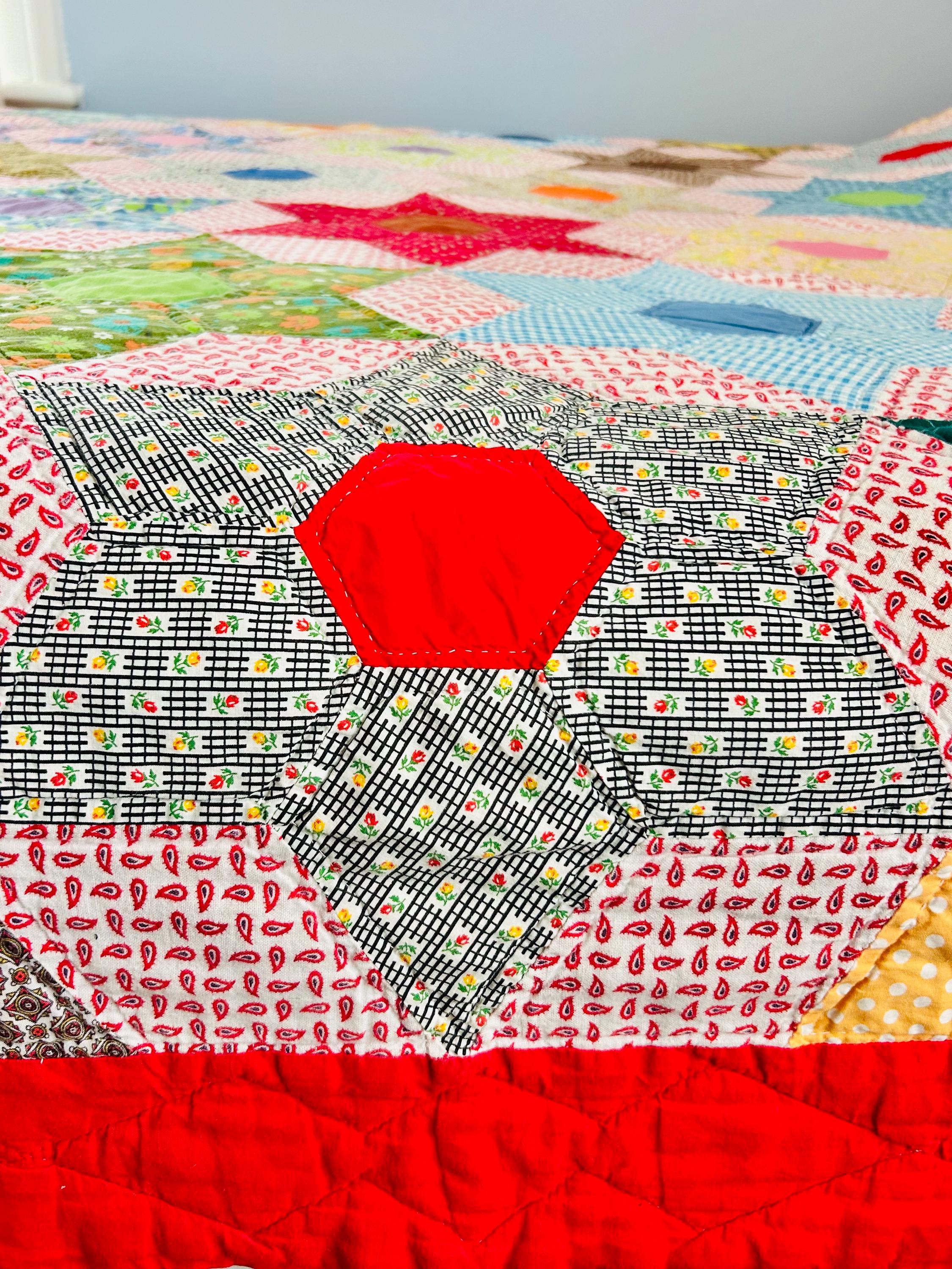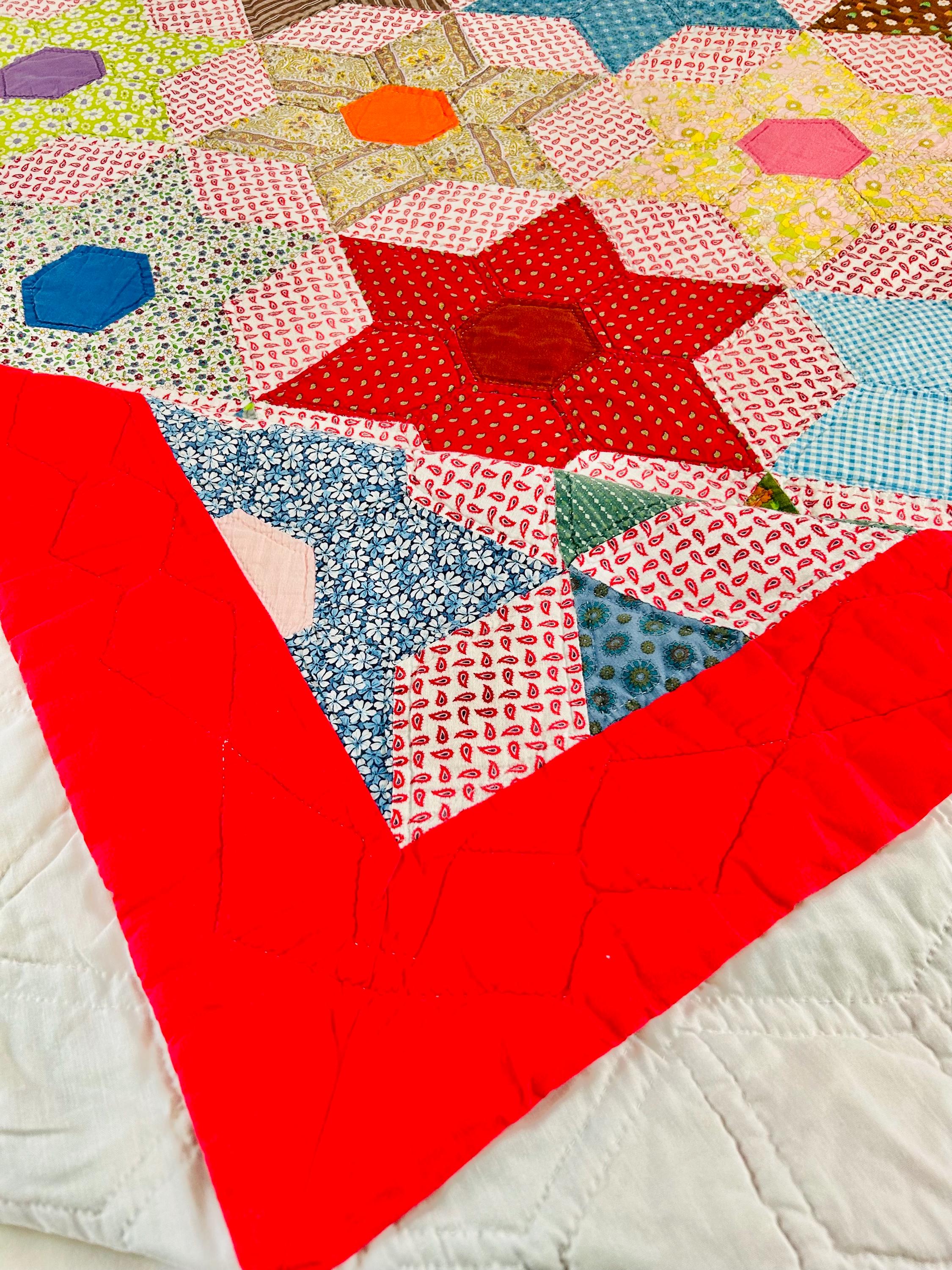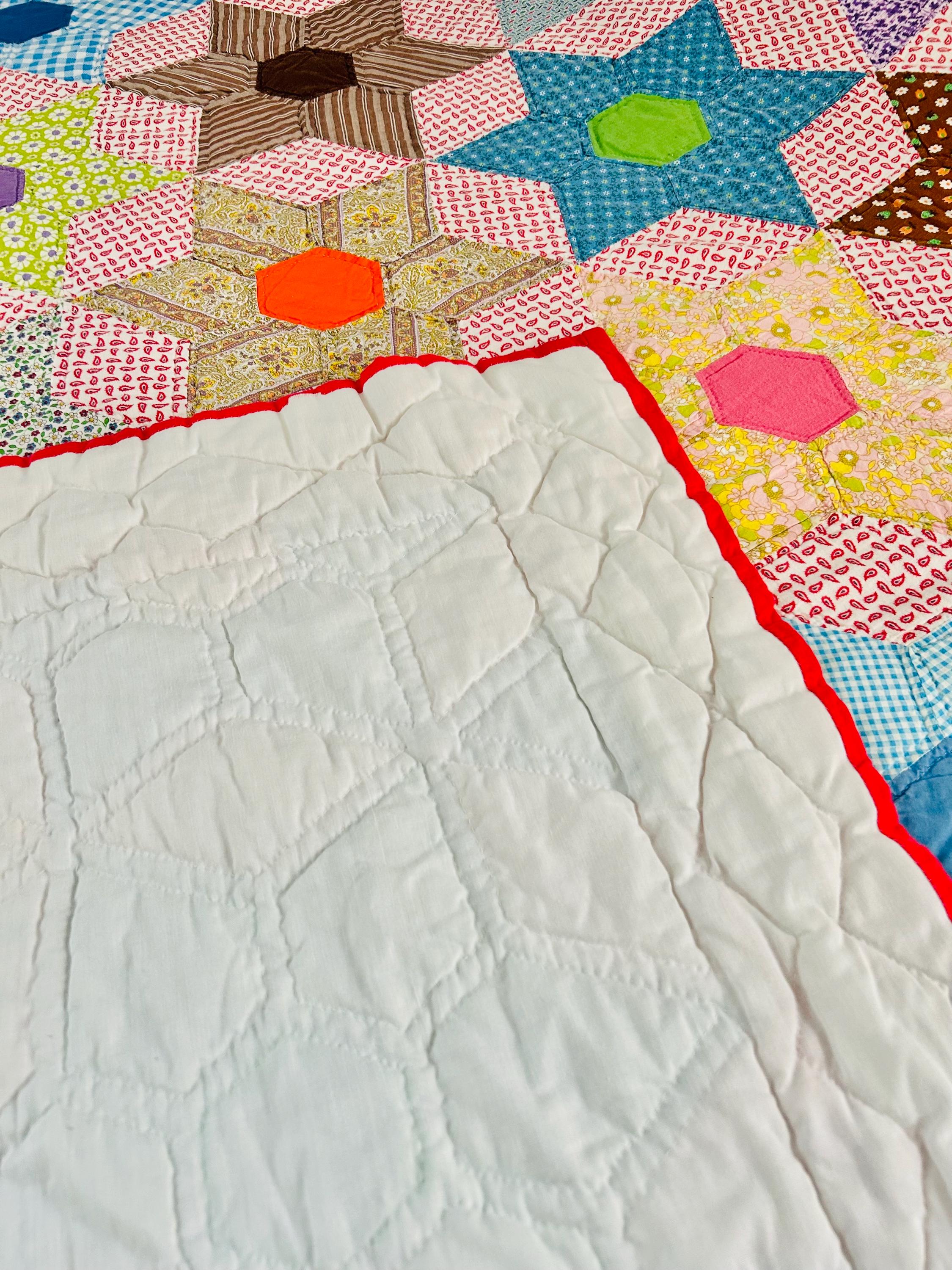 Details • Size: 78” x 84” • Pattern: Star Garden • Era: Vintage, circa late 1960s-1970s • Construction: Entirely hand pieced • Quilting: Hand quilted • Materials: Cotton and cotton-blend fabrics • Batting: lightweight • Border: Bright red border framing the quilt beautifully • Backing: Plain light backing with hand quilting visible