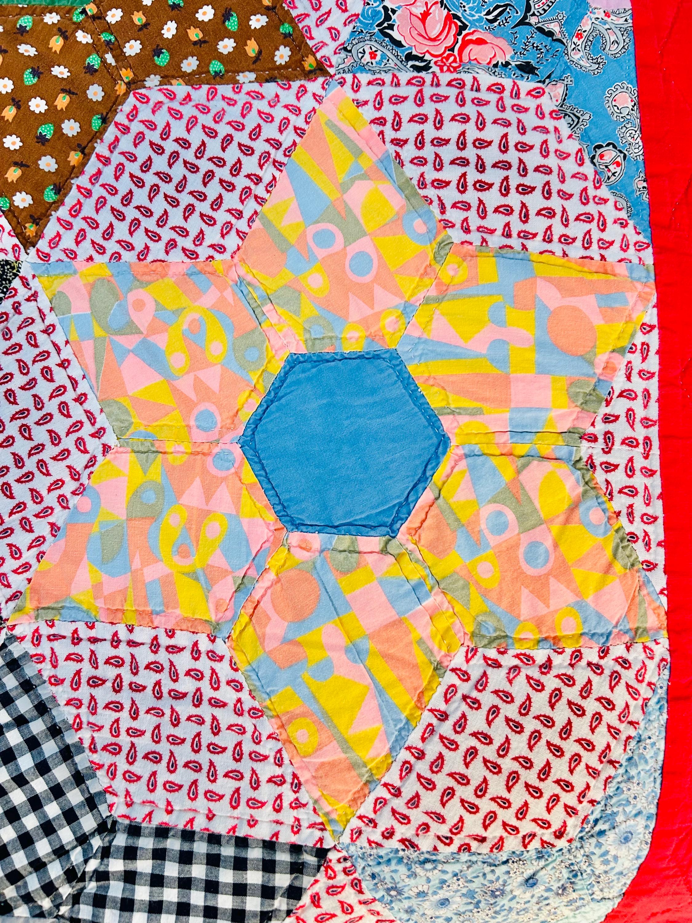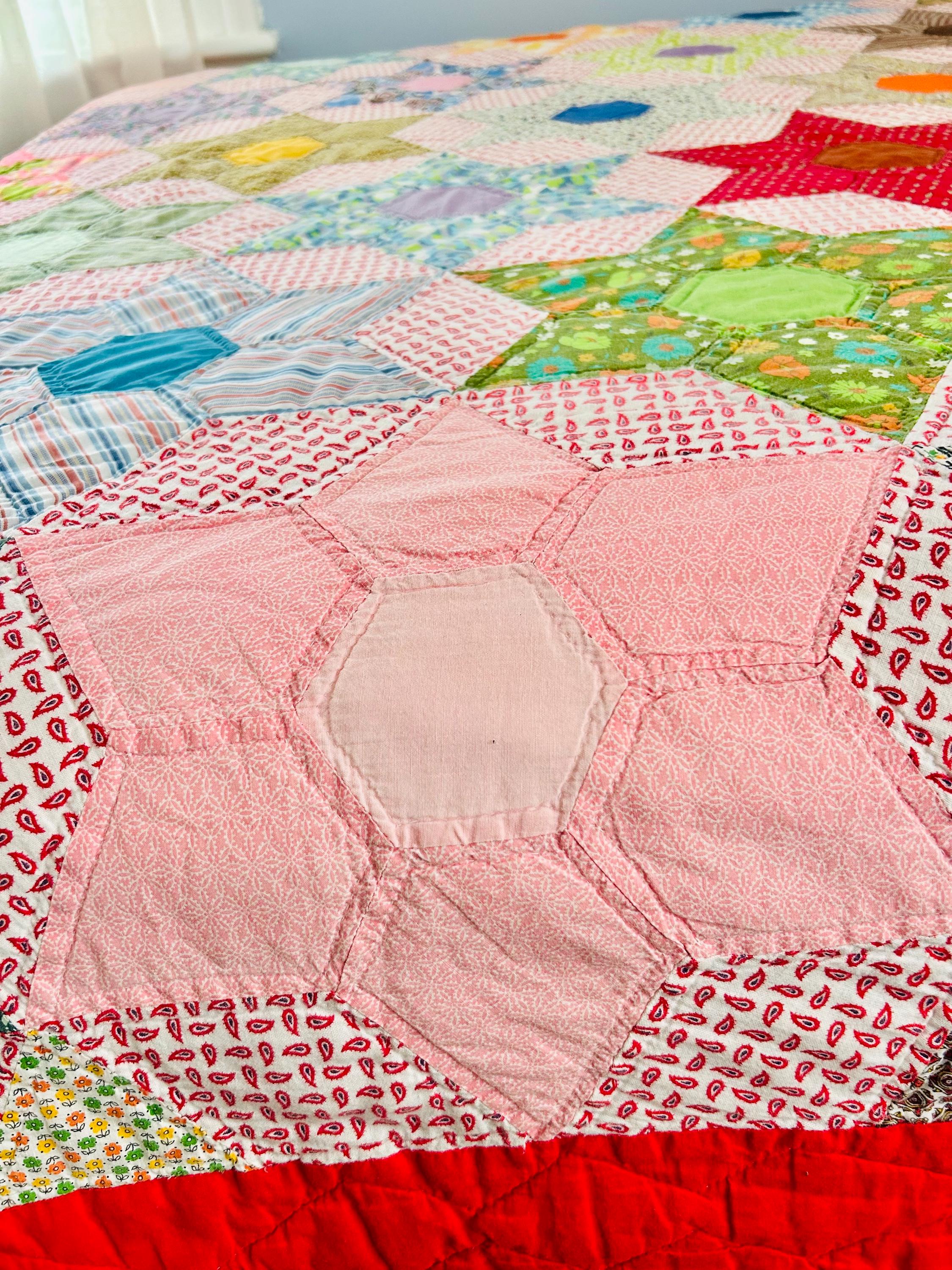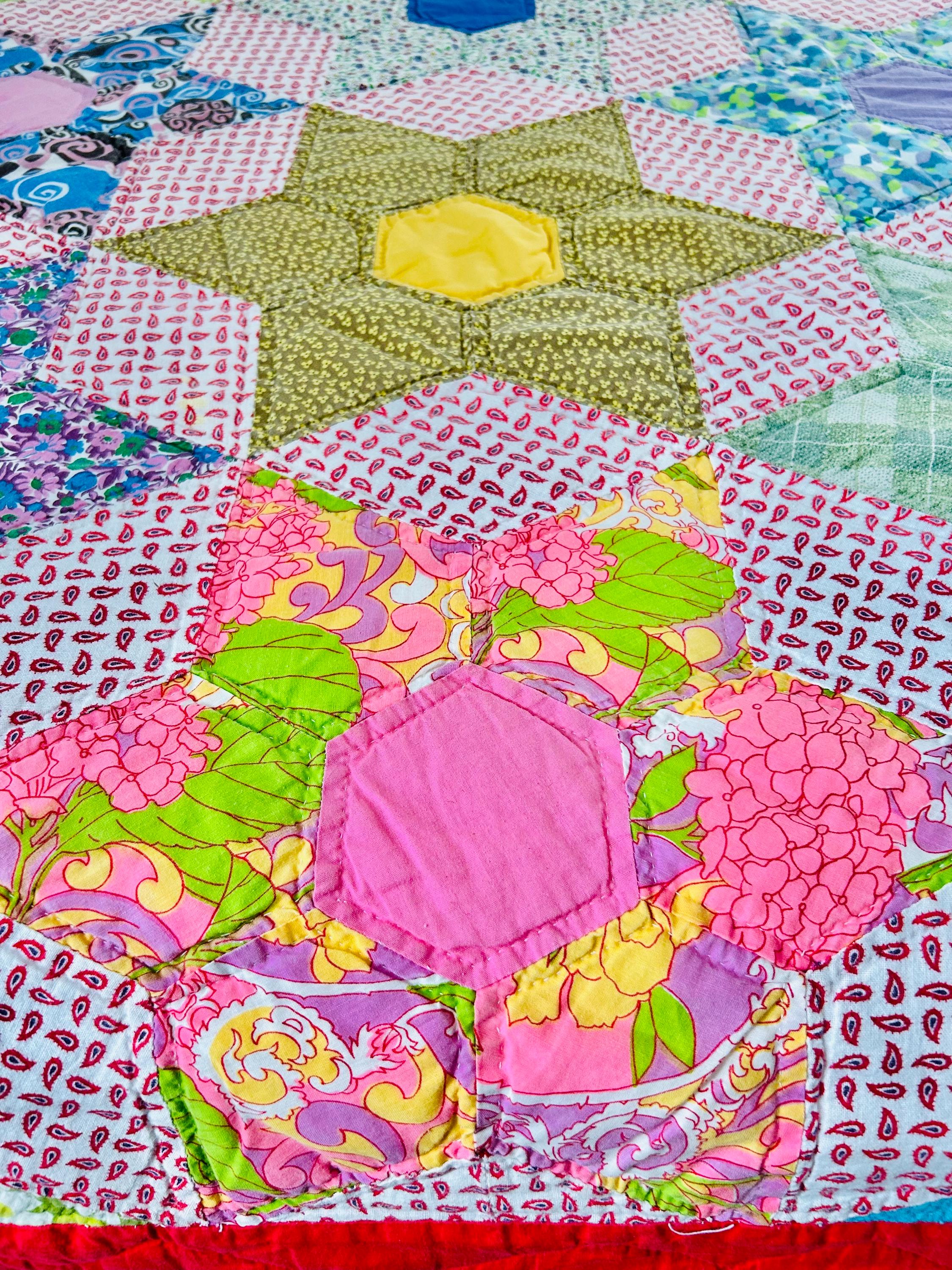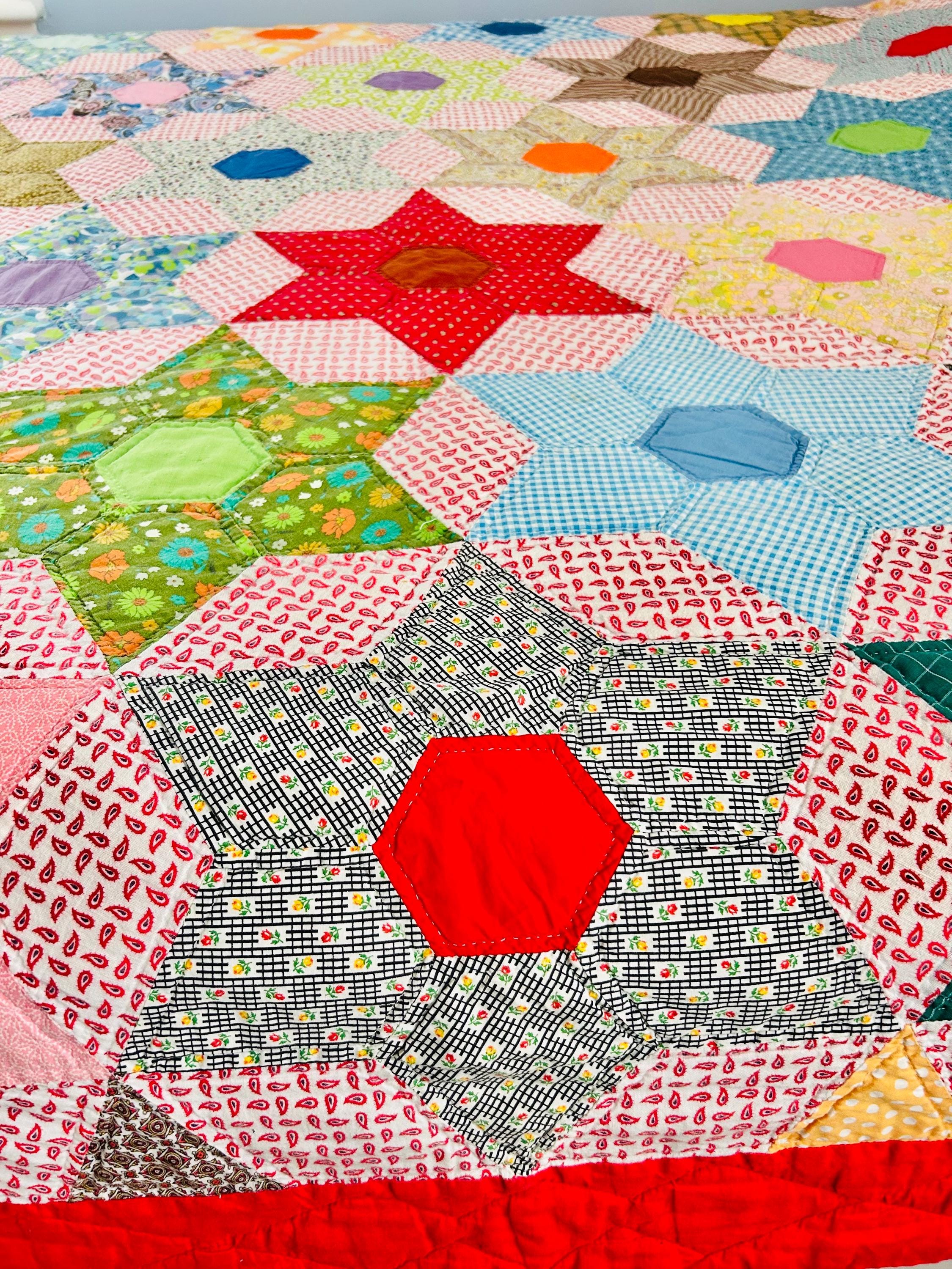 Details • Size: 78” x 84” • Pattern: Star Garden • Era: Vintage, circa late 1960s-1970s • Construction: Entirely hand pieced • Quilting: Hand quilted • Materials: Cotton and cotton-blend fabrics • Batting: lightweight • Border: Bright red border framing the quilt beautifully • Backing: Plain light backing with hand quilting visible