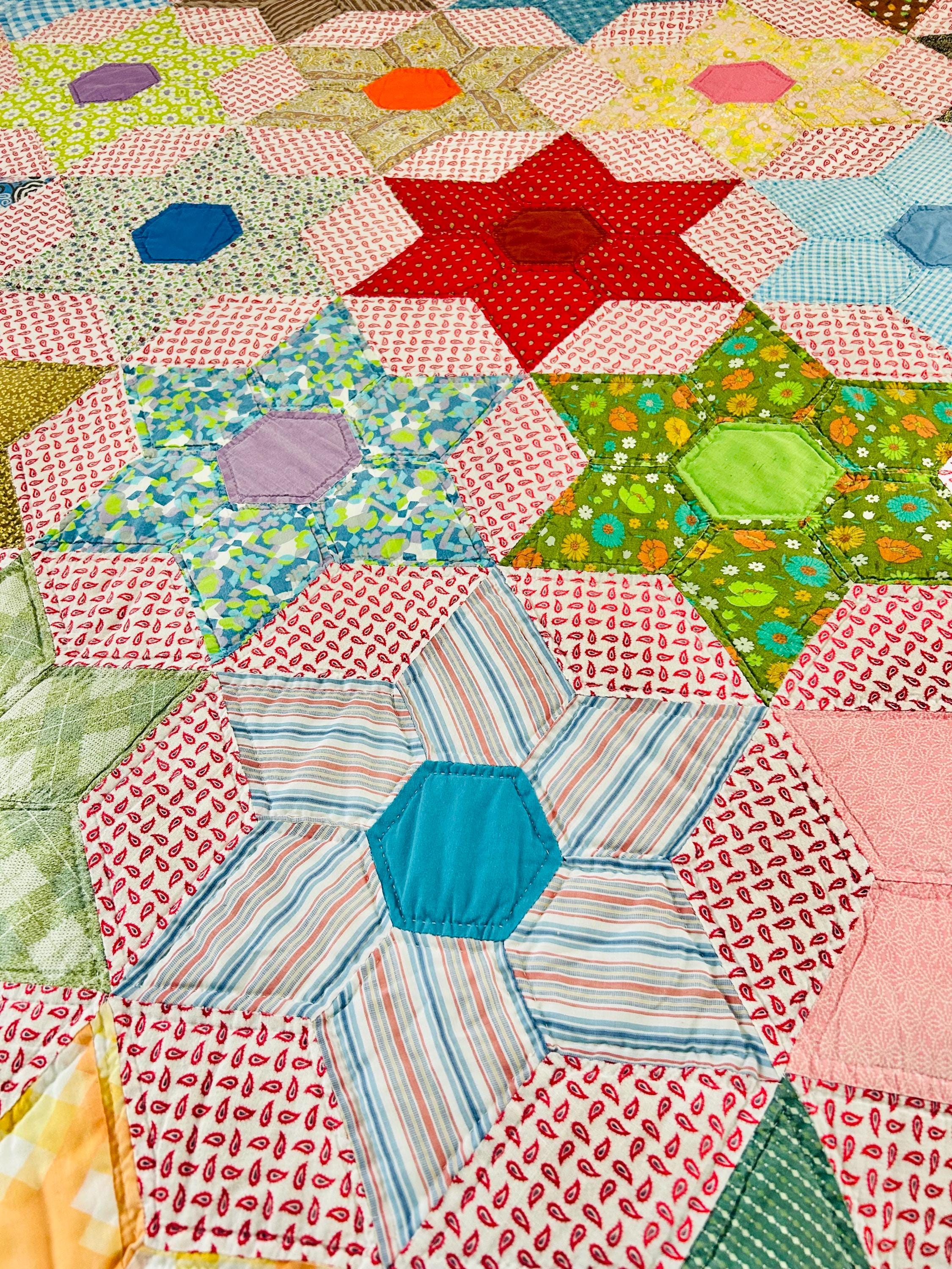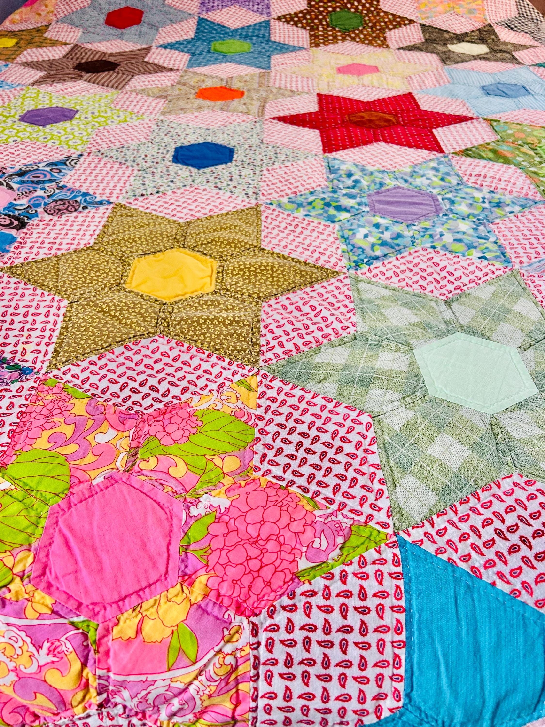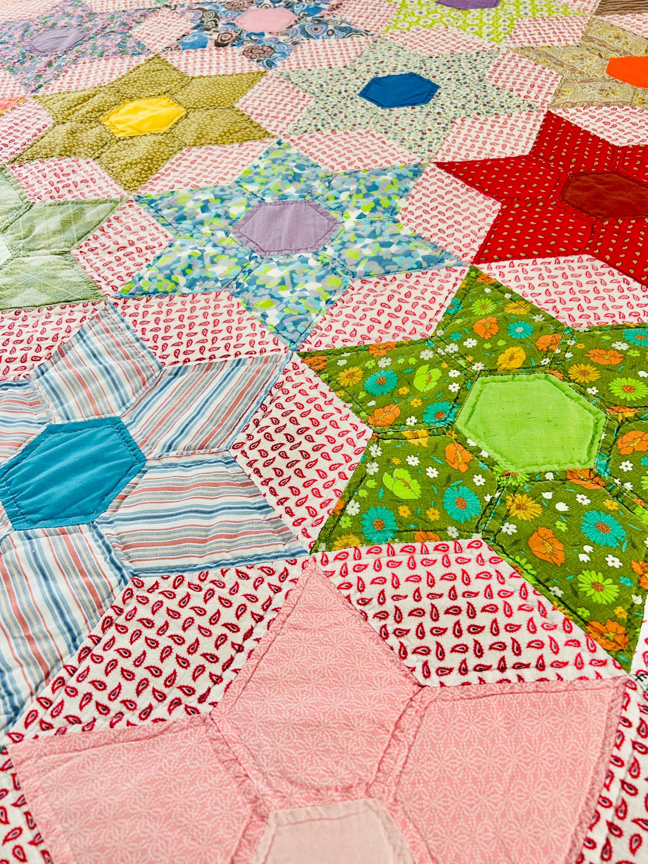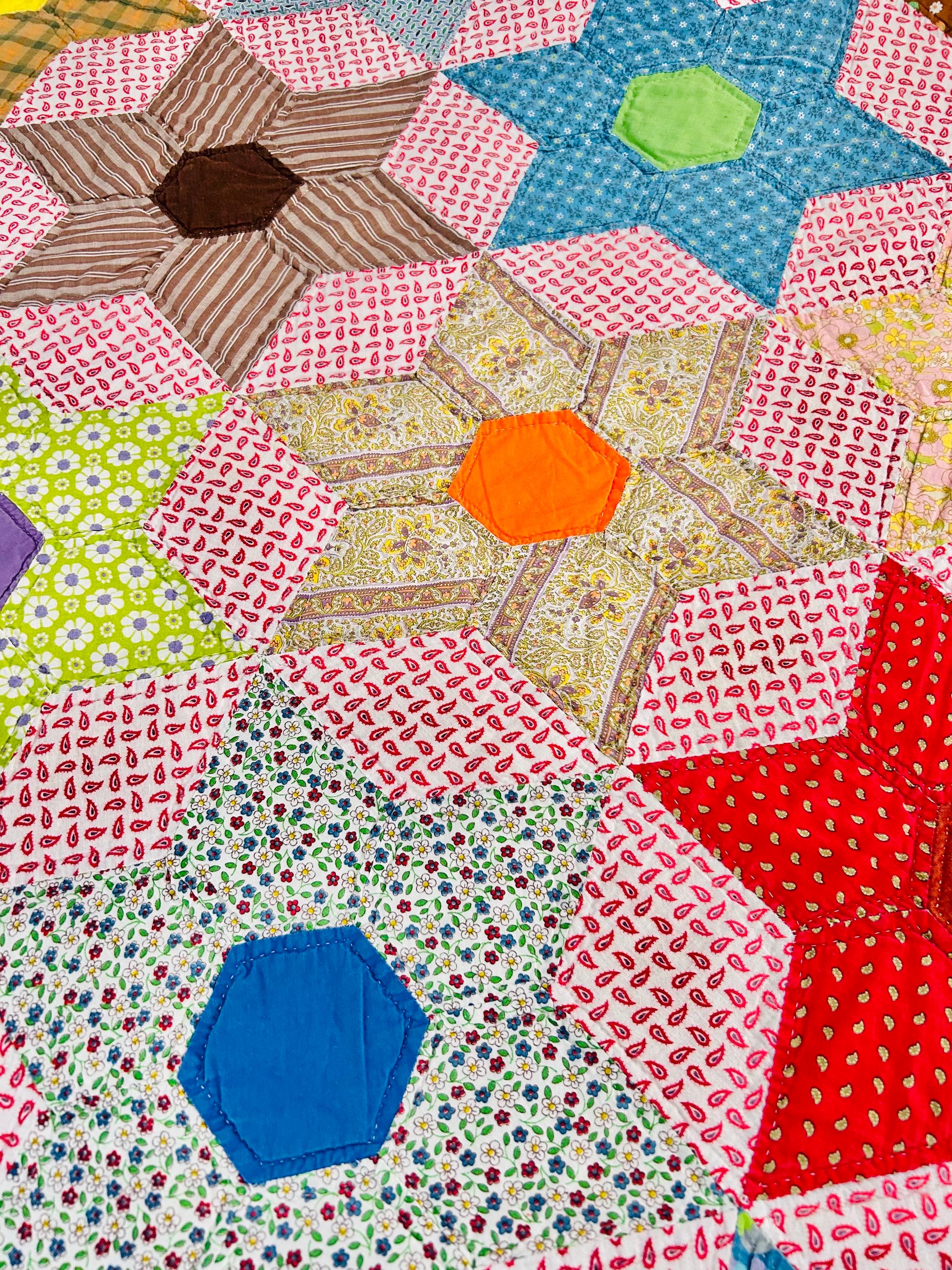 Details • Size: 78” x 84” • Pattern: Star Garden • Era: Vintage, circa late 1960s-1970s • Construction: Entirely hand pieced • Quilting: Hand quilted • Materials: Cotton and cotton-blend fabrics • Batting: lightweight • Border: Bright red border framing the quilt beautifully • Backing: Plain light backing with hand quilting visible
