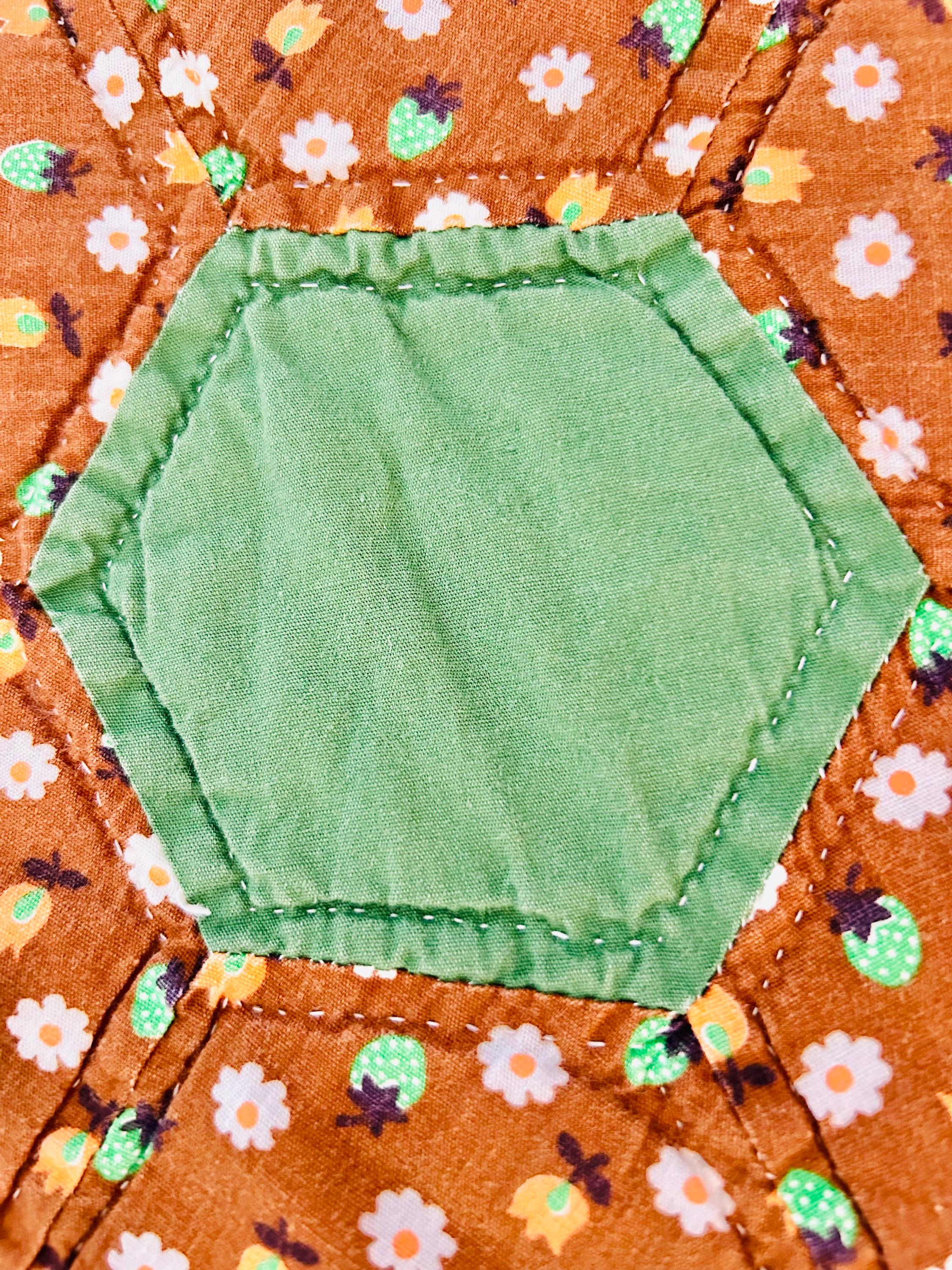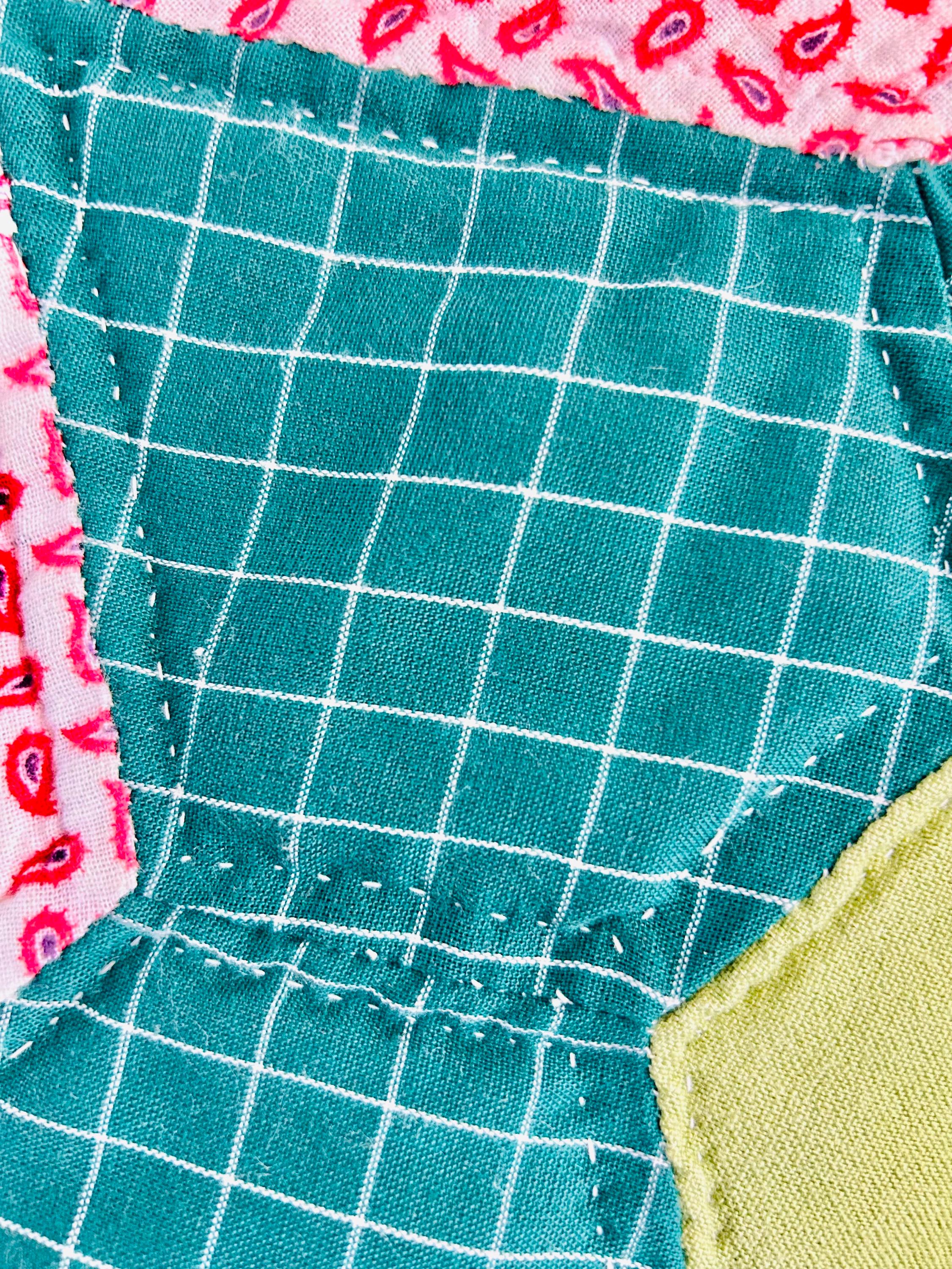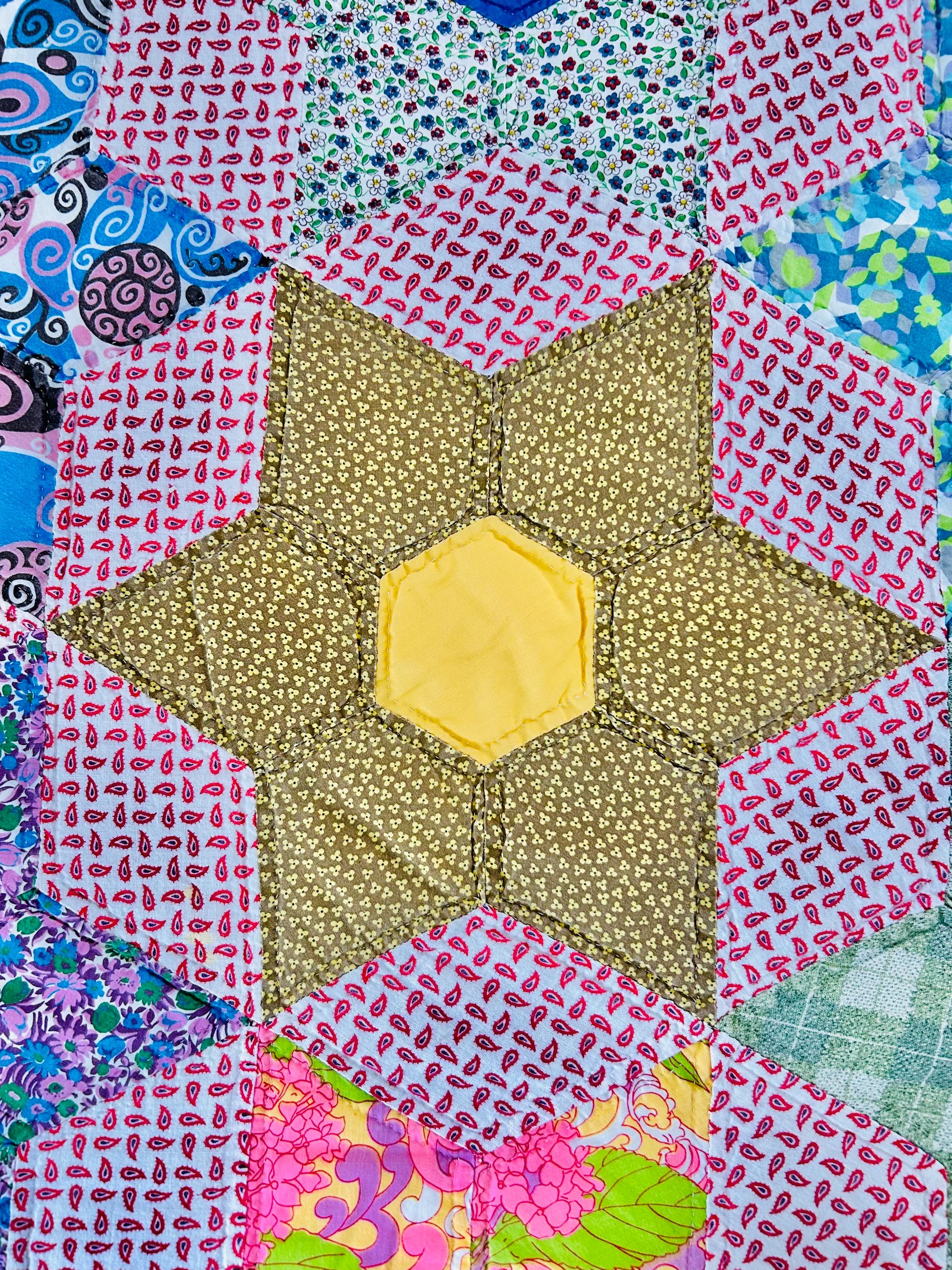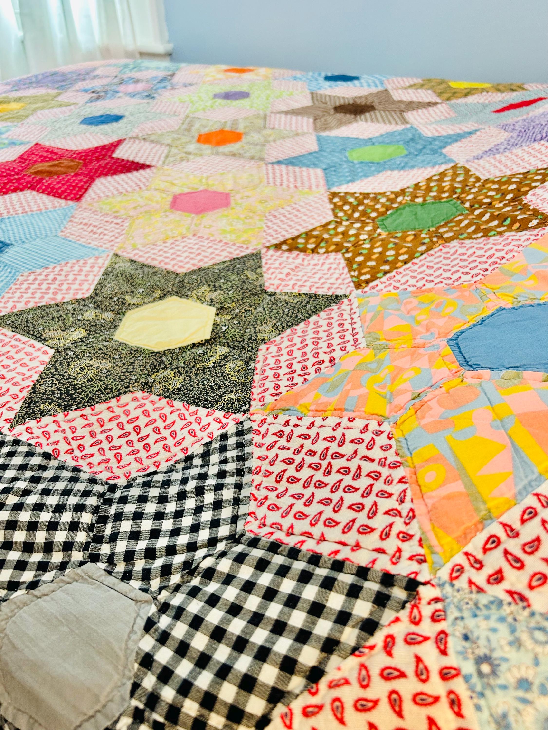 Details • Size: 78” x 84” • Pattern: Star Garden • Era: Vintage, circa late 1960s-1970s • Construction: Entirely hand pieced • Quilting: Hand quilted • Materials: Cotton and cotton-blend fabrics • Batting: lightweight • Border: Bright red border framing the quilt beautifully • Backing: Plain light backing with hand quilting visible