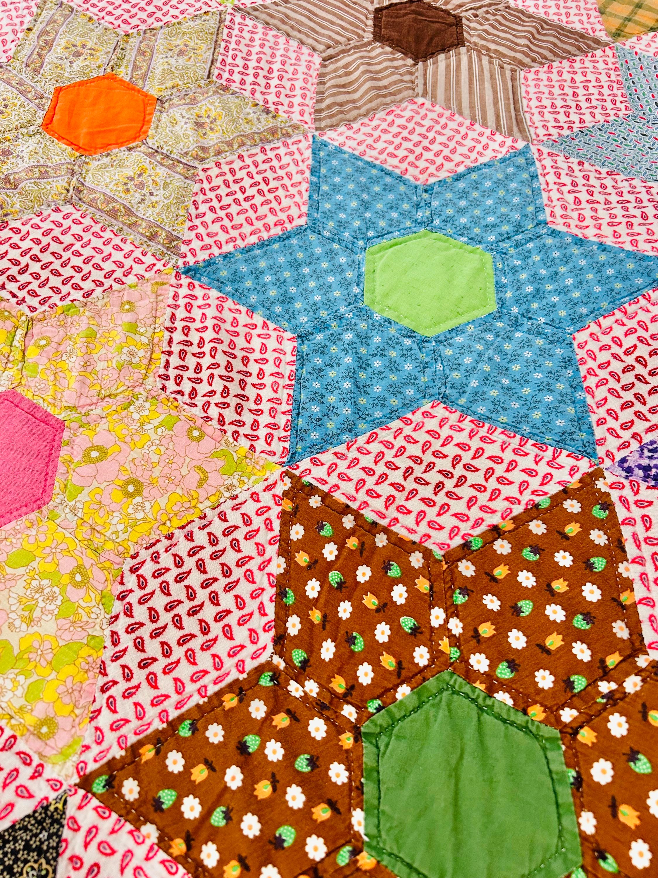 This vibrant and beautifully hand-crafted Star Garden Quilt dates to the late 1960s–1970s, a period when traditional quilt patterns were revived using bold, cheerful mid-century fabrics, including - in this case - 1960s florals, geometrics, and bright solids to create bold interlocking stars.