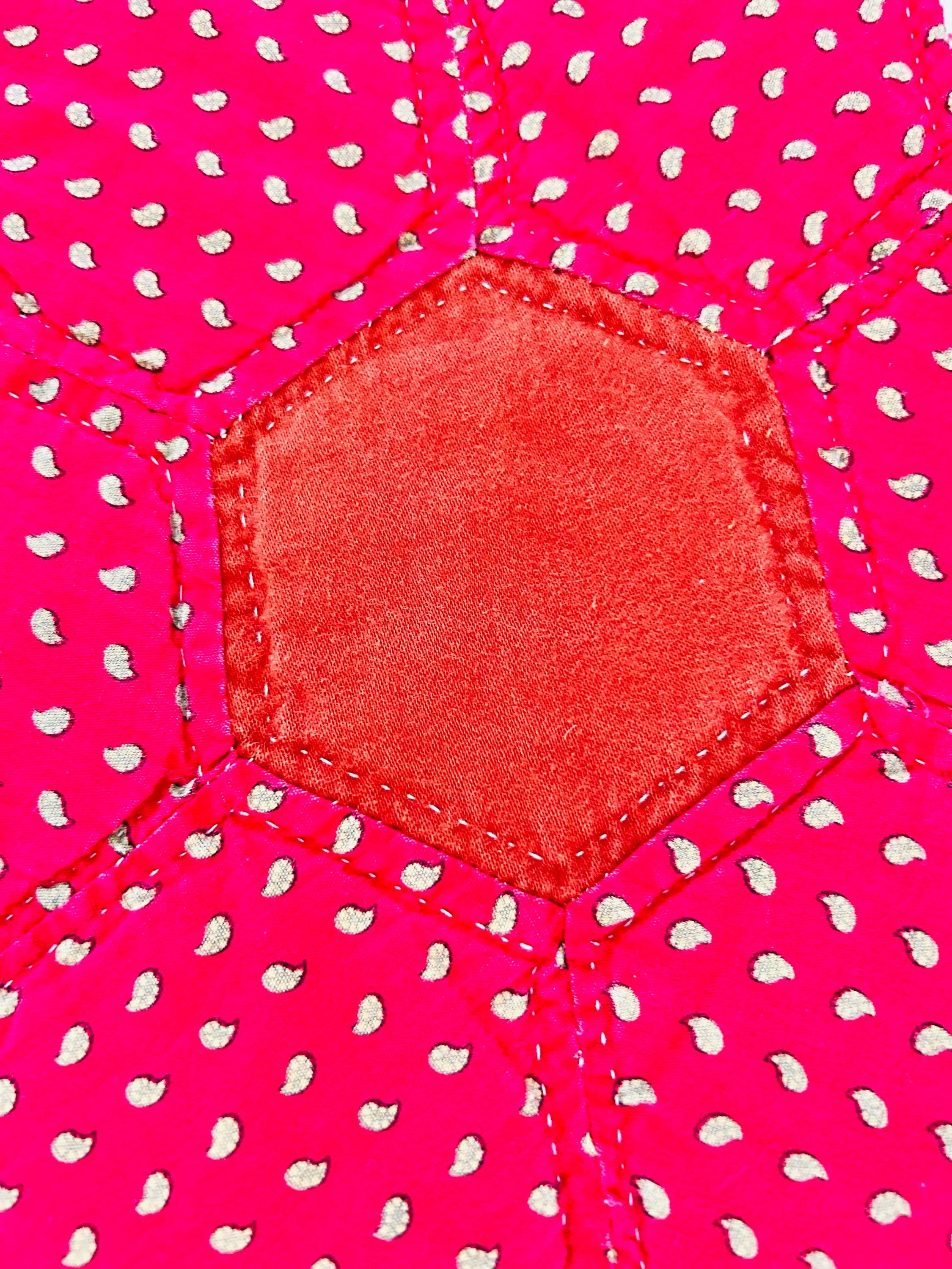 The hand-quilting is precise and in outlines of the patchwork and, along the four-sided border, in an interlocking diamond pattern. The back is white cotton while the red cotton border has been turned to the back and hand-stitched to form the binding. The batting is lightweight.