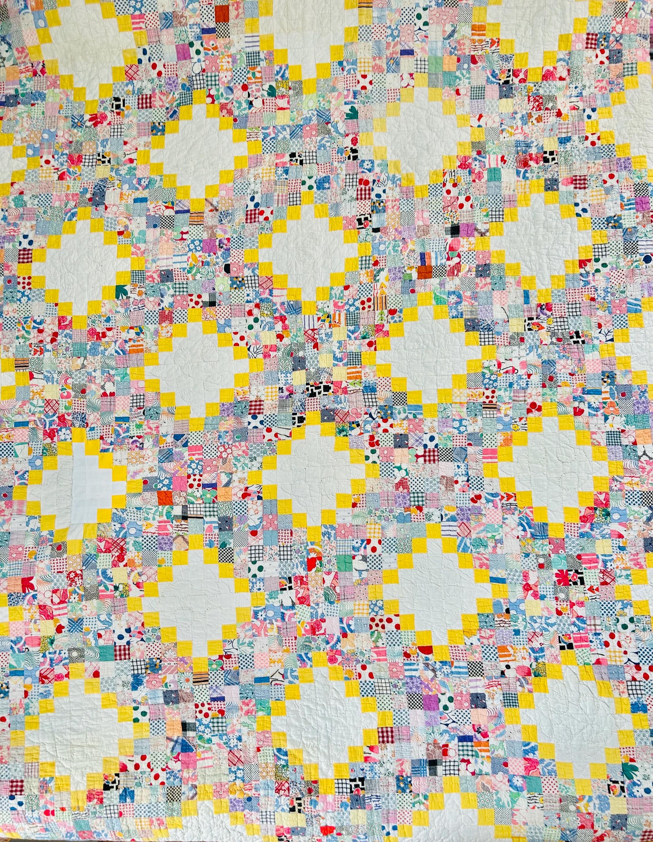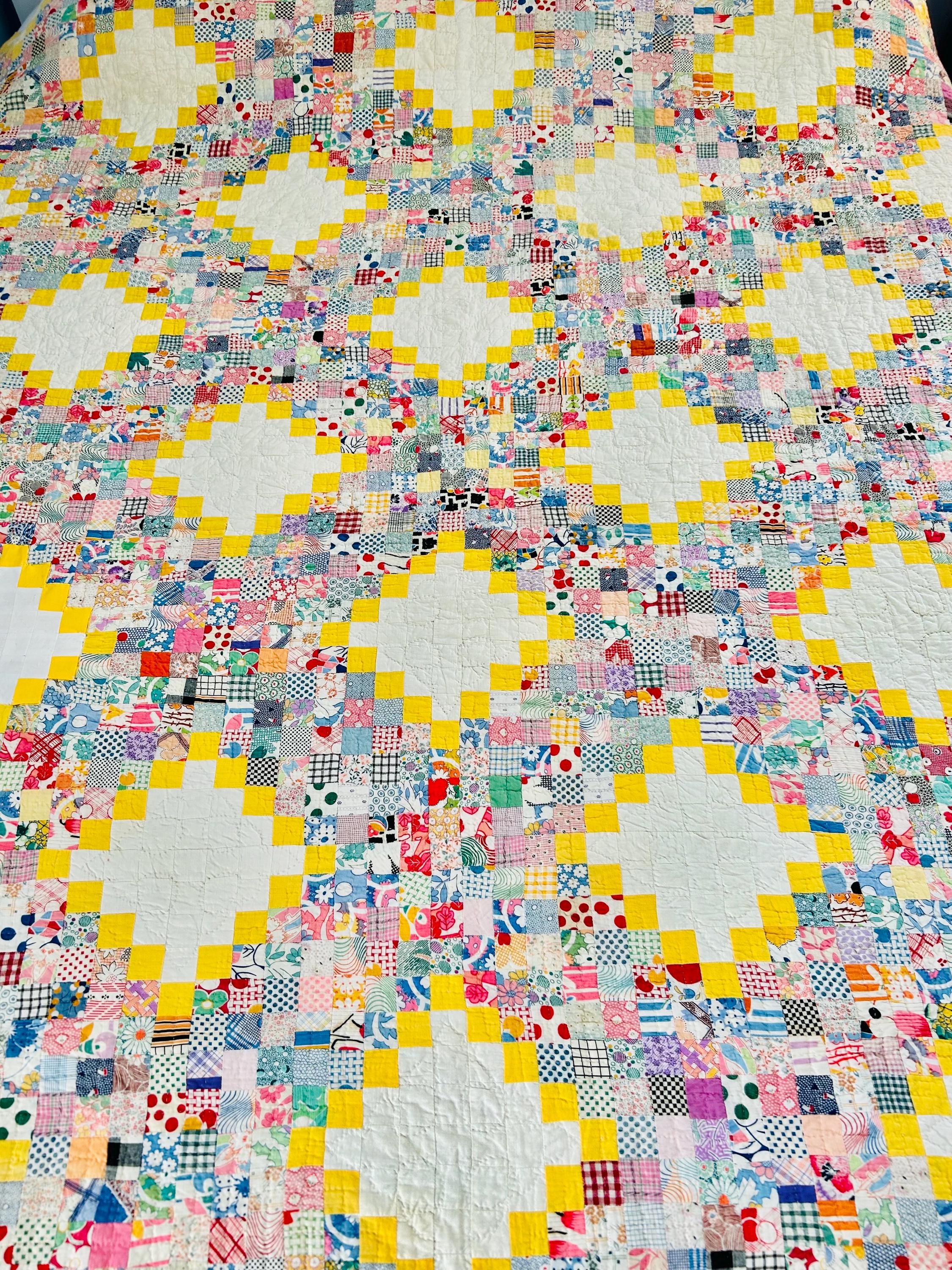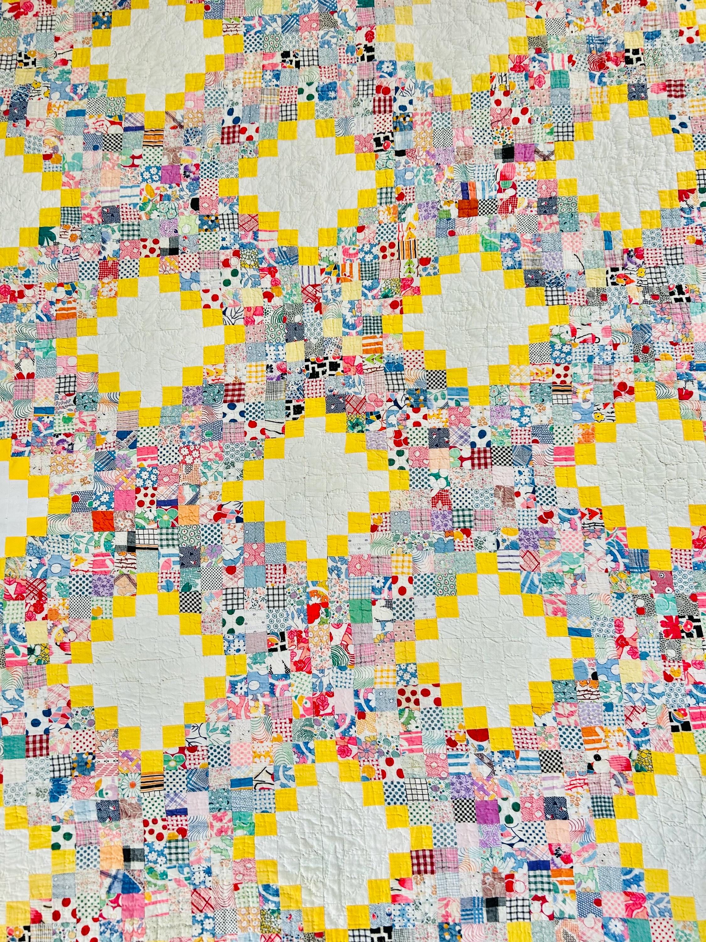 This beautiful vintage Quadruple Irish Chain Quilt, dating to the 1930s, features a striking and cheerful layout of hand-stitched 1-inch white blocks framed by vibrant yellow chain piecing, with the connecting chains composed of hundreds of 1-inch patchwork squares in an incredible range of scrappy period/feedsack prints. The hand-quilting is fine and in very tiny stitches in unique geometric/floral patterns in the open white areas and in cross-hatch grids in the rest of the quilt.