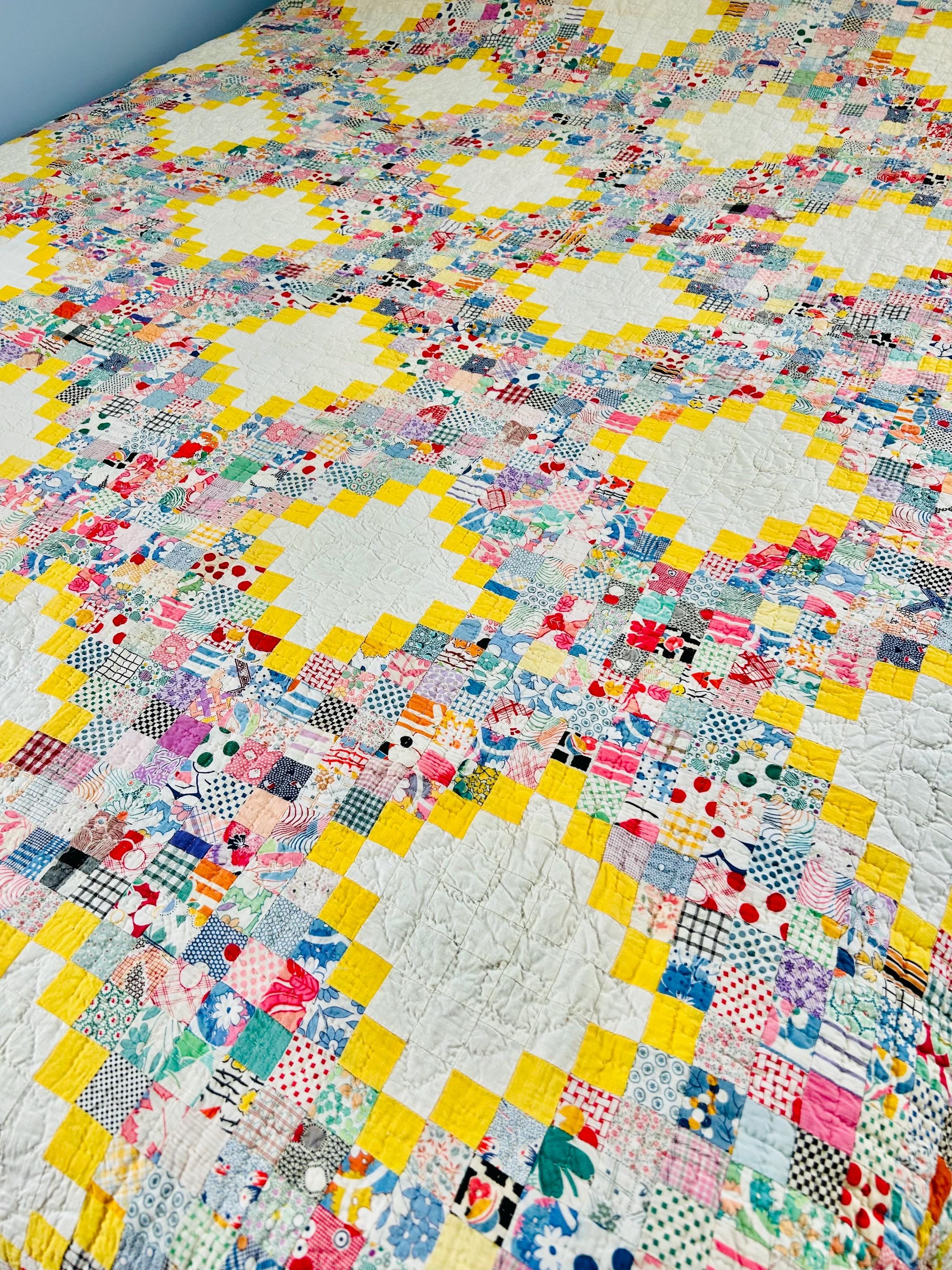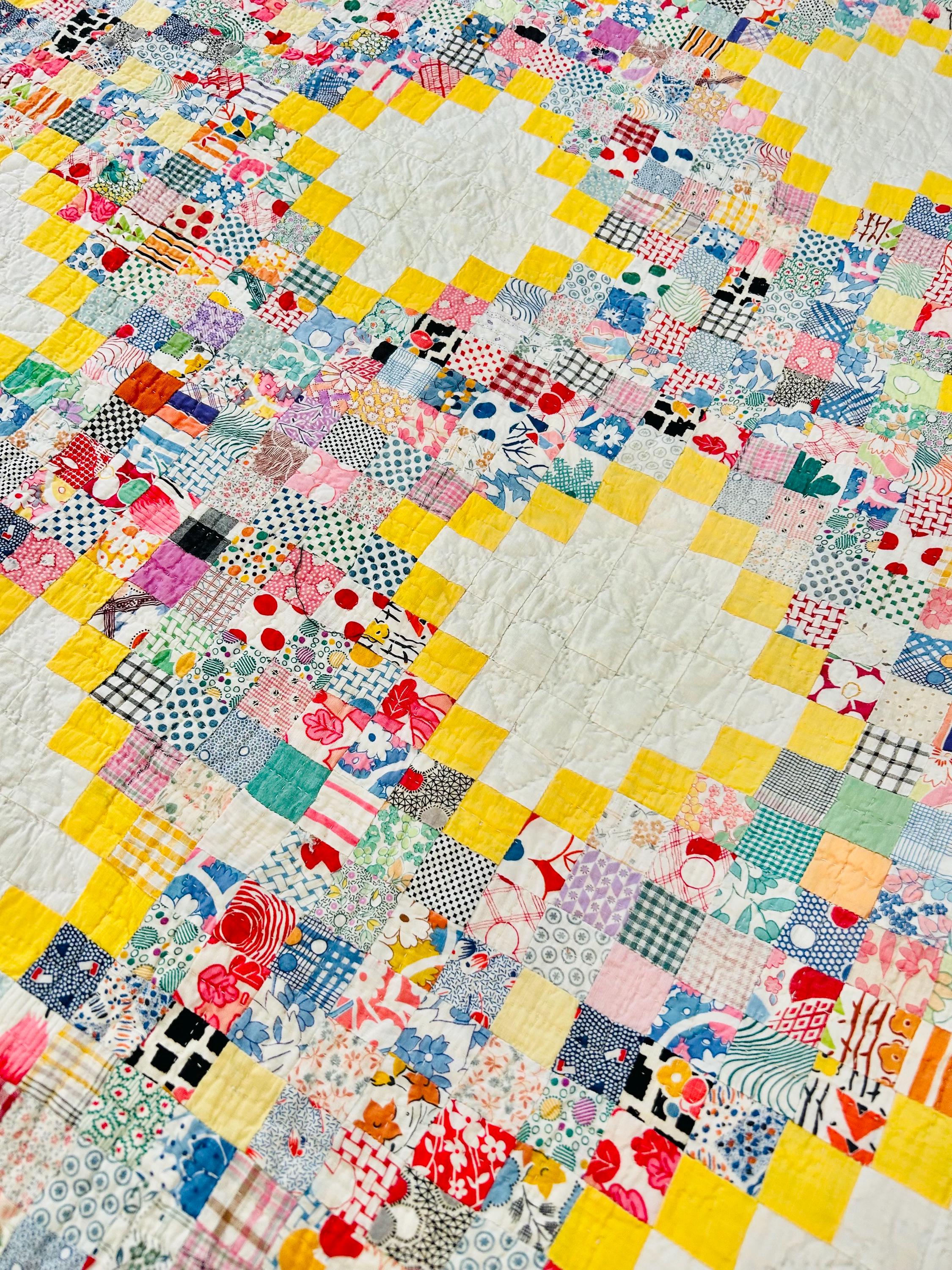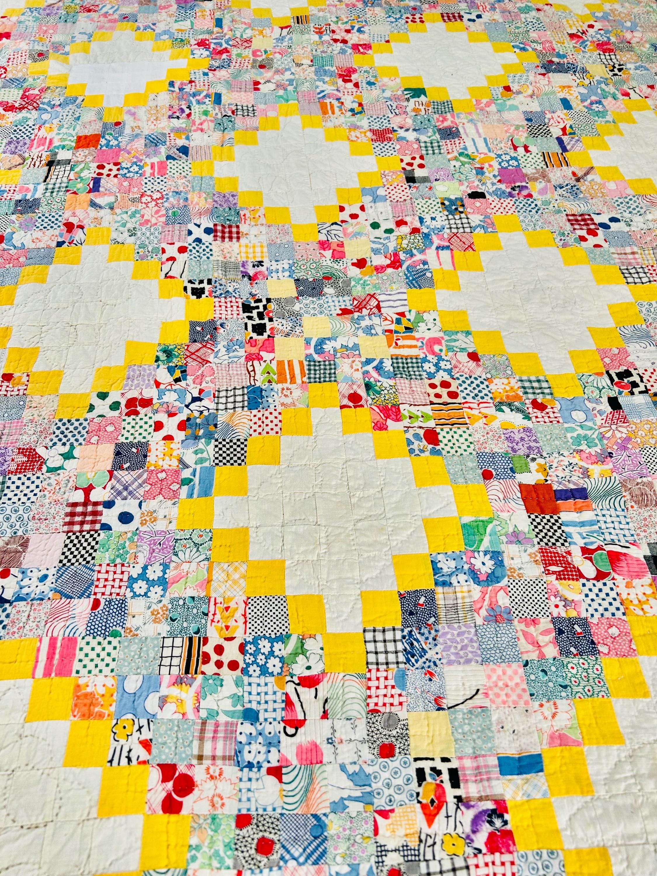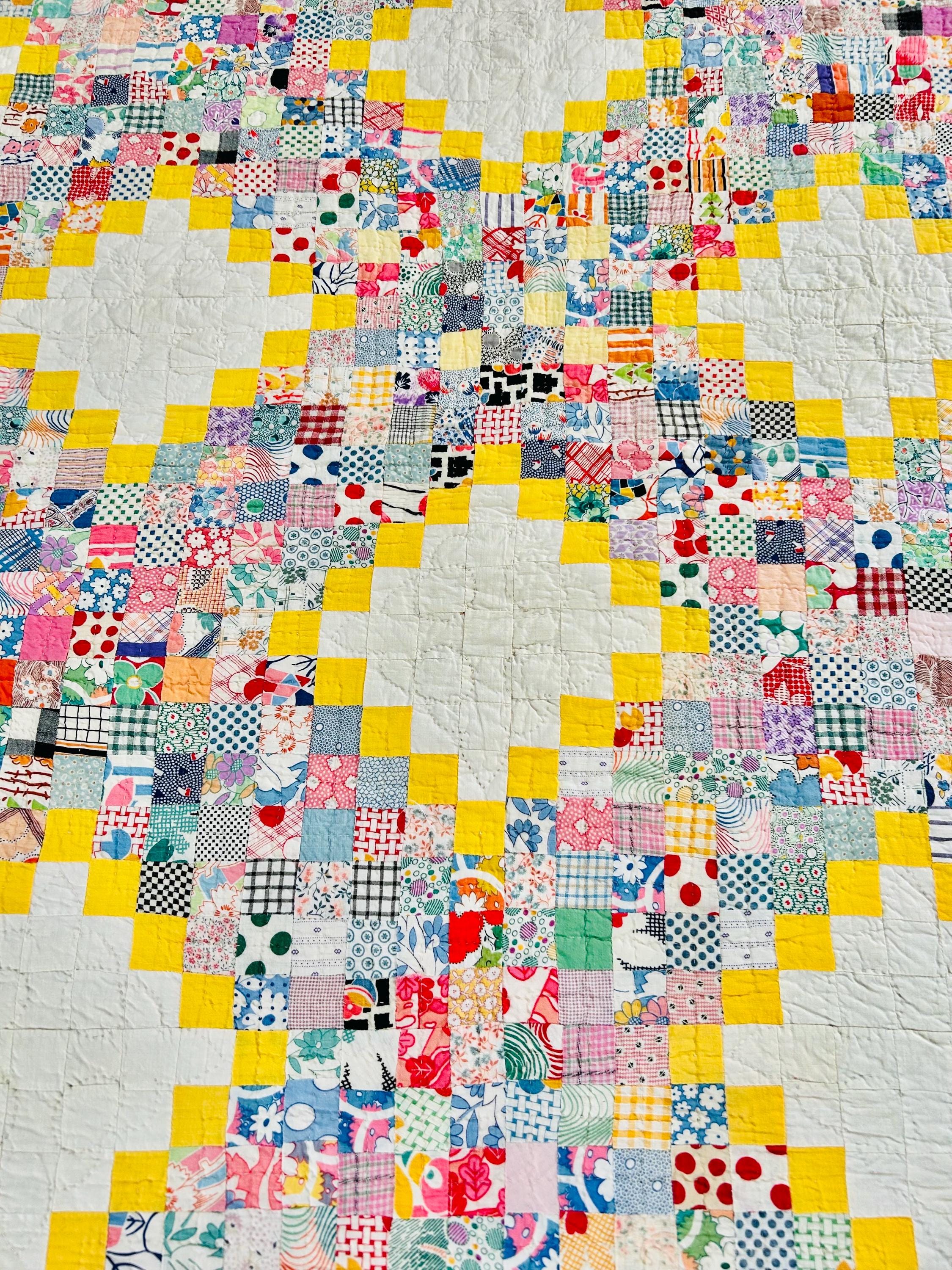 This beautiful vintage Quadruple Irish Chain Quilt, dating to the 1930s, features a striking and cheerful layout of hand-stitched 1-inch white blocks framed by vibrant yellow chain piecing, with the connecting chains composed of hundreds of 1-inch patchwork squares in an incredible range of scrappy period/feedsack prints. The hand-quilting is fine and in very tiny stitches in unique geometric/floral patterns in the open white areas and in cross-hatch grids in the rest of the quilt.