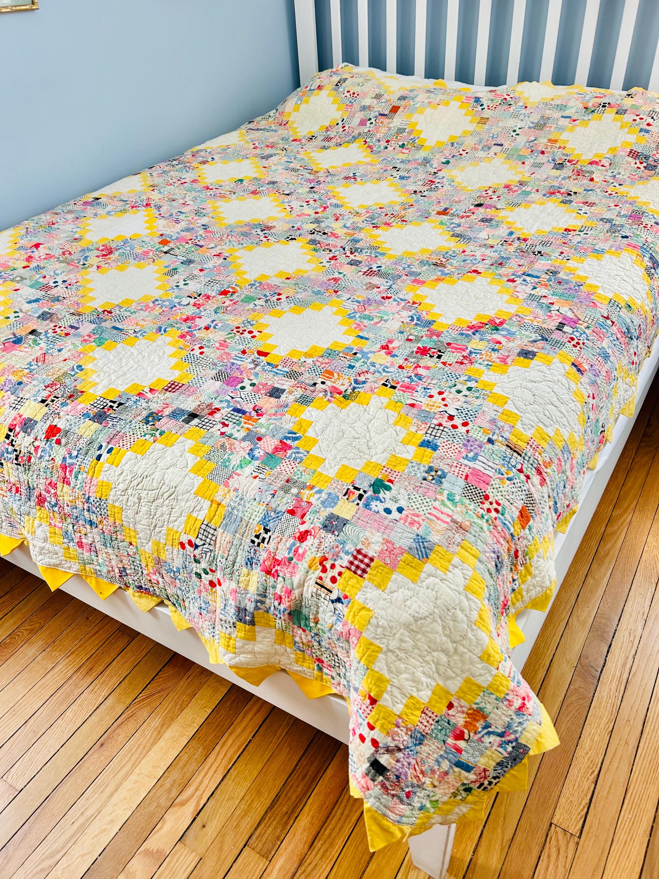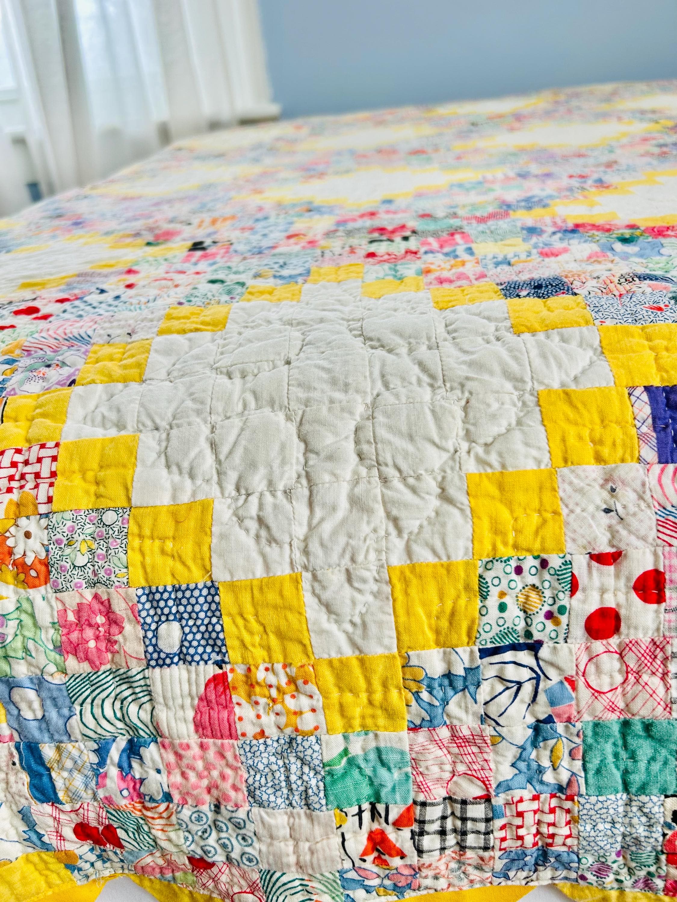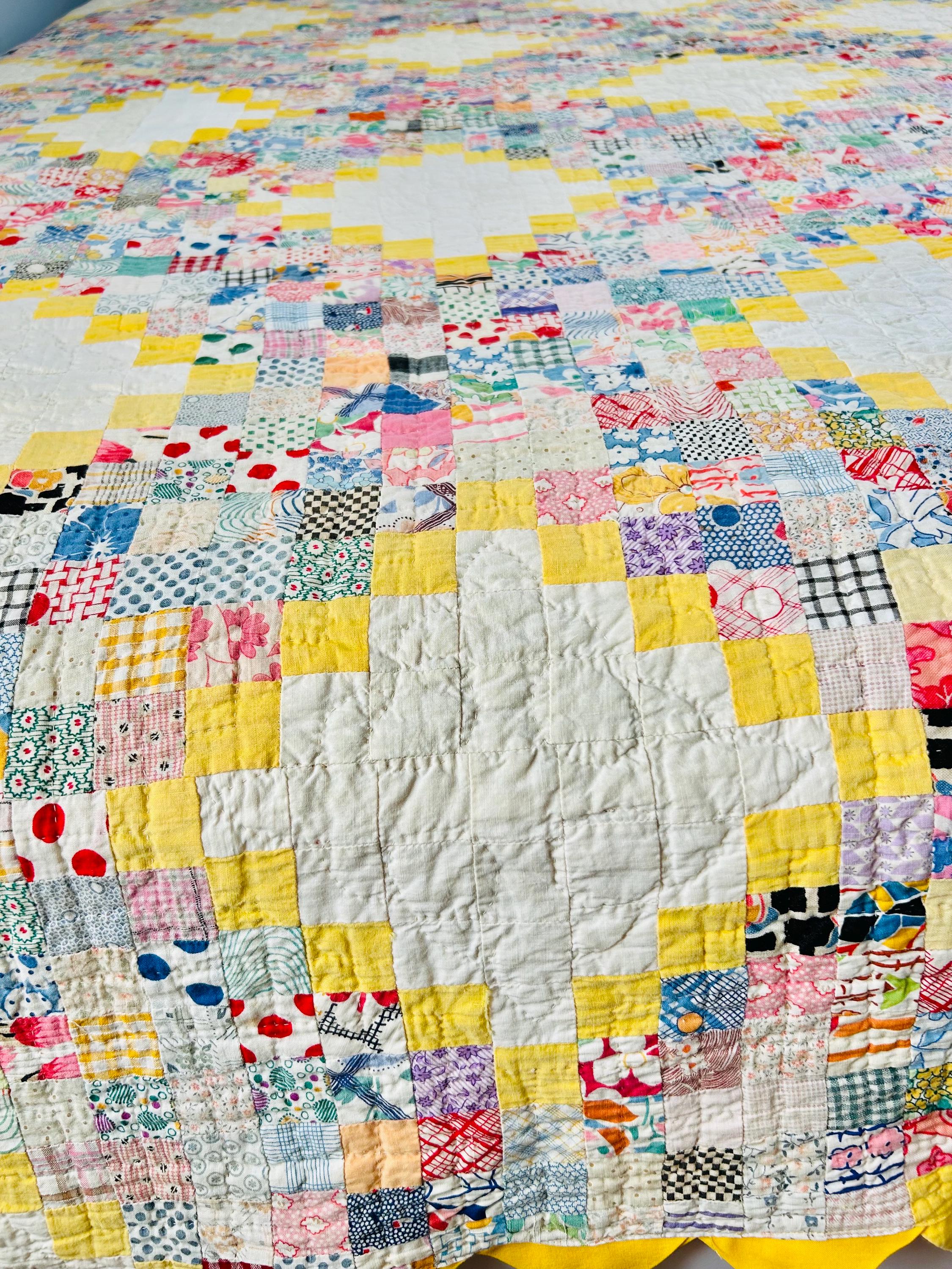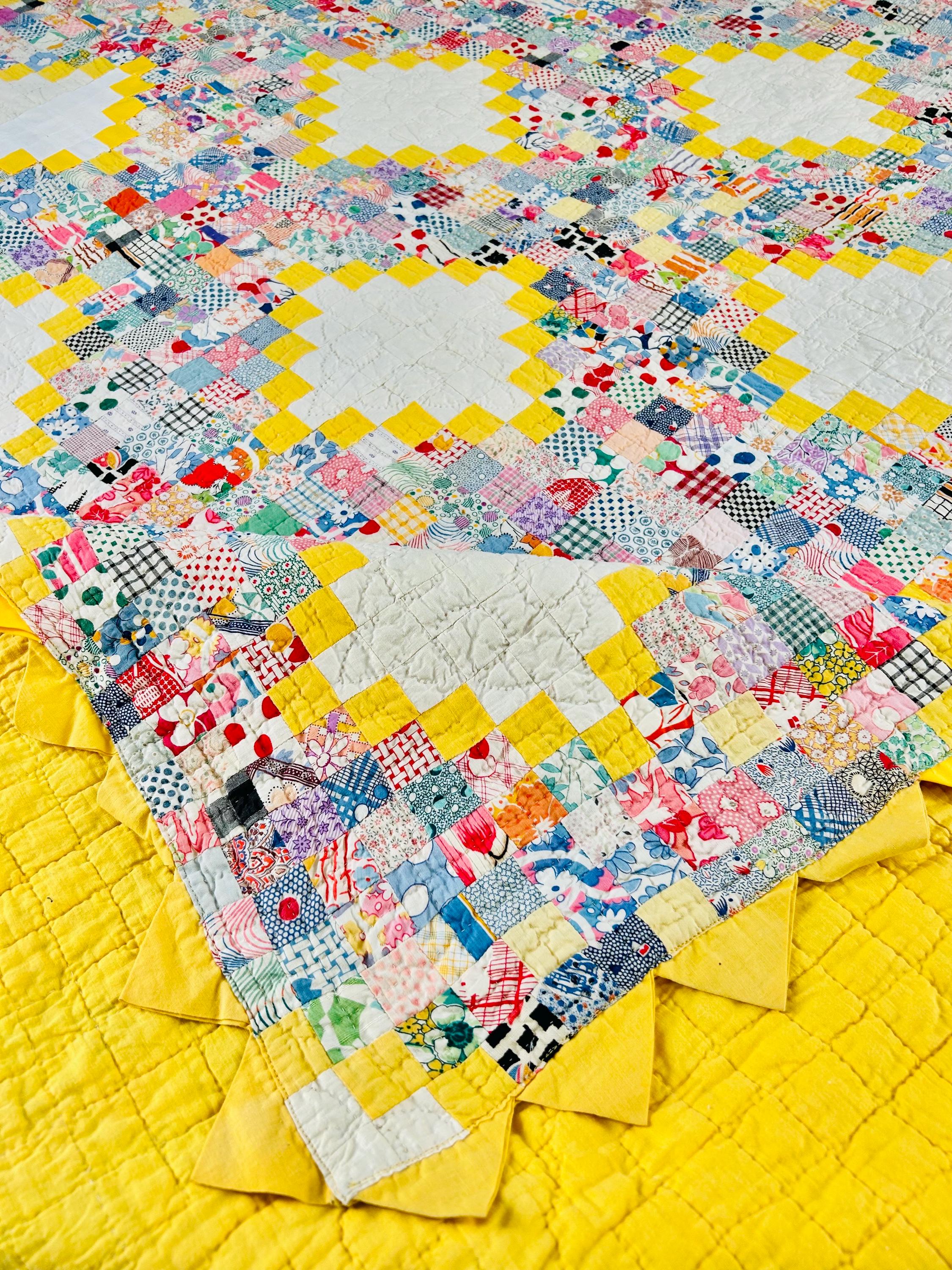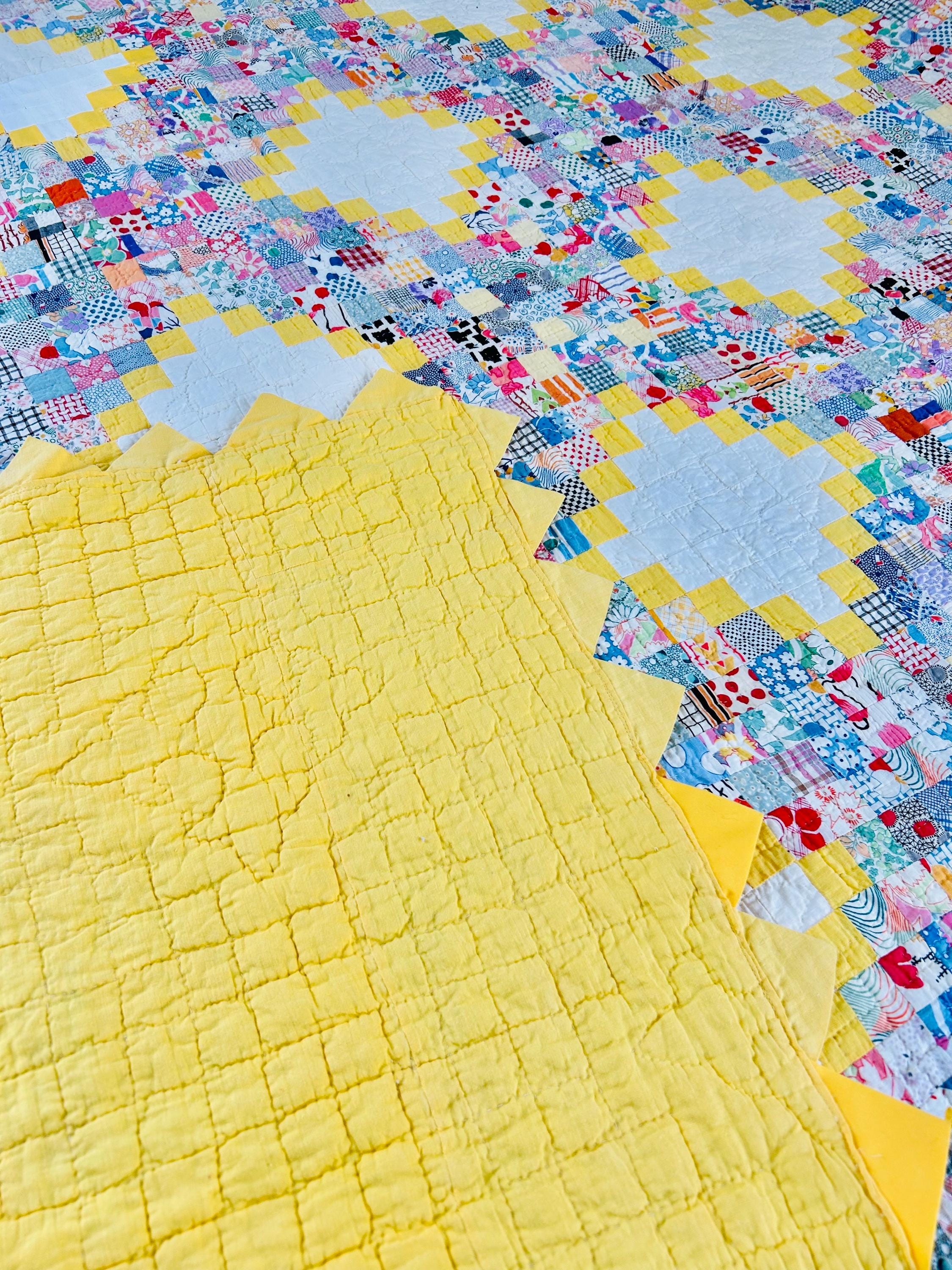 Details: • Pattern: Quadruple Irish Chain with 1-inch squares • Date: Circa 1930s • Size: 74” x 86” • Fabrics: 100% cotton, authentic 1930s feed sack prints • Colors: White, yellow, multicolor pastel prints • Batting: Lightweight cotton batting • Quilting: Hand quilted • Edge: Prairie point border • Backing: Solid yellow cotton