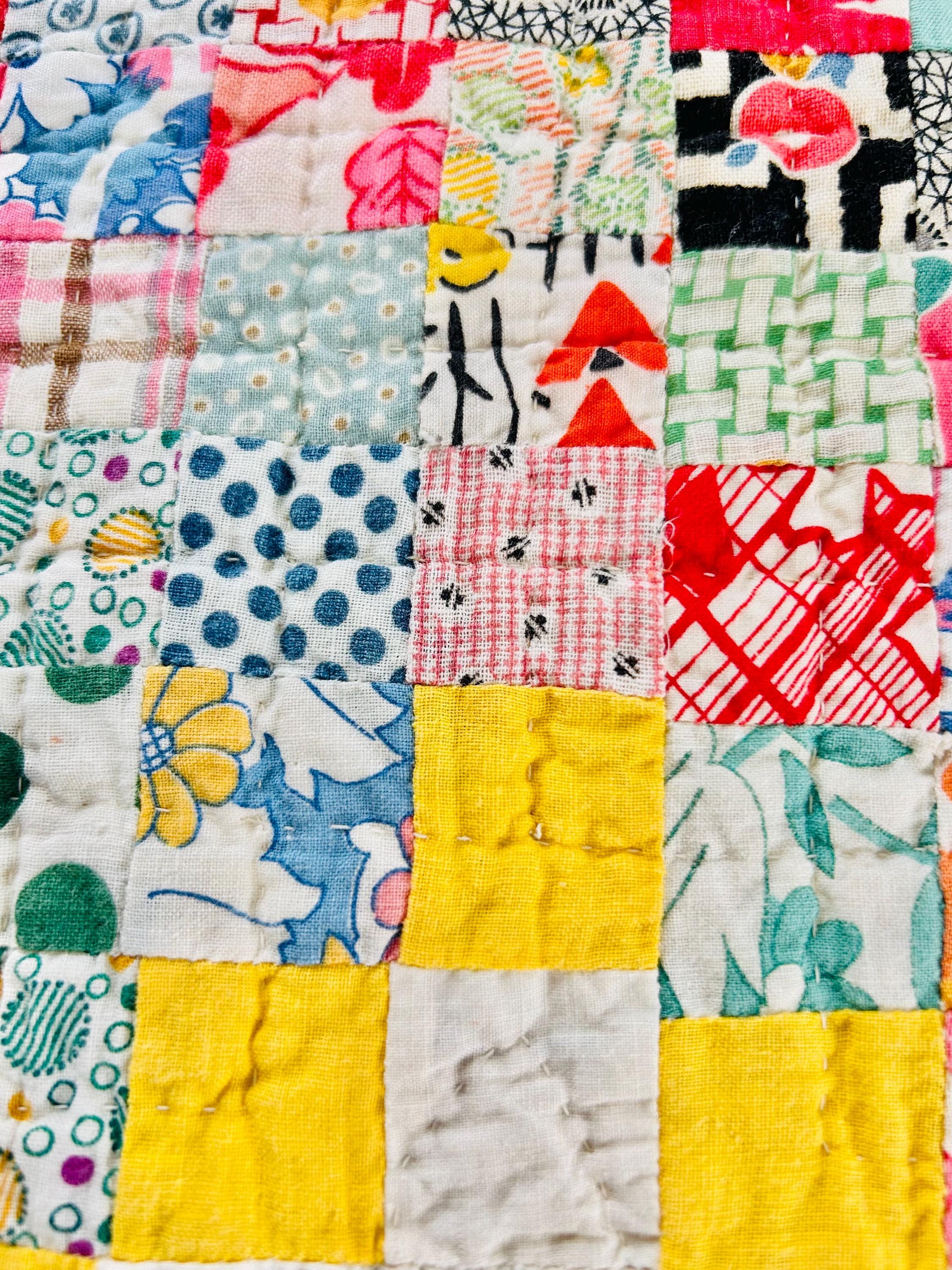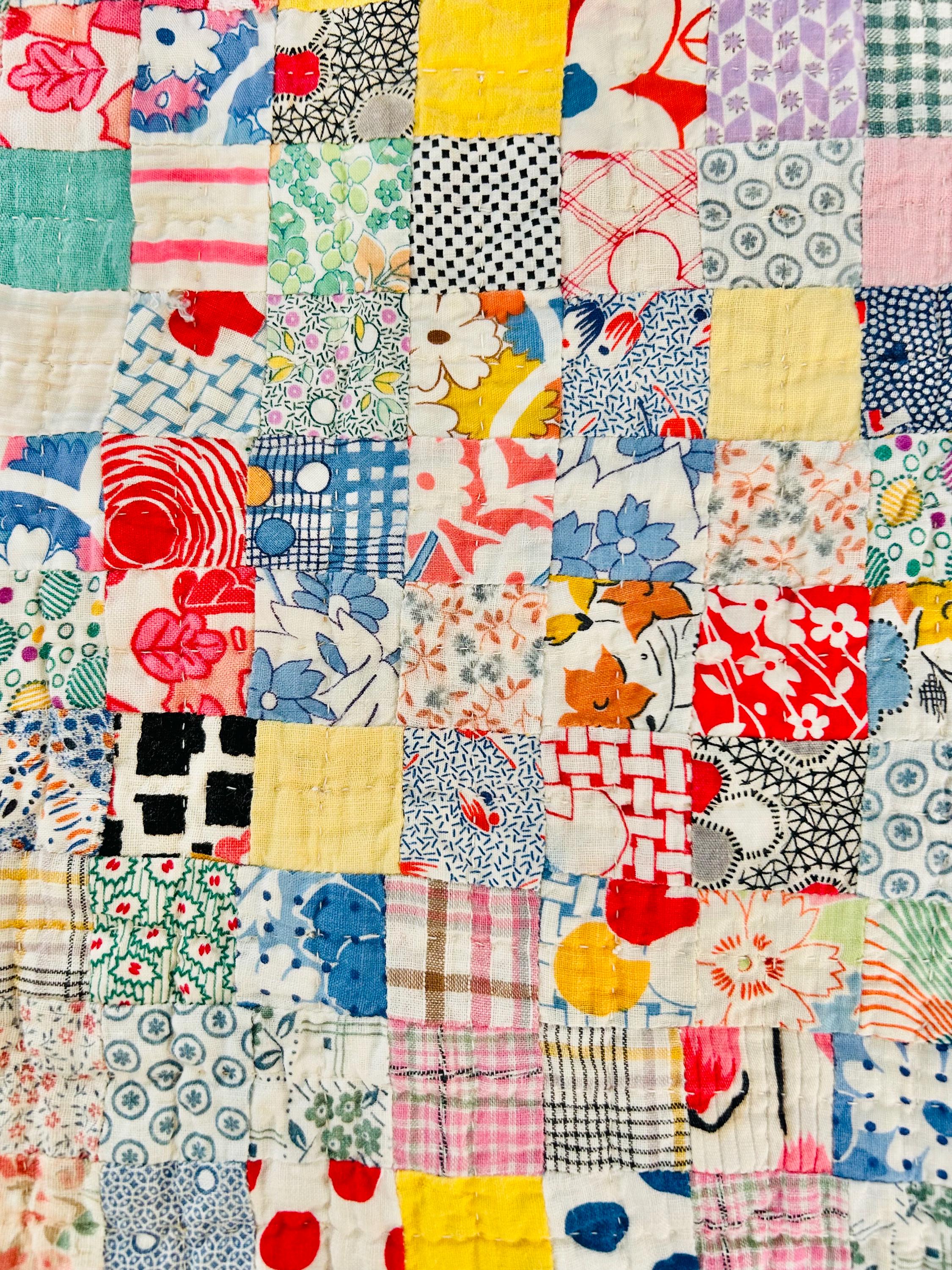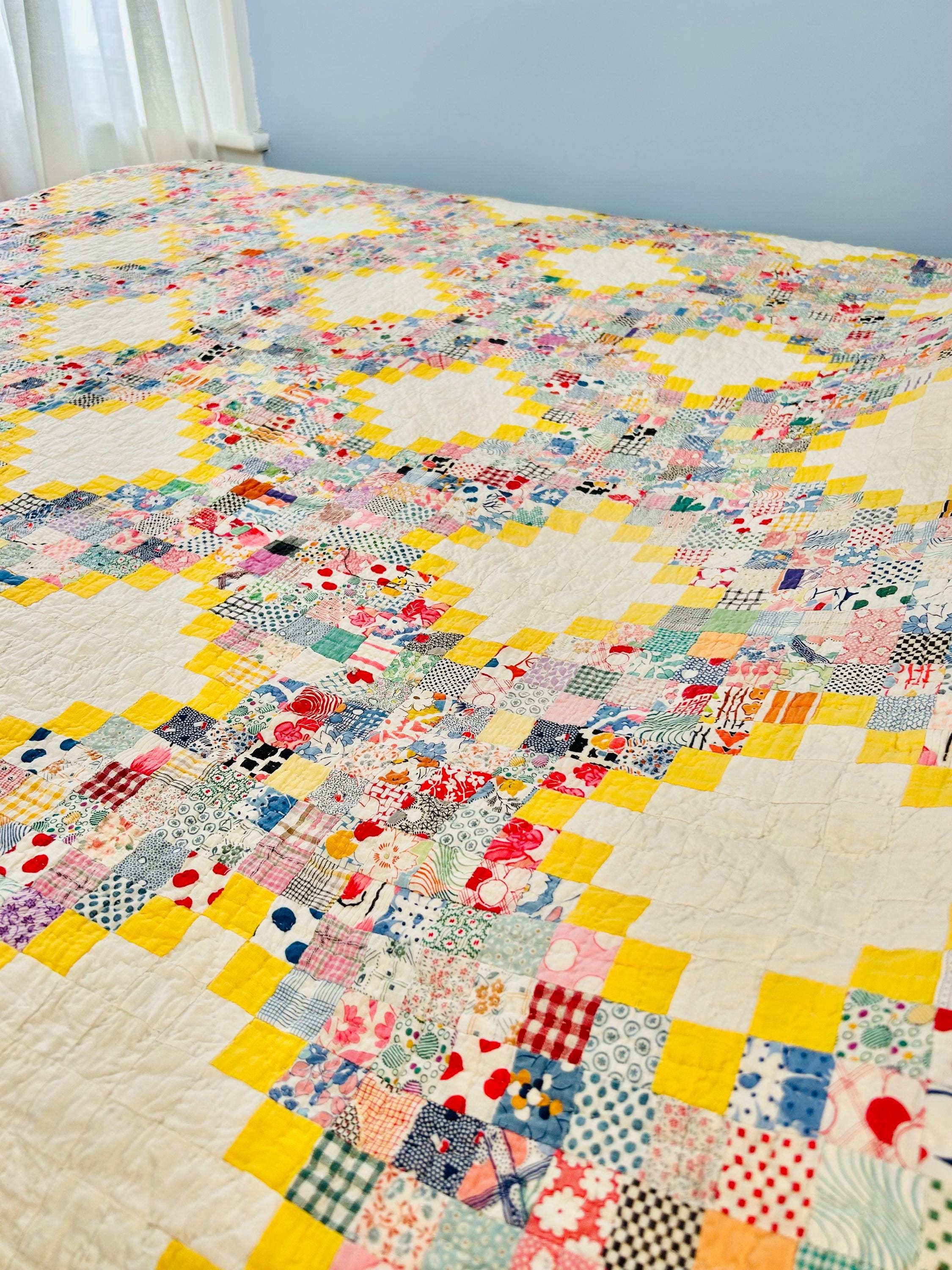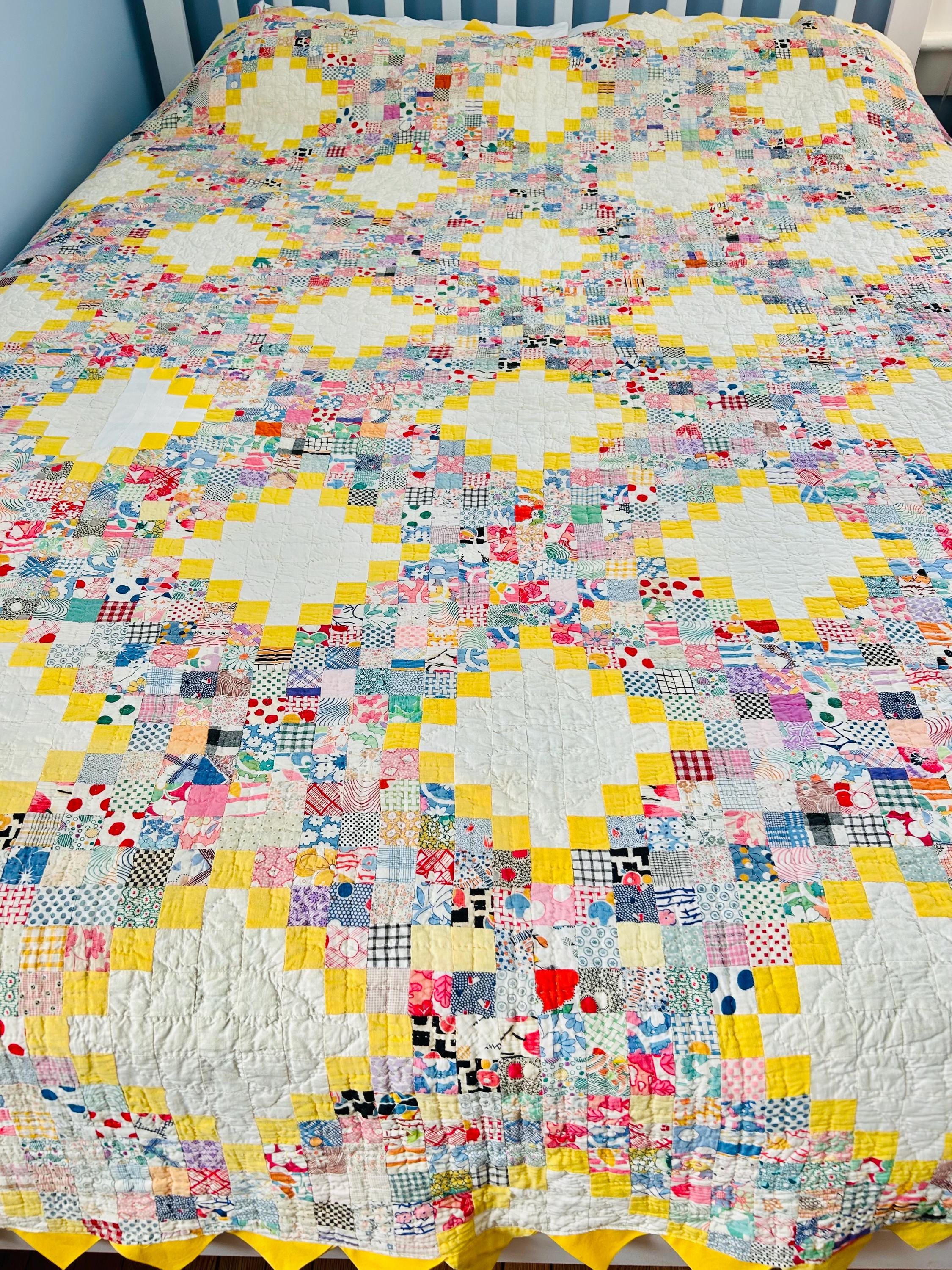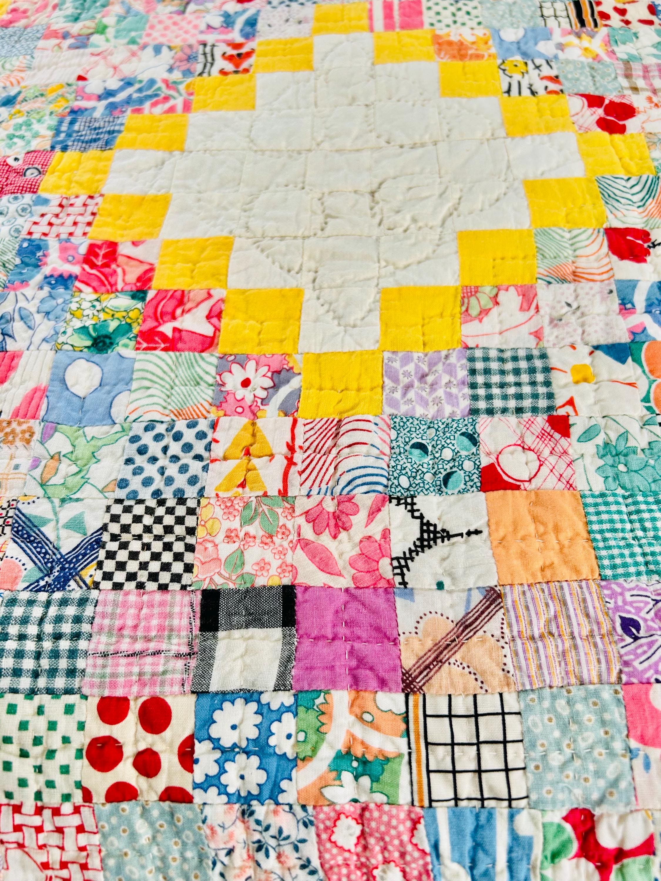 Details: • Pattern: Quadruple Irish Chain with 1-inch squares • Date: Circa 1930s • Size: 74” x 86” • Fabrics: 100% cotton, authentic 1930s feed sack prints • Colors: White, yellow, multicolor pastel prints • Batting: Lightweight cotton batting • Quilting: Hand quilted • Edge: Prairie point border • Backing: Solid yellow cotton