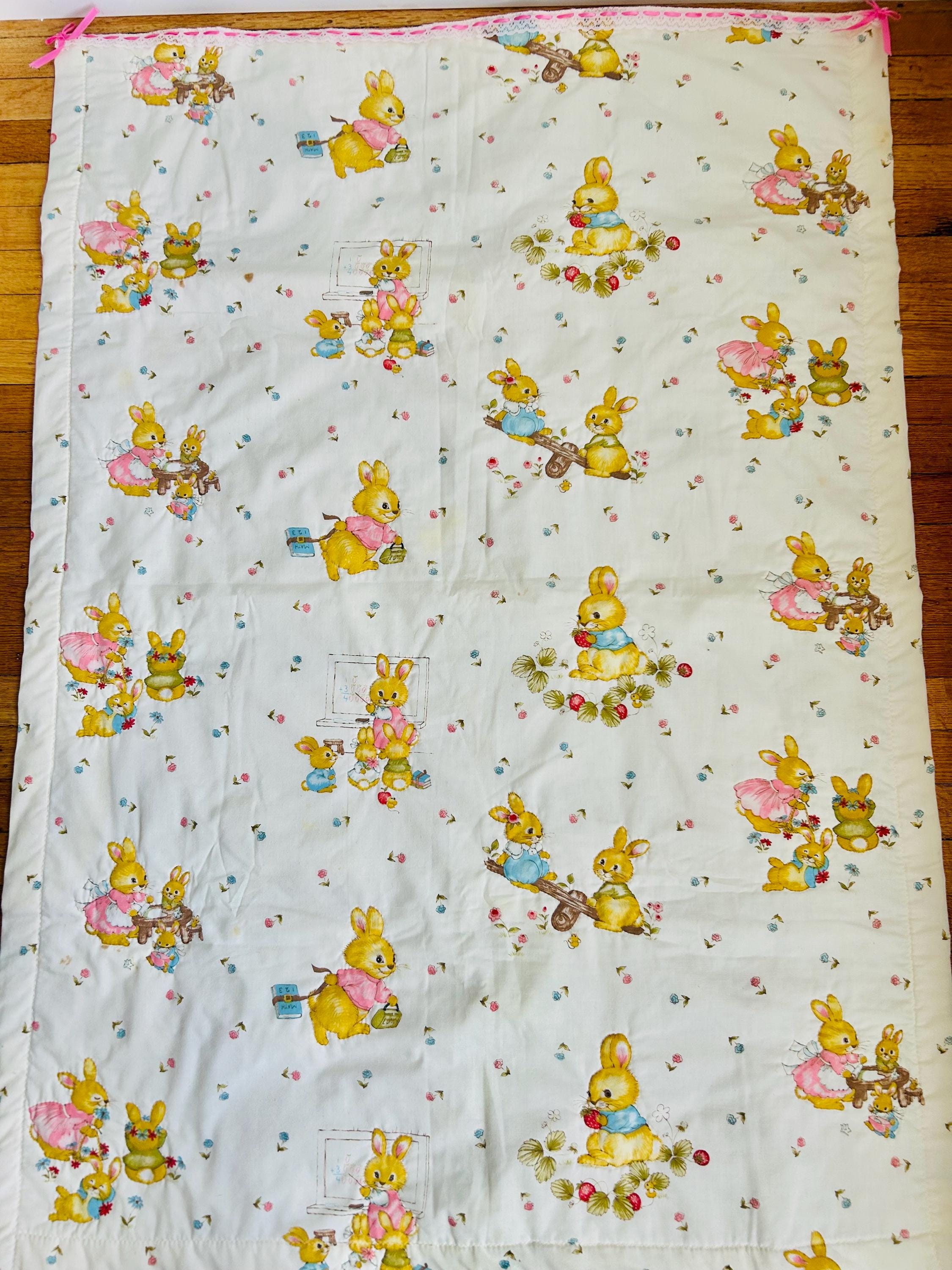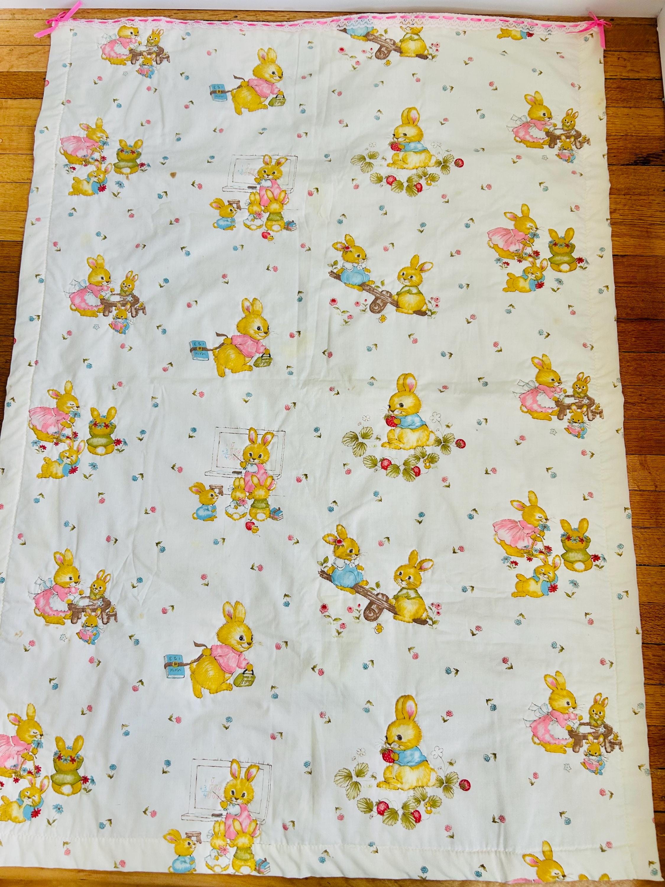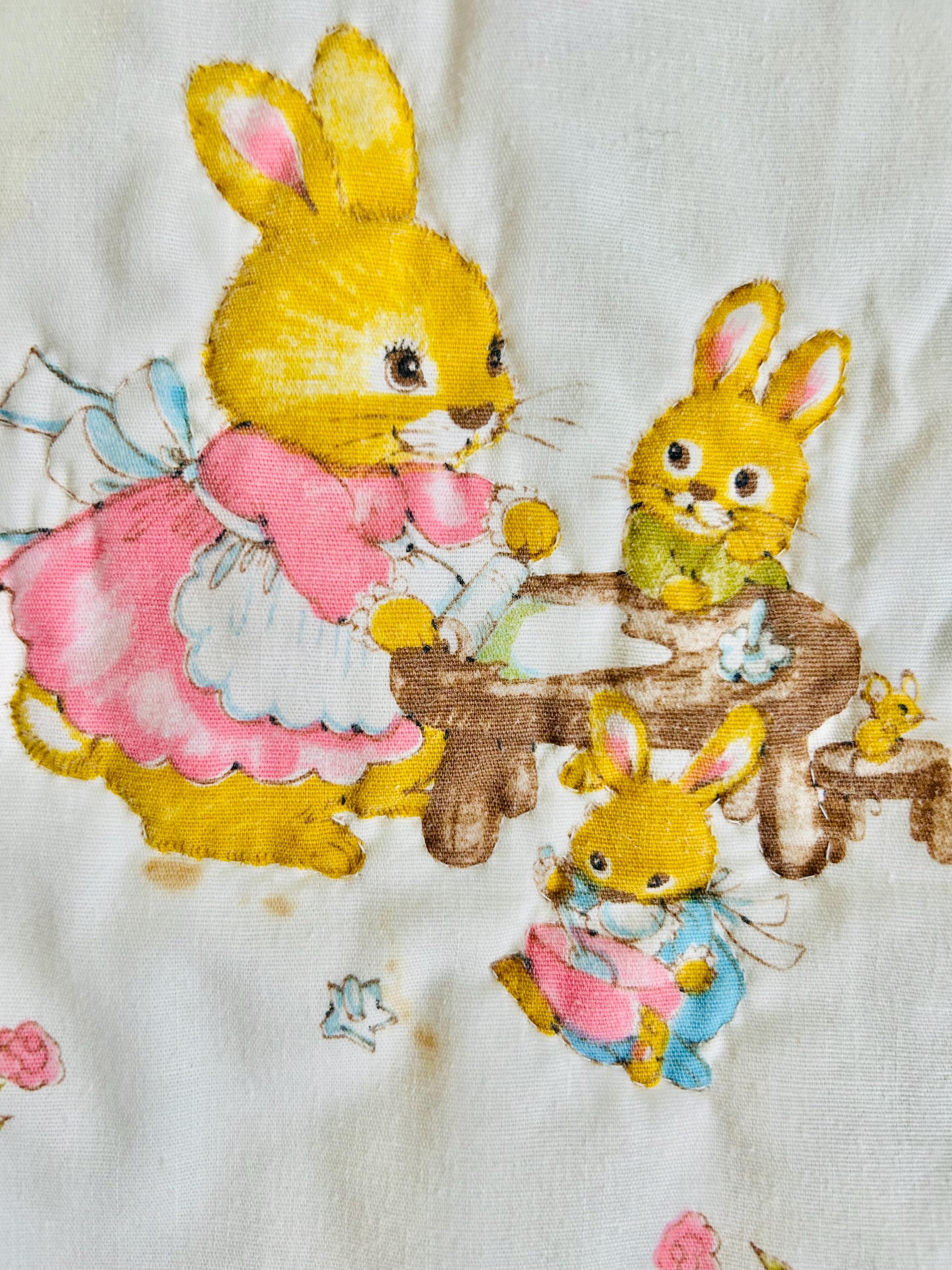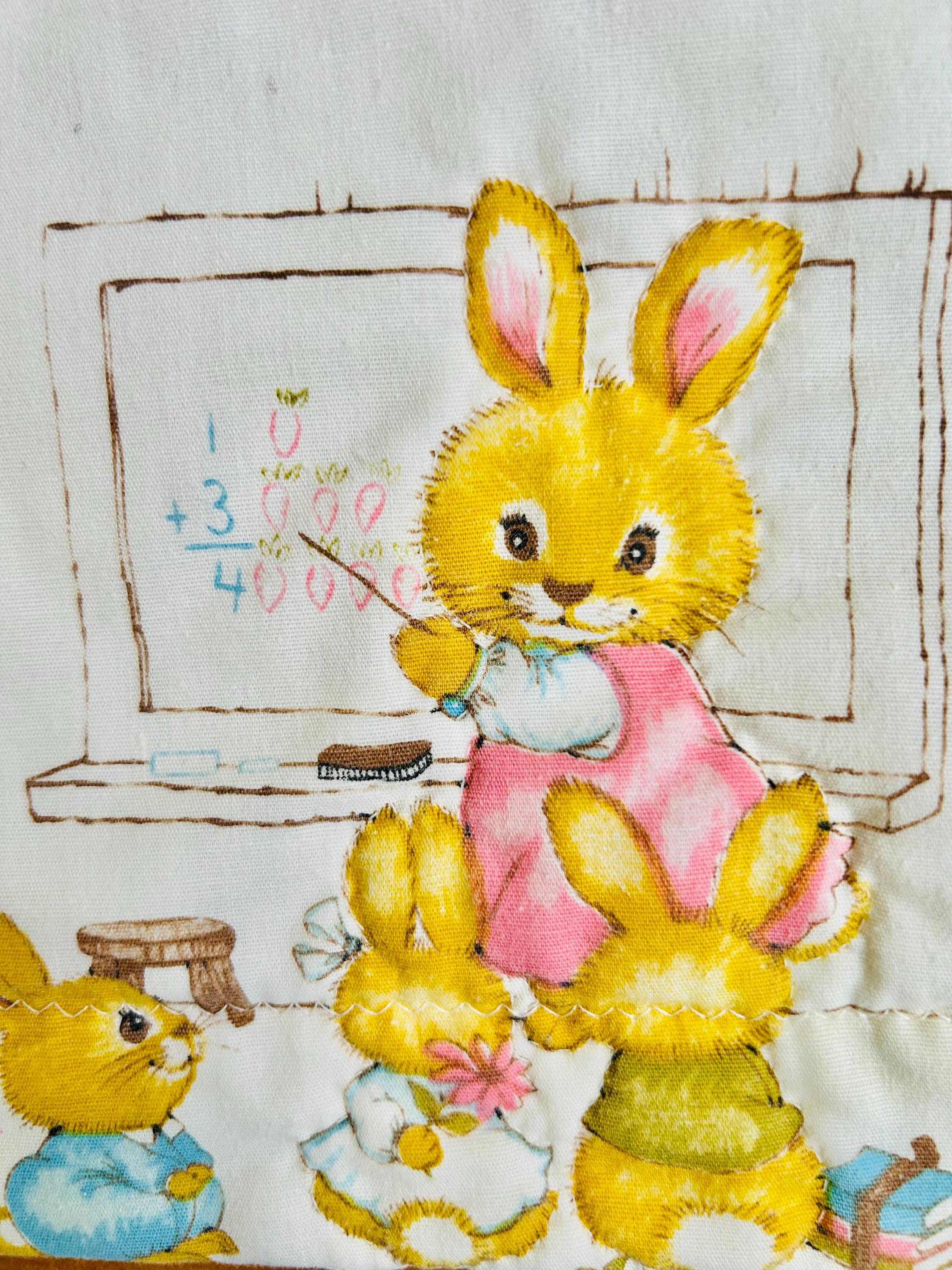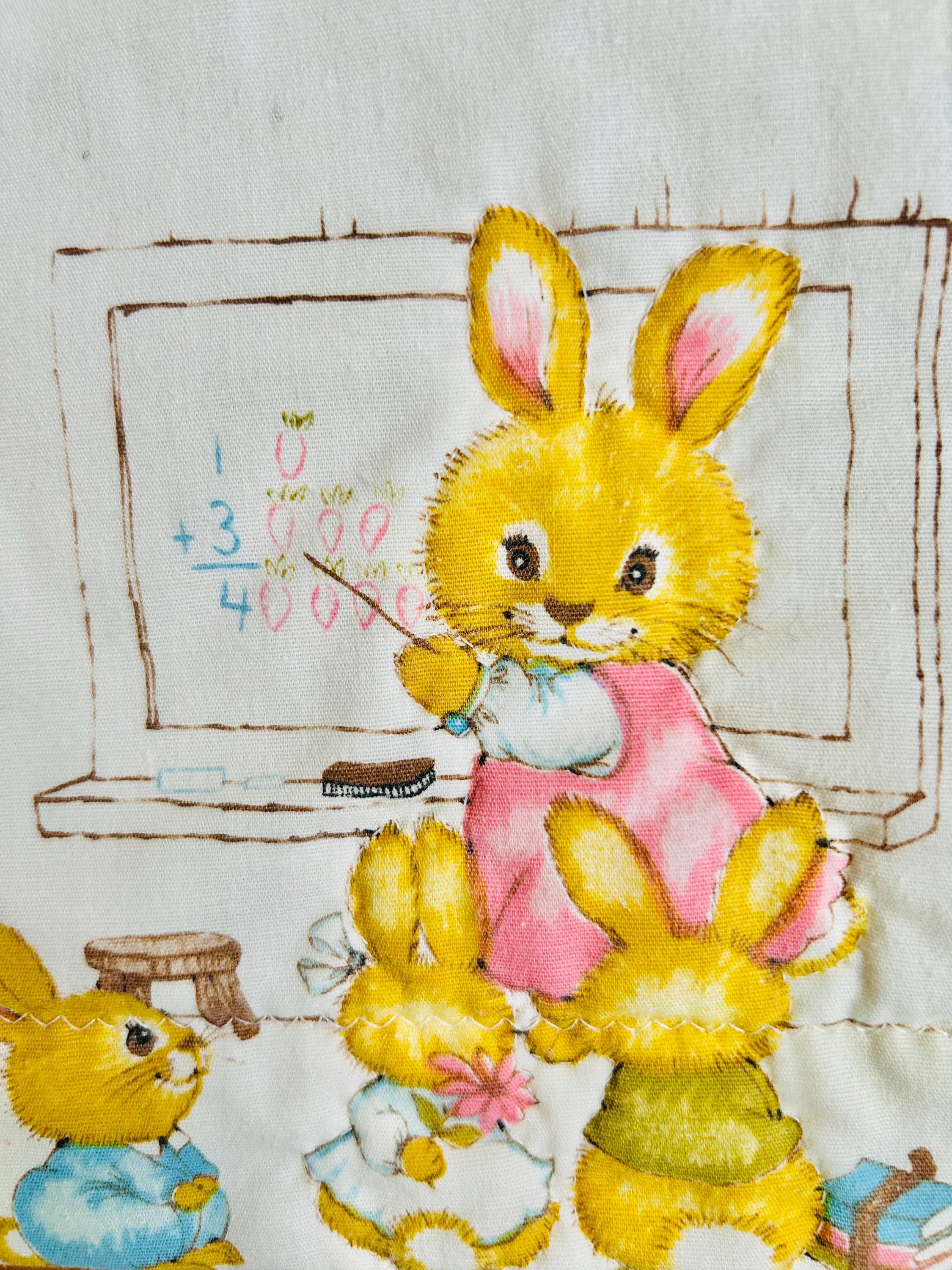 A charming mid-century baby quilt featuring an adorable all-over print of storybook-style bunnies in playful everyday scenes. These sweet rabbits—dressed in pastel clothing and shown teaching, playing, and exploring—capture the classic nursery aesthetic of the late 1950s and early 1960s.