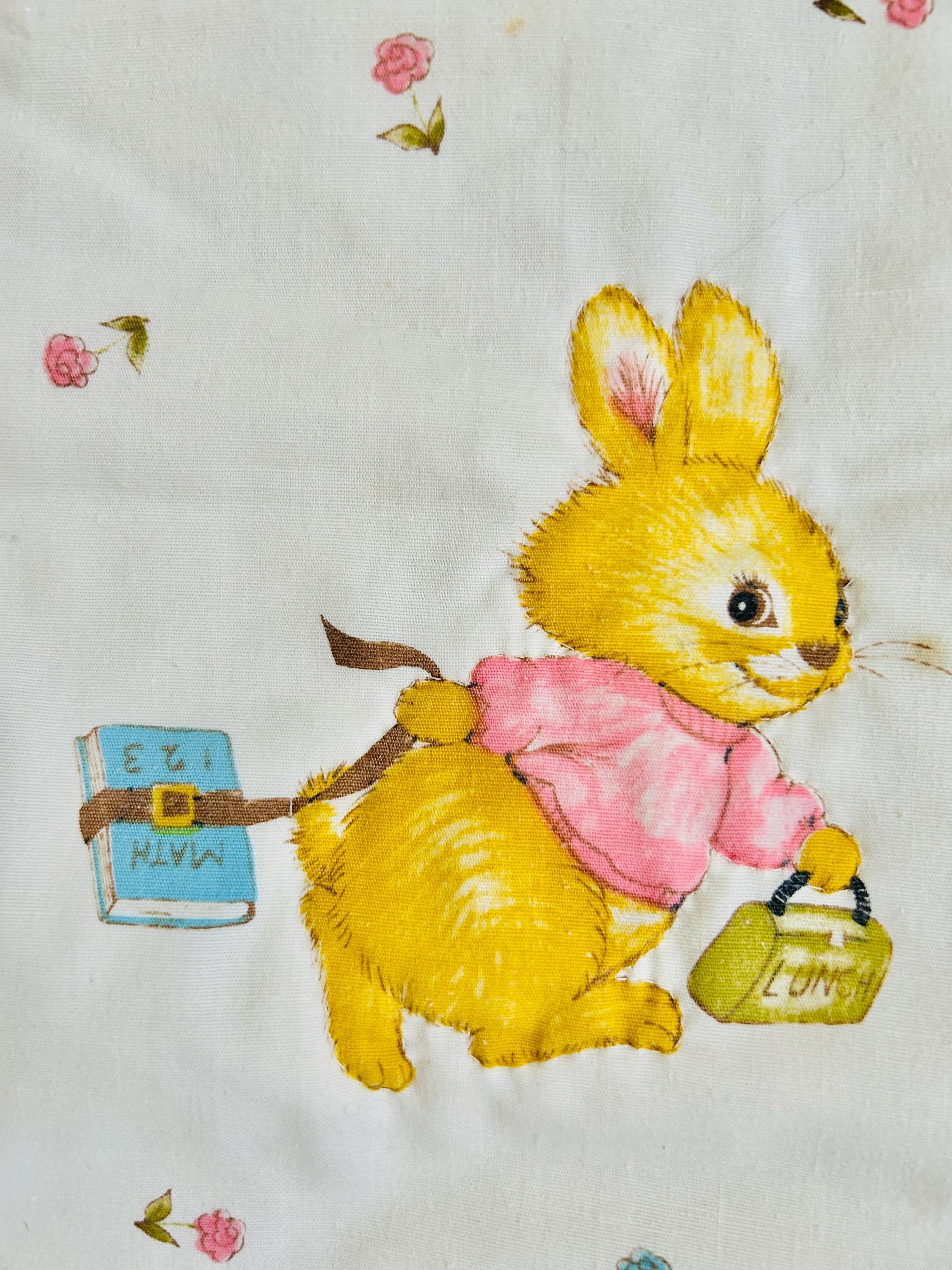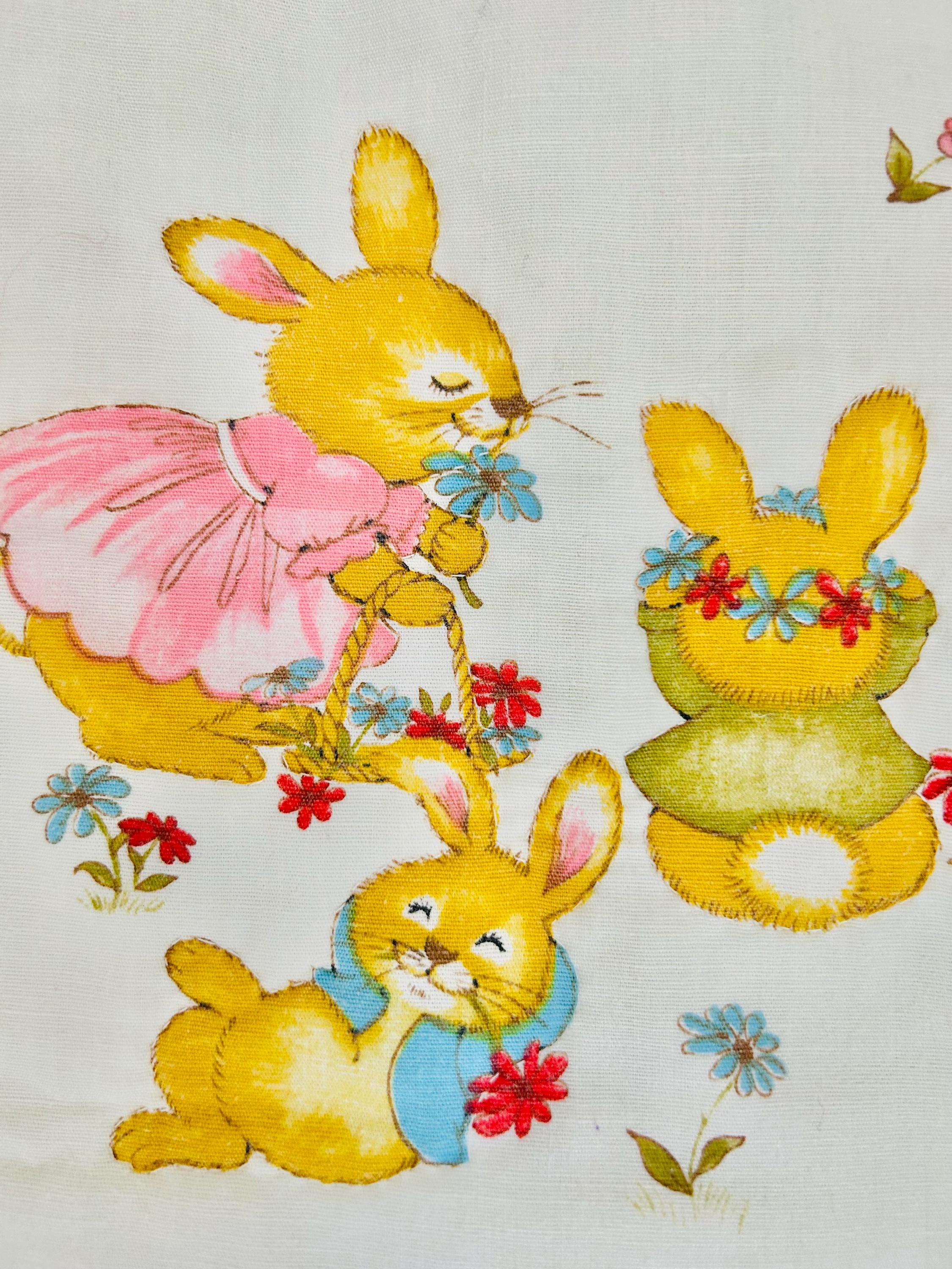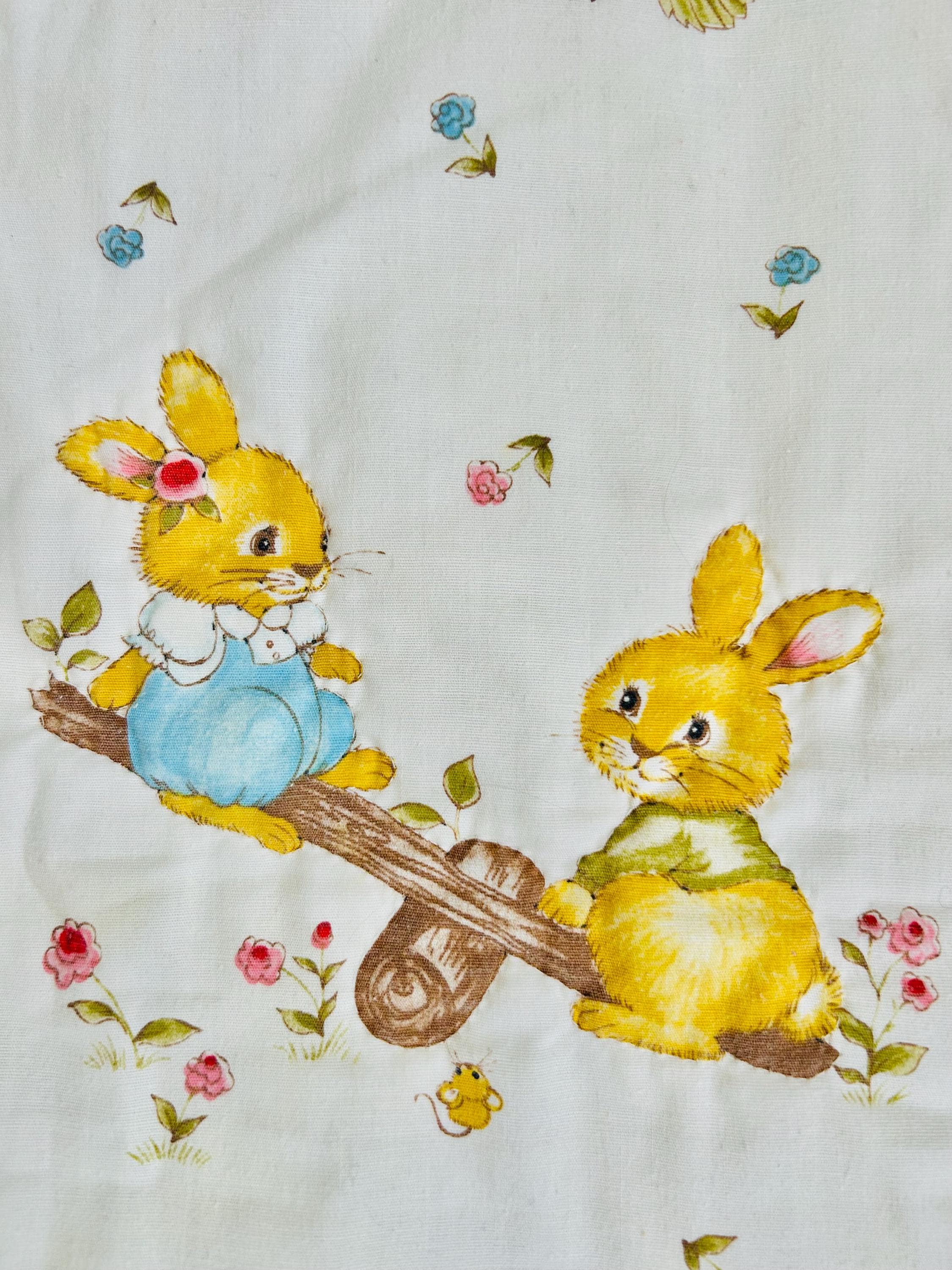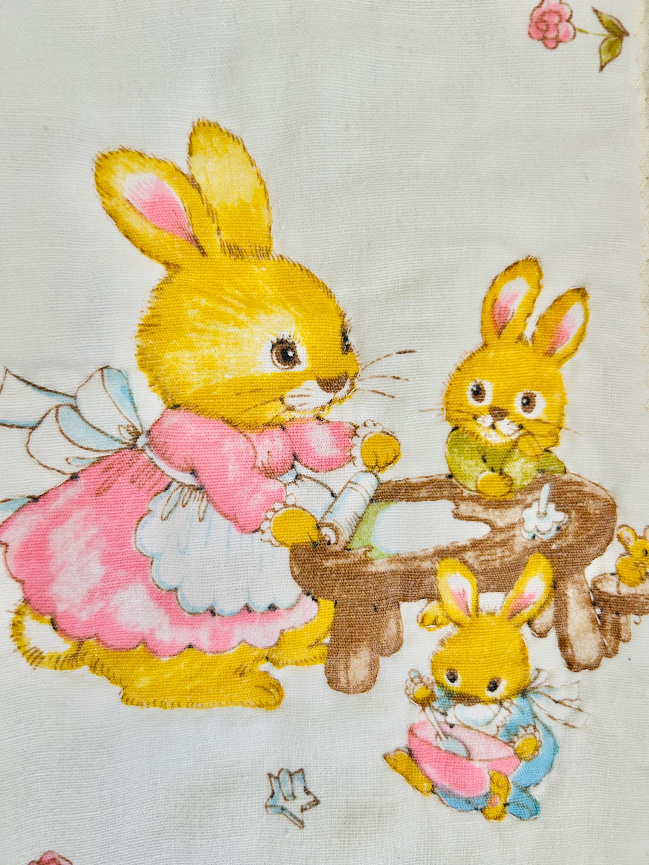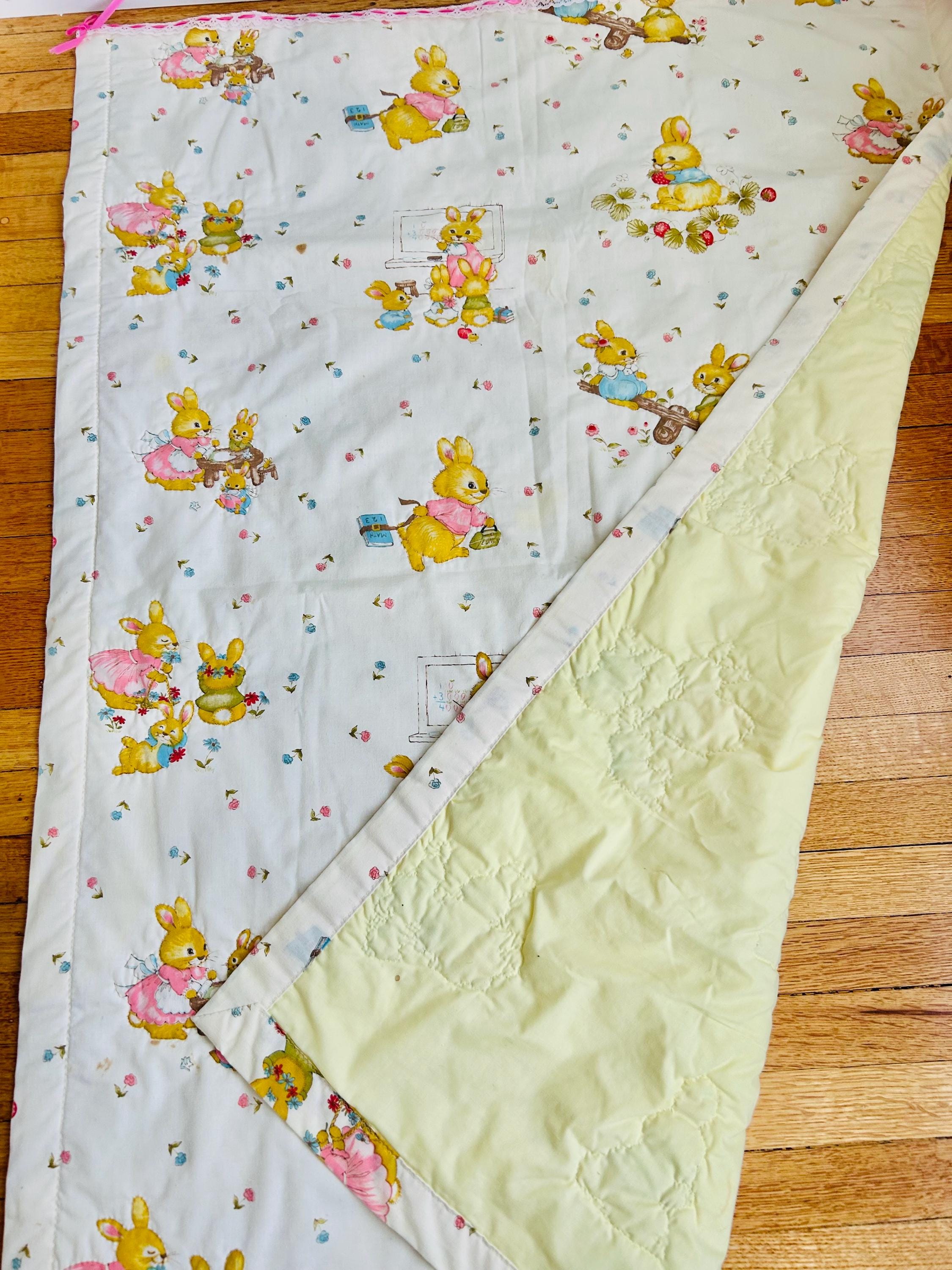 A charming mid-century baby quilt featuring an adorable all-over print of storybook-style bunnies in playful everyday scenes. These sweet rabbits—dressed in pastel clothing and shown teaching, playing, and exploring—capture the classic nursery aesthetic of the late 1950s and early 1960s.