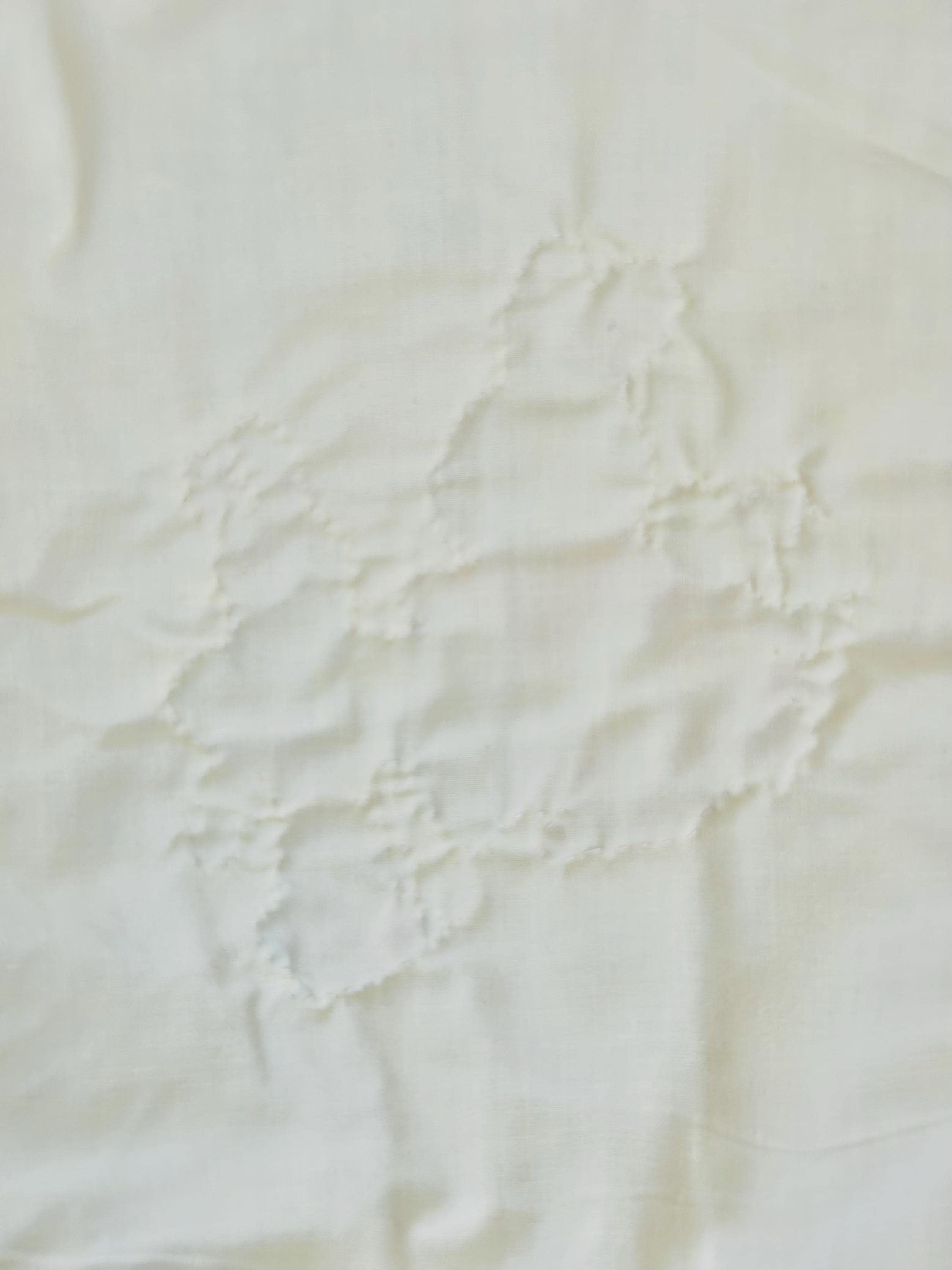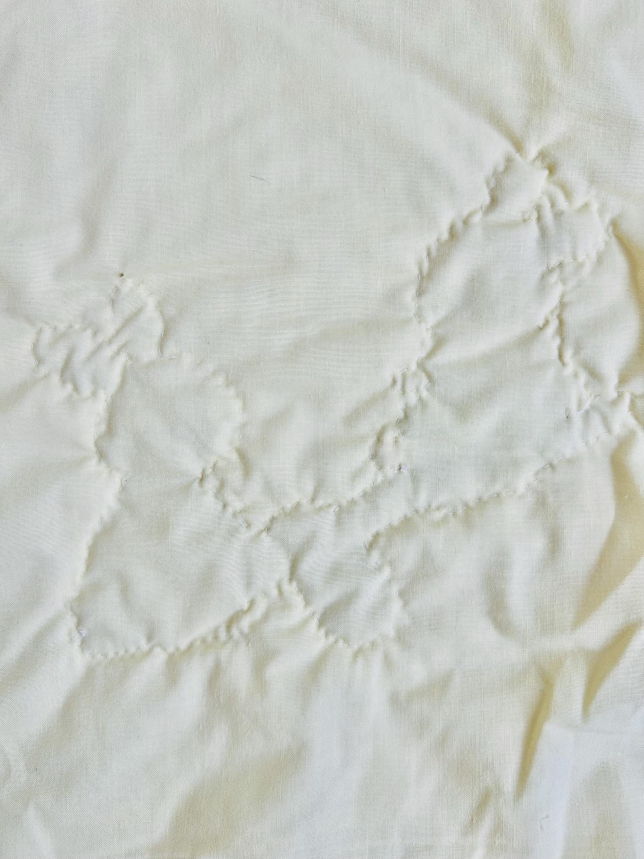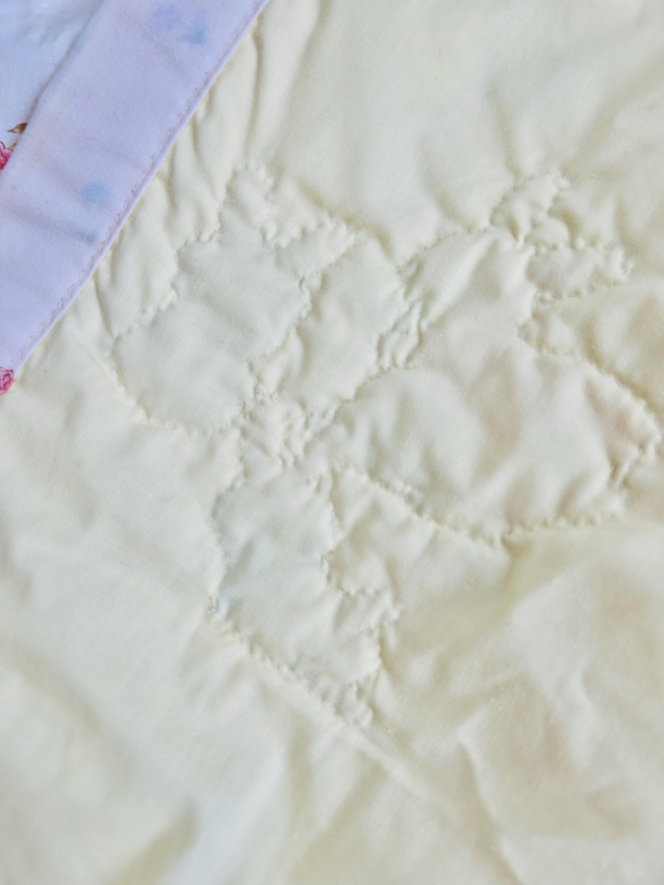 It is backed in a pale yellow fabric while the cotton fabric from the front has been turned to the back and hand-stitched to form the binding. The batting is very lightweight.