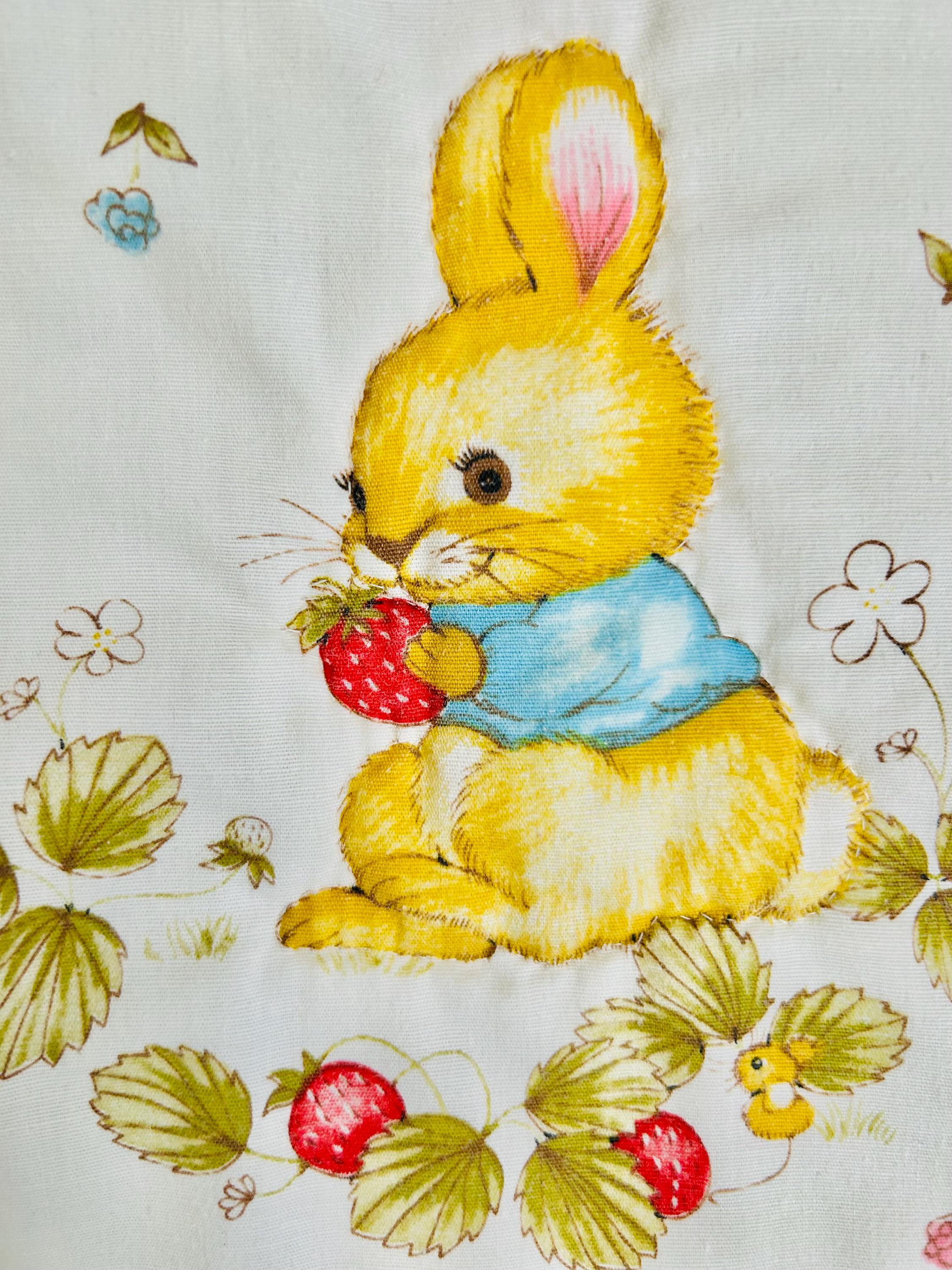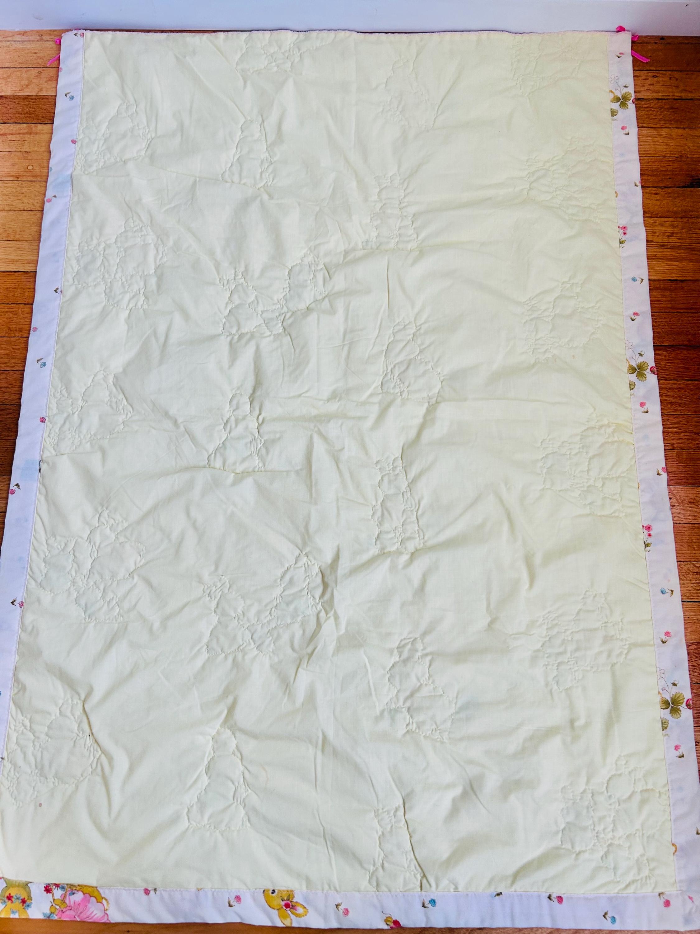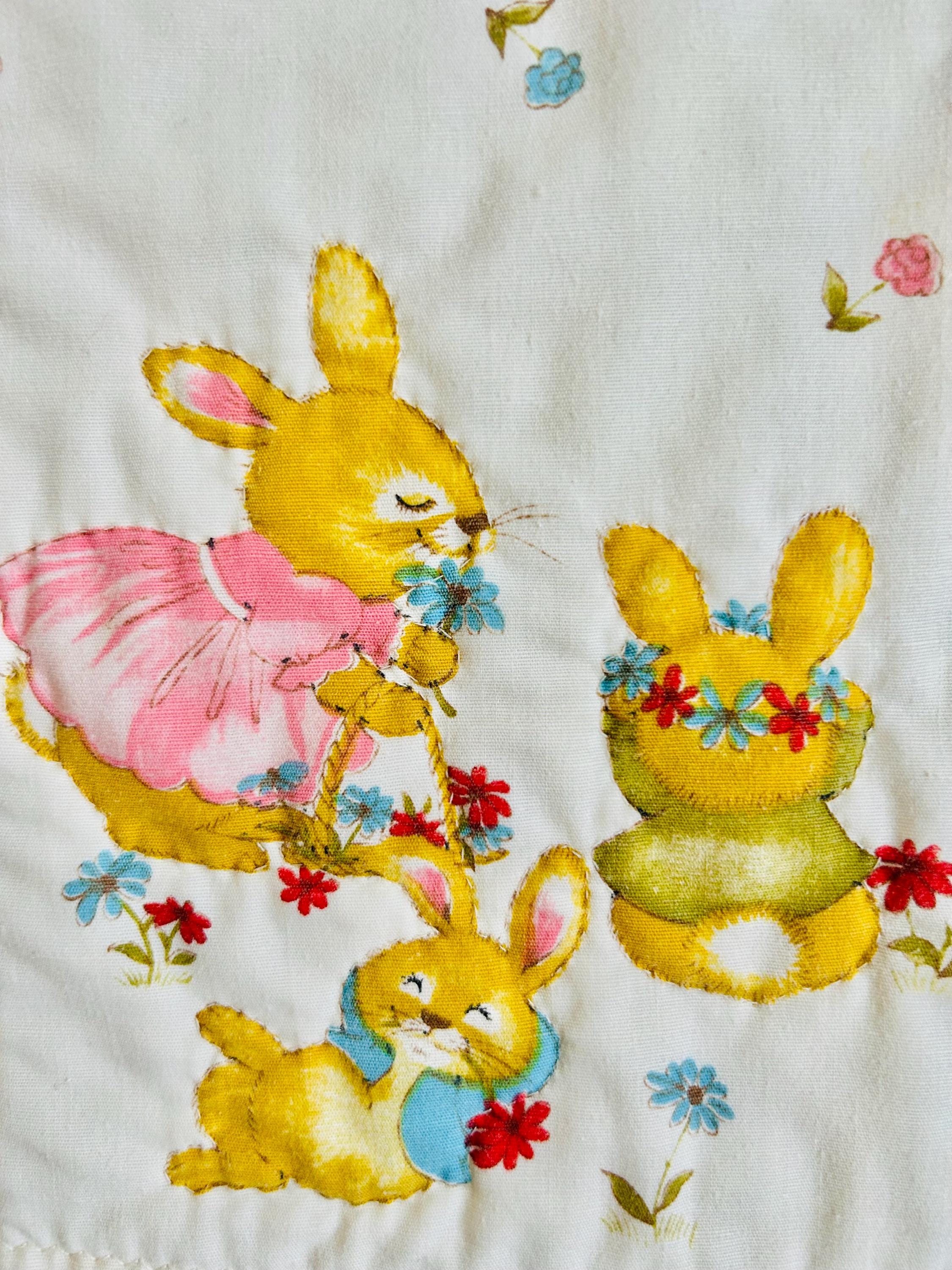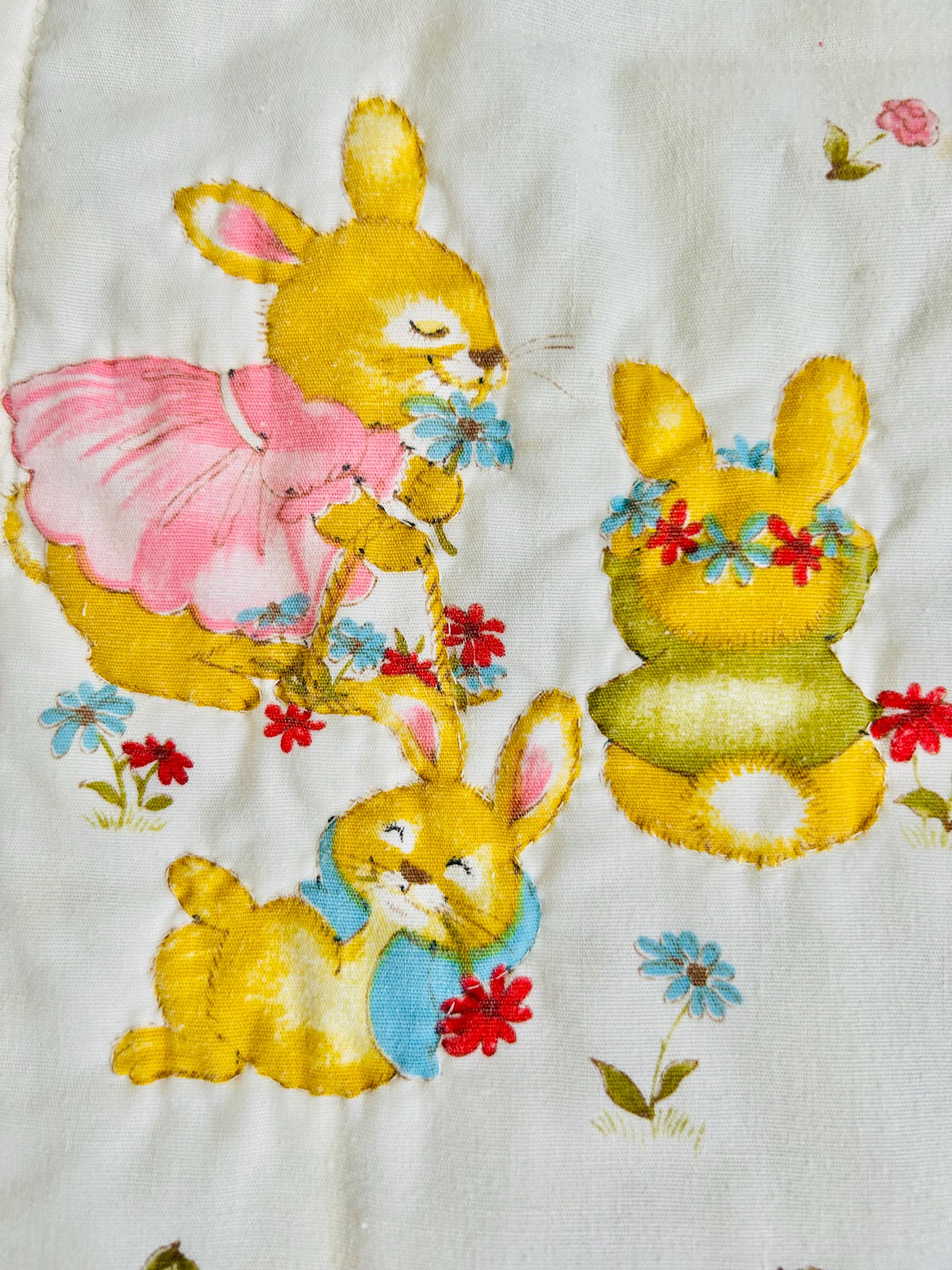 Details: • Size: 36” x 50” (crib/baby size) • Era: Vintage, circa 1950s • Materials: Printed cotton top, cotton backing, lightweight batting • Construction: Hand-quilted in outlines of the bunny motifs • Design: All-over mid-century bunny nursery print with pastel florals • Colors: Cream/off-white ground with yellow, pink, blue, and soft green accents • Backing: Pale yellow cotton