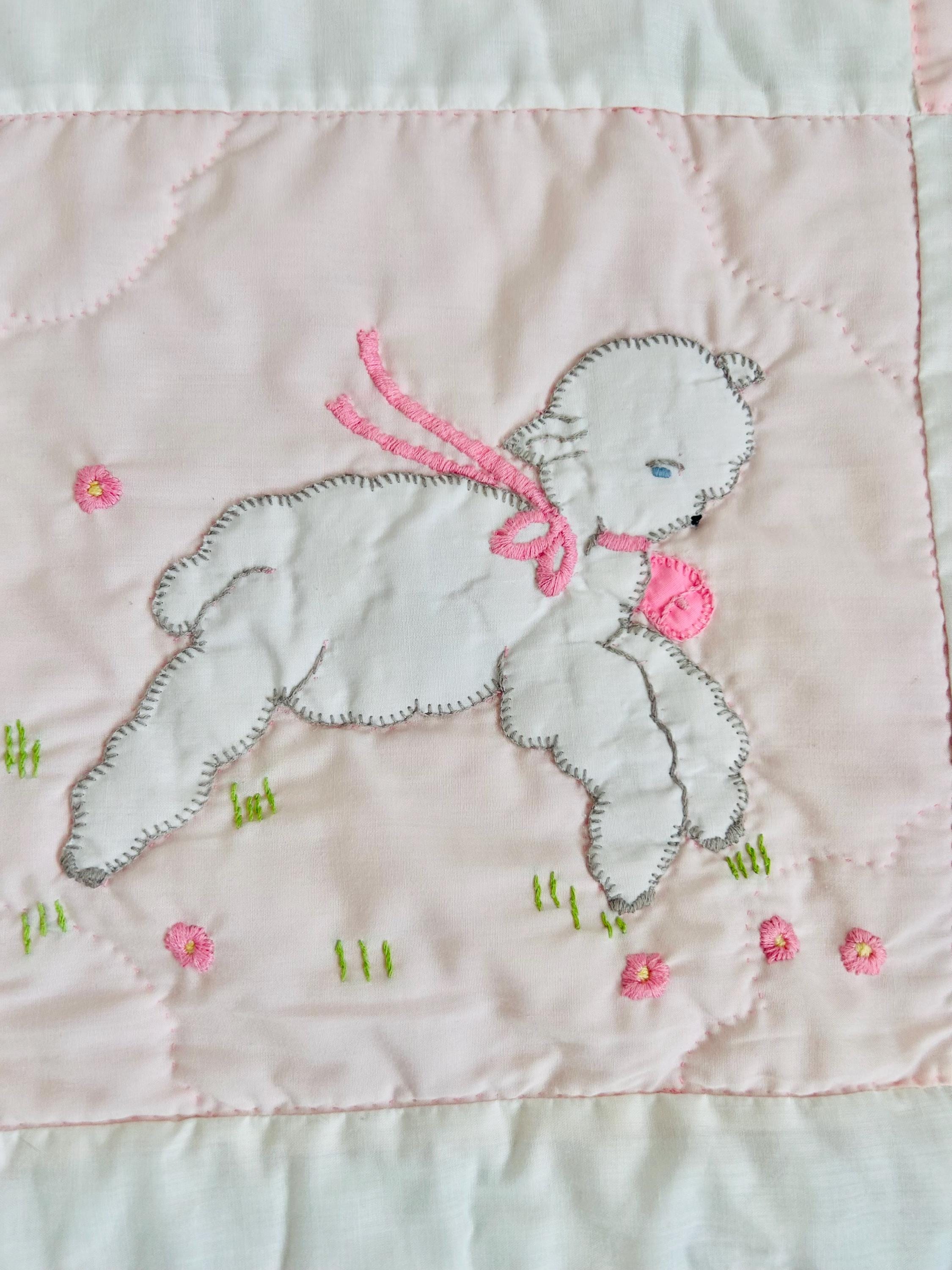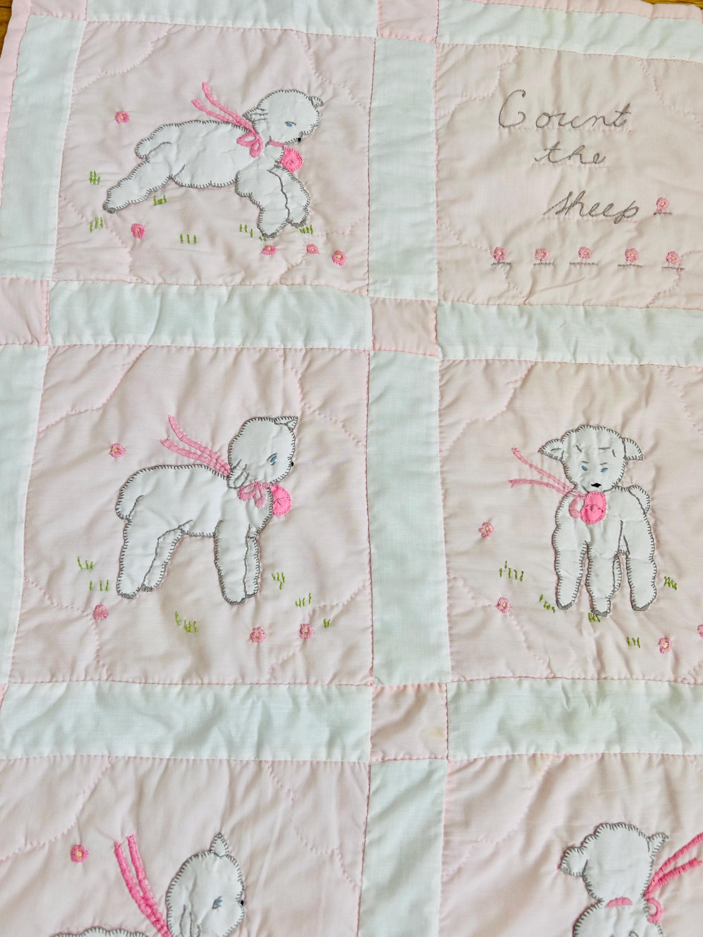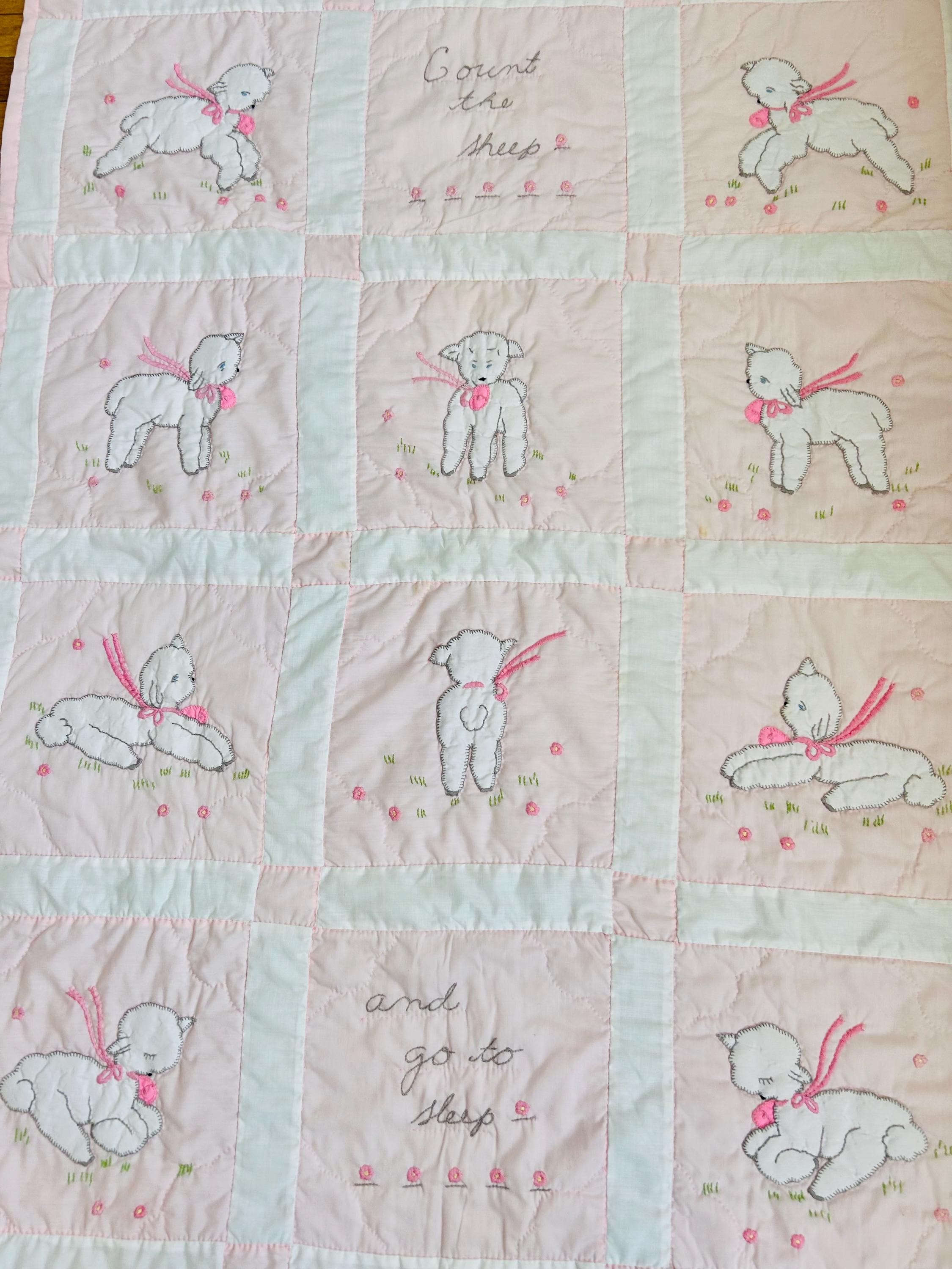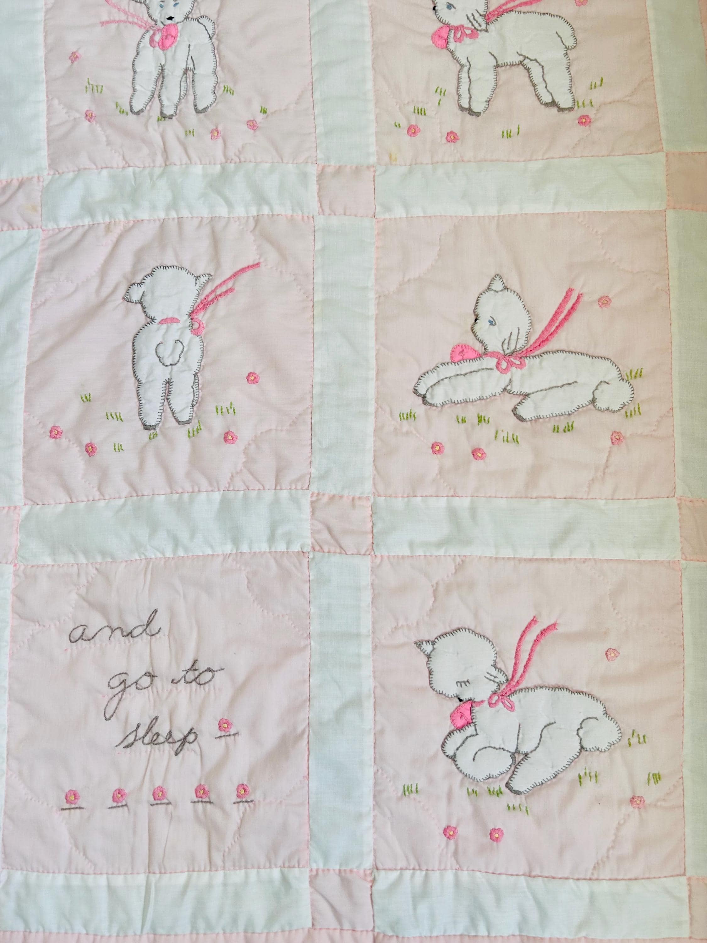 Details: • Size: 37” x 41” • Date: Circa 1950s • Materials: Cotton fabrics with cotton batting • Construction: Hand appliqué, hand embroidery, and hand quilting • Design: Lamb / nursery rhyme theme (“Count the sheep and go to sleep”) • Colors: Soft pink, pale mint green, white • Quilting: Light hand quilted outlines and motifs visible on both sides • Edge: Machine-finished binding