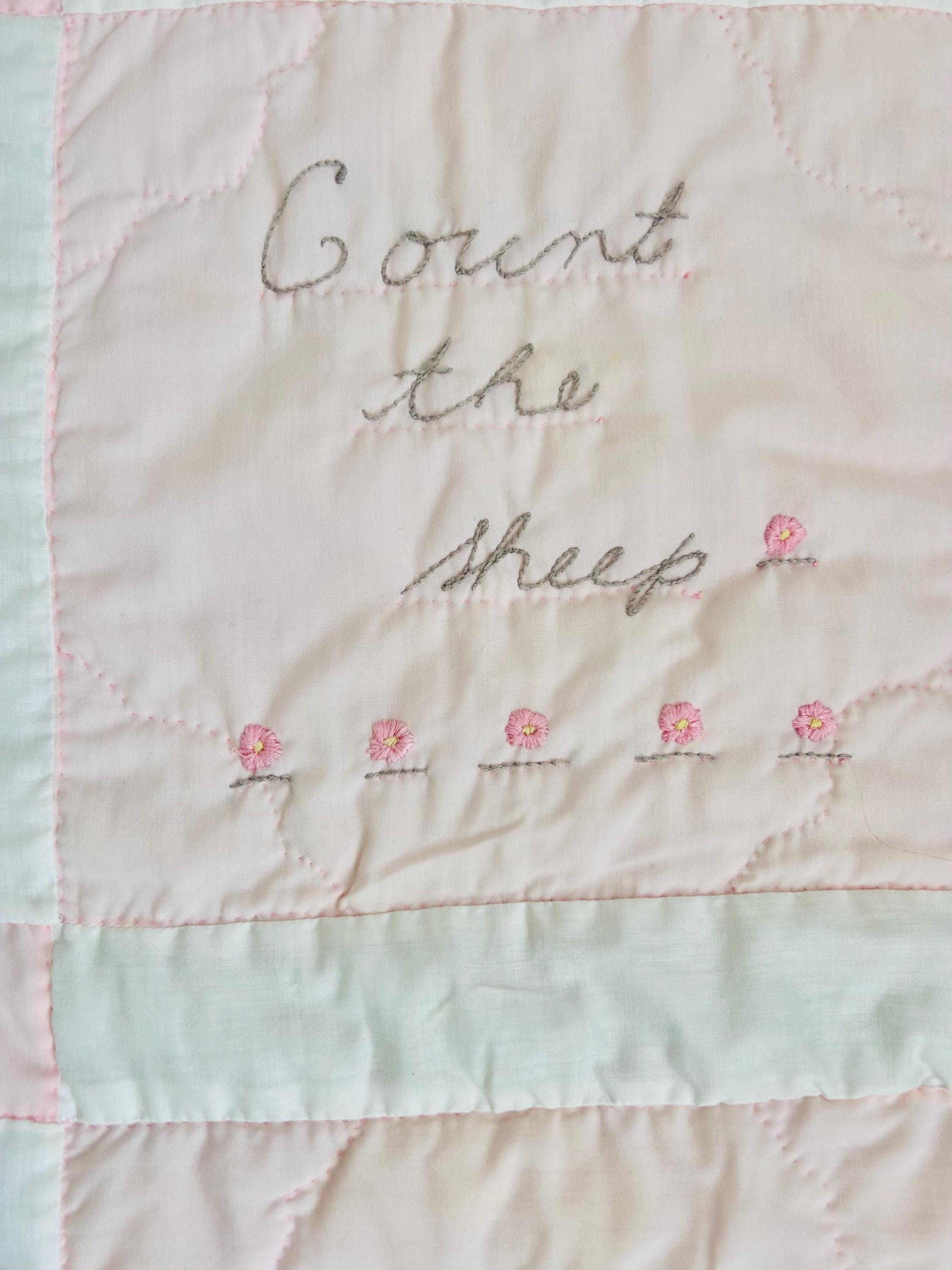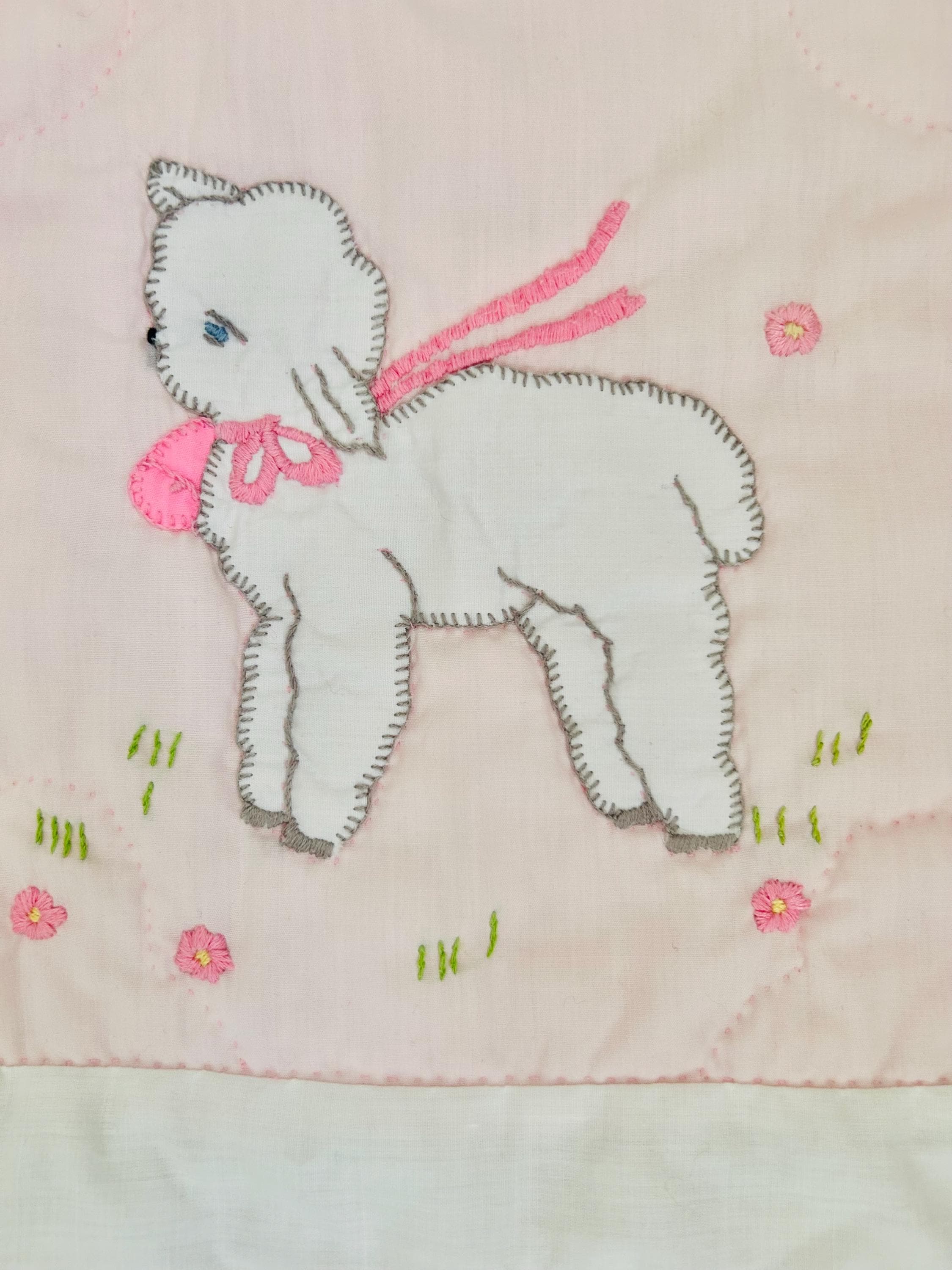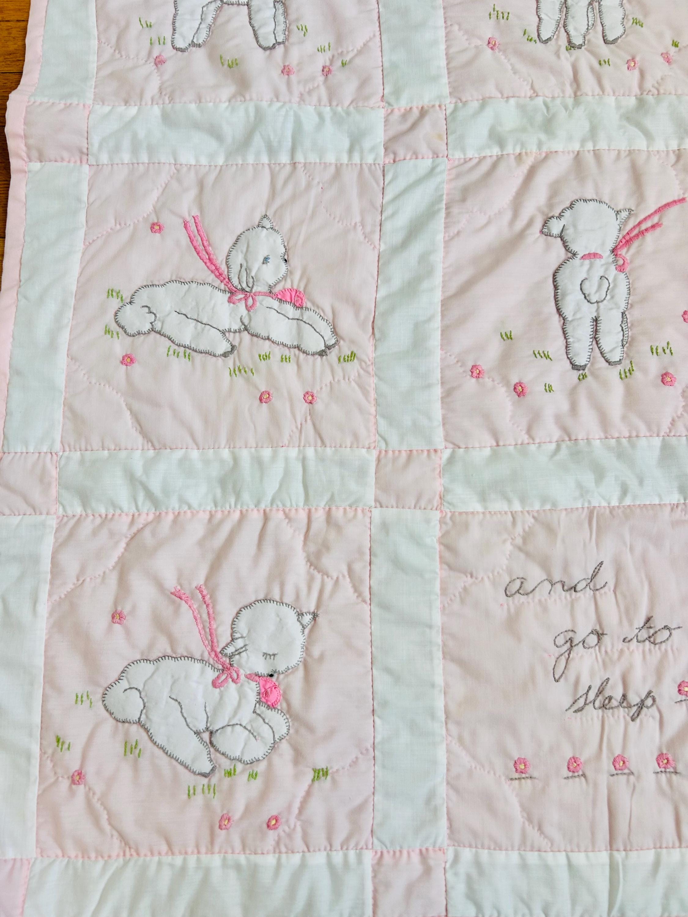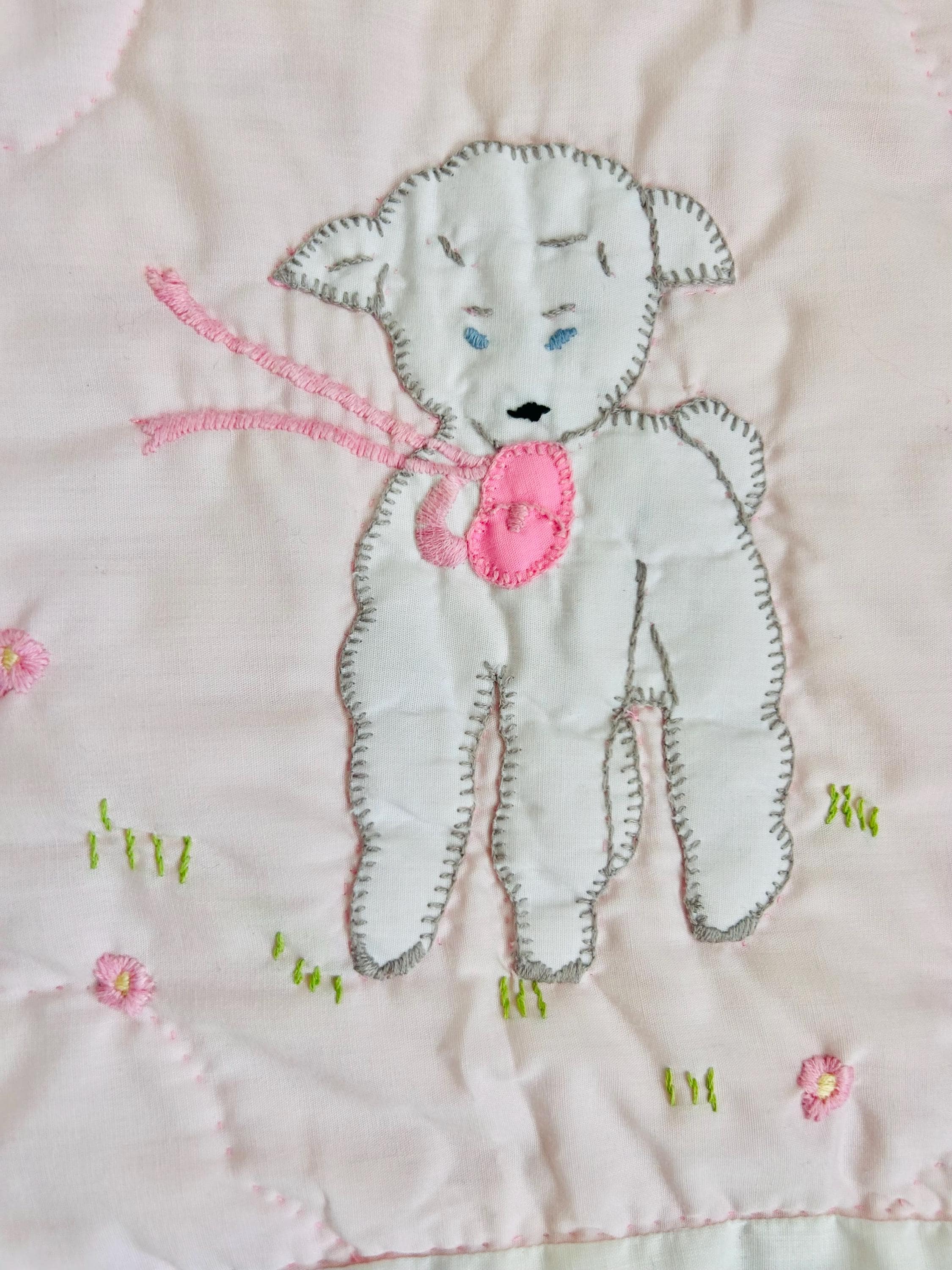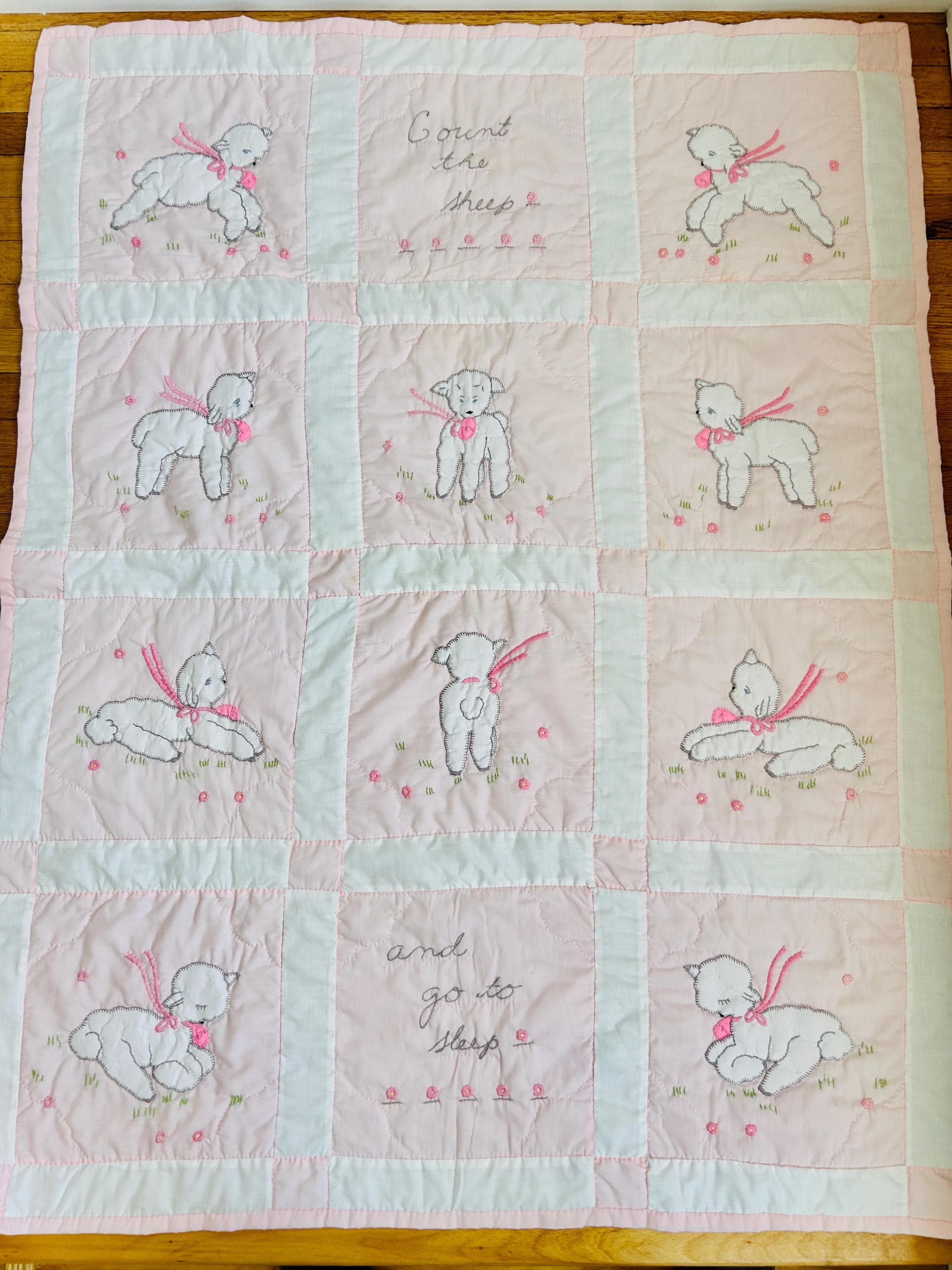 Details: • Size: 37” x 41” • Date: Circa 1950s • Materials: Cotton fabrics with cotton batting • Construction: Hand appliqué, hand embroidery, and hand quilting • Design: Lamb / nursery rhyme theme (“Count the sheep and go to sleep”) • Colors: Soft pink, pale mint green, white • Quilting: Light hand quilted outlines and motifs visible on both sides • Edge: Machine-finished binding