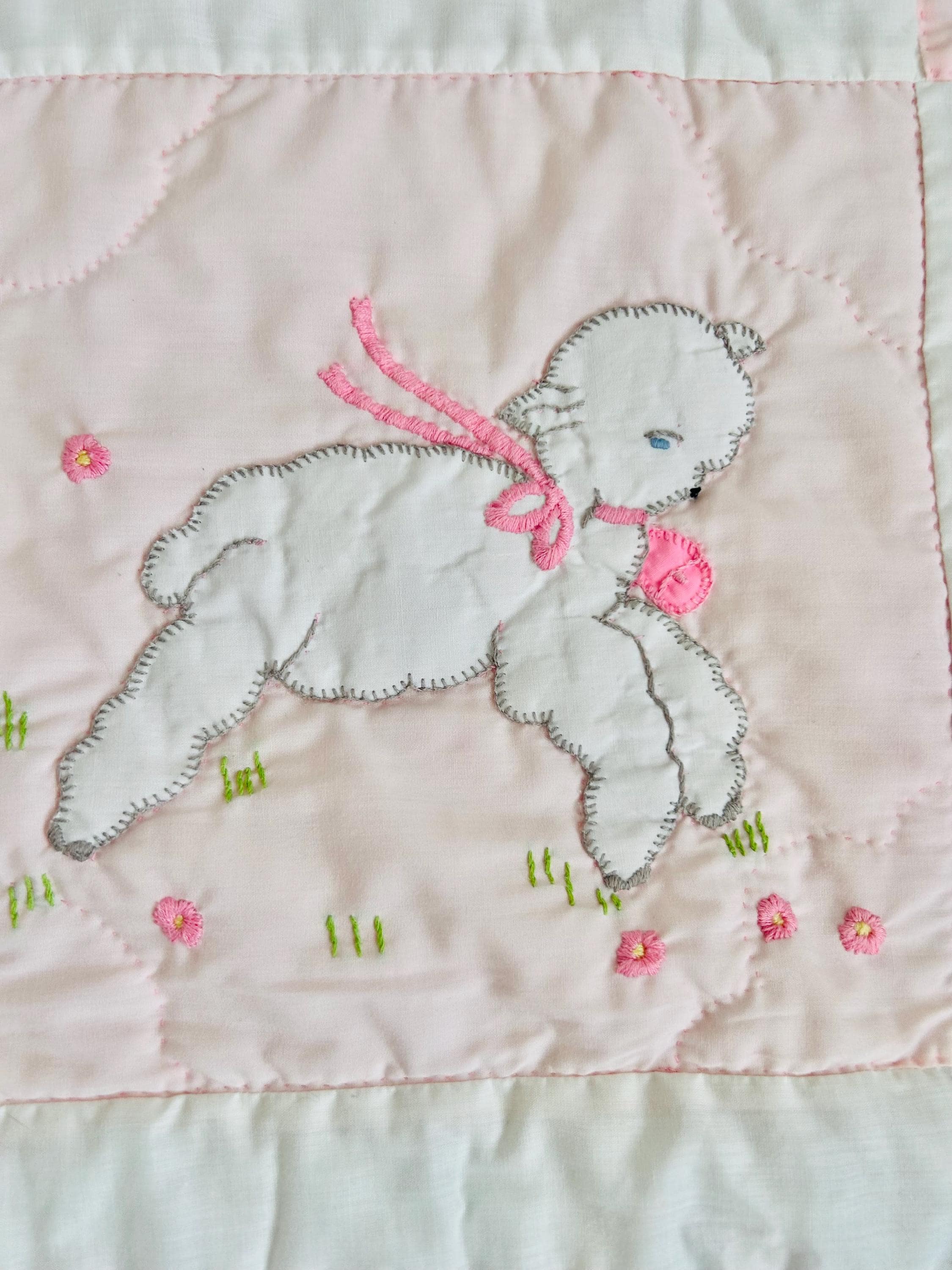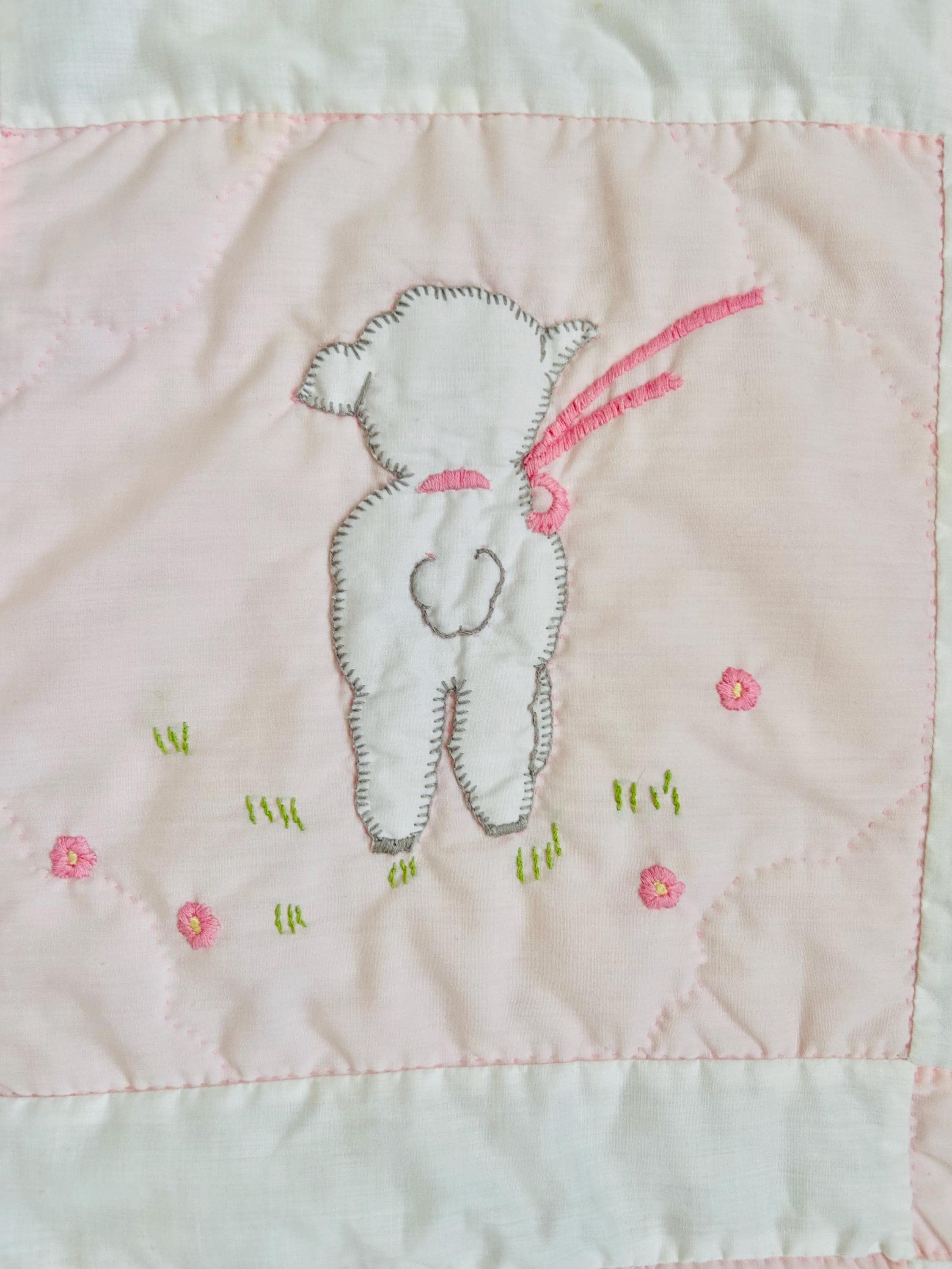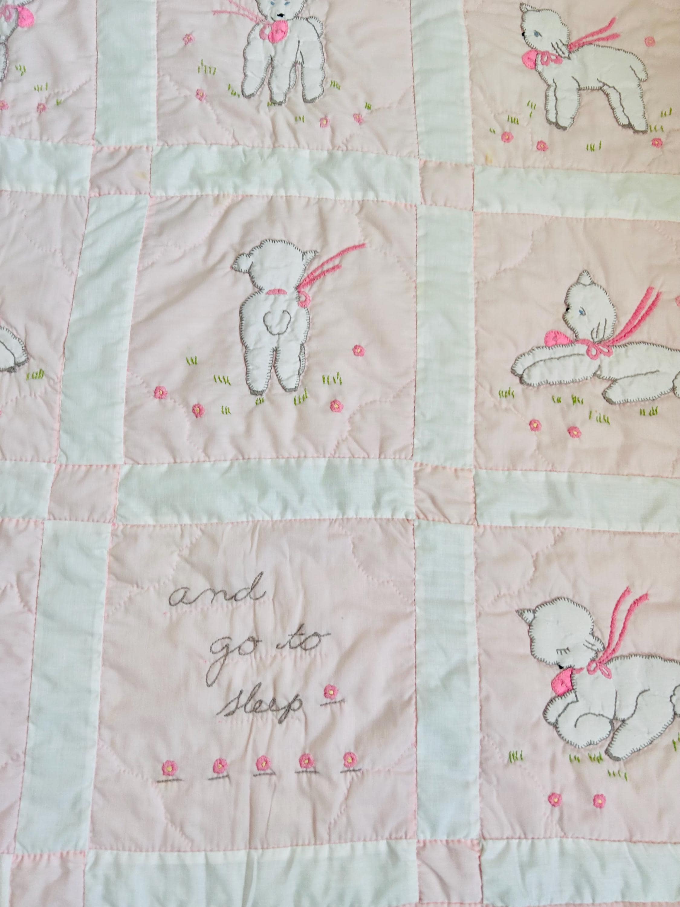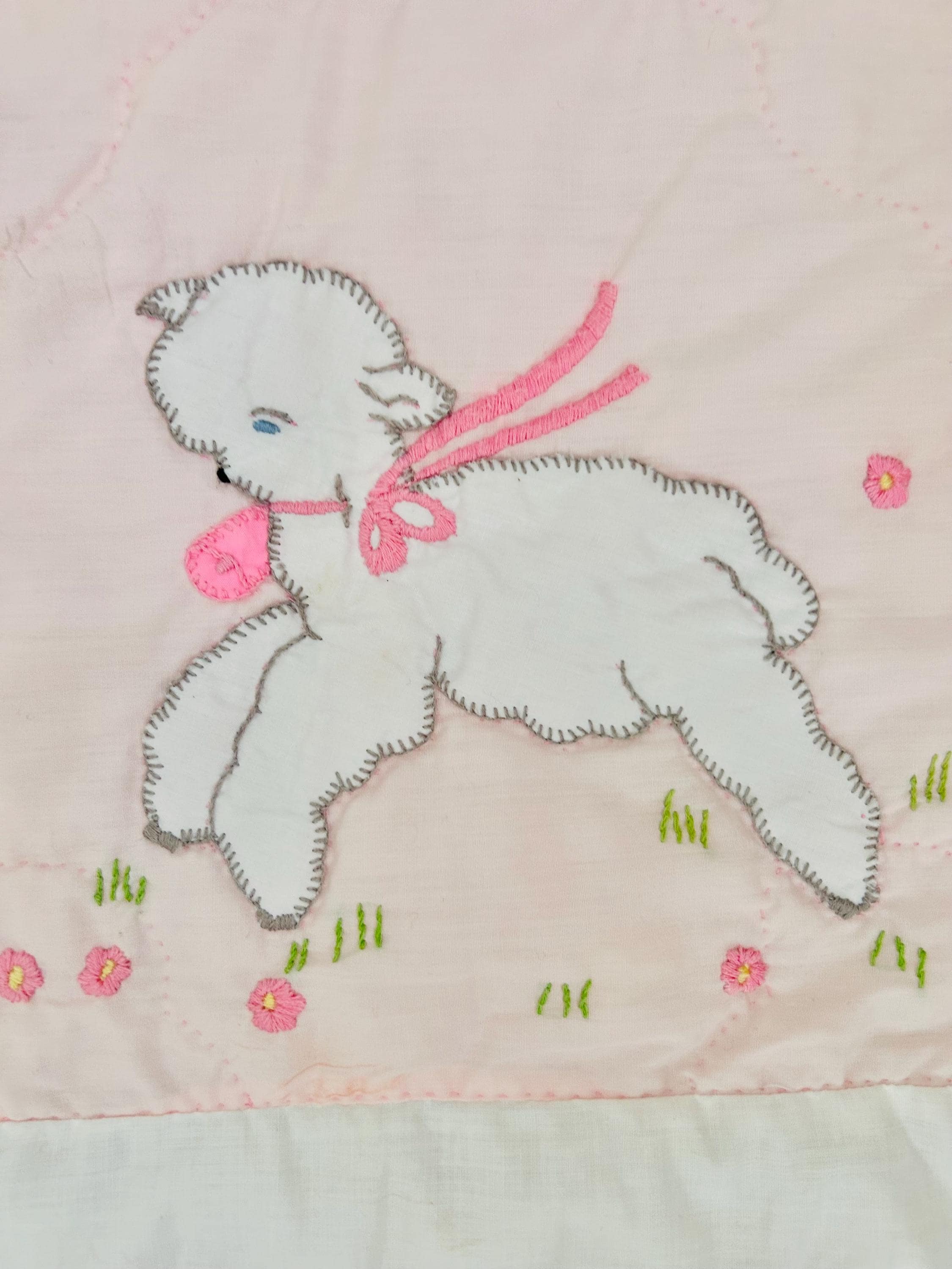 Details: • Size: 37” x 41” • Date: Circa 1950s • Materials: Cotton fabrics with cotton batting • Construction: Hand appliqué, hand embroidery, and hand quilting • Design: Lamb / nursery rhyme theme (“Count the sheep and go to sleep”) • Colors: Soft pink, pale mint green, white • Quilting: Light hand quilted outlines and motifs visible on both sides • Edge: Machine-finished binding