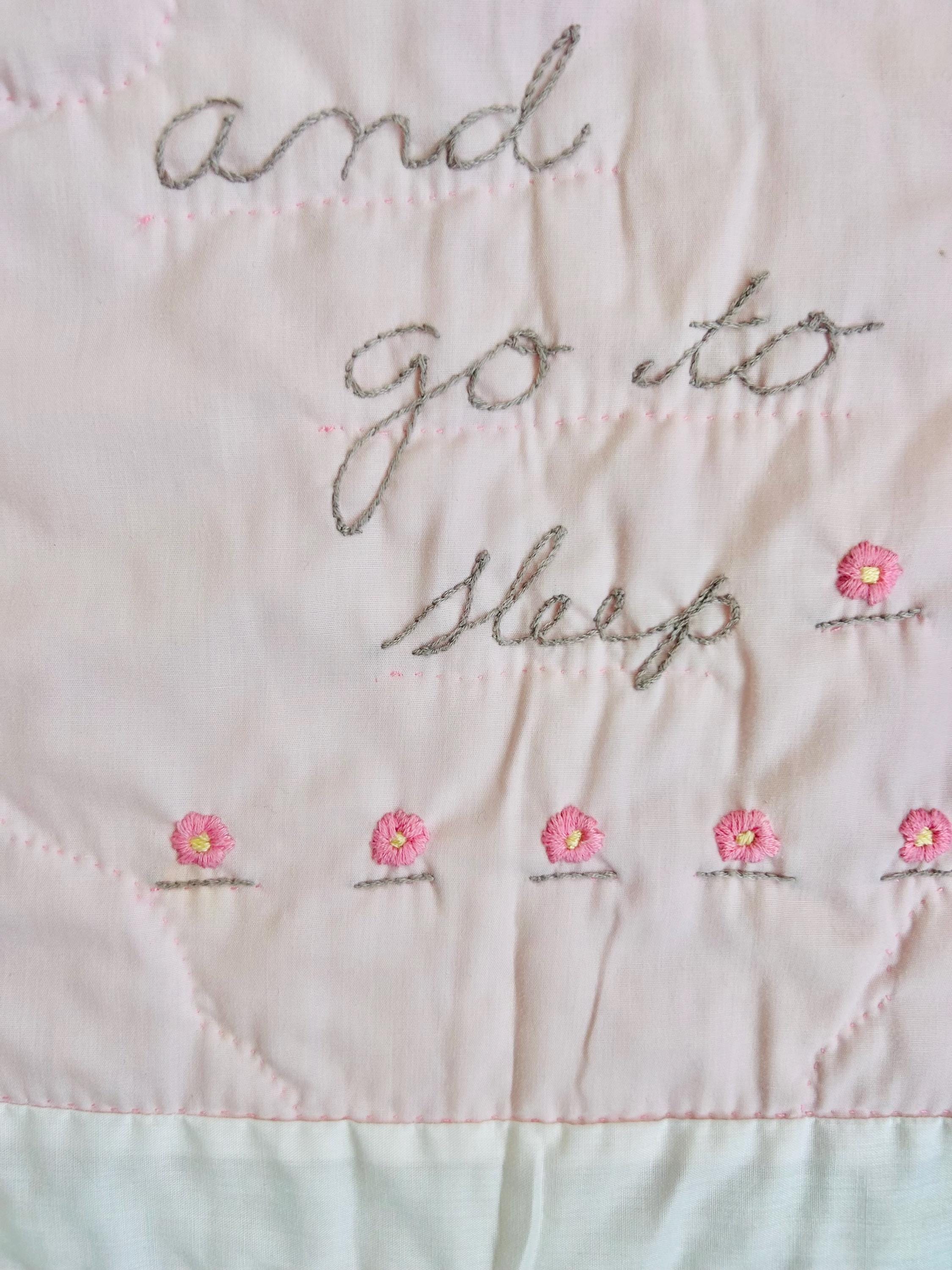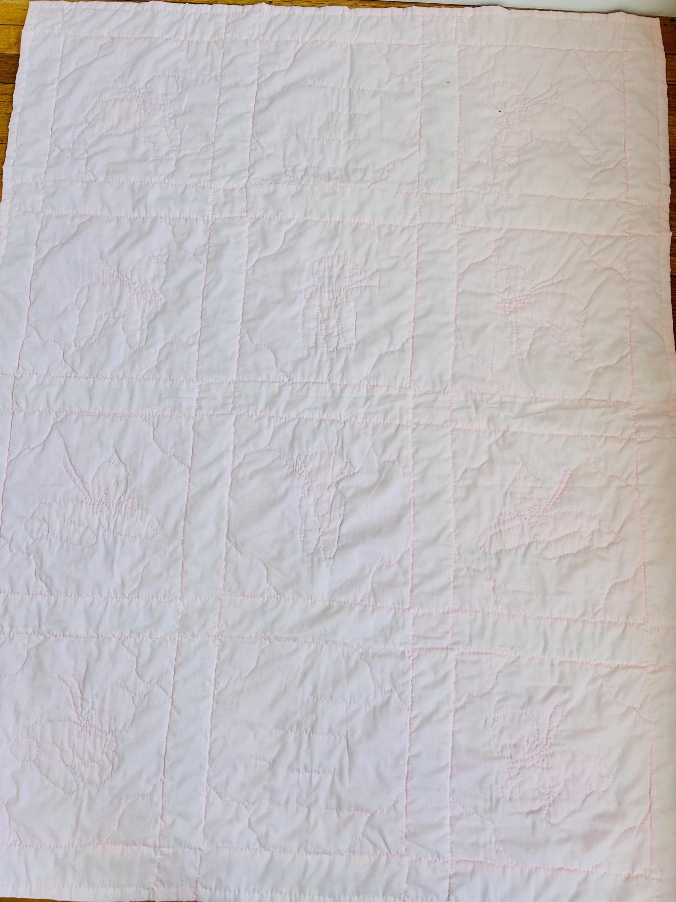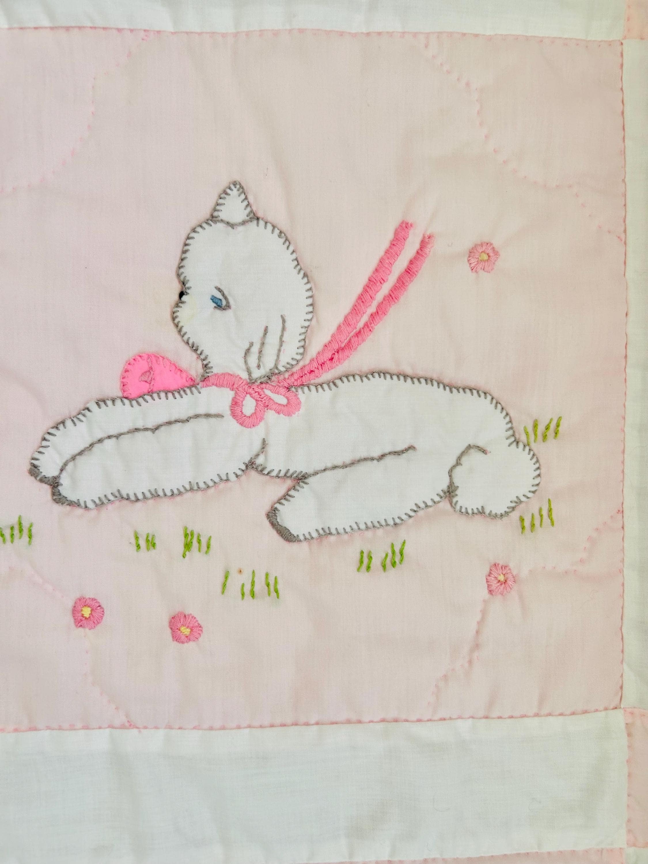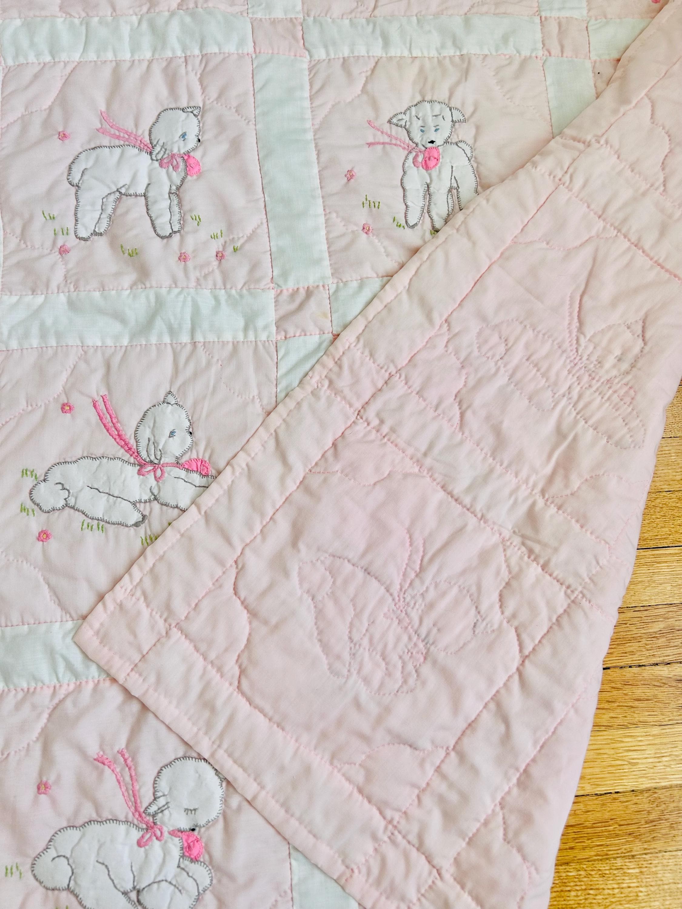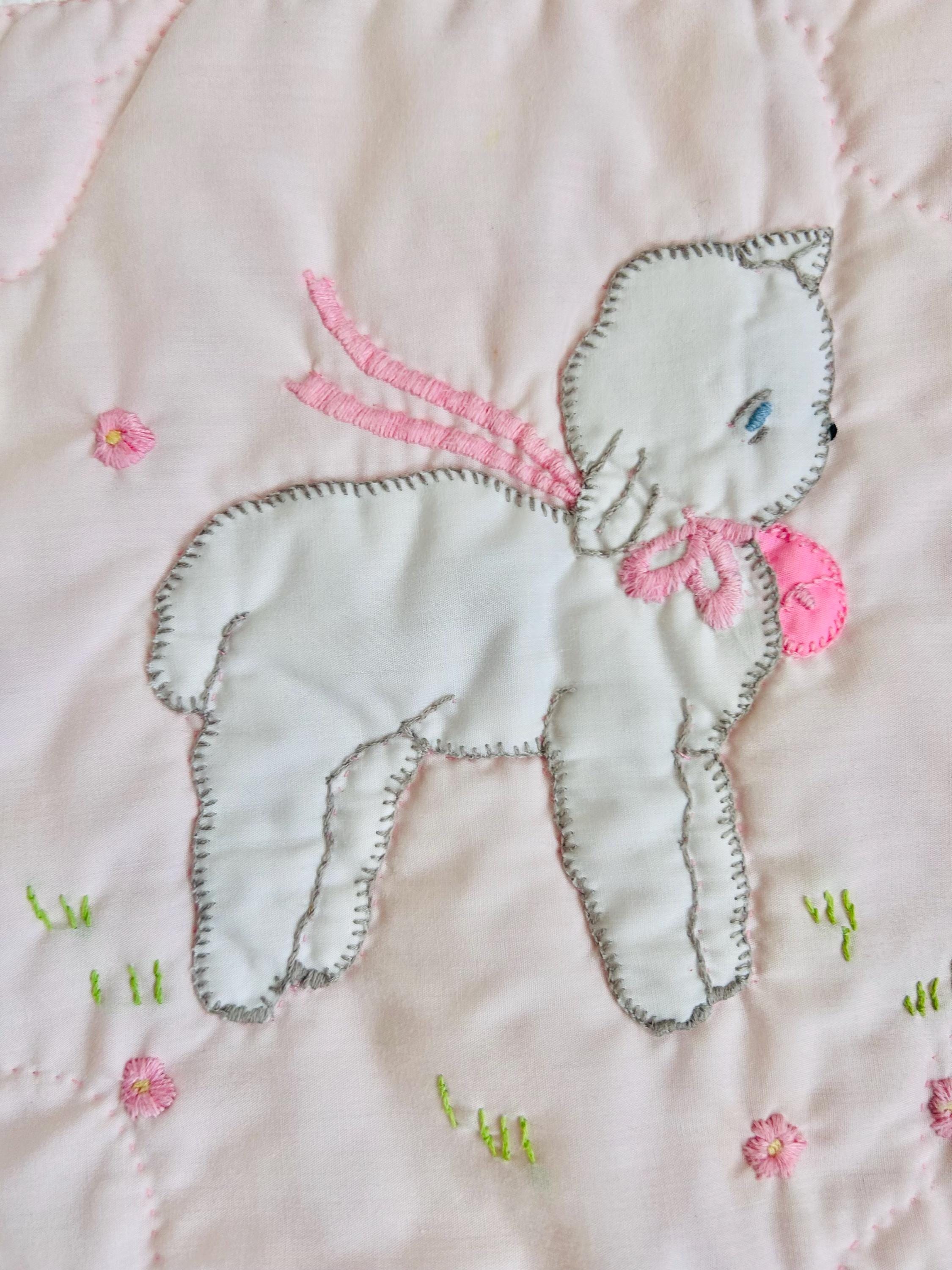 Details: • Size: 37” x 41” • Date: Circa 1950s • Materials: Cotton fabrics with cotton batting • Construction: Hand appliqué, hand embroidery, and hand quilting • Design: Lamb / nursery rhyme theme (“Count the sheep and go to sleep”) • Colors: Soft pink, pale mint green, white • Quilting: Light hand quilted outlines and motifs visible on both sides • Edge: Machine-finished binding