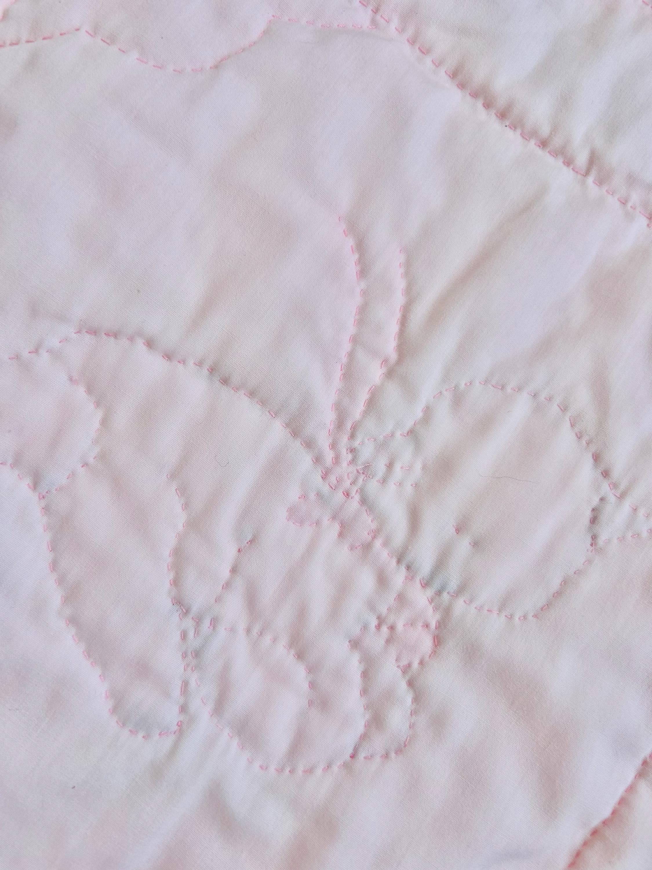 The back is pink as is the binding that has been hand-stitched to both sides. The batting is lightweight.