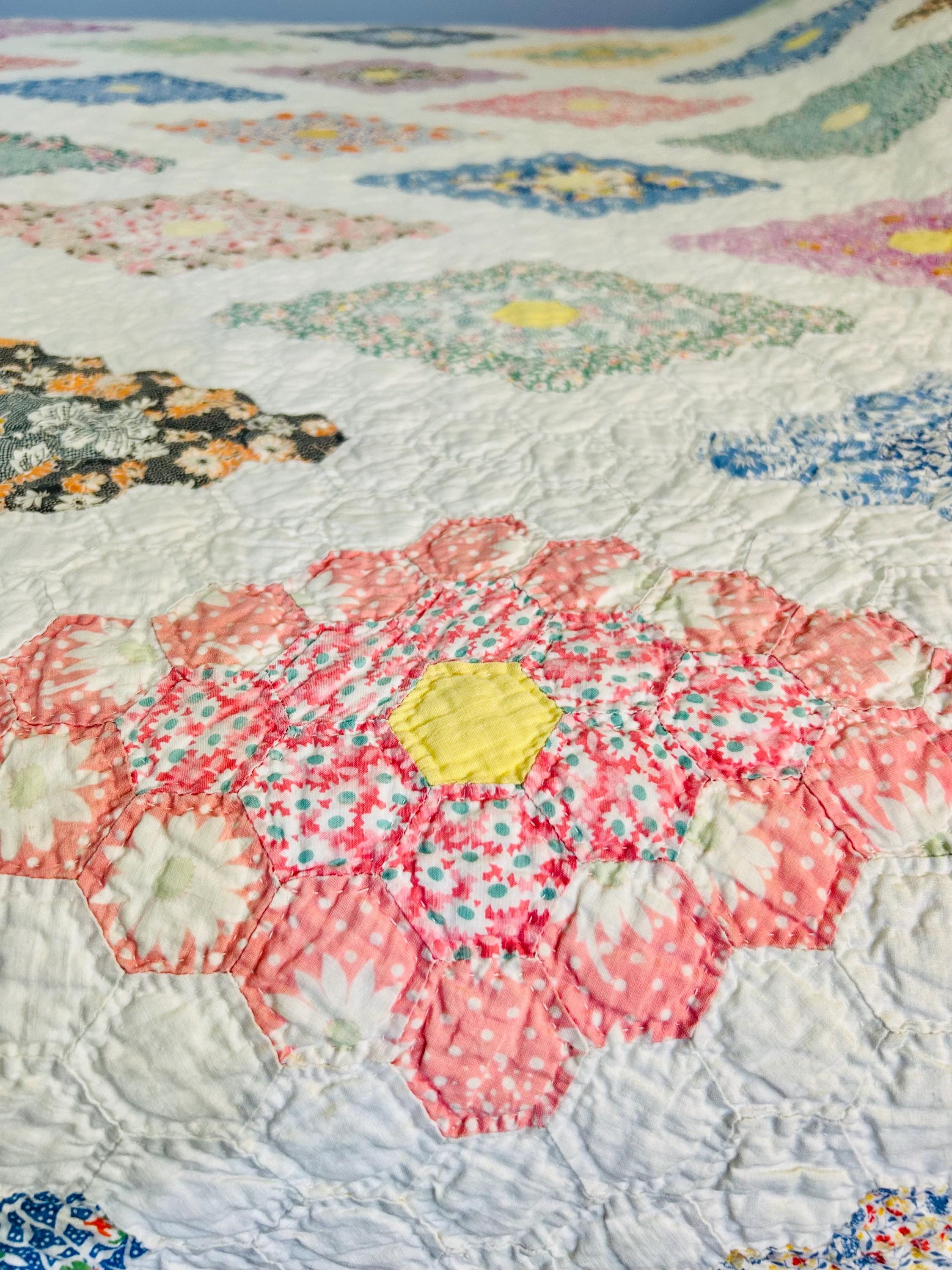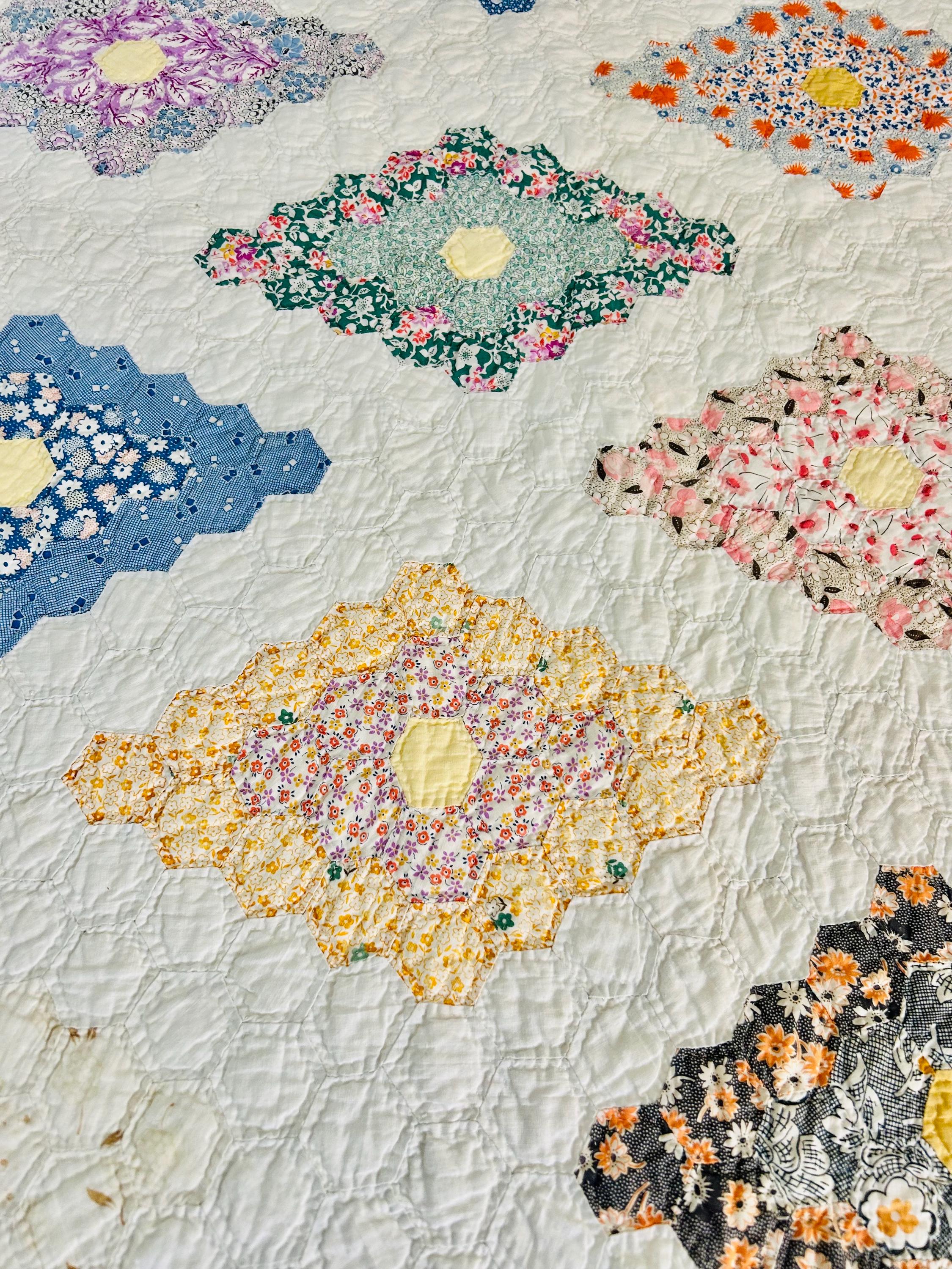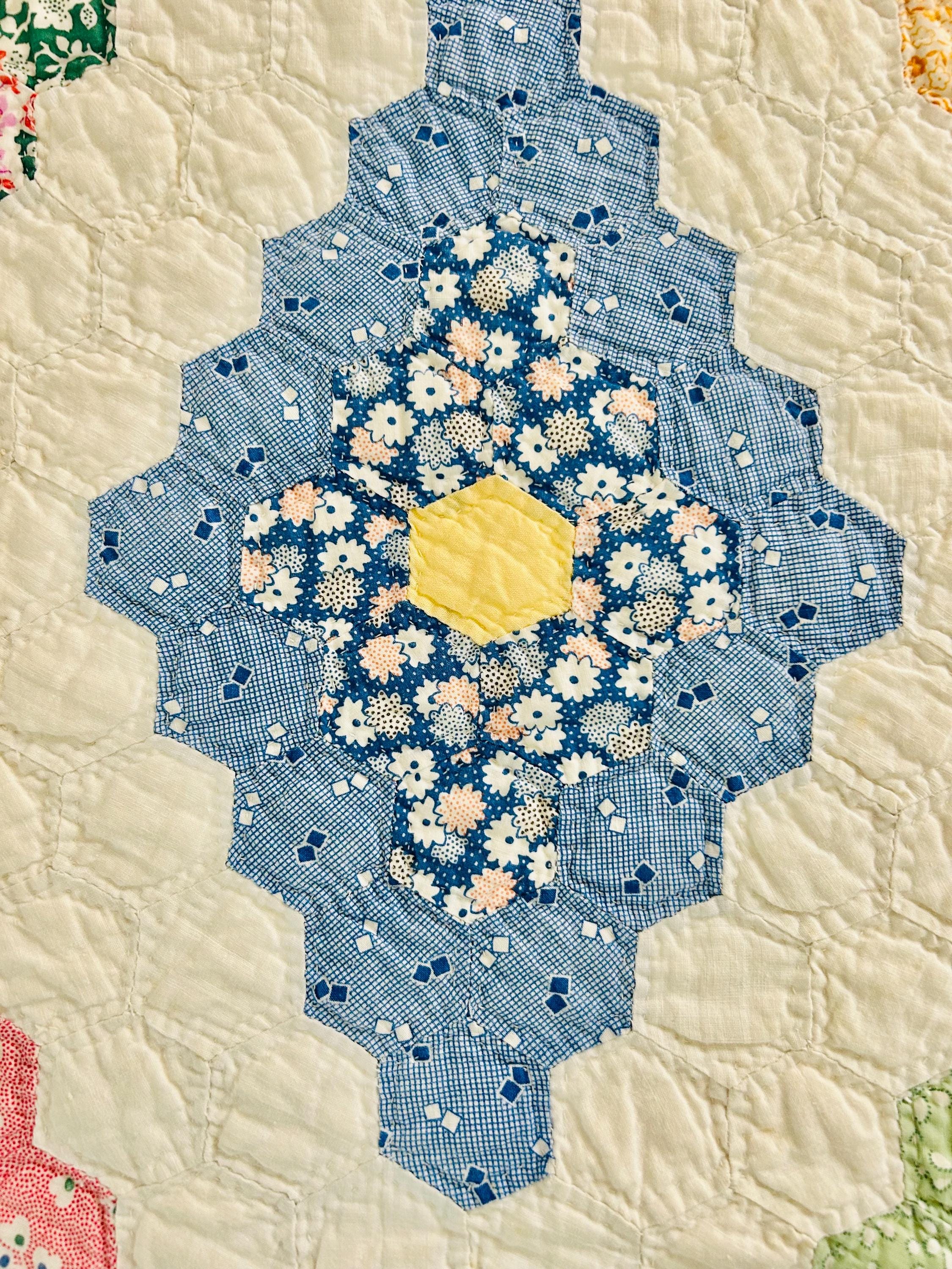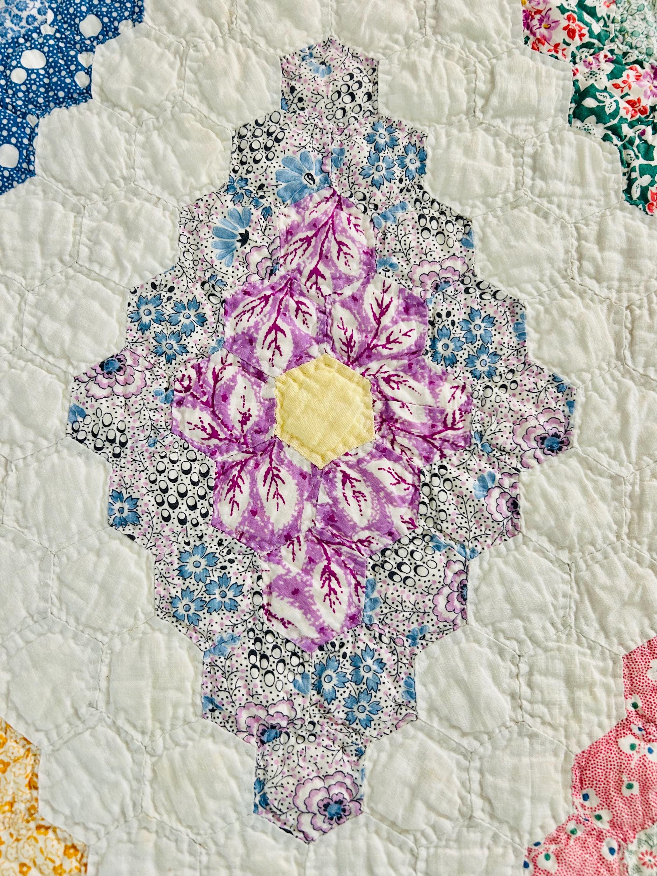 A beautiful and authentic 1920s-1930s Martha Washington’s Flower Garden quilt, hand pieced and hand quilted in a diamond rosette made of tiny (1-inch) hexagons.