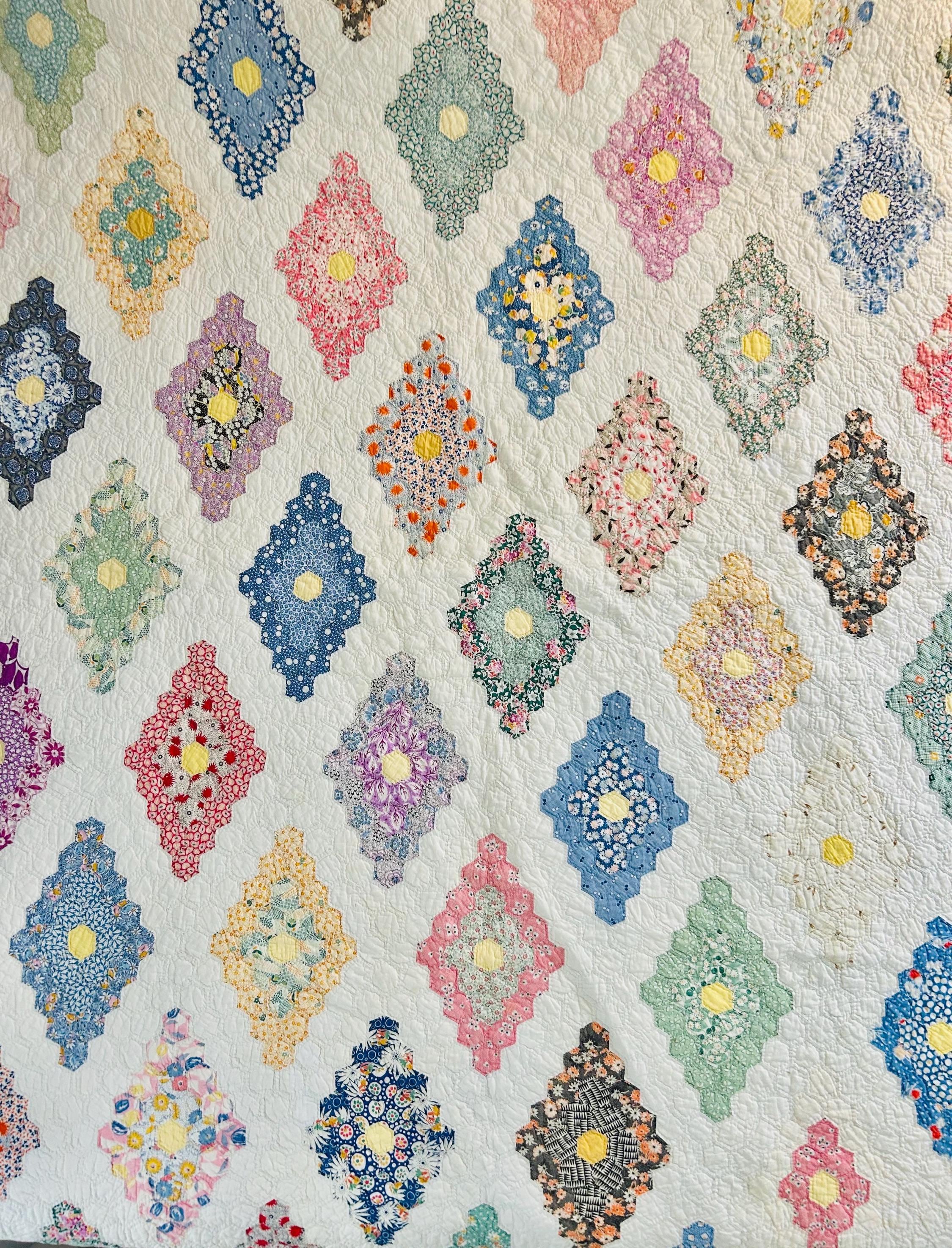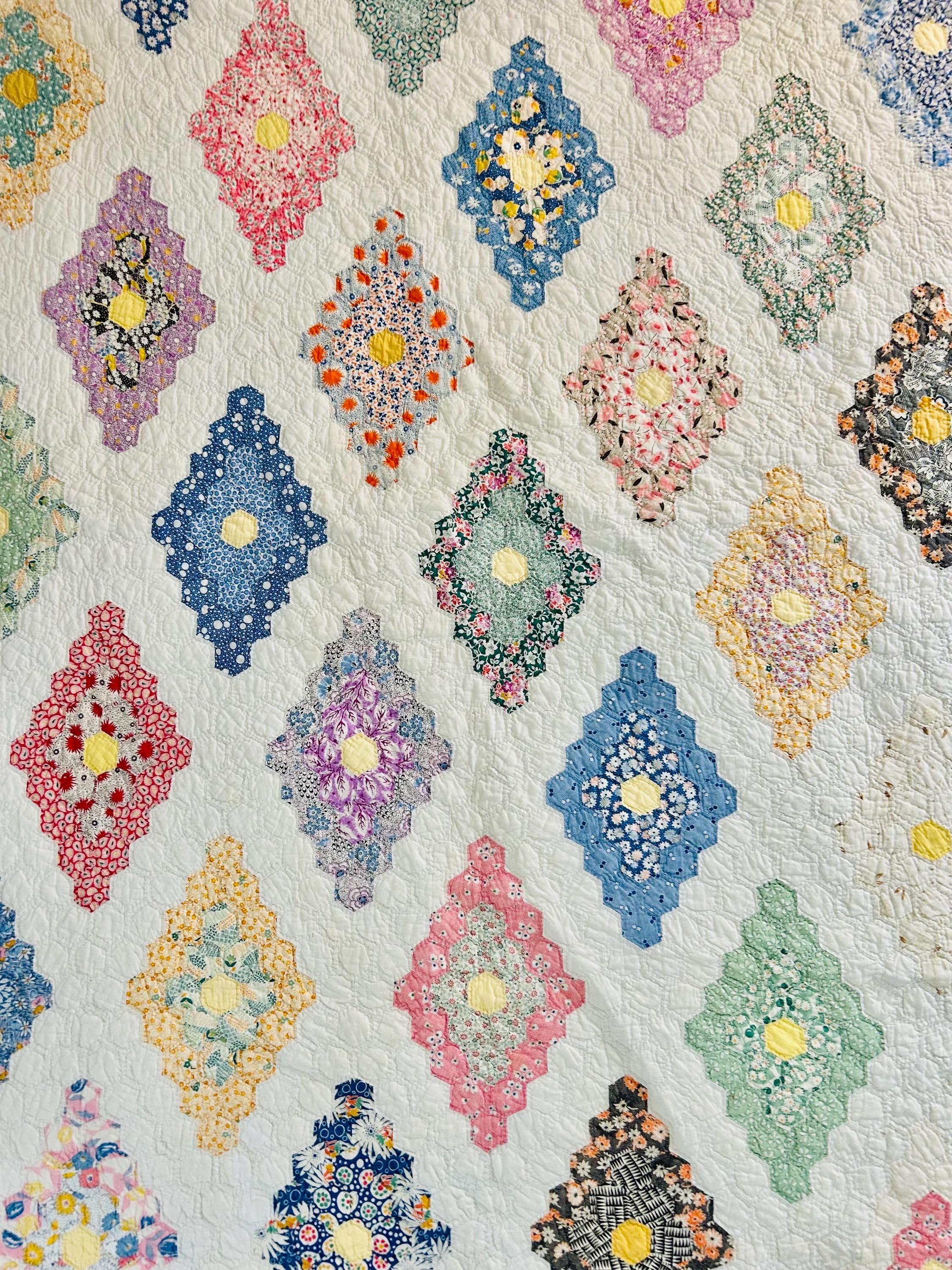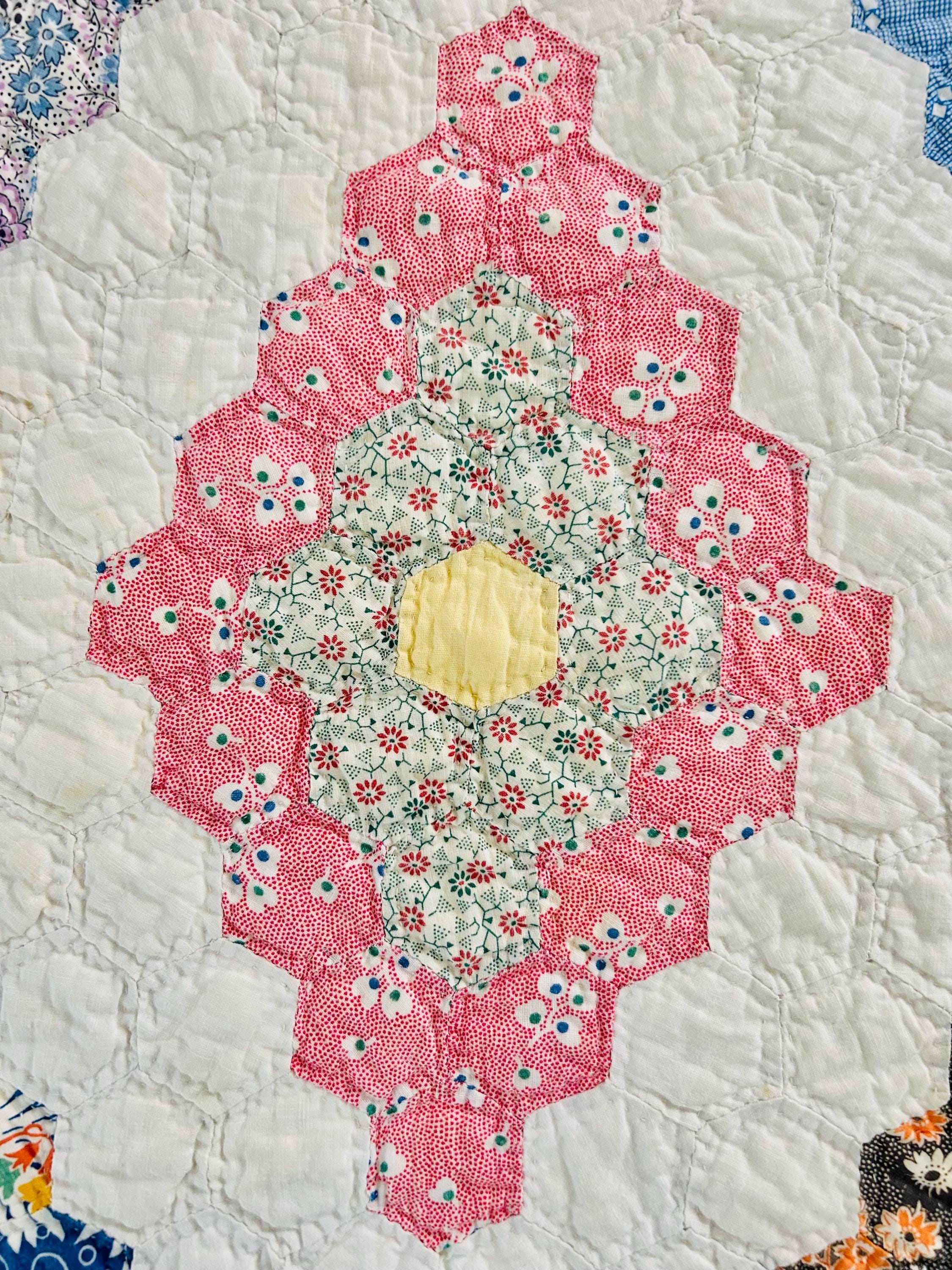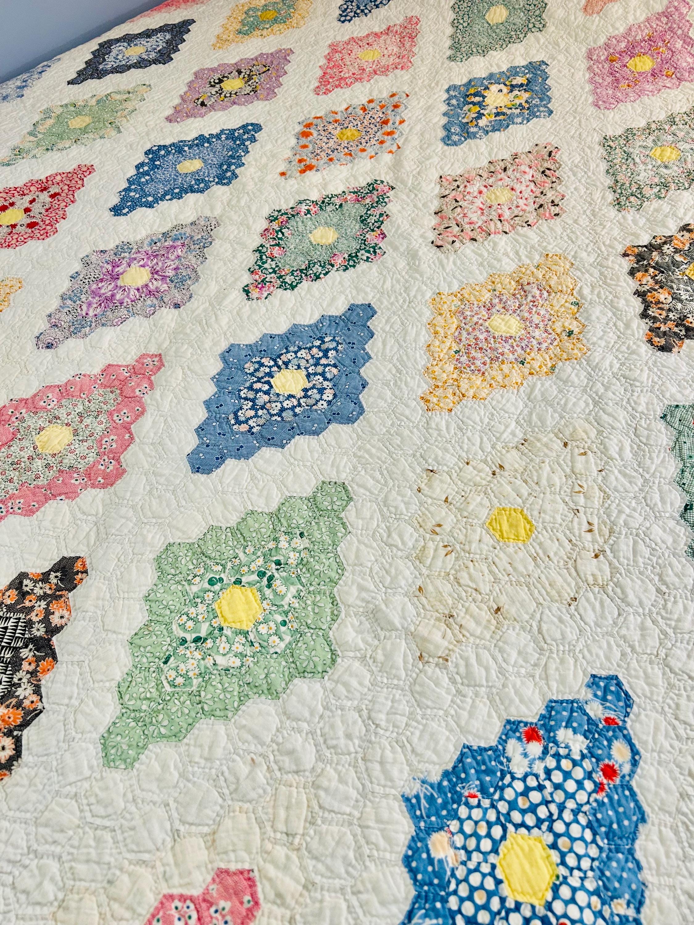 A beautiful and authentic 1920s-1930s Martha Washington’s Flower Garden quilt, hand pieced and hand quilted in a diamond rosette made of tiny (1-inch) hexagons.