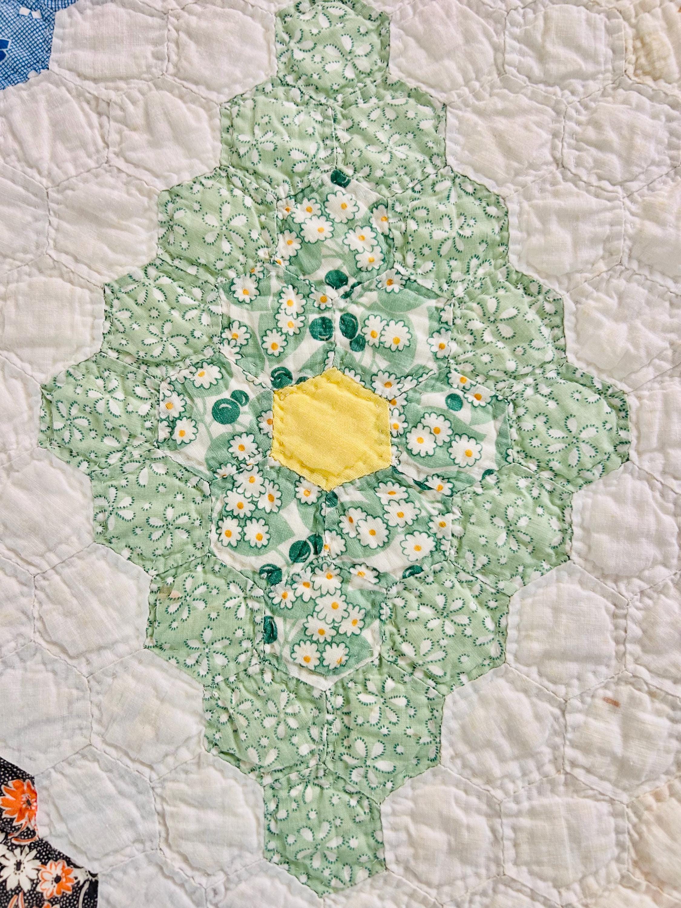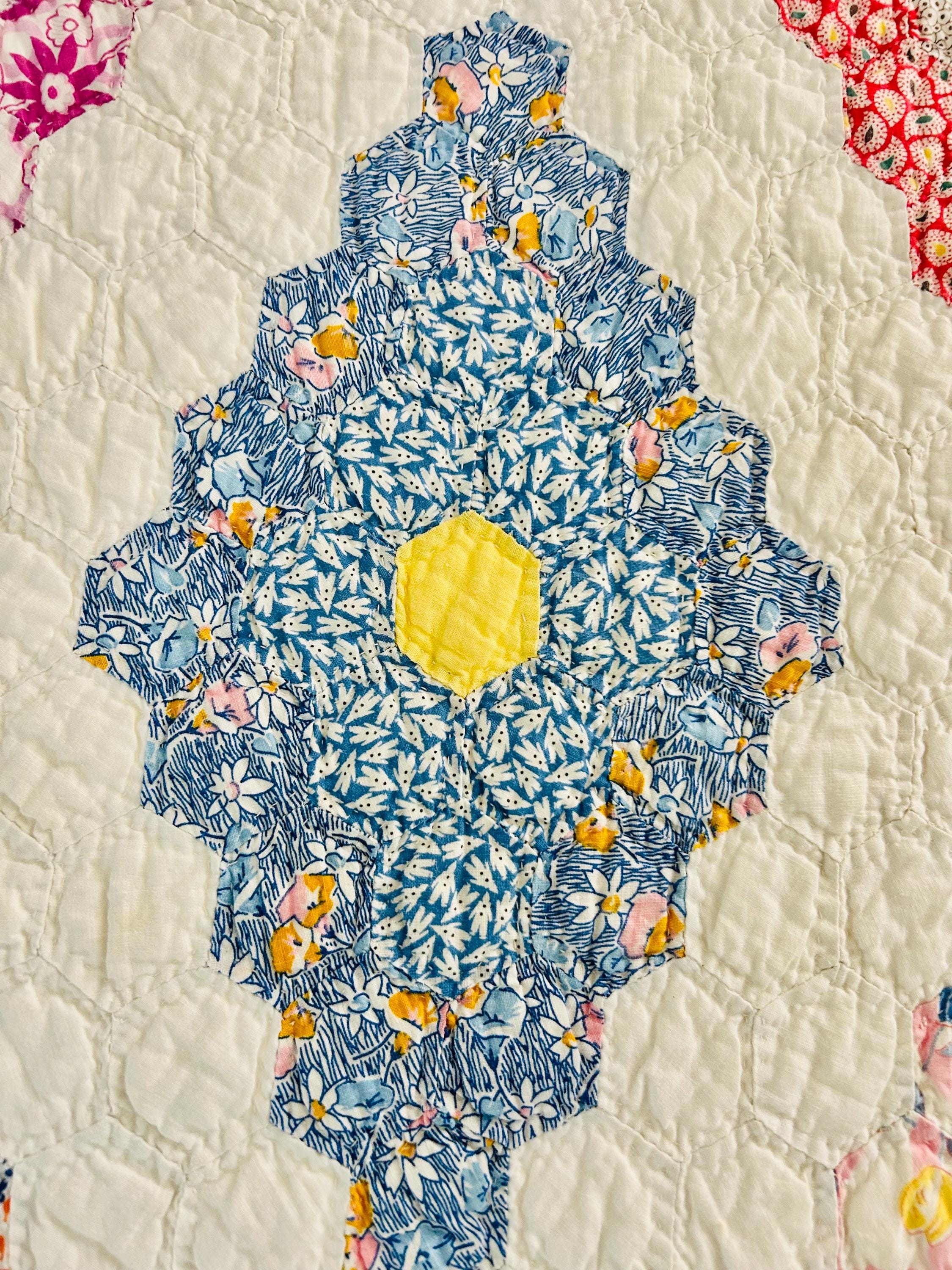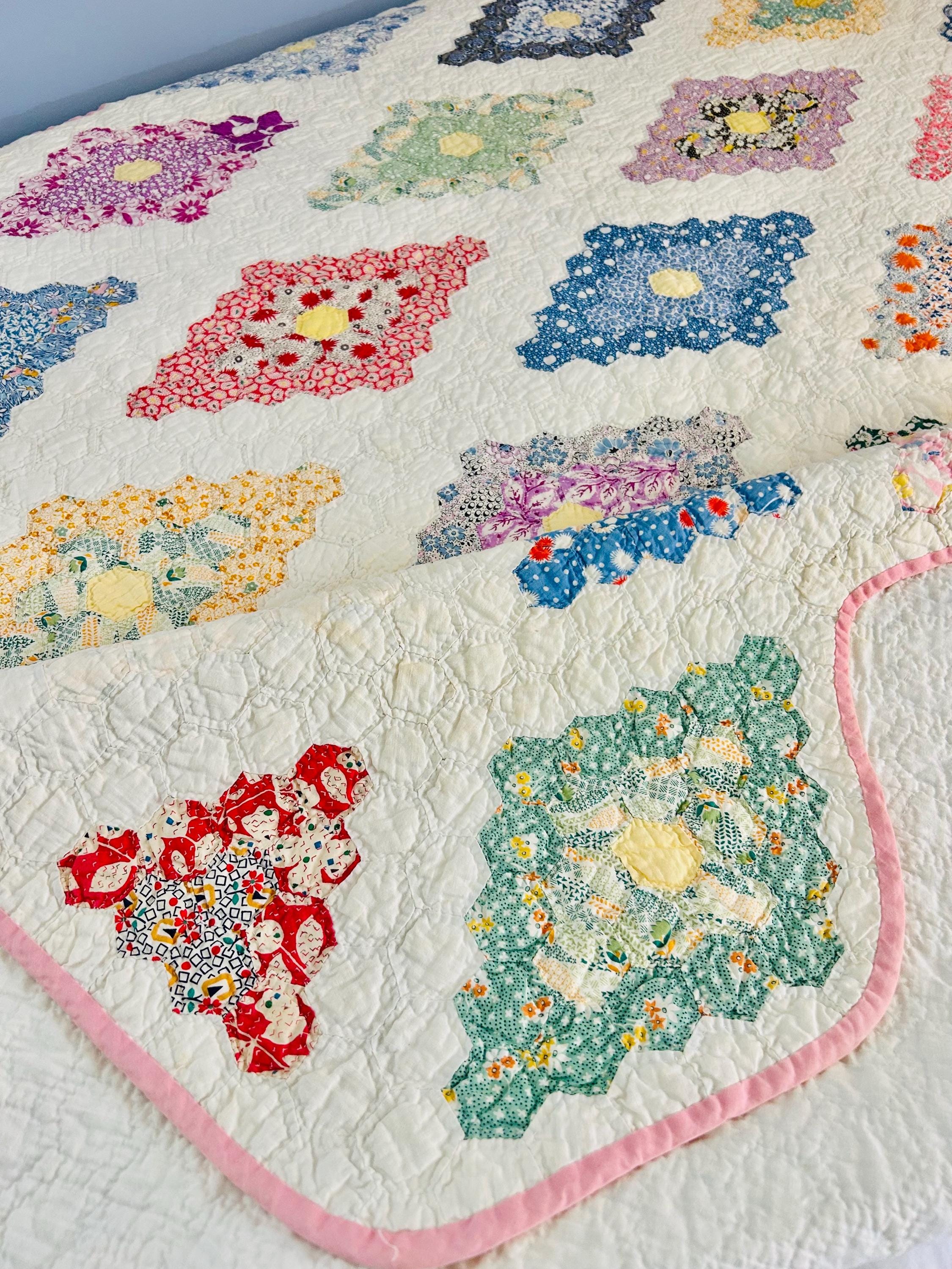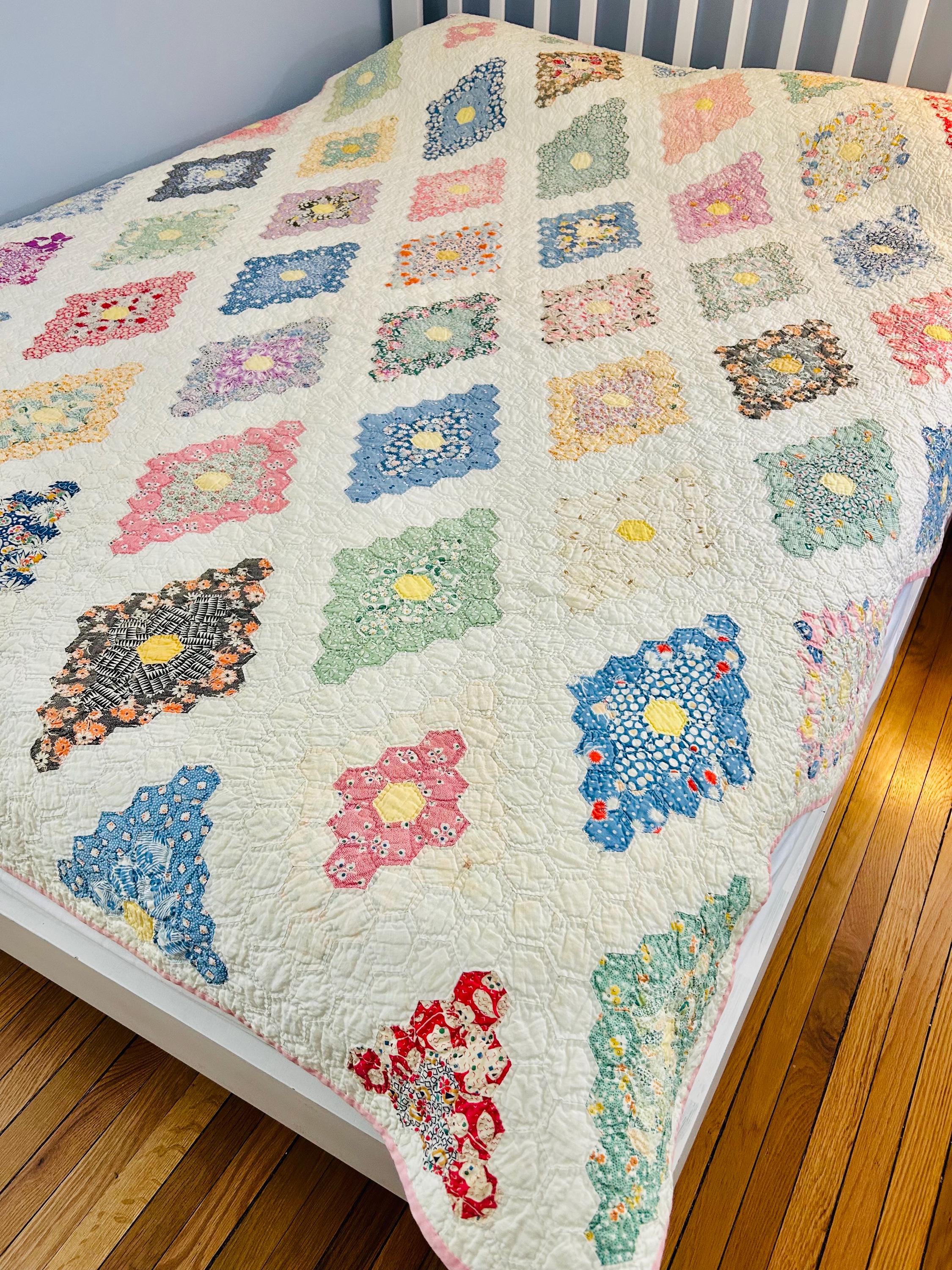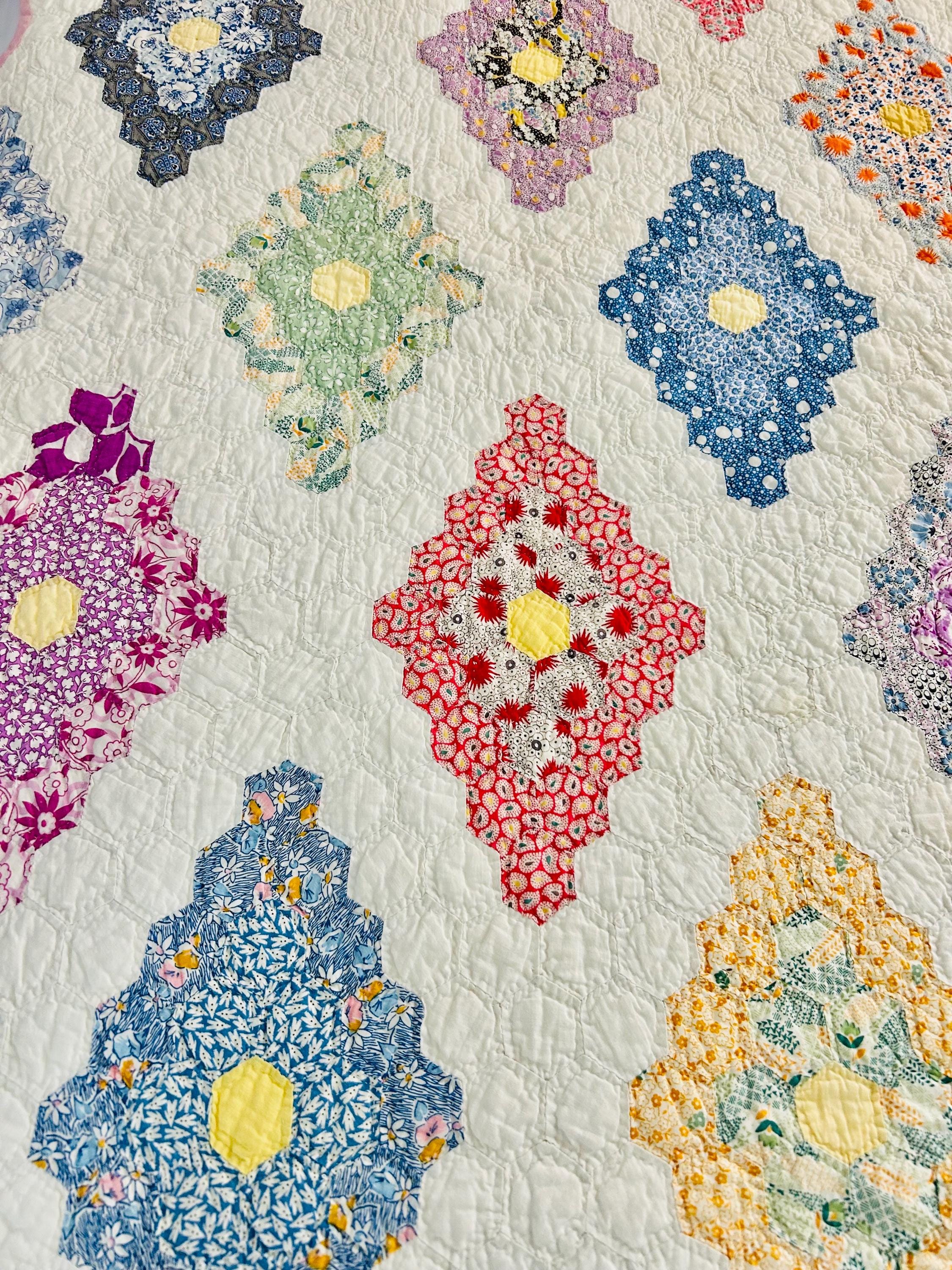 A beautiful and authentic 1920s-1930s Martha Washington’s Flower Garden quilt, hand pieced and hand quilted in a diamond rosette made of tiny (1-inch) hexagons.