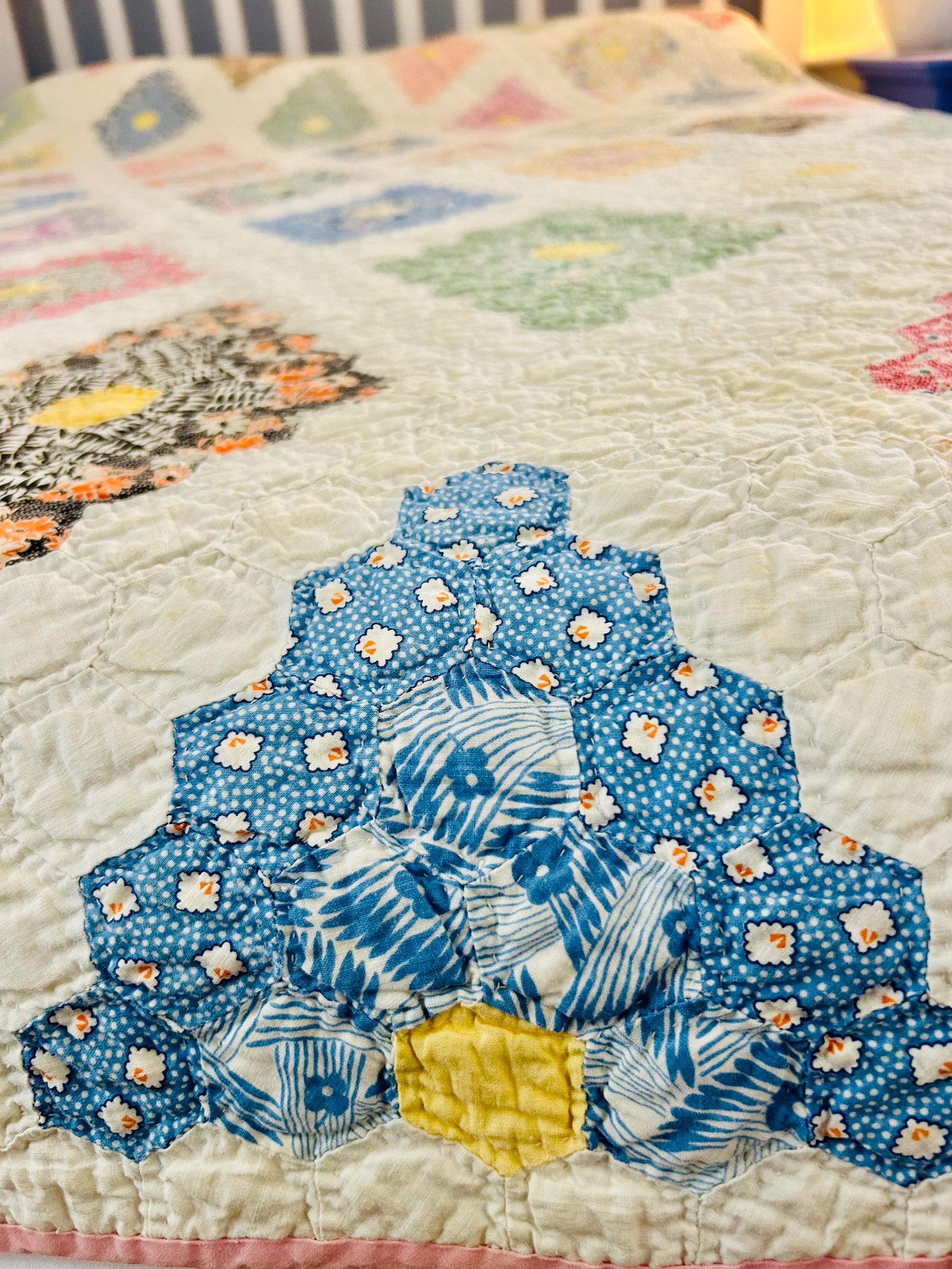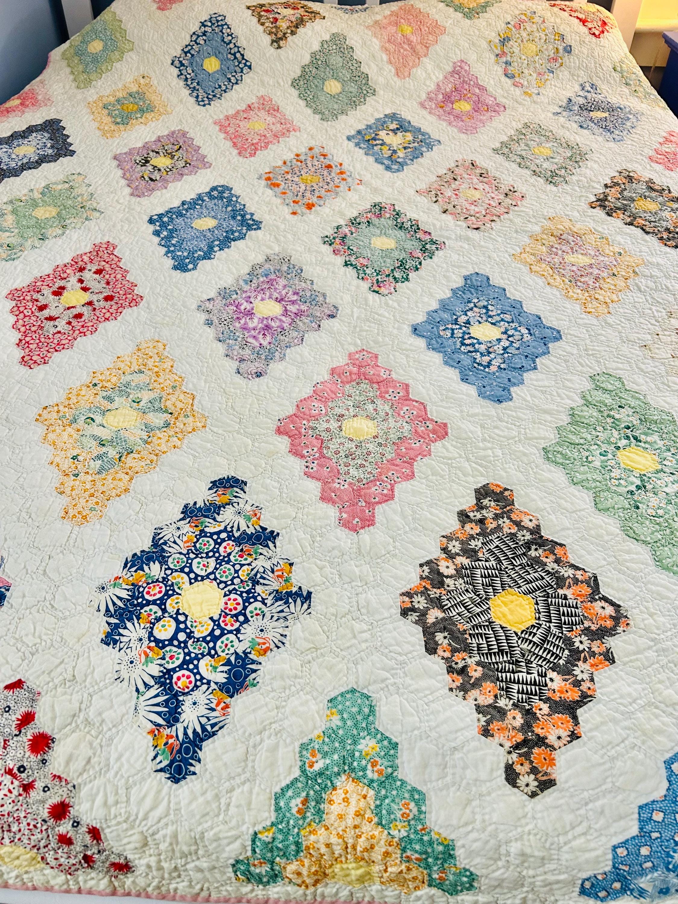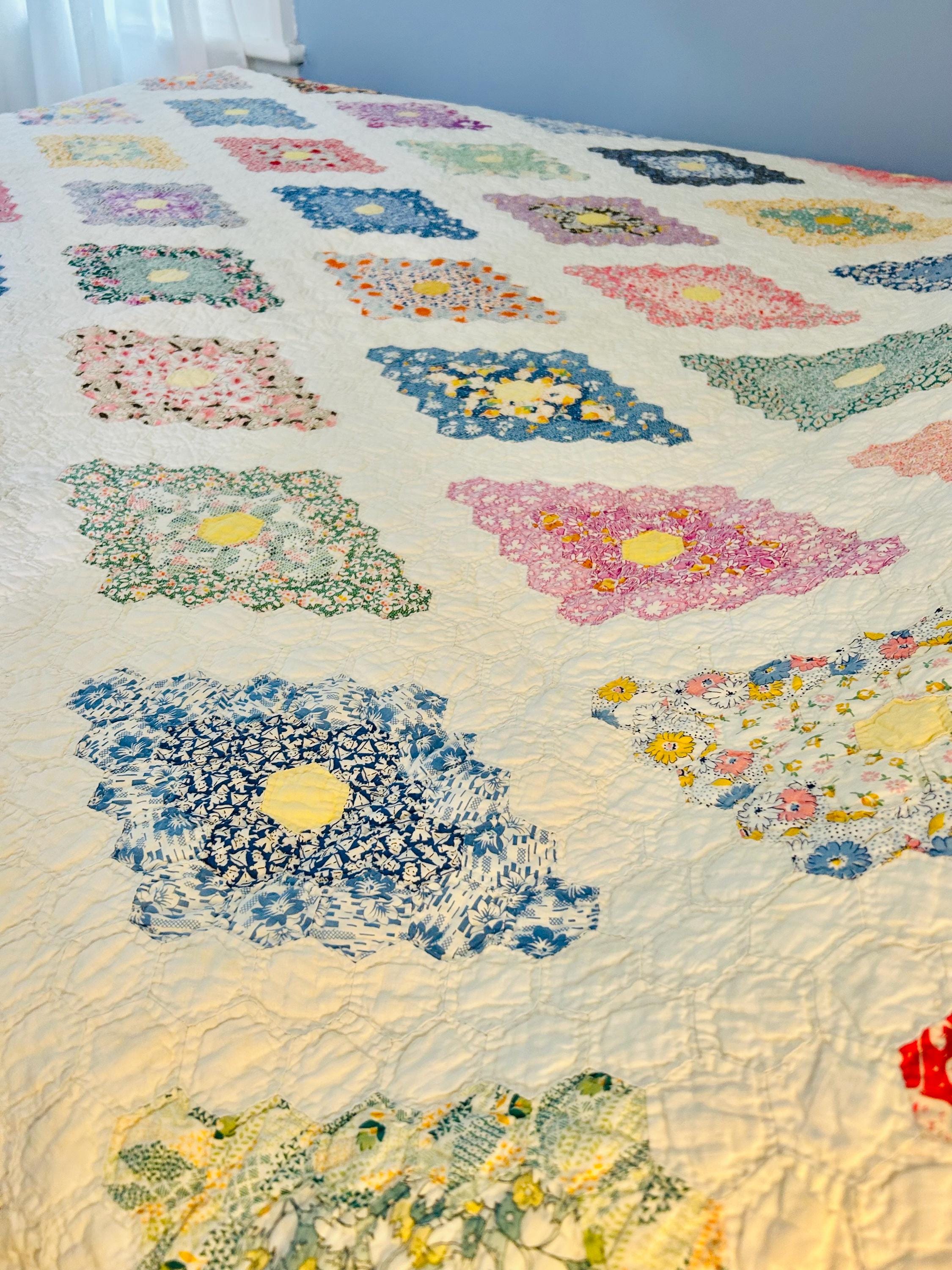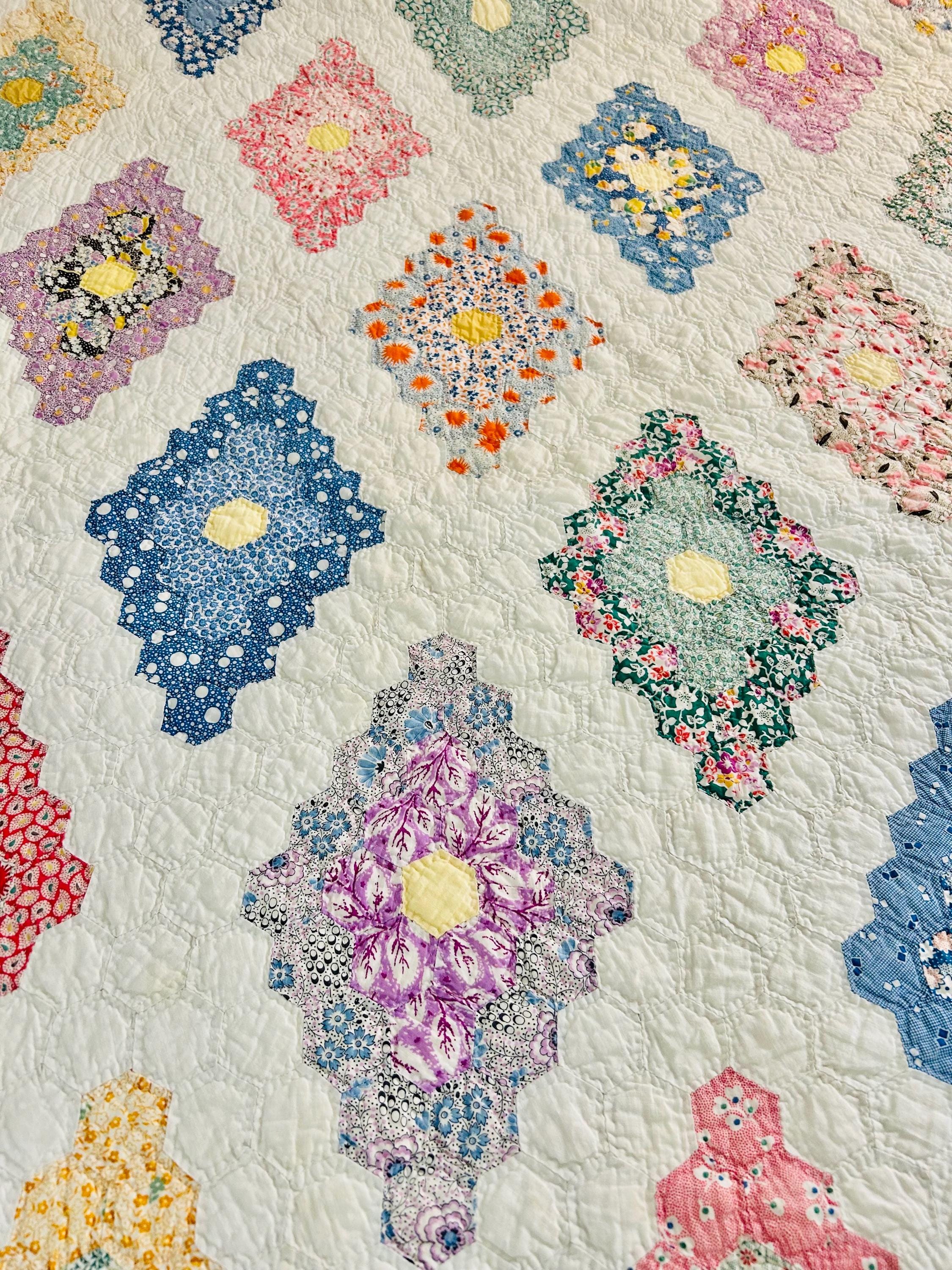 A beautiful and authentic 1920s-1930s Martha Washington’s Flower Garden quilt, hand pieced and hand quilted in a diamond rosette made of tiny (1-inch) hexagons.