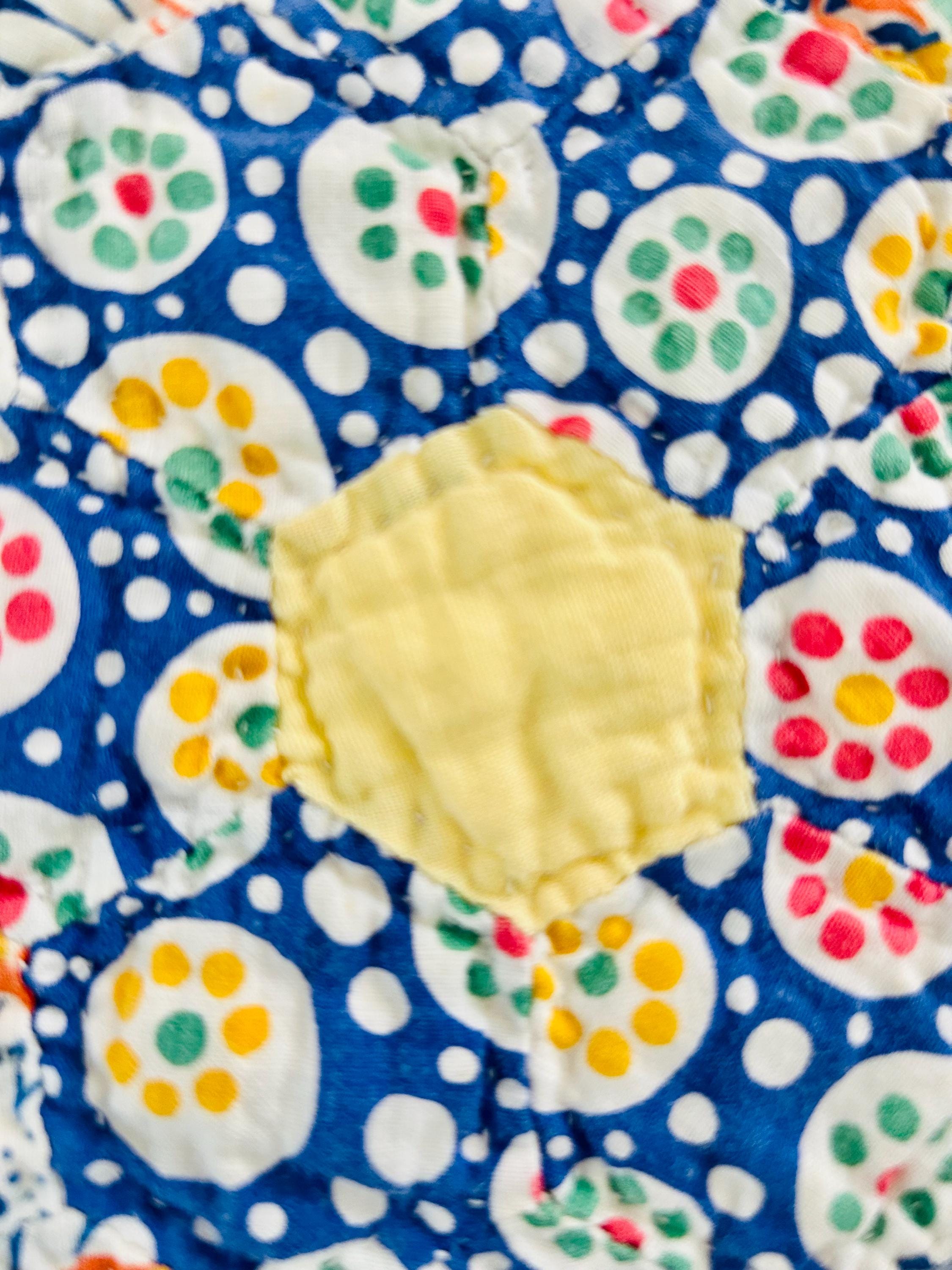 Details: • Pattern: Martha Washington’s Flower Garden (hexagon rosettes) • Date: c. 1920s-1930s • Size: 69” x 82” • Materials: Cotton fabrics, cotton batting • Construction: Hand pieced and hand quilted • Colors: Pastels, feedsack prints, yellow centers, white ground • Quilting: Outlines of the hexagons • Edge: Pink binding