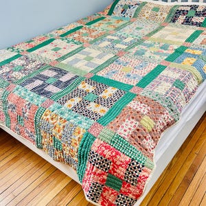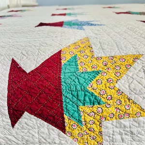 The quilt is from a smoke-free, pet-free home and is pictured on a queen-size bed.