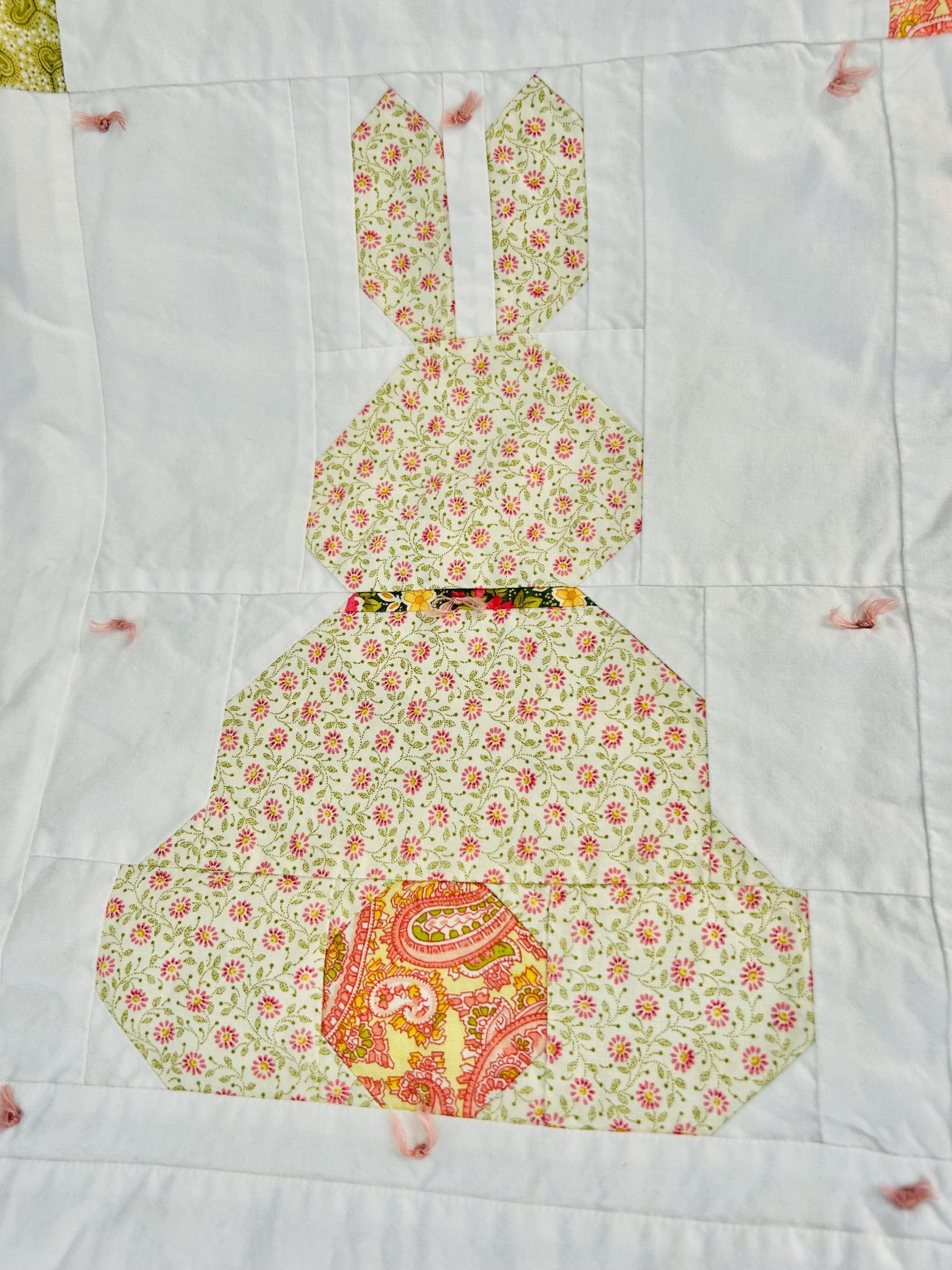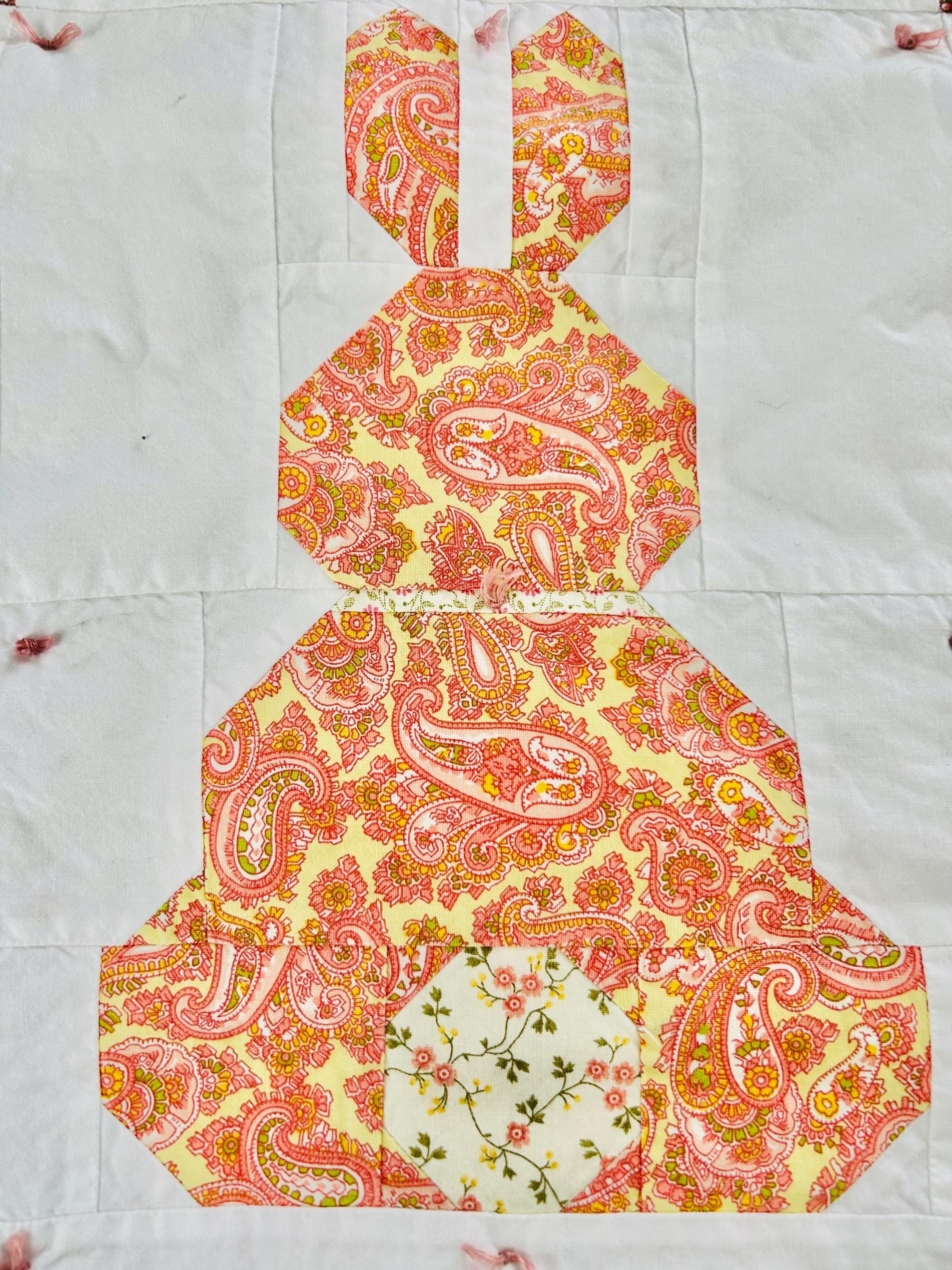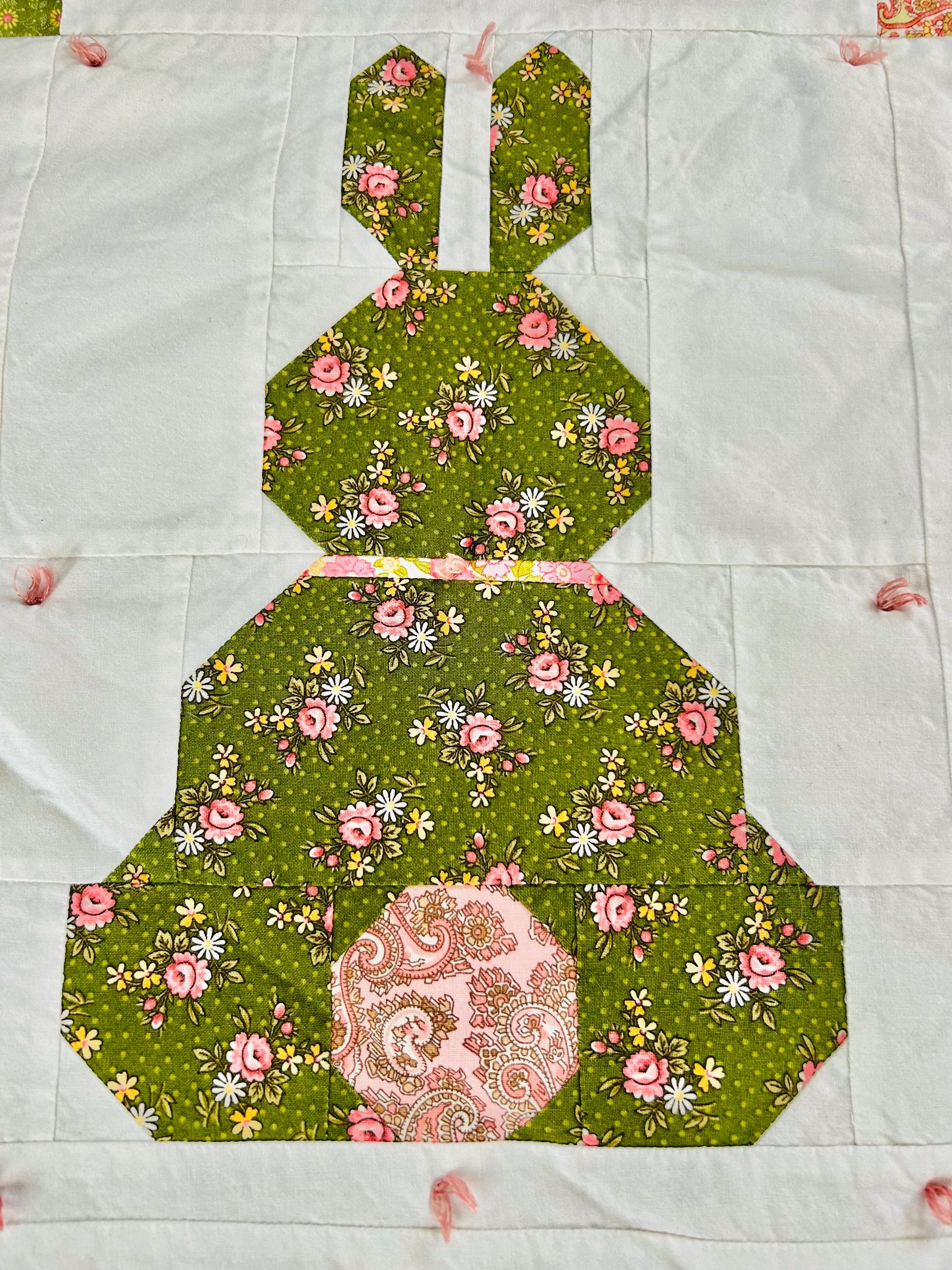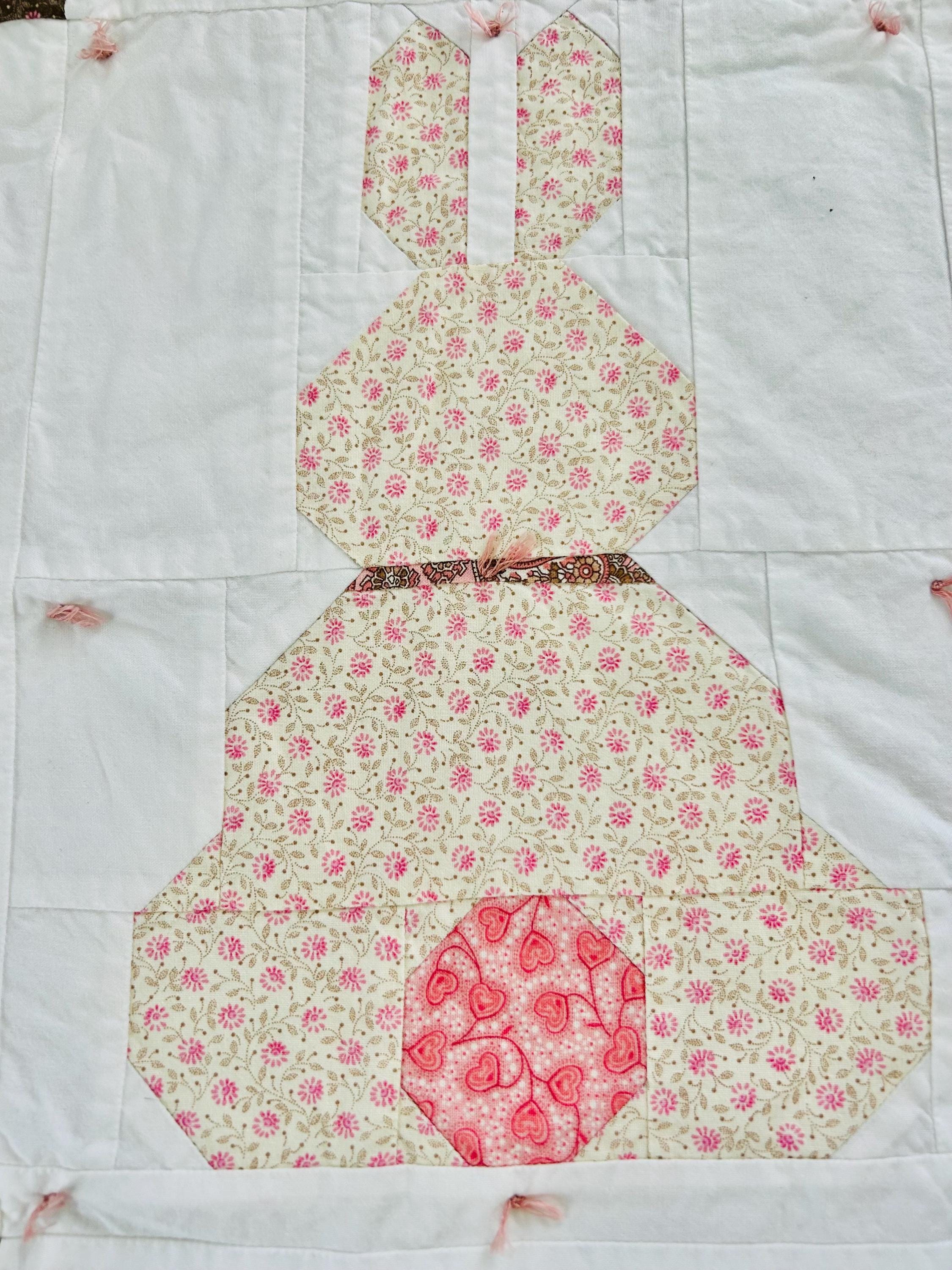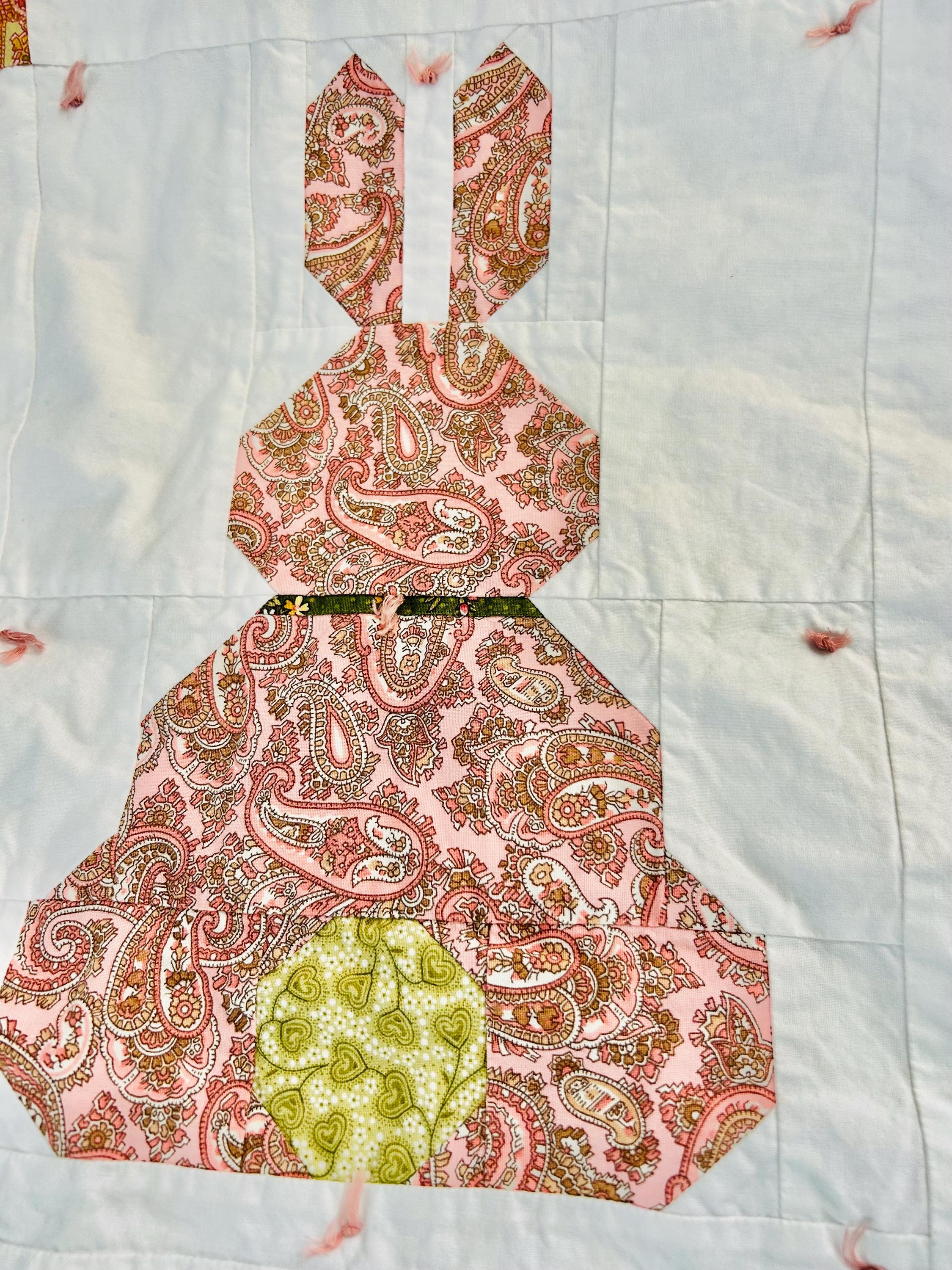 This is a cheerful cottage quilt with 16 bunnies in soft pinks, greens, and florals appliqued to a white ground, all hand-tied with pink thread. Each bunny measures 8 inches by 12 inches and is uniquely pieced in coordinating florals and paisleys.