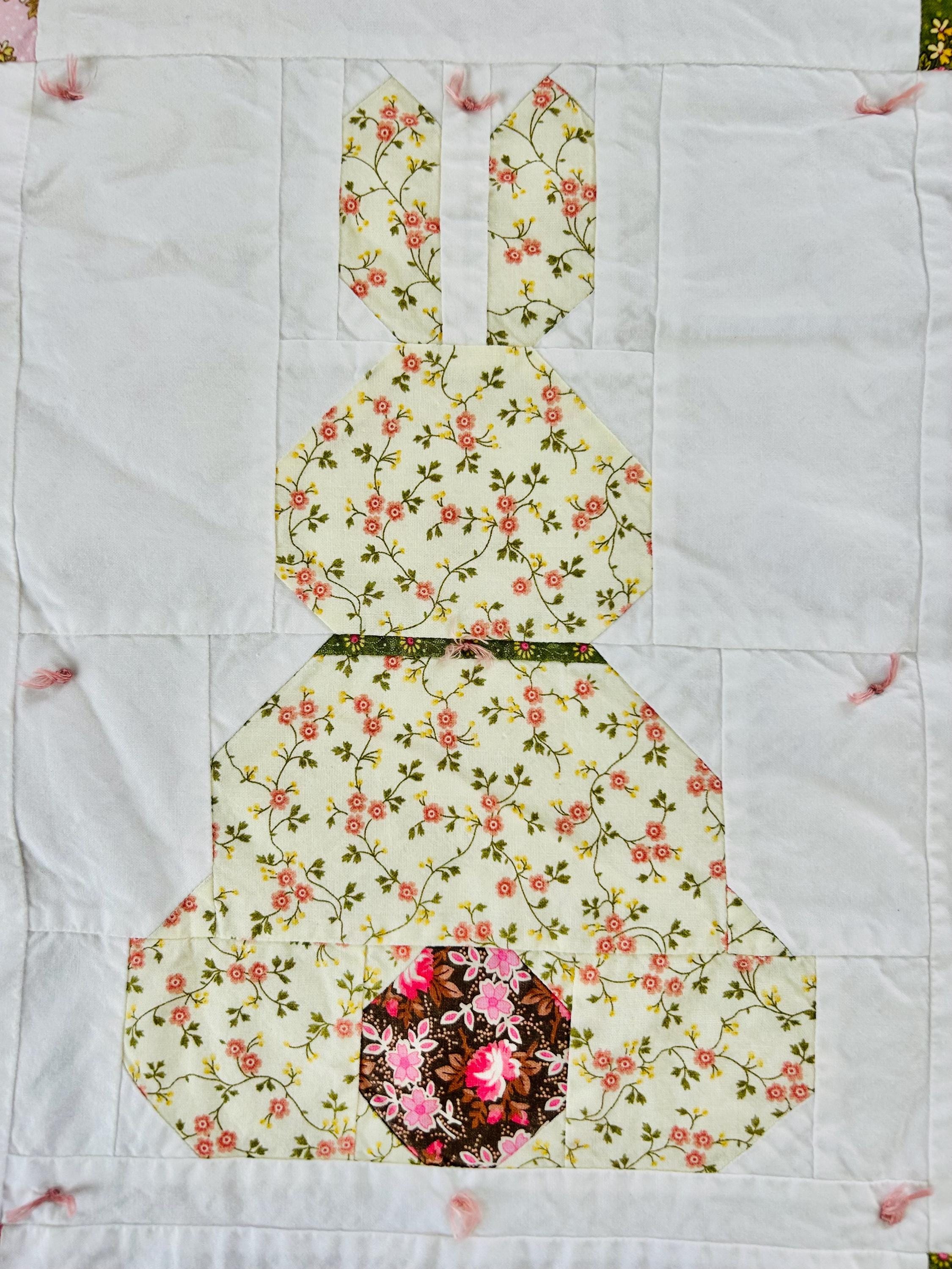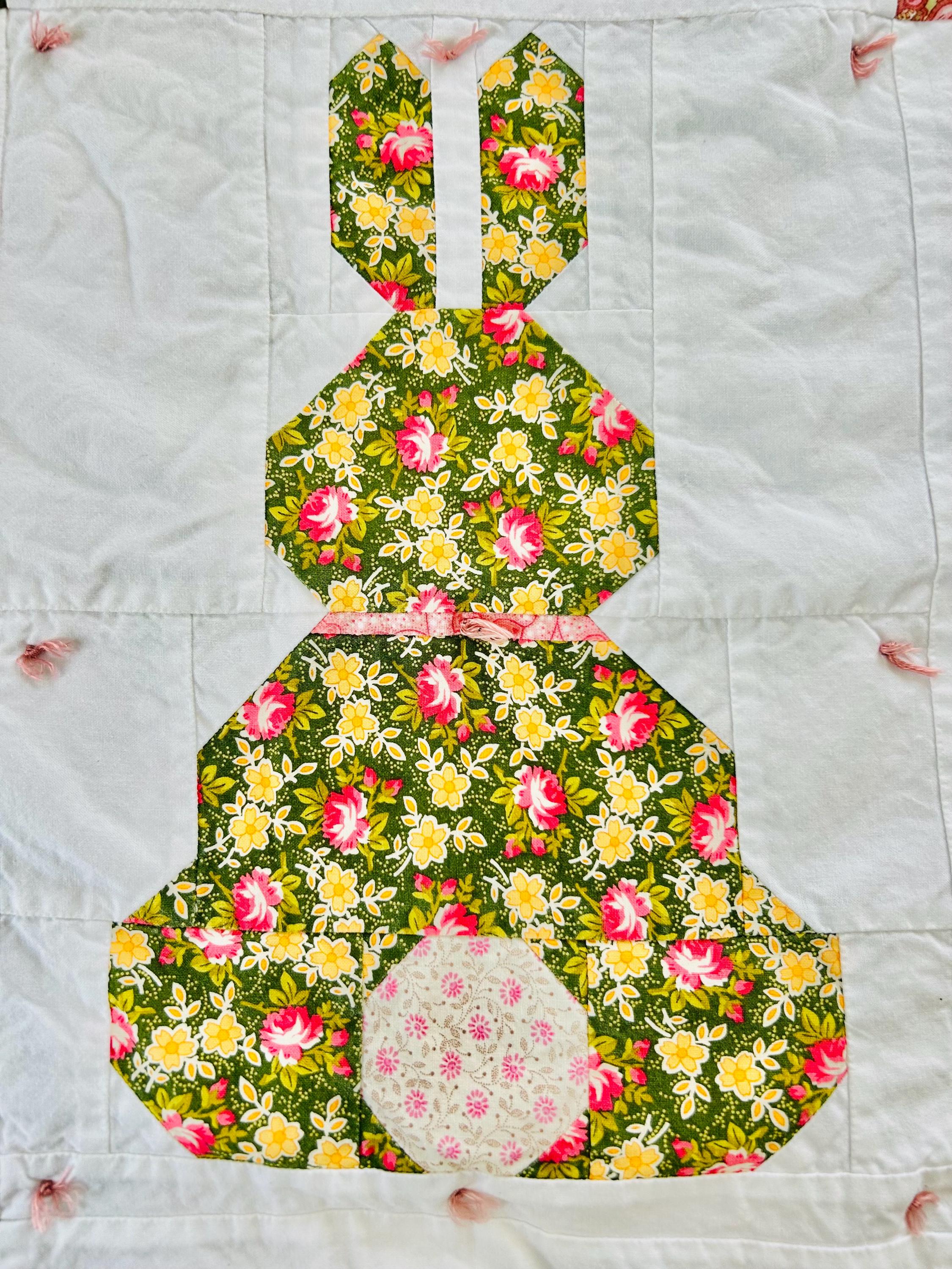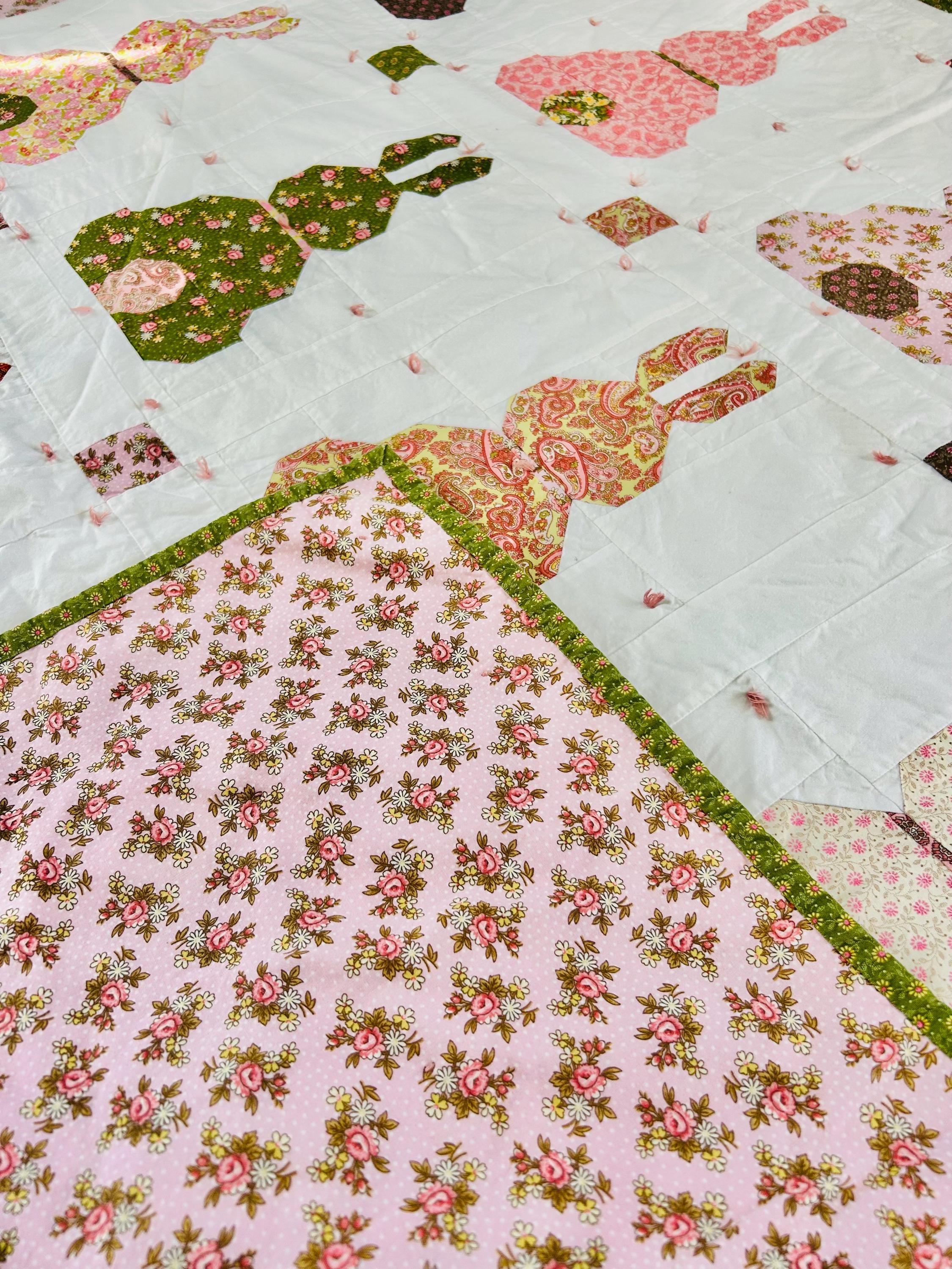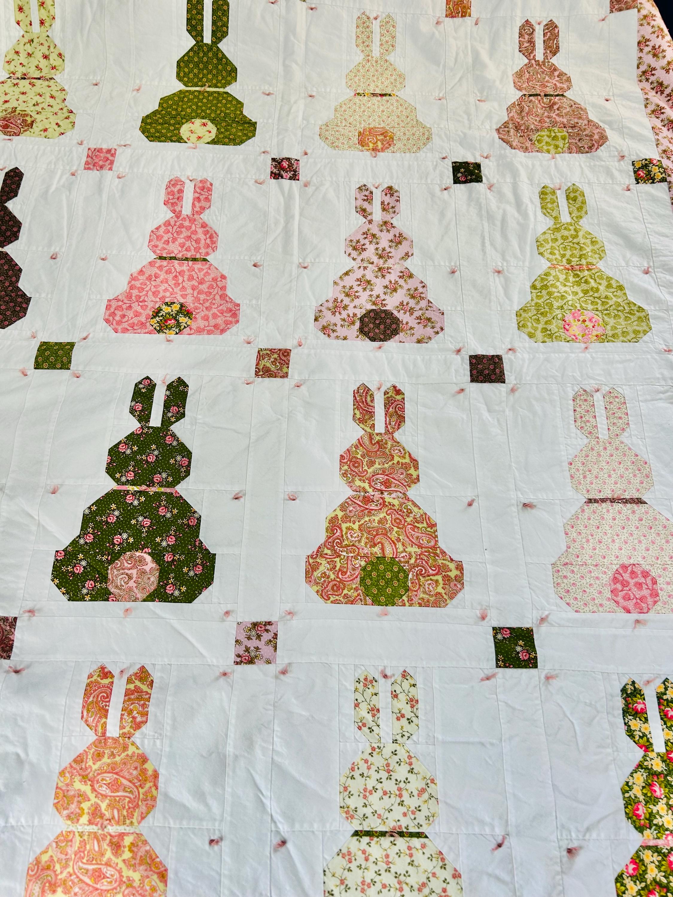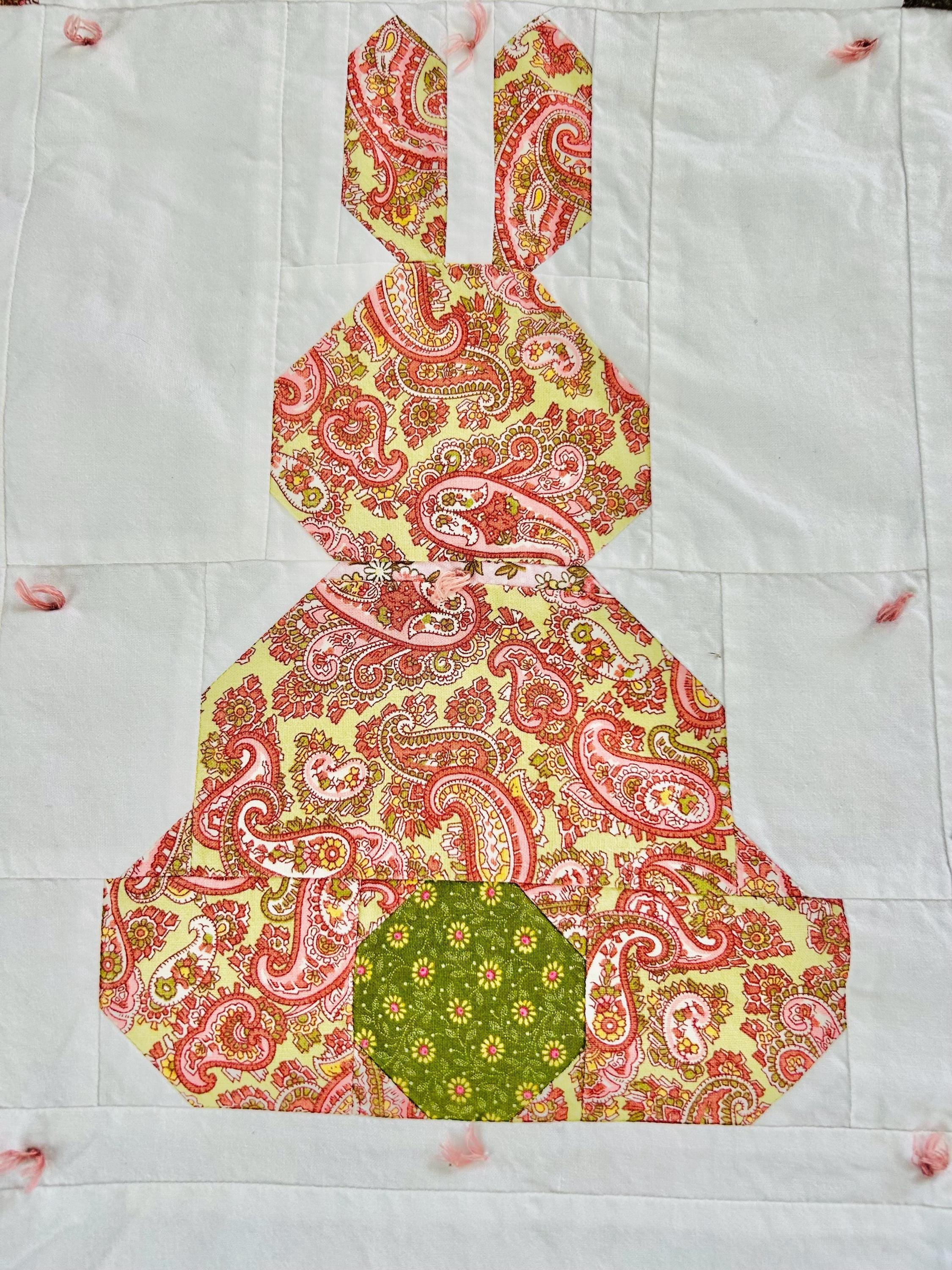 This is a cheerful cottage quilt with 16 bunnies in soft pinks, greens, and florals appliqued to a white ground, all hand-tied with pink thread. Each bunny measures 8 inches by 12 inches and is uniquely pieced in coordinating florals and paisleys.