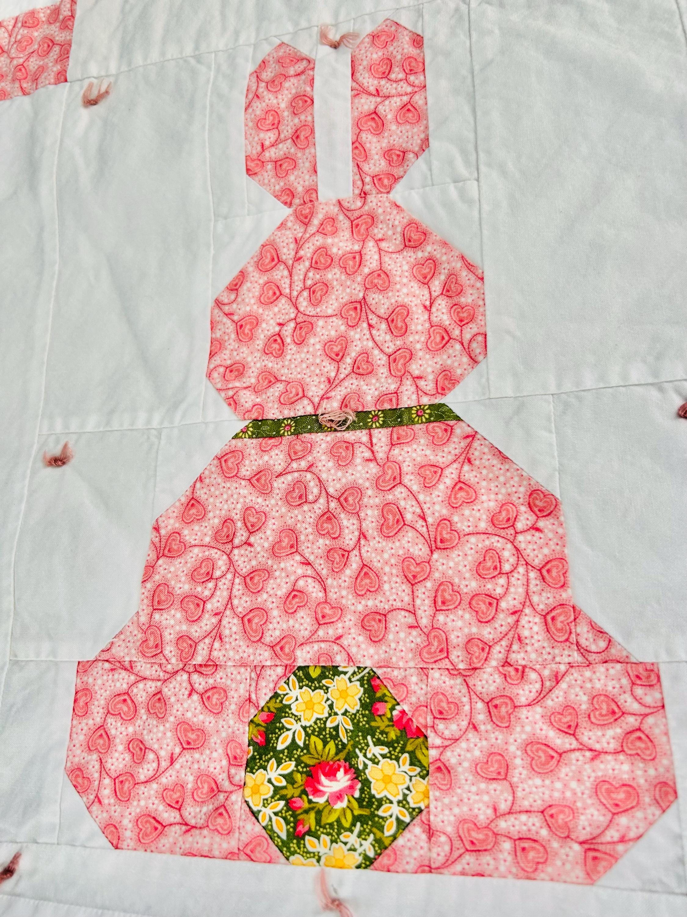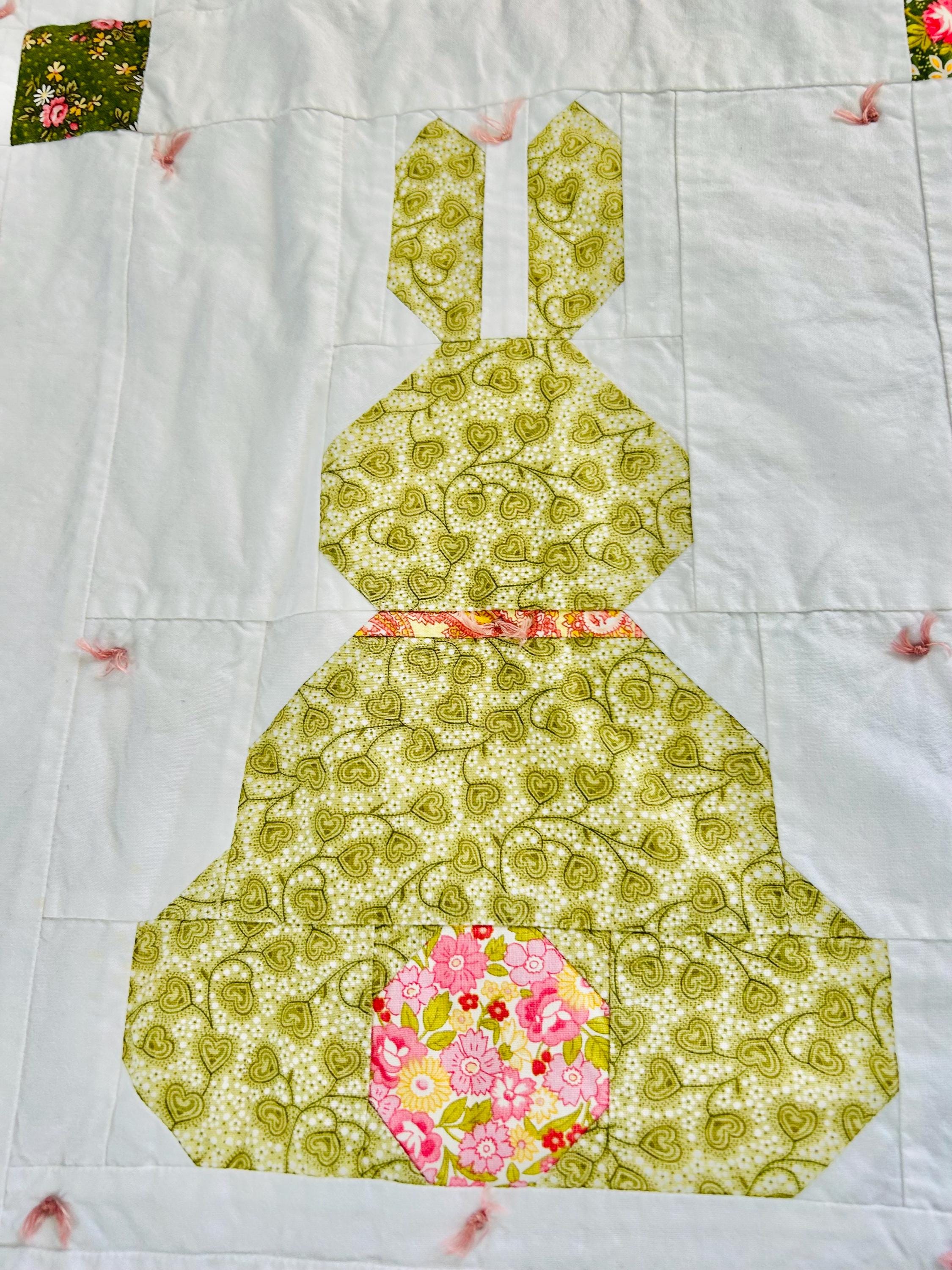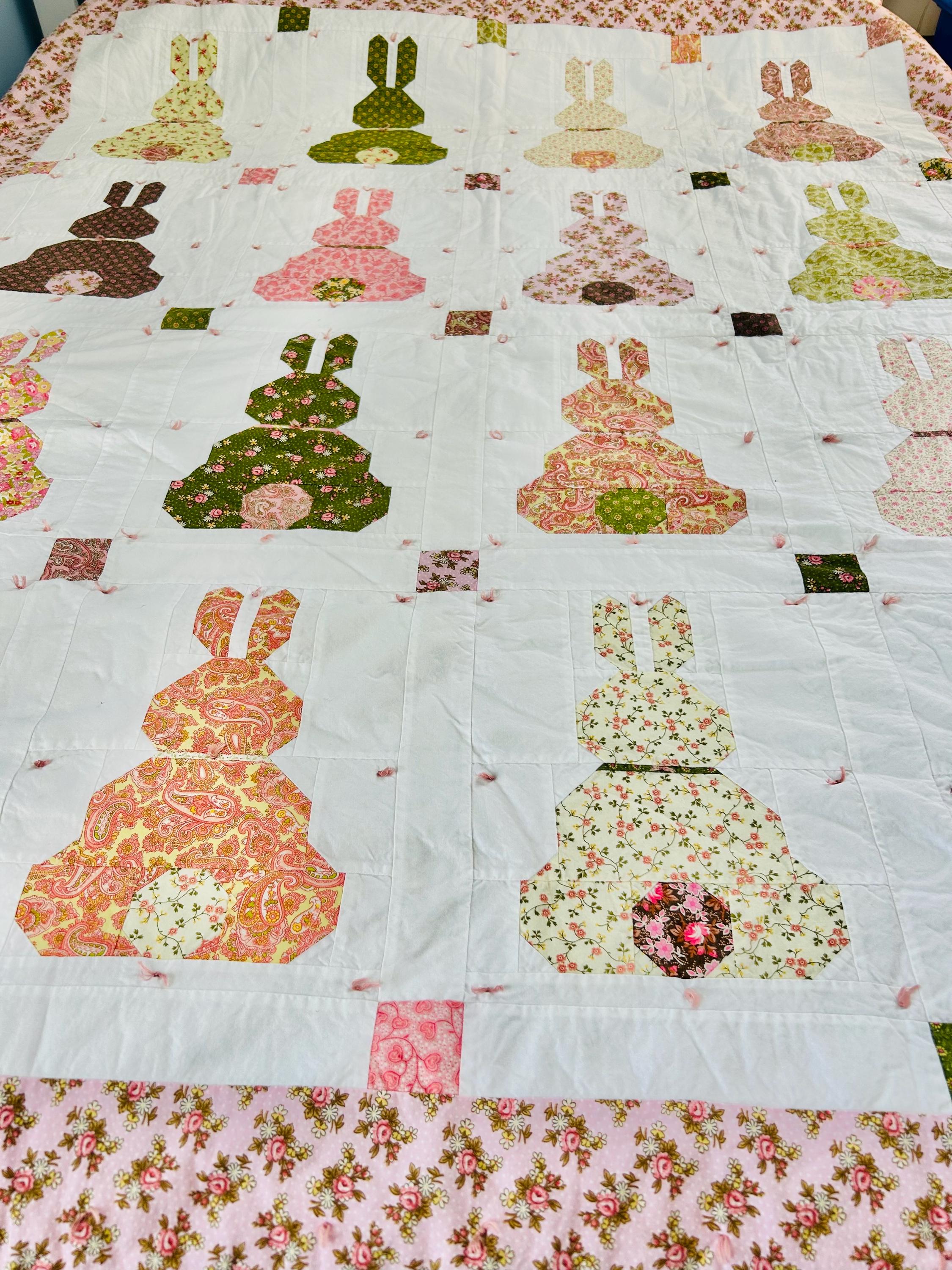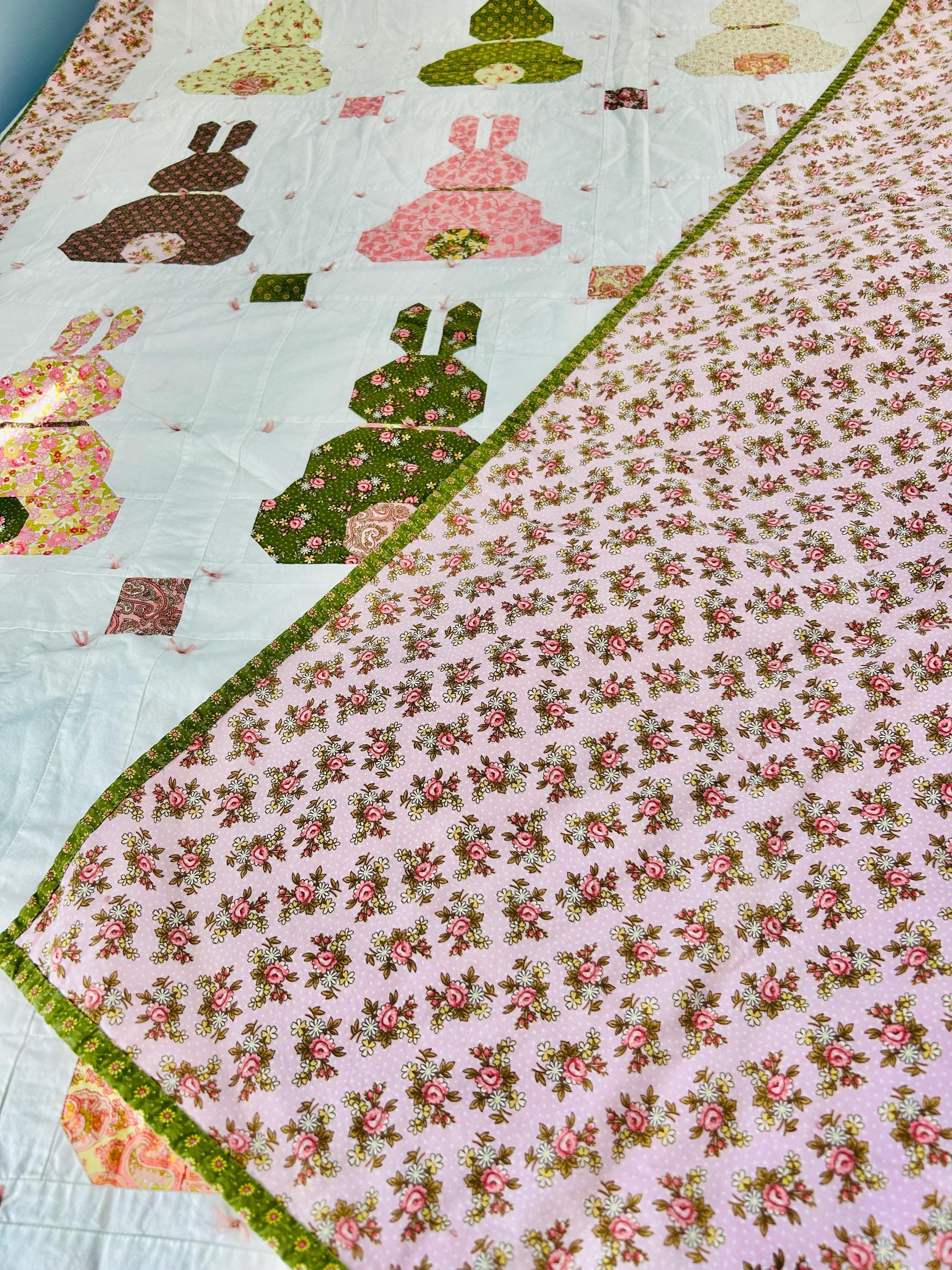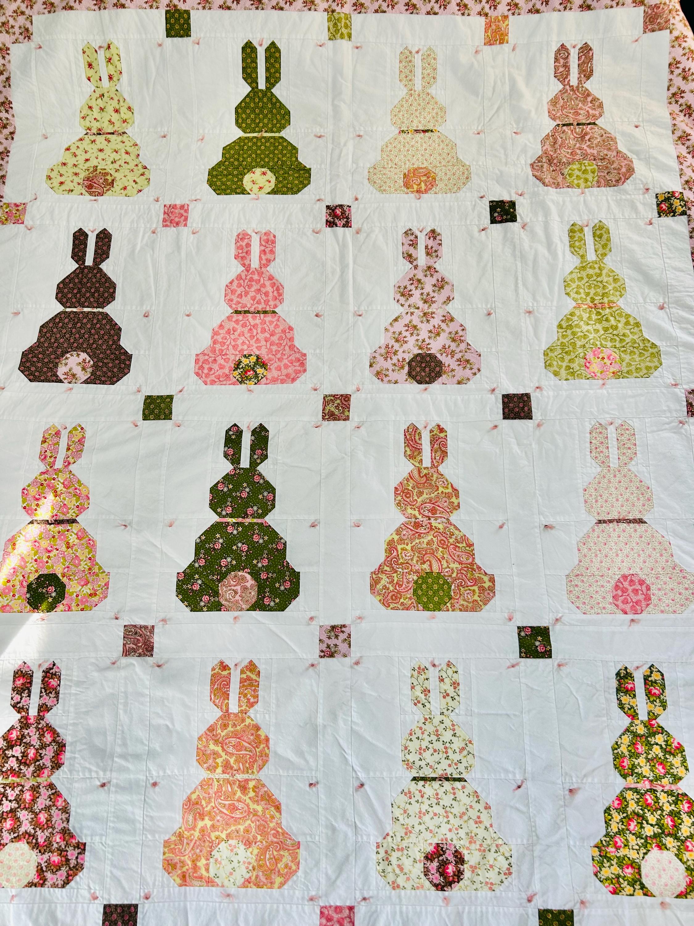 This is a cheerful cottage quilt with 16 bunnies in soft pinks, greens, and florals appliqued to a white ground, all hand-tied with pink thread. Each bunny measures 8 inches by 12 inches and is uniquely pieced in coordinating florals and paisleys.