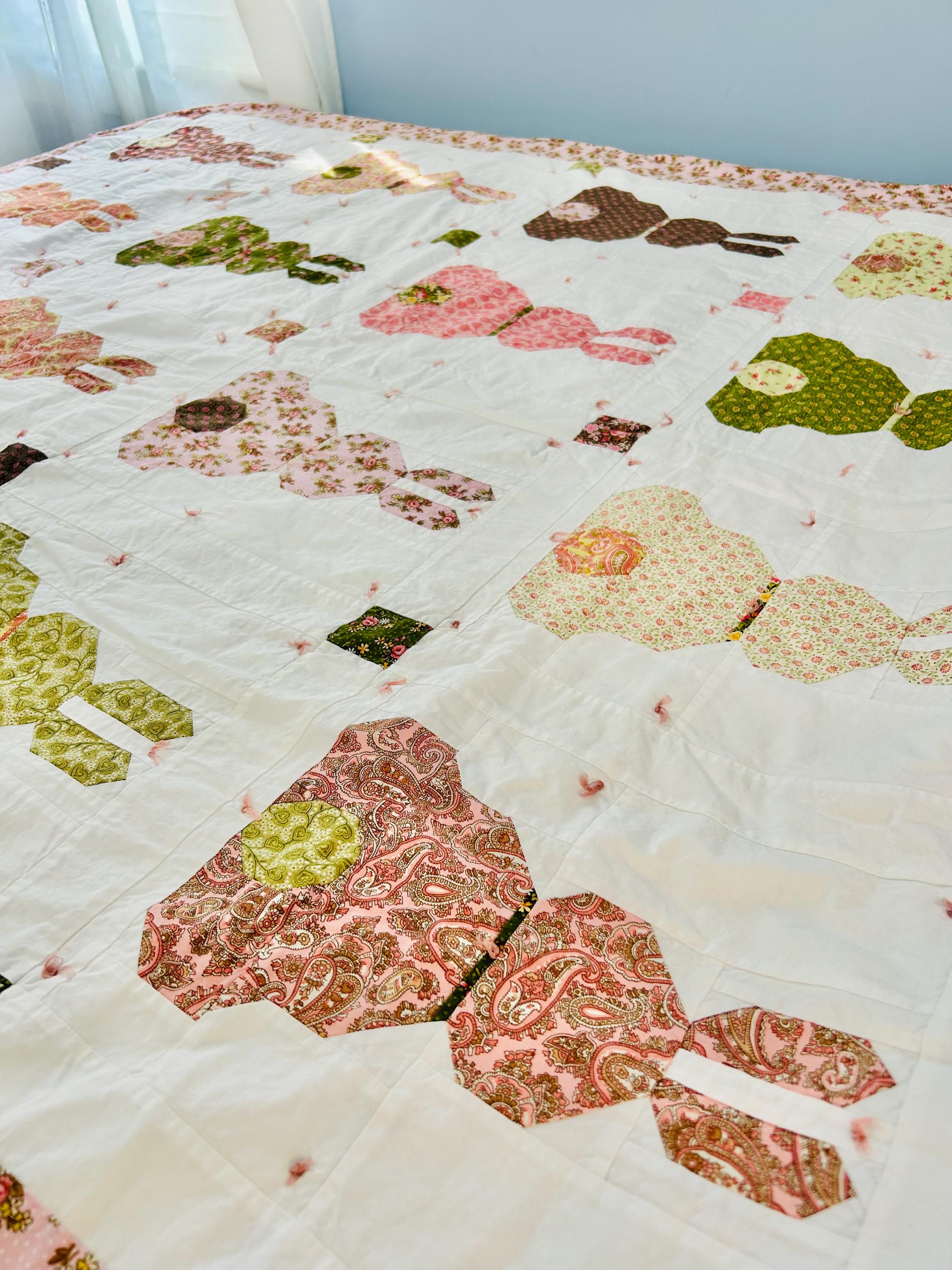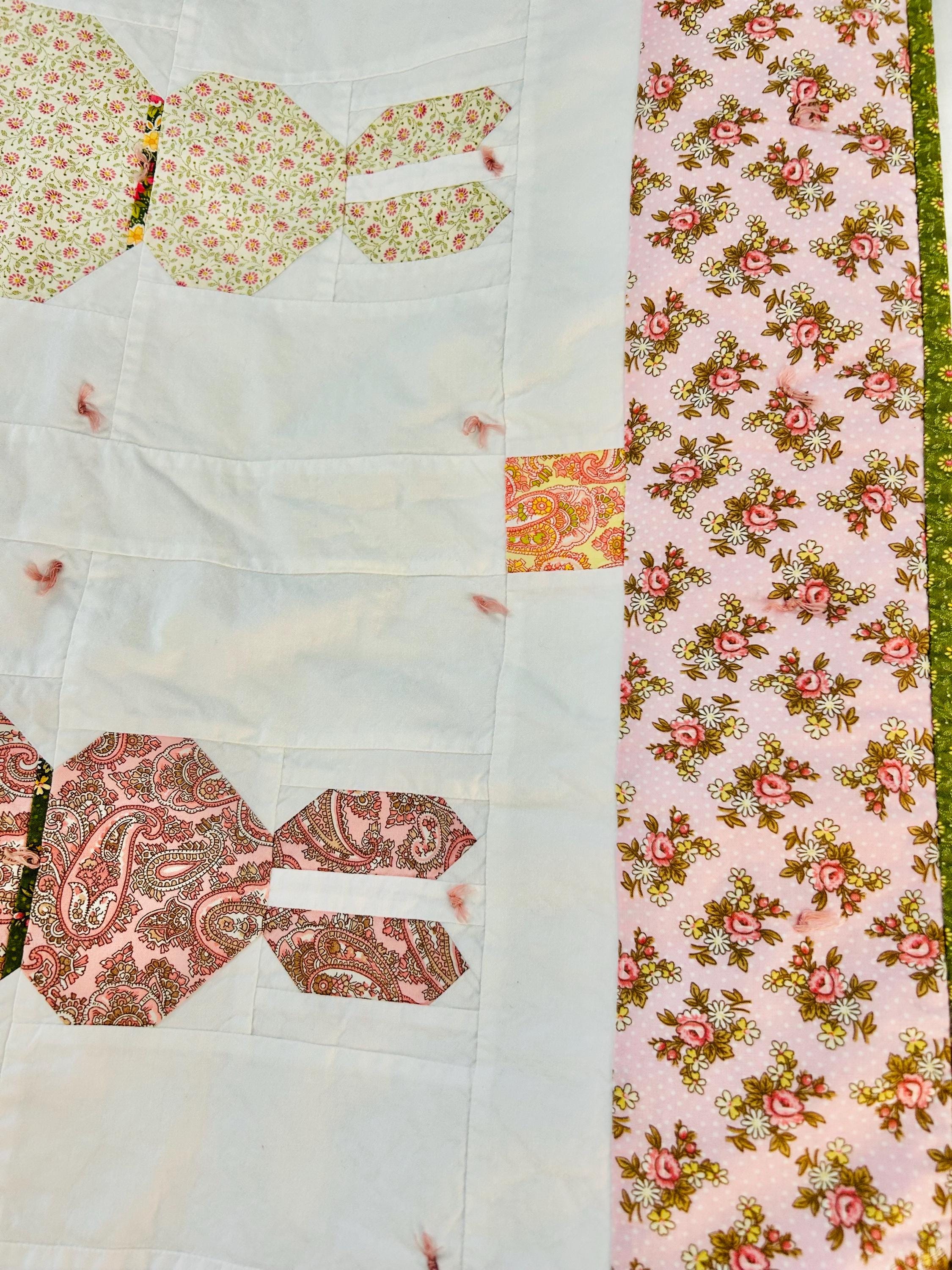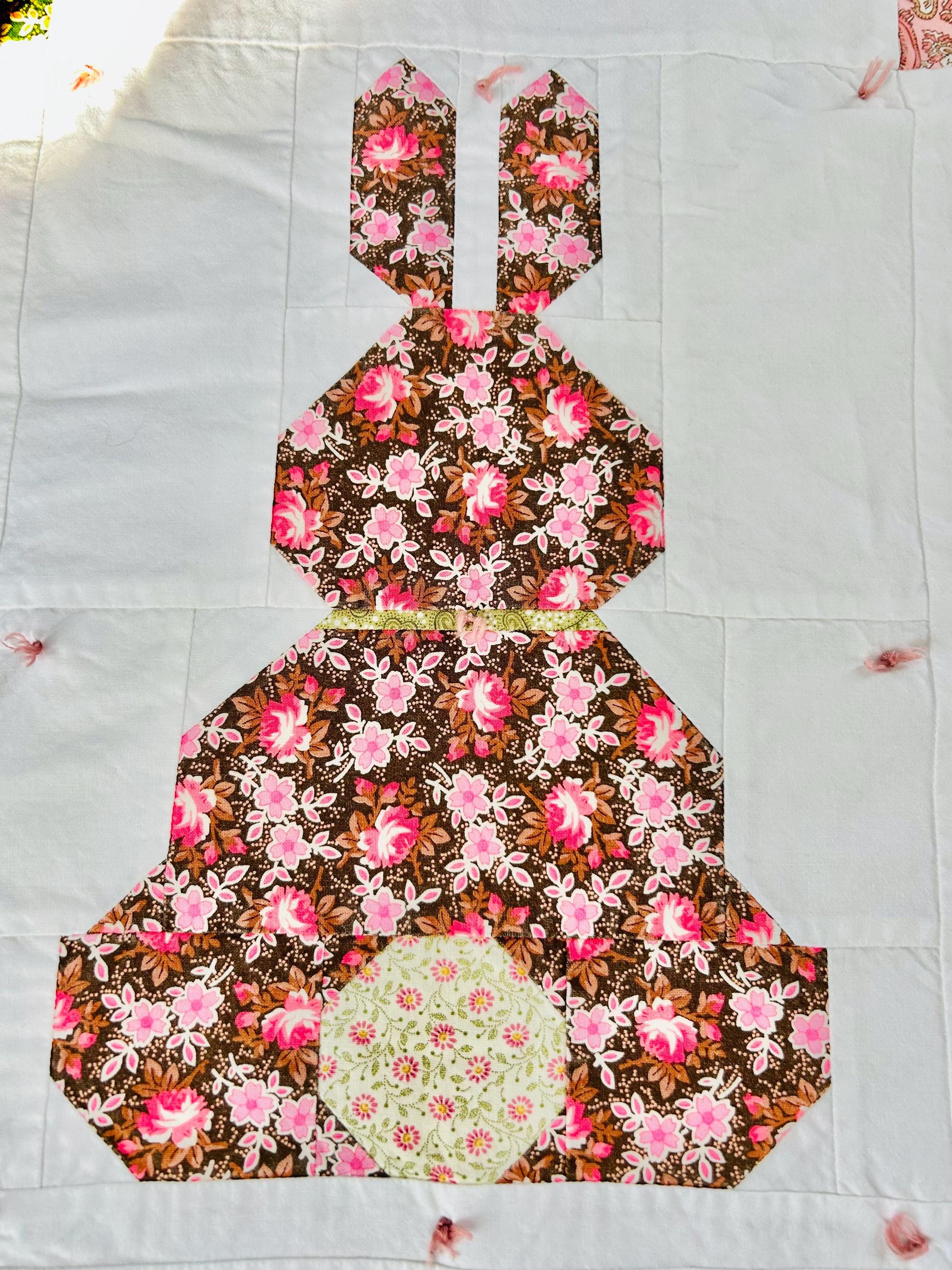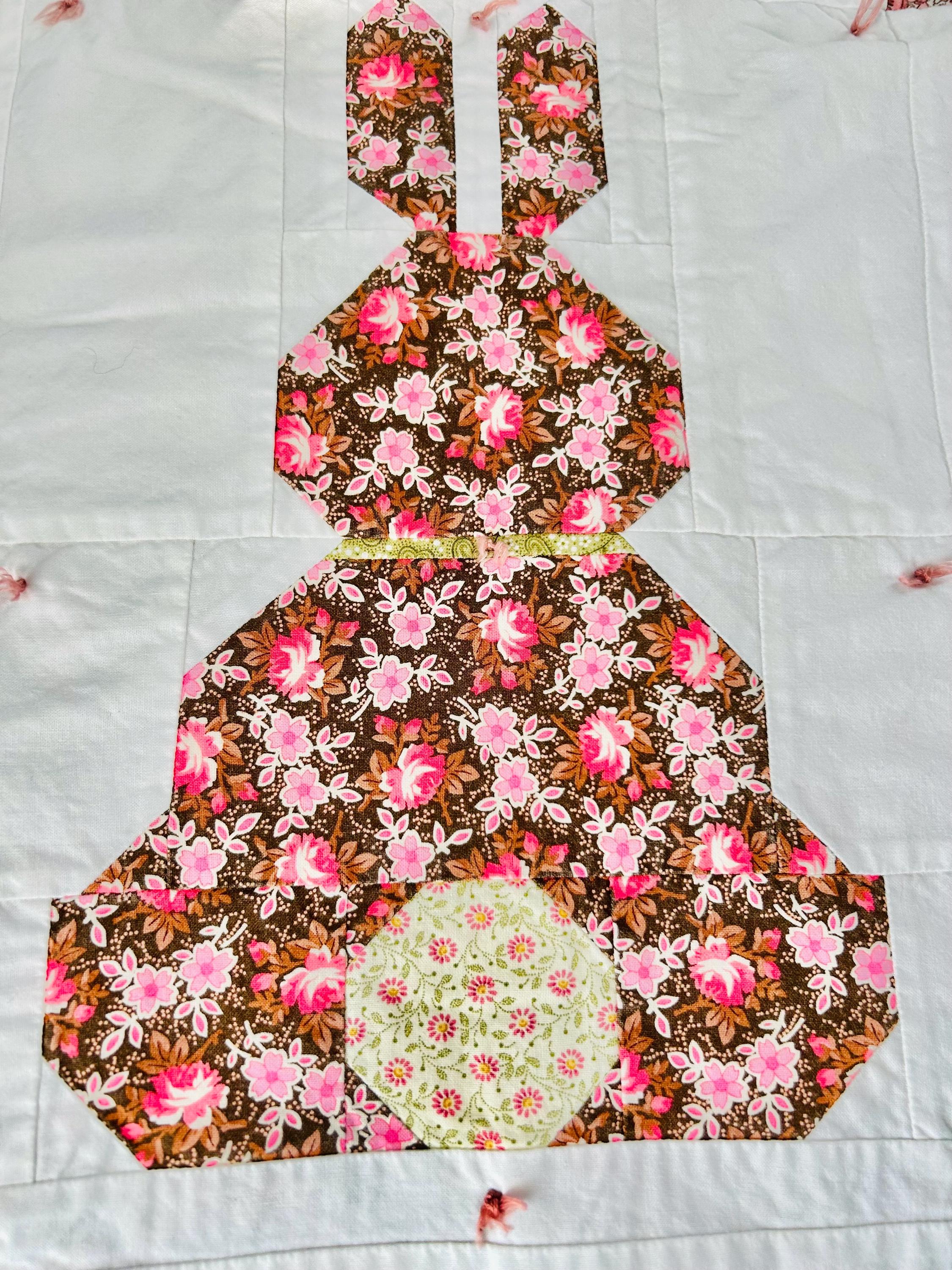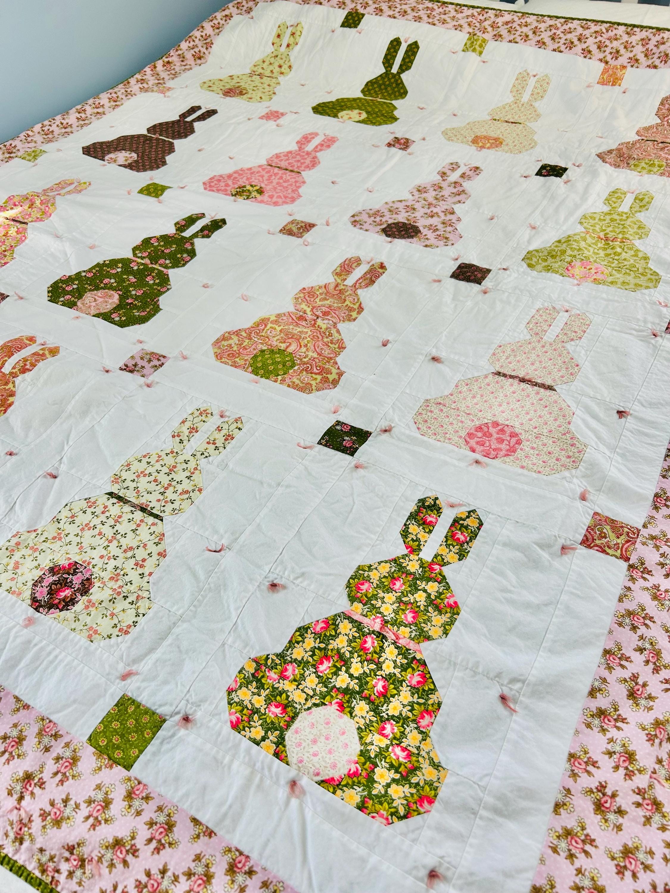 This is a cheerful cottage quilt with 16 bunnies in soft pinks, greens, and florals appliqued to a white ground, all hand-tied with pink thread. Each bunny measures 8 inches by 12 inches and is uniquely pieced in coordinating florals and paisleys.