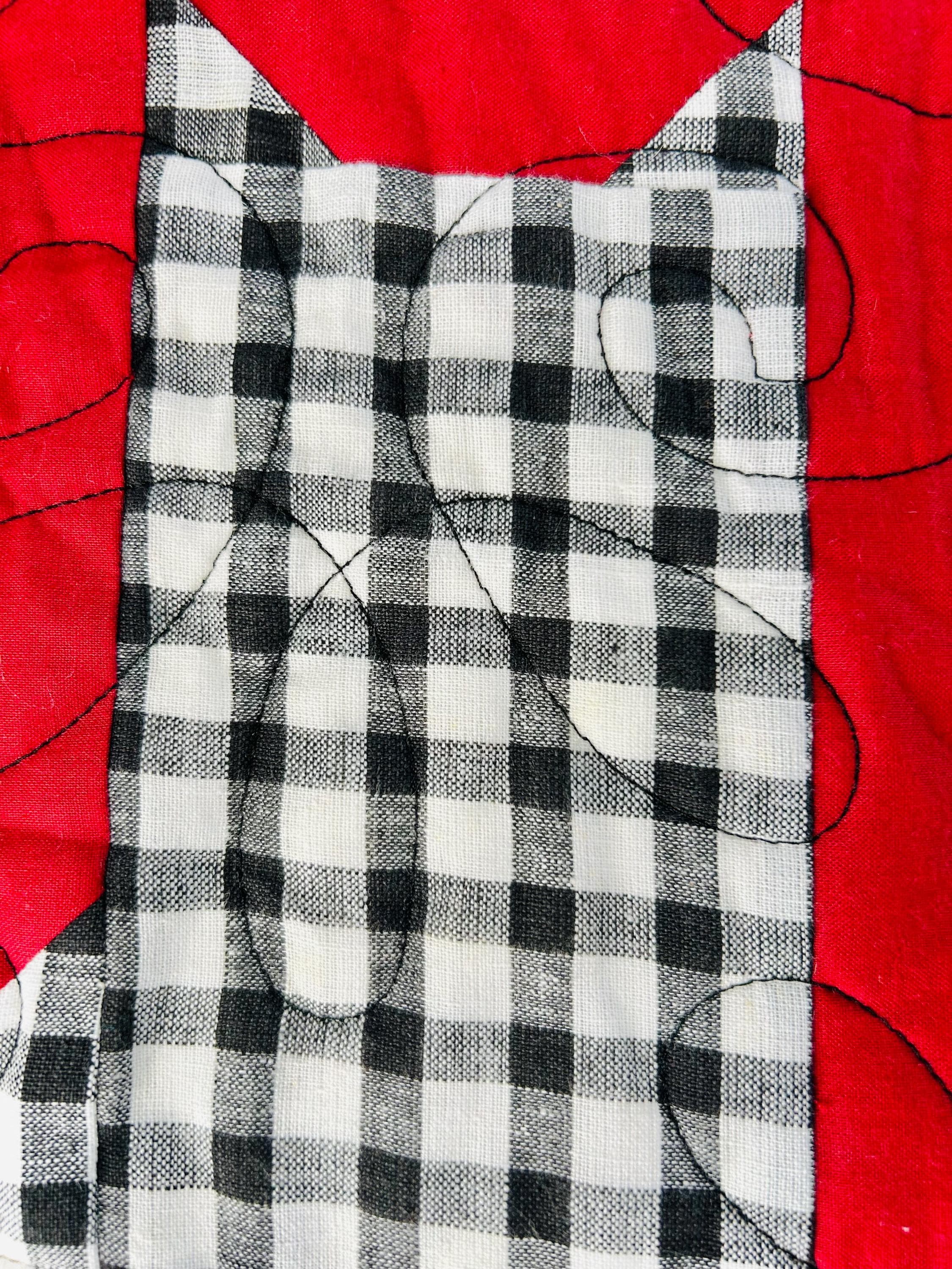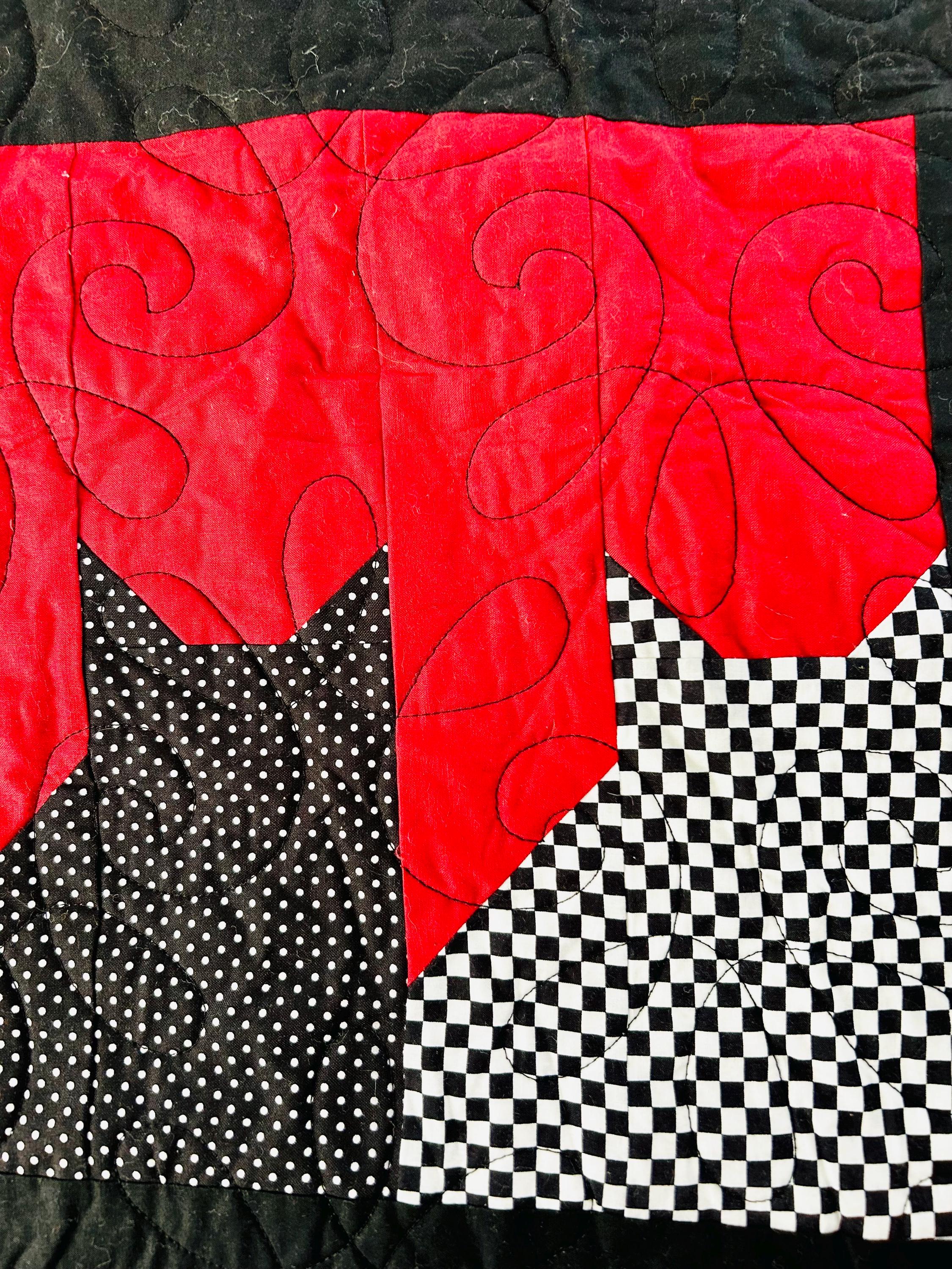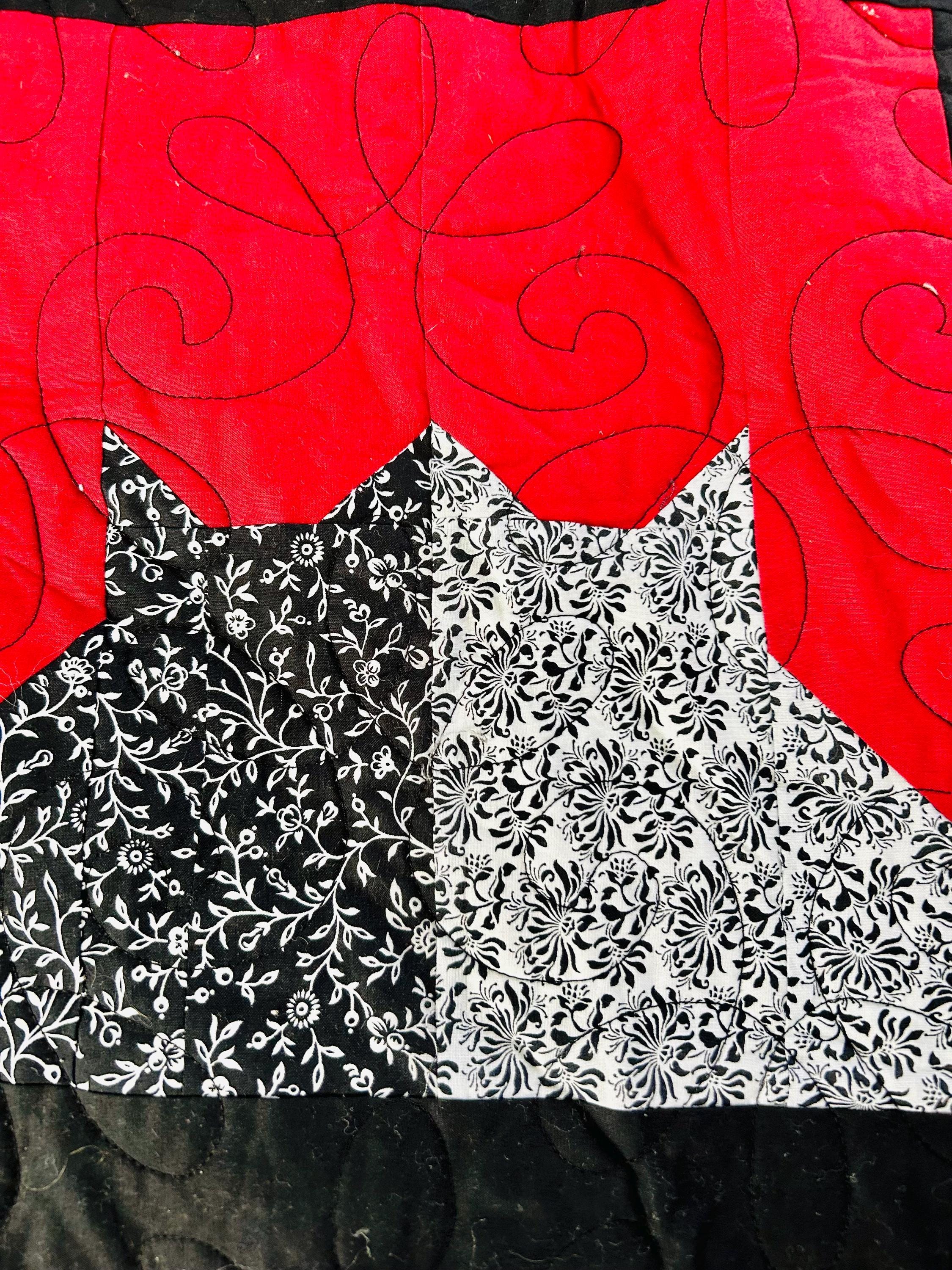 Bold, graphic, and full of personality, this striking “Cats in the Window” quilt was handmade and features a playful design of silhouetted cats peering out from stylized window blocks. The color palette is dramatic - black, white, and vibrant red -- resulting in a contemporary, art-quilt feel. The longarm quilting is done in a free-motion swirling pattern across the red and black areas and in curlicues along the four-sided border.