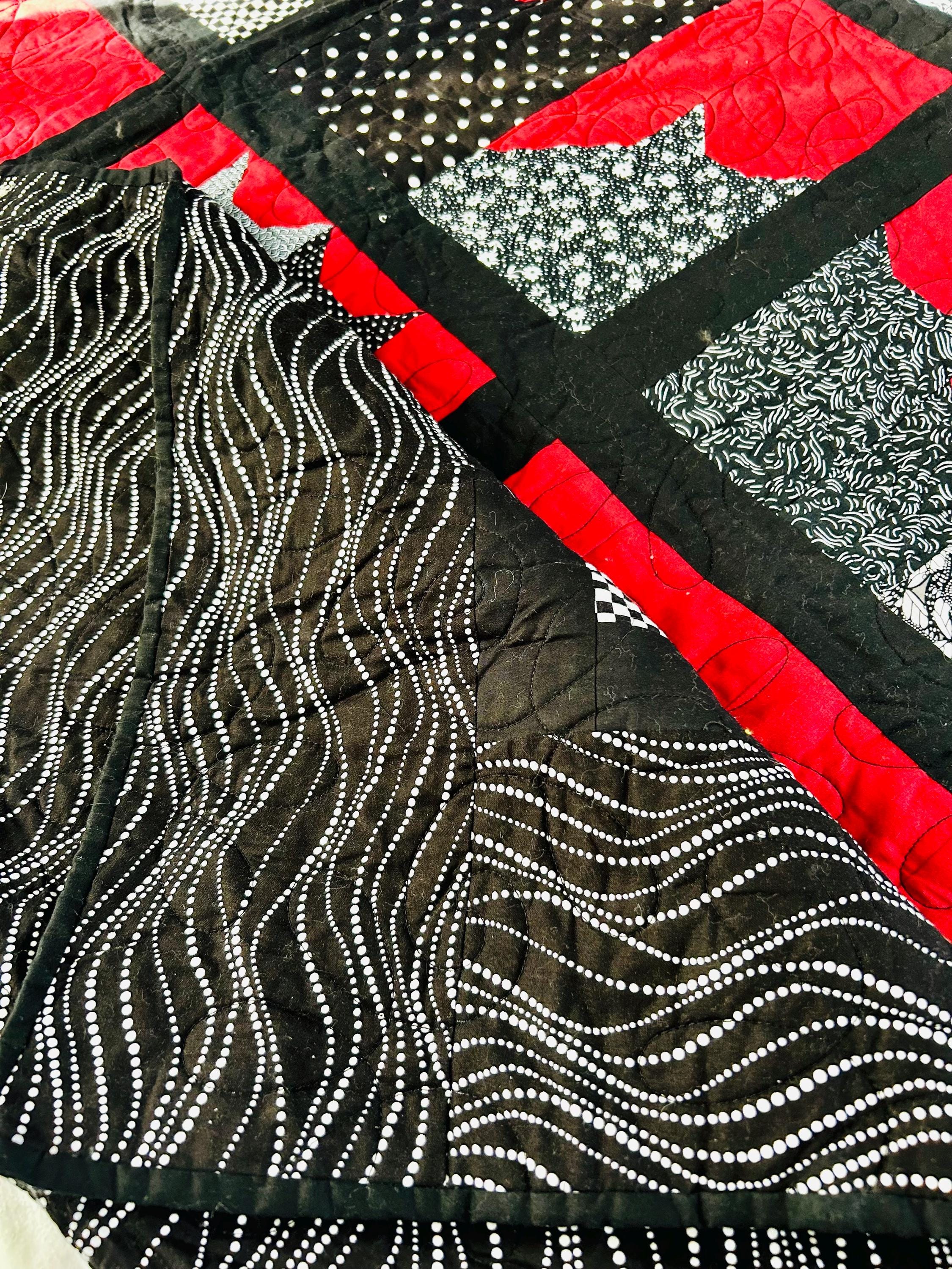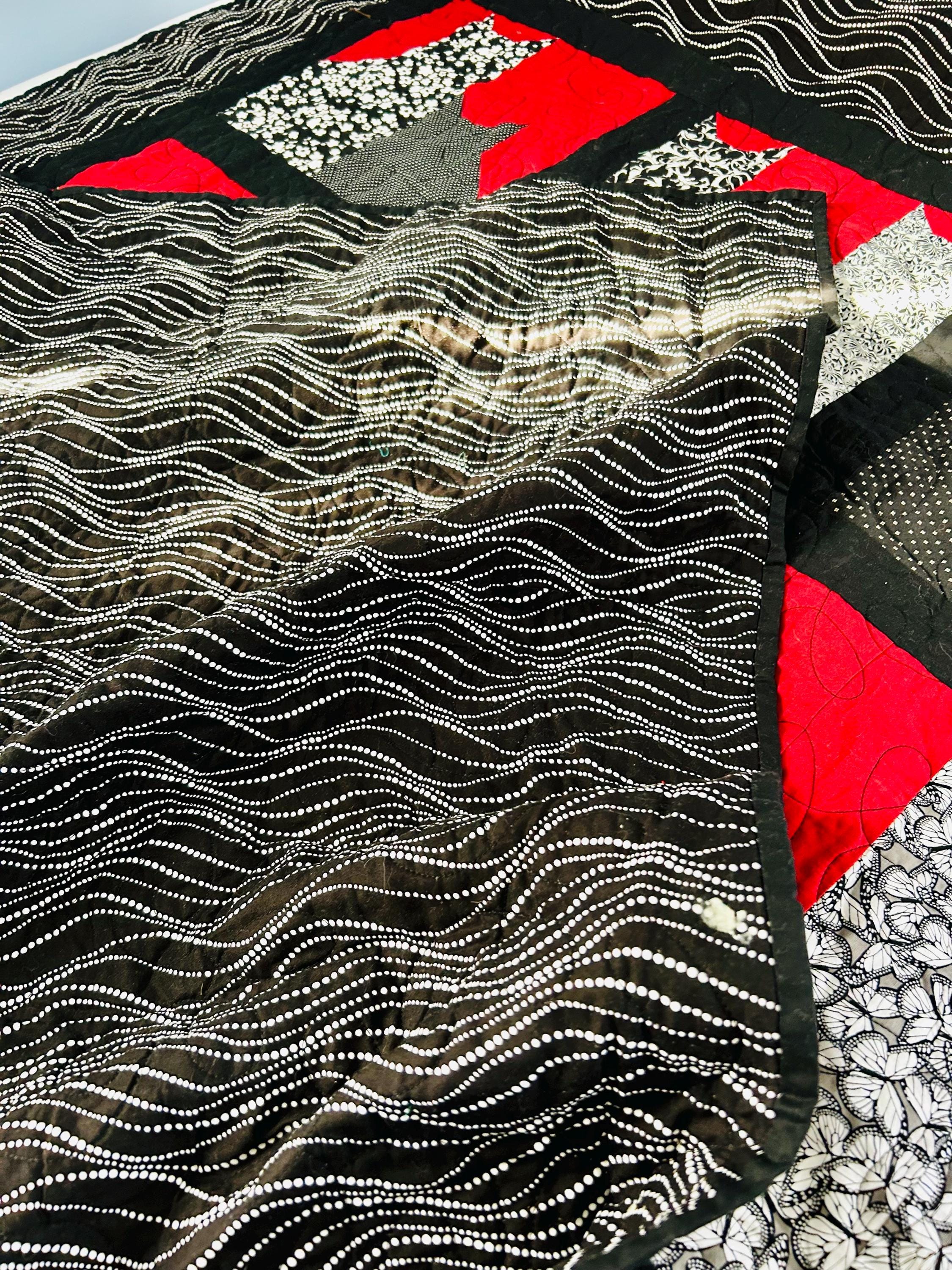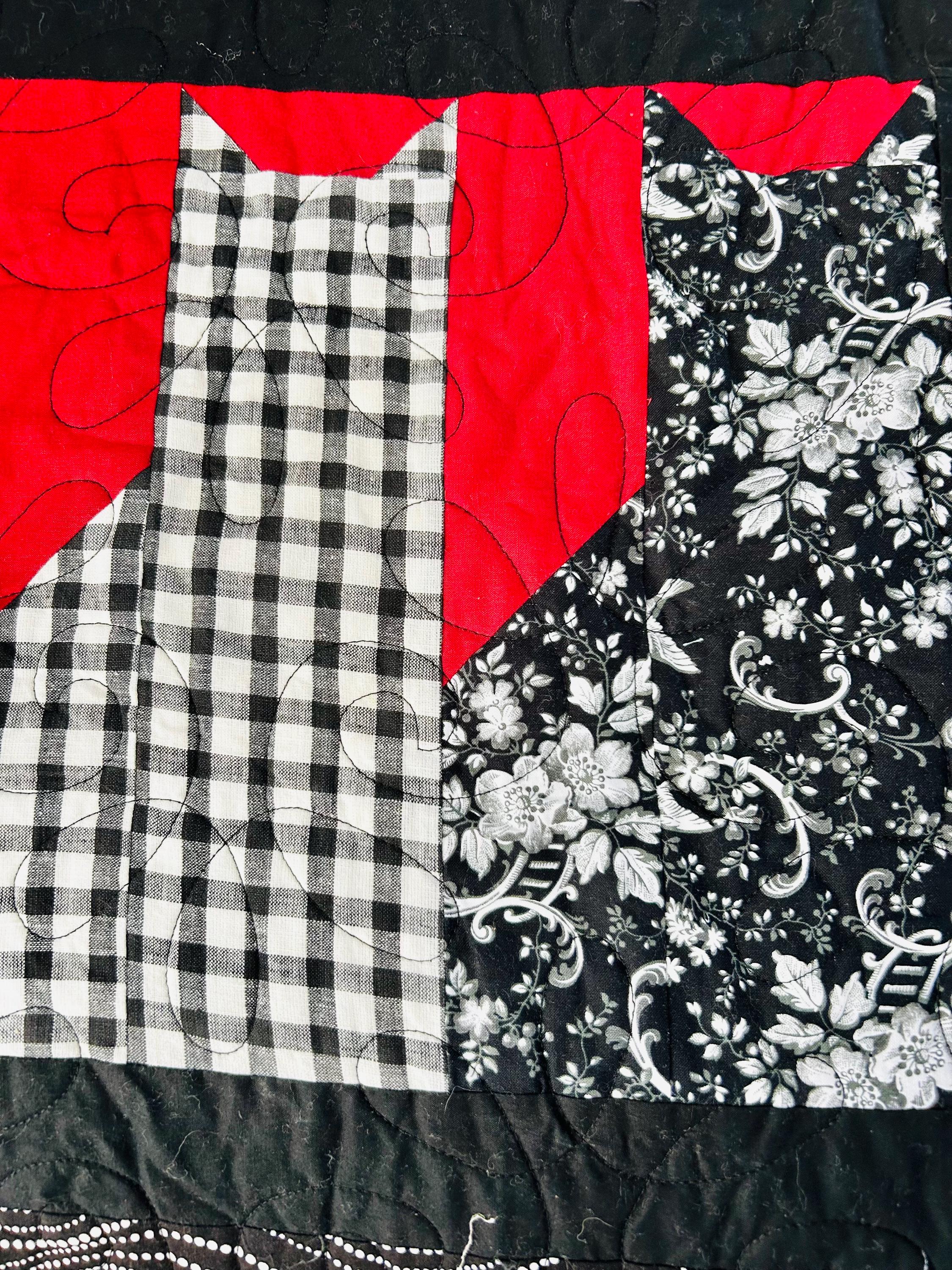 Bold, graphic, and full of personality, this striking “Cats in the Window” quilt was handmade and features a playful design of silhouetted cats peering out from stylized window blocks. The color palette is dramatic - black, white, and vibrant red -- resulting in a contemporary, art-quilt feel. The longarm quilting is done in a free-motion swirling pattern across the red and black areas and in curlicues along the four-sided border.